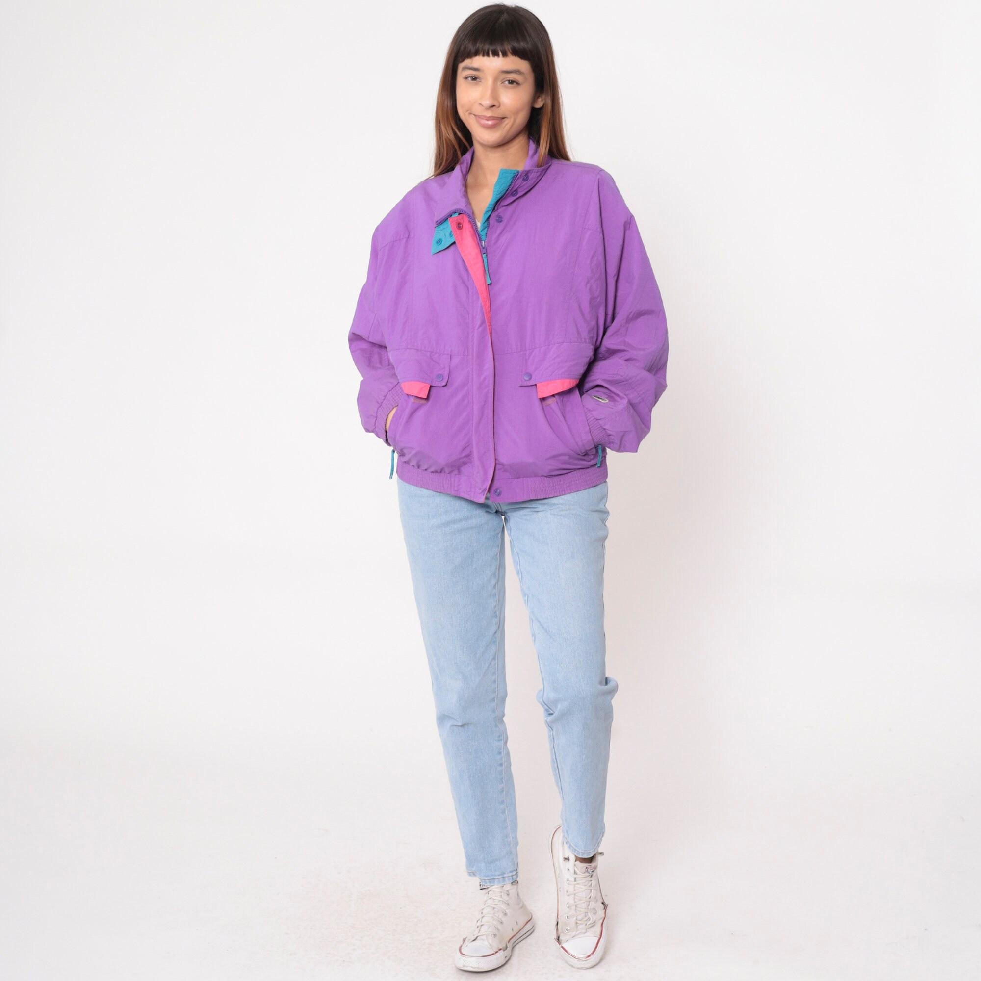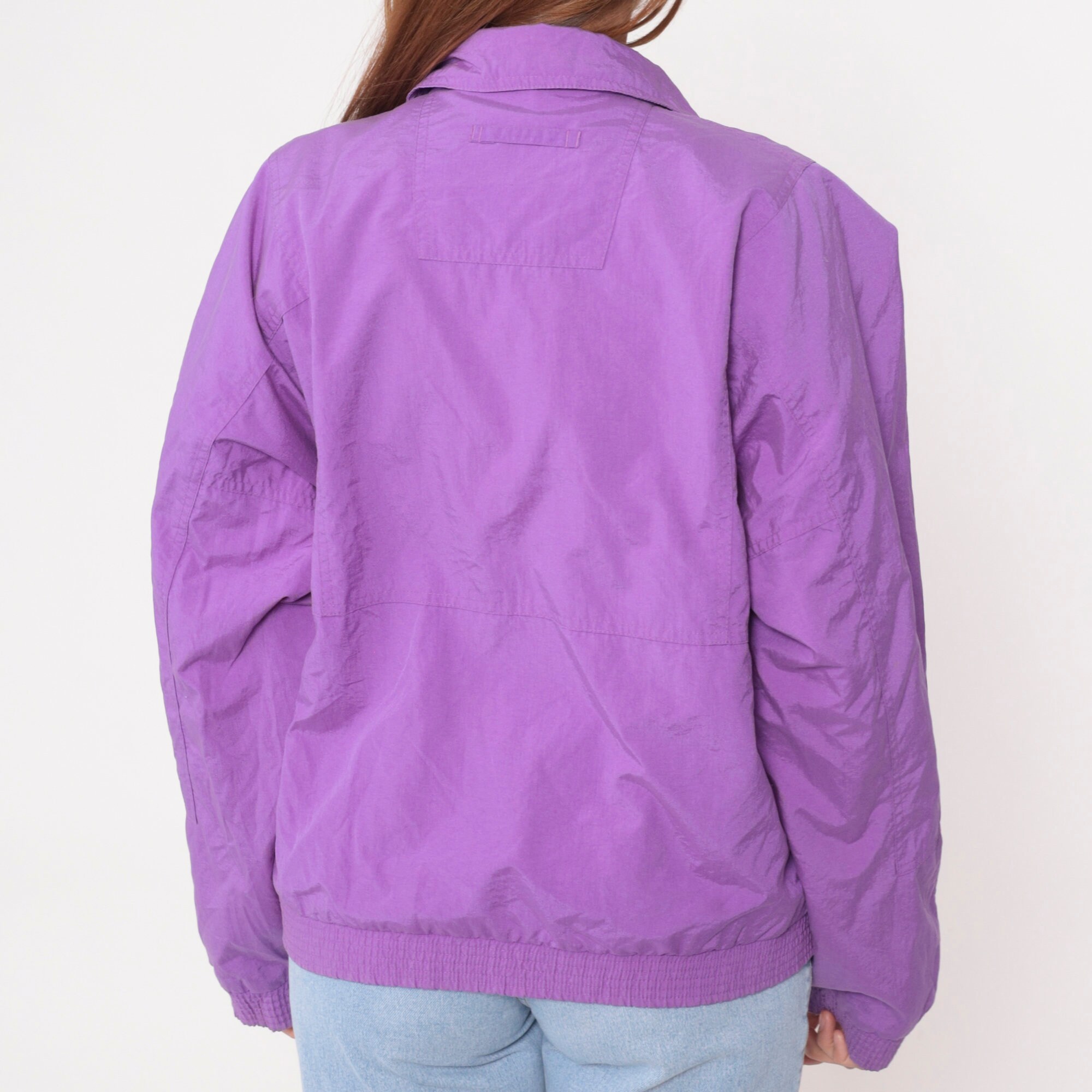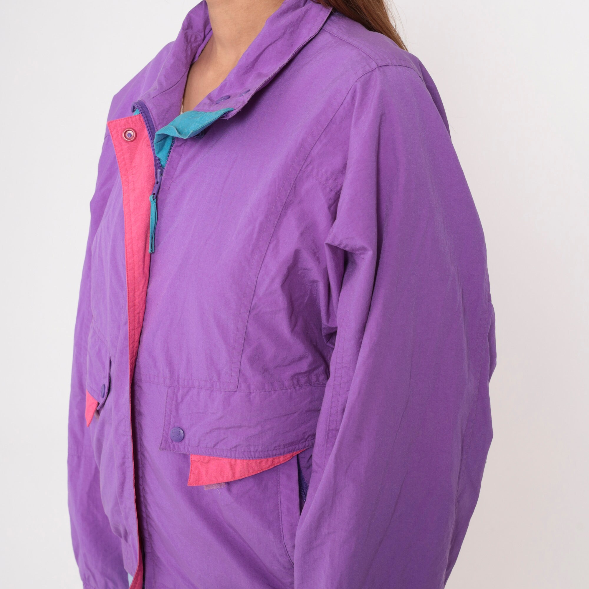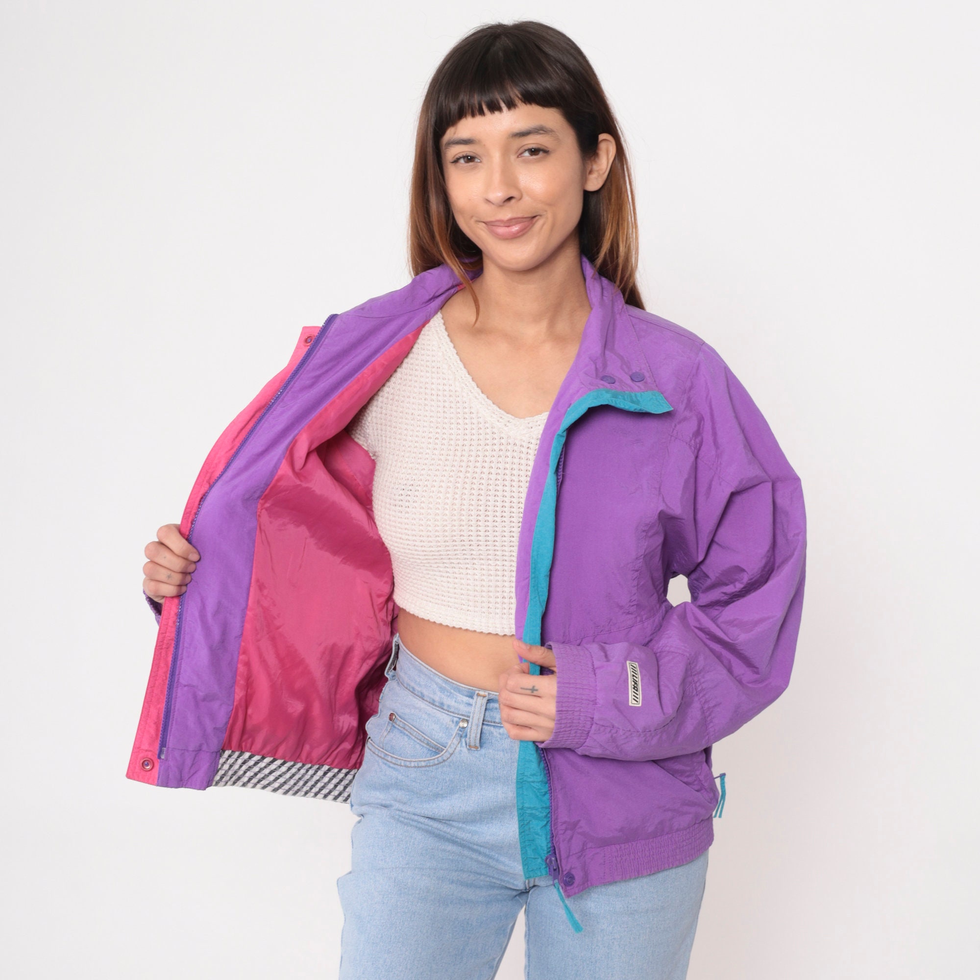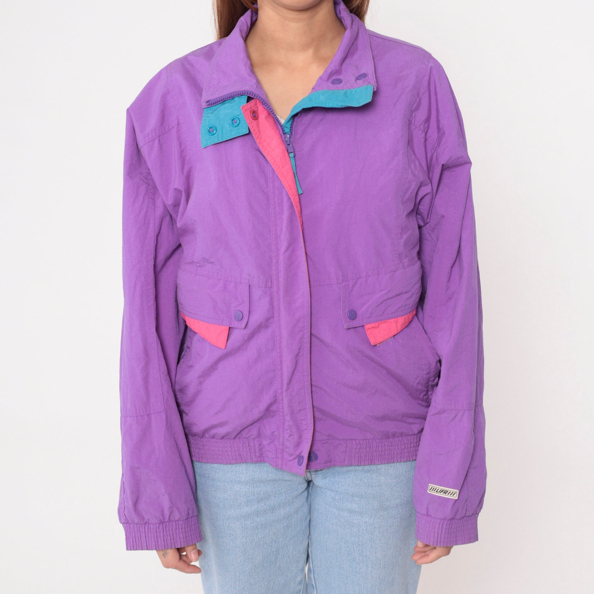 Vintage 90s windbreaker jacket by Helly Hansen in purple with pink and blue trim. Zips up the front.