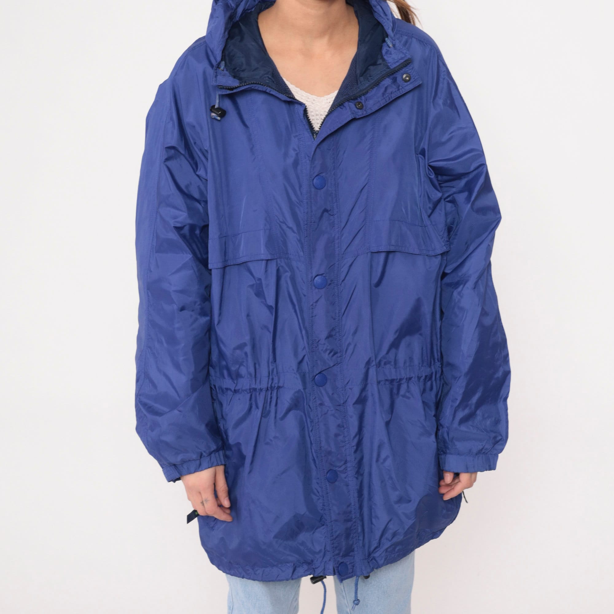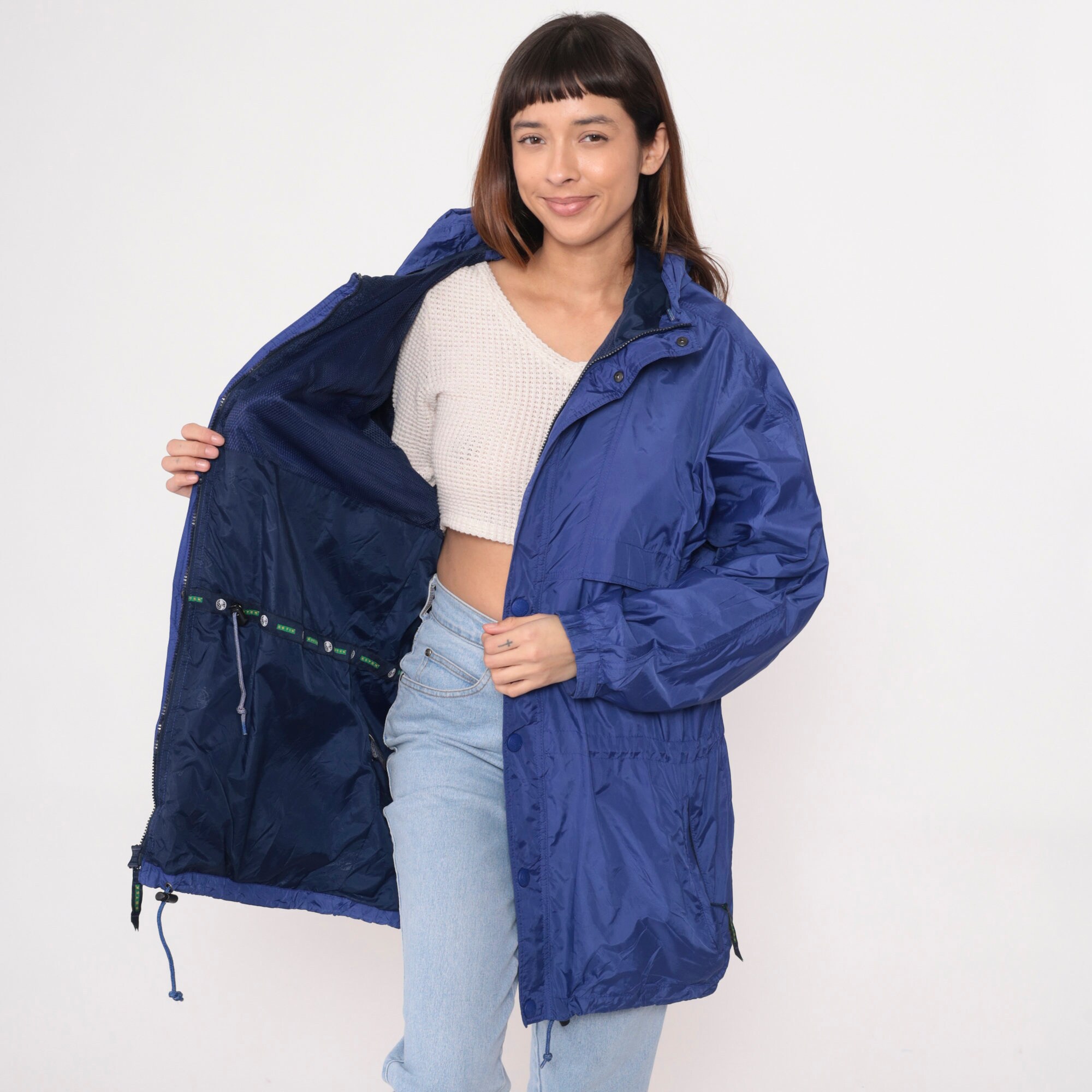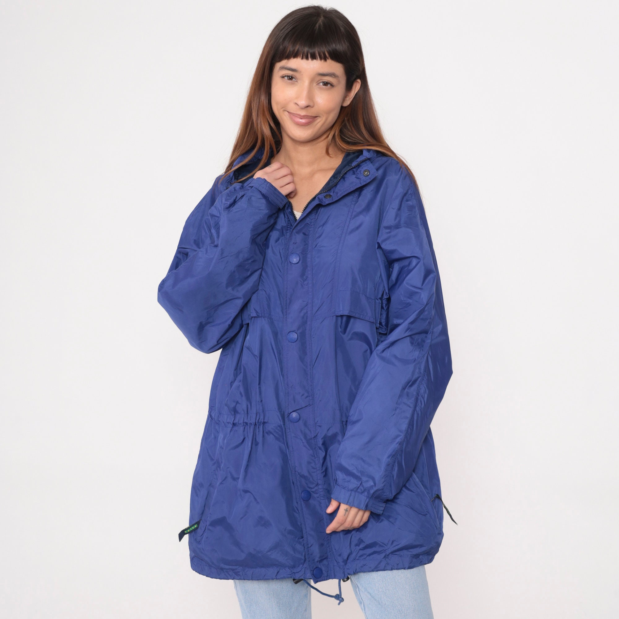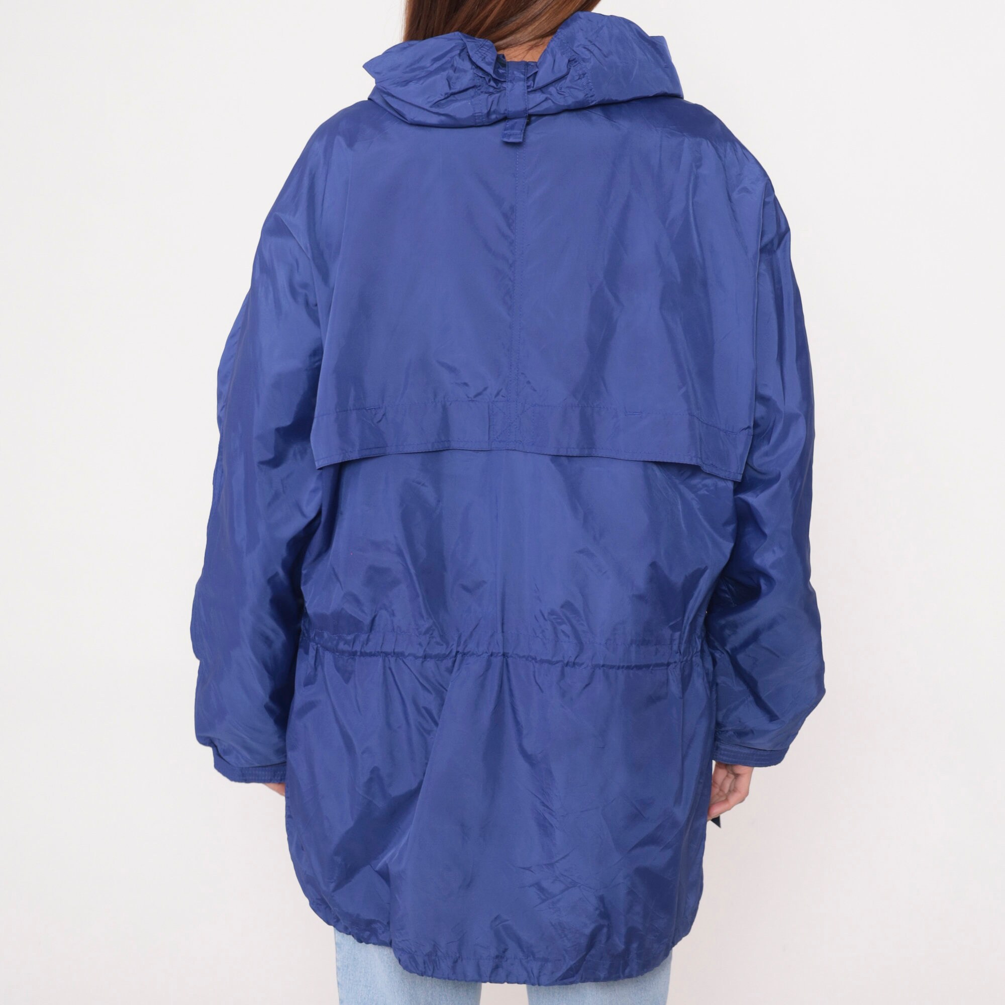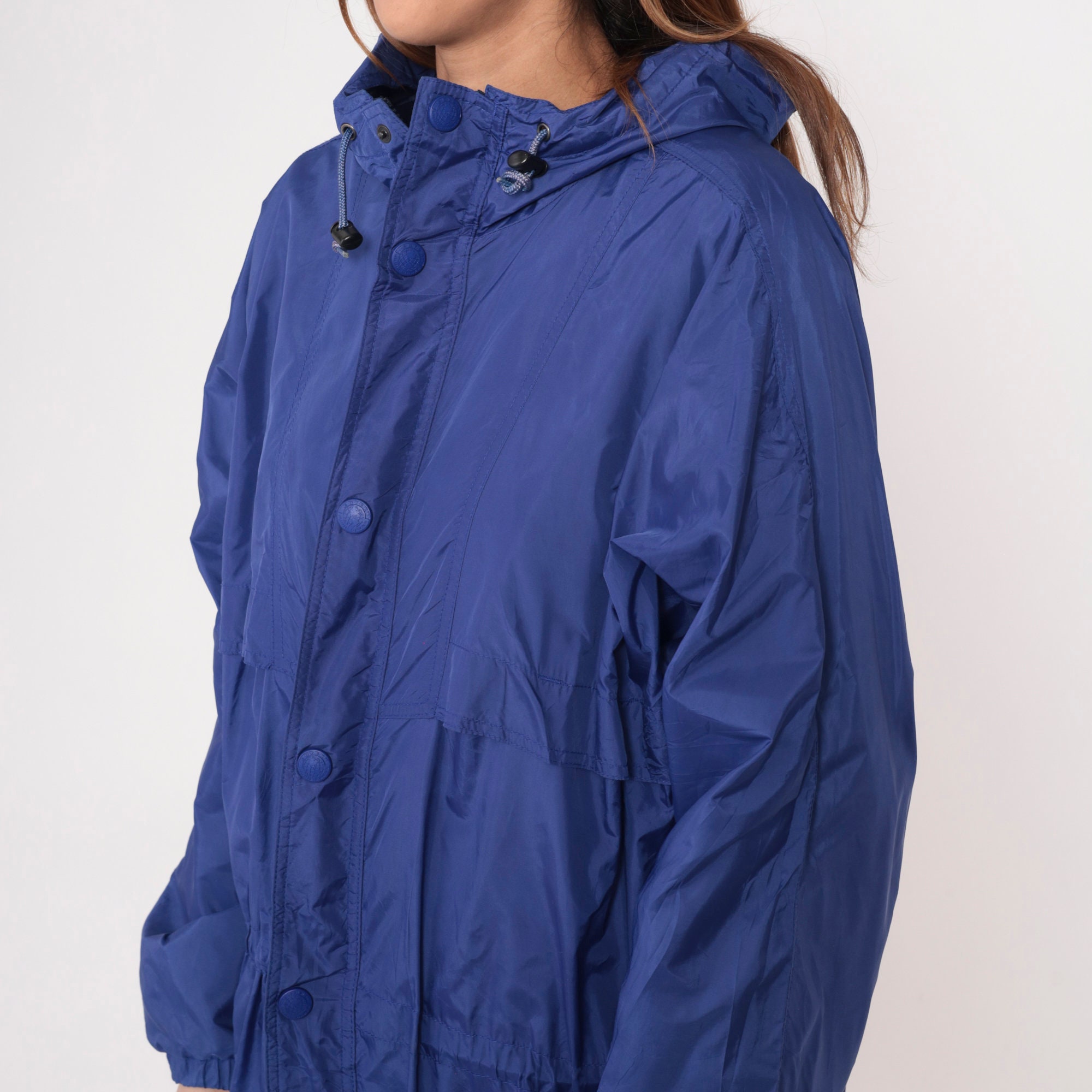 Vintage 90s windbreaker jacket by Eddie Bauer in purple with a hood. Zips and snaps up the front and has a drawstring waist and hem.