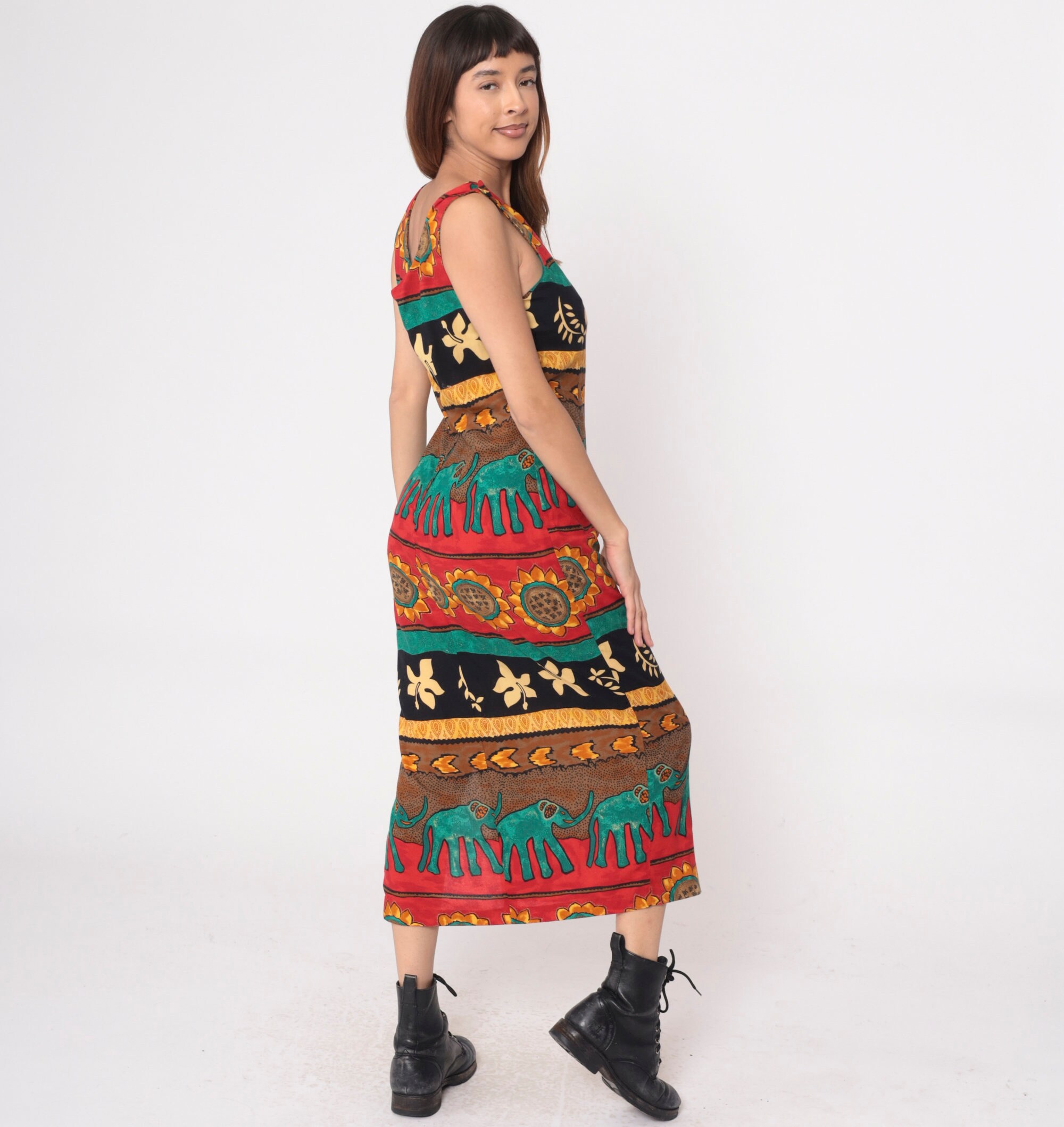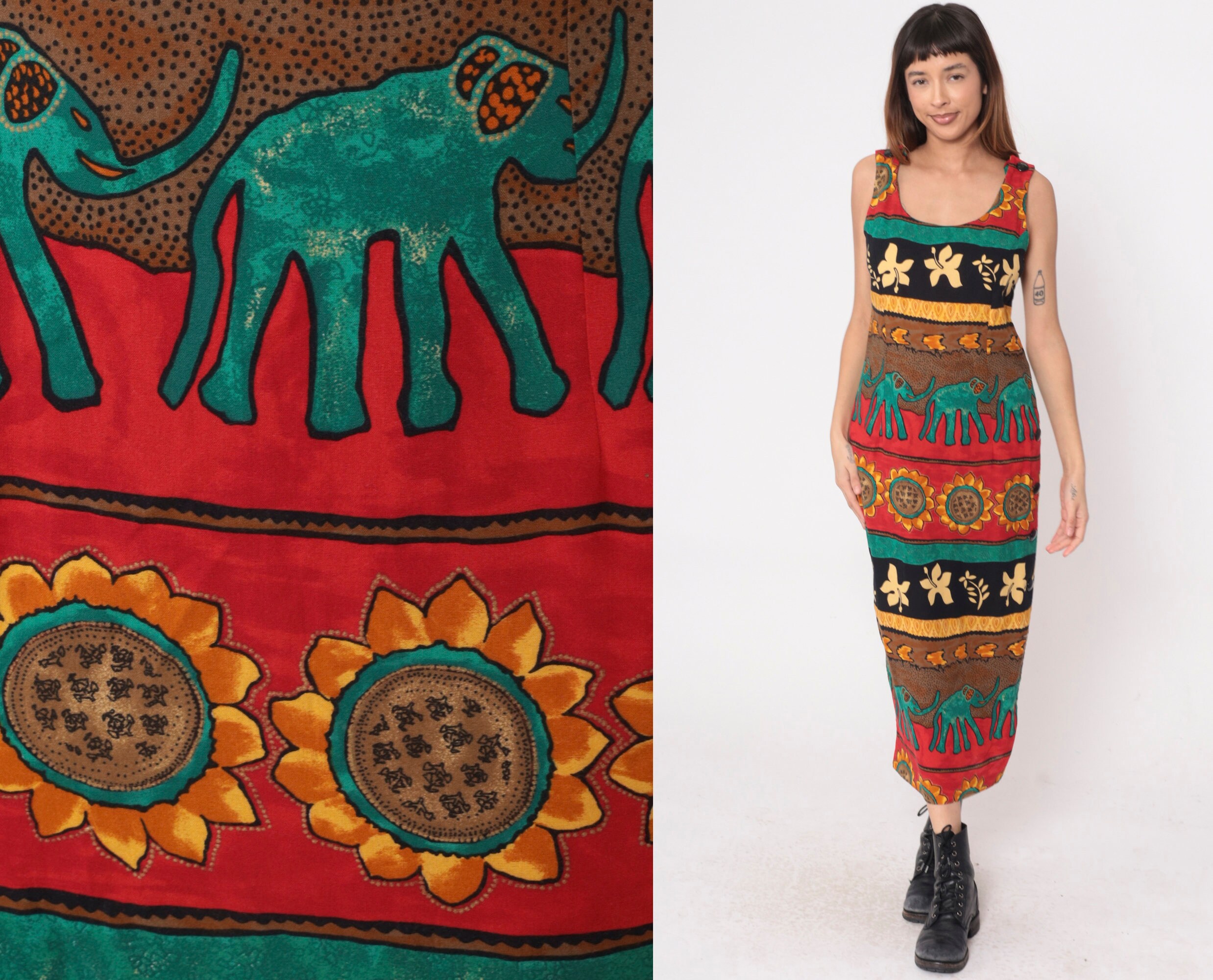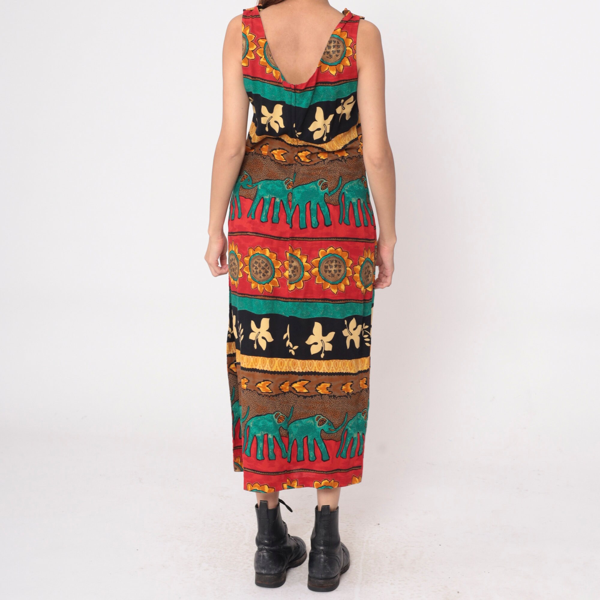 Vintage 90s dress with a striped tropical print featuring elephants and sunflowers. Sleeveless with a scoop neck. Ankle length with a rear zipper.