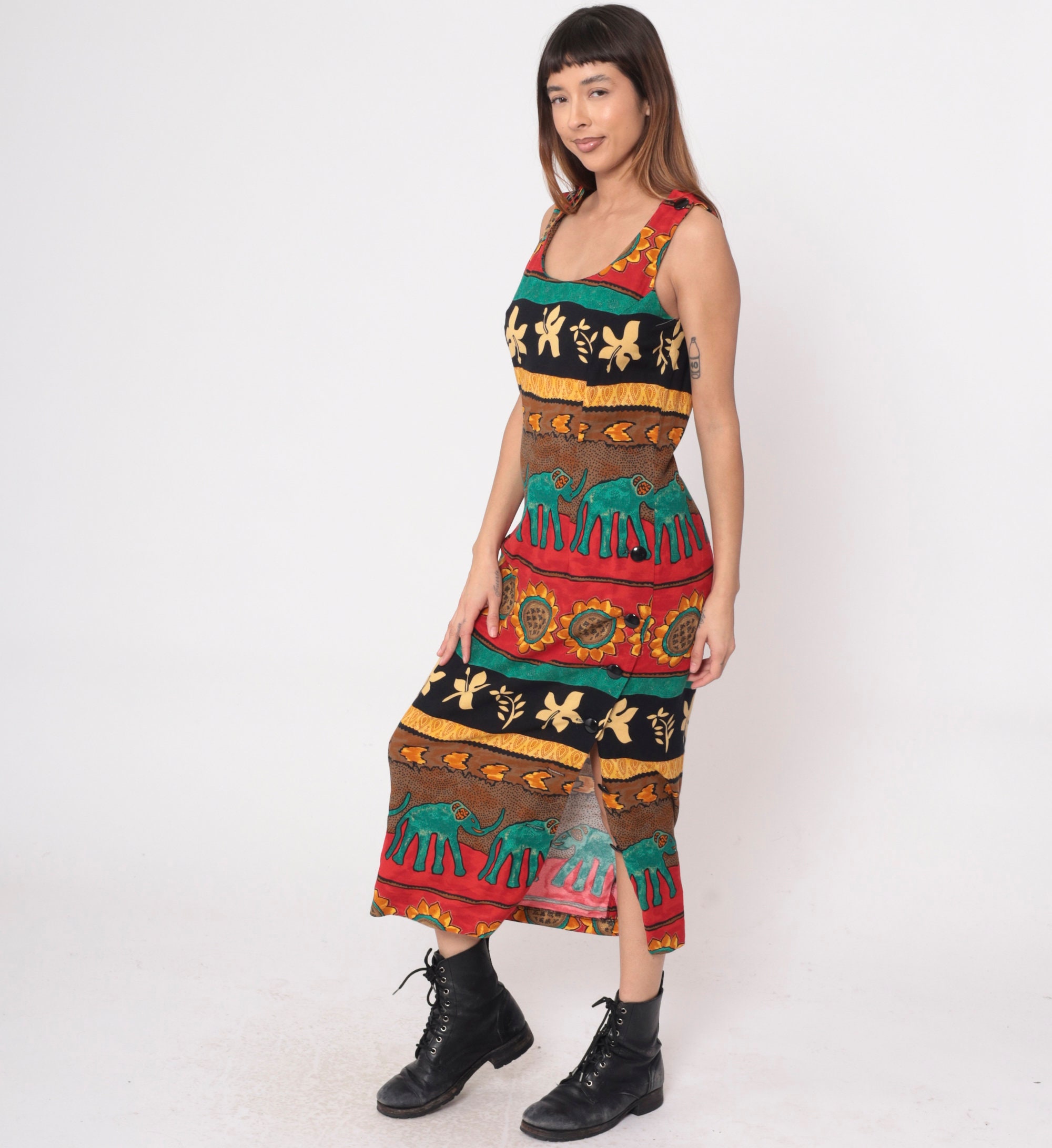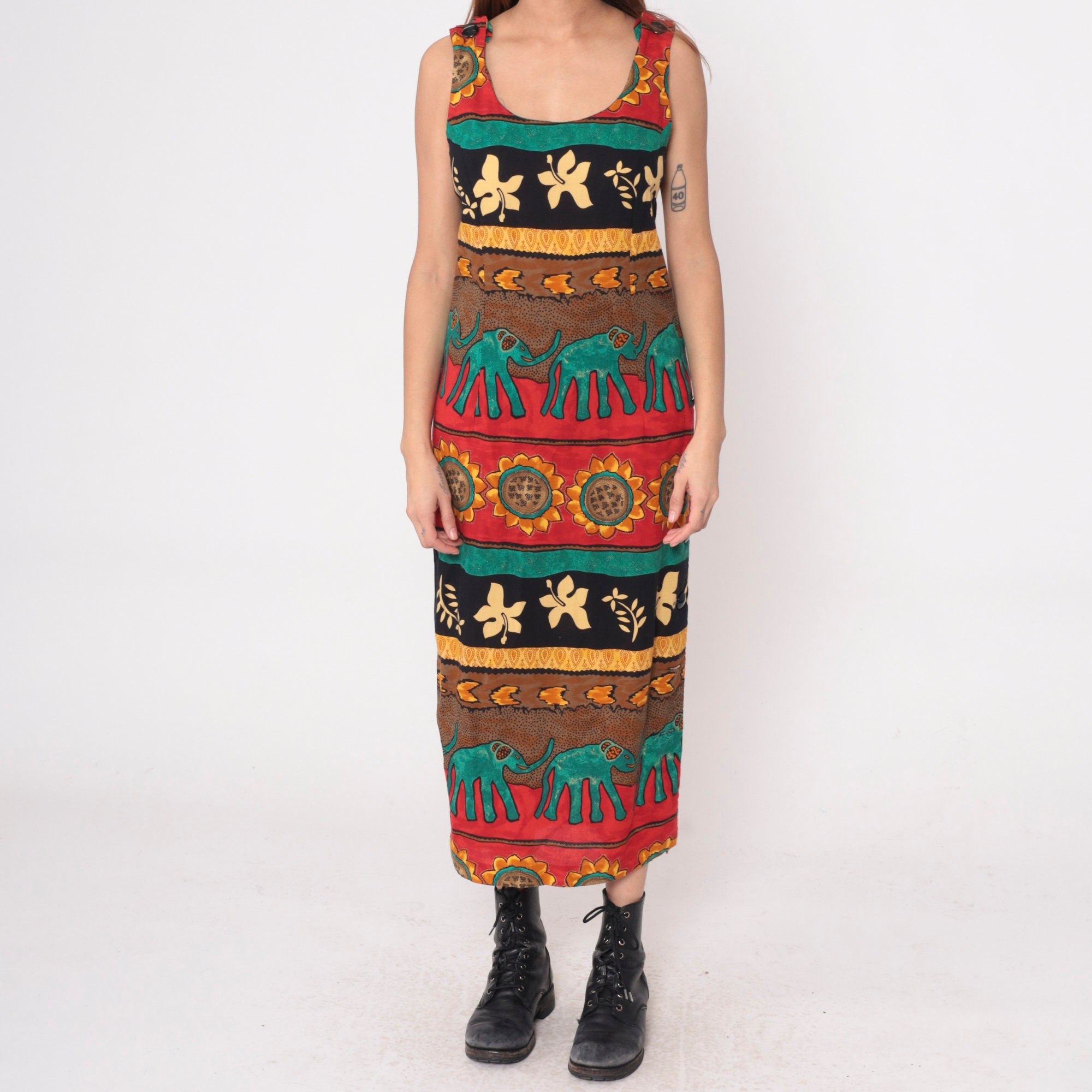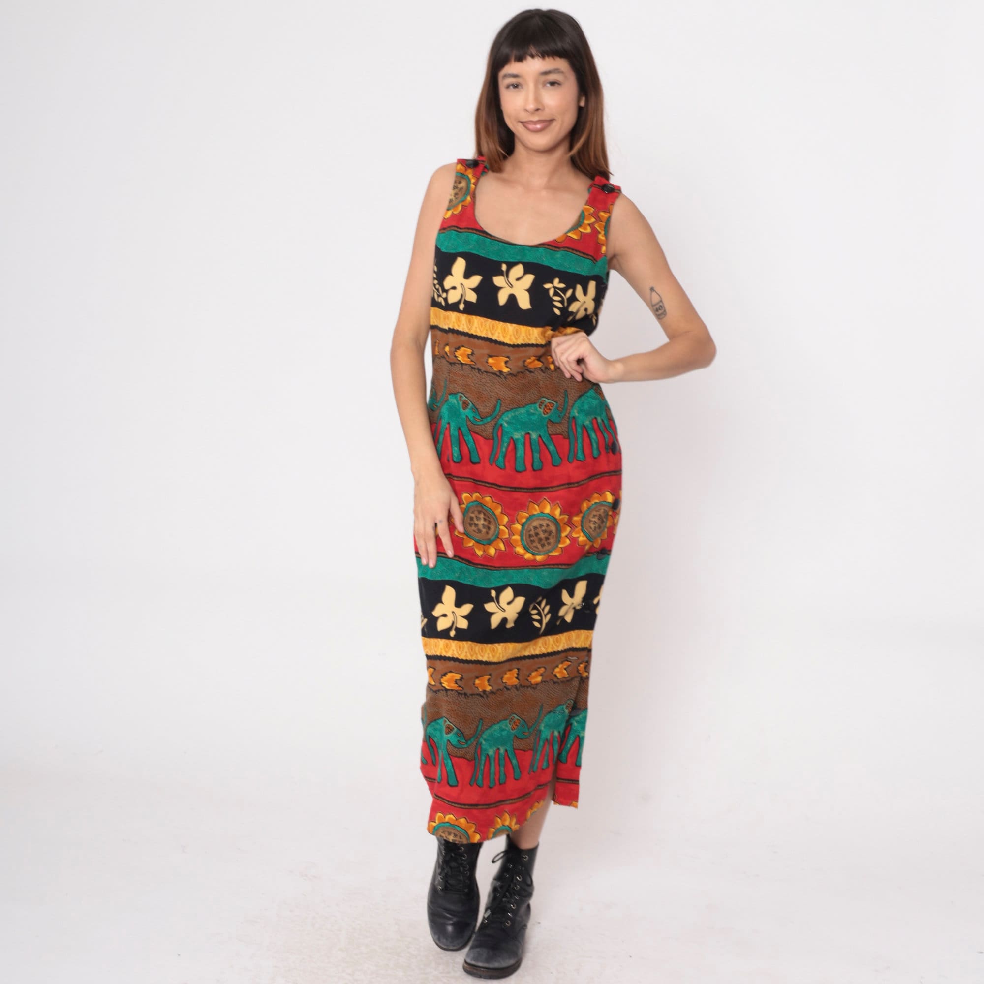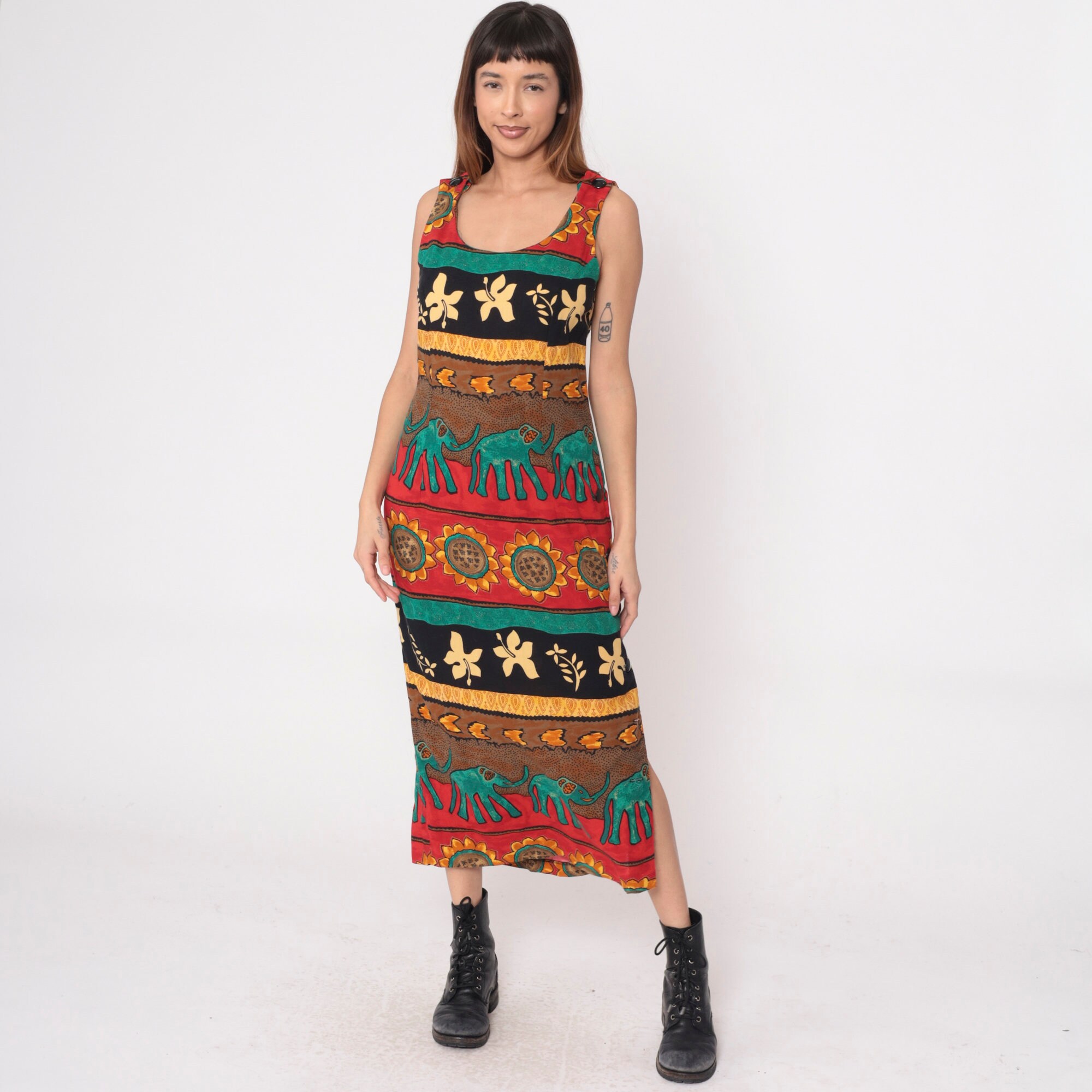 Vintage 90s dress with a striped tropical print featuring elephants and sunflowers. Sleeveless with a scoop neck. Ankle length with a rear zipper.