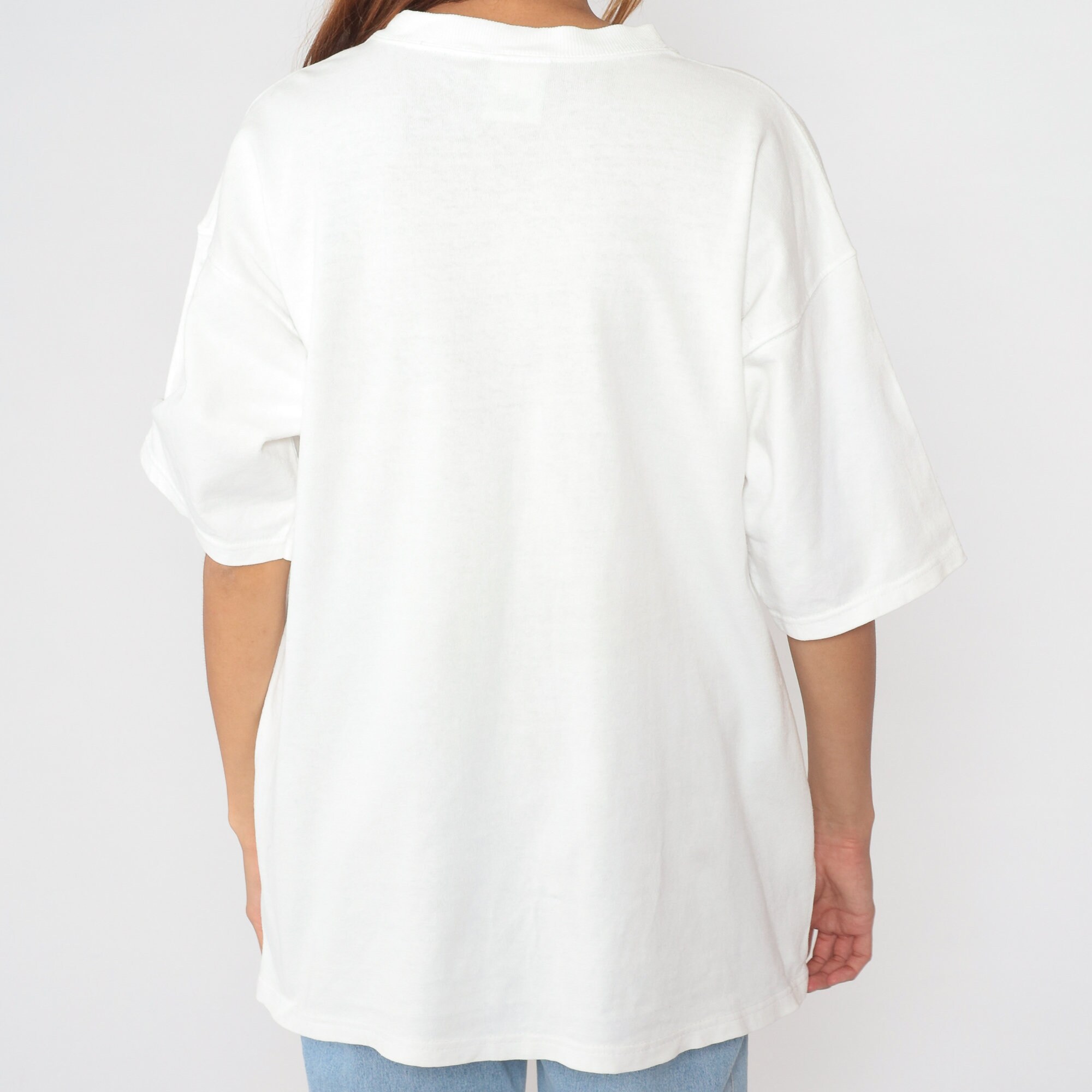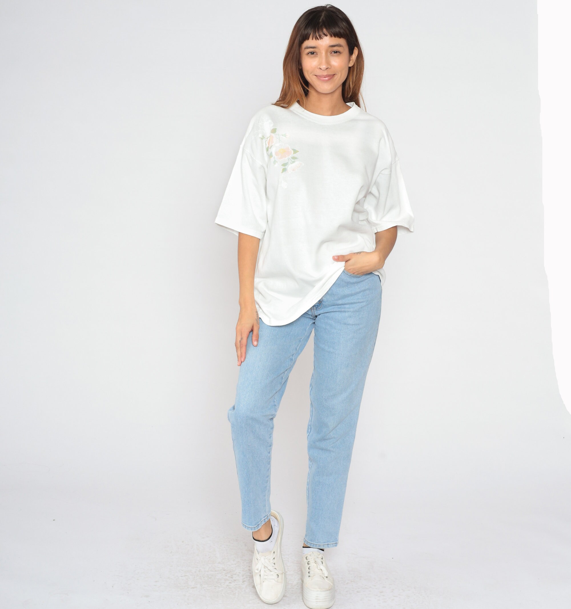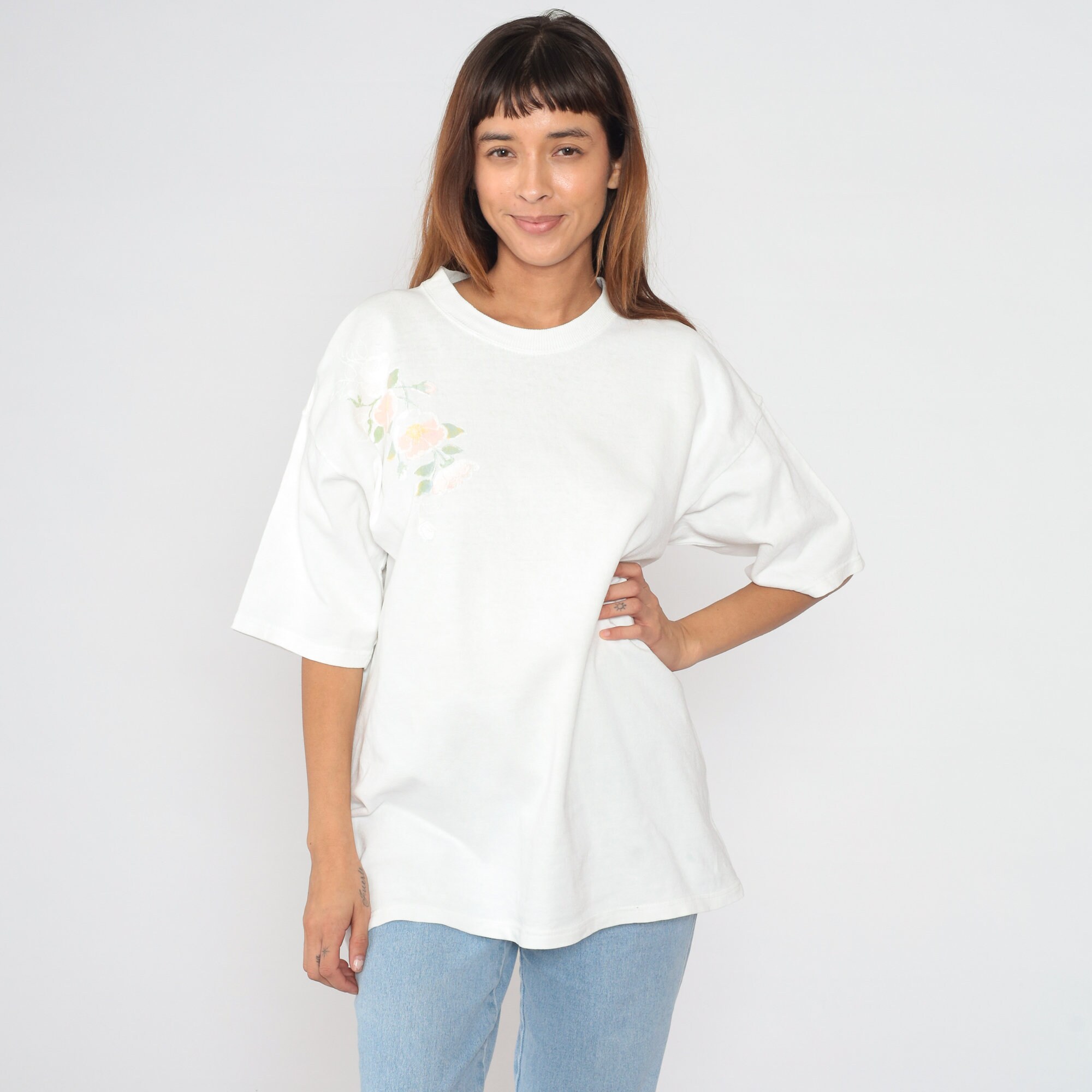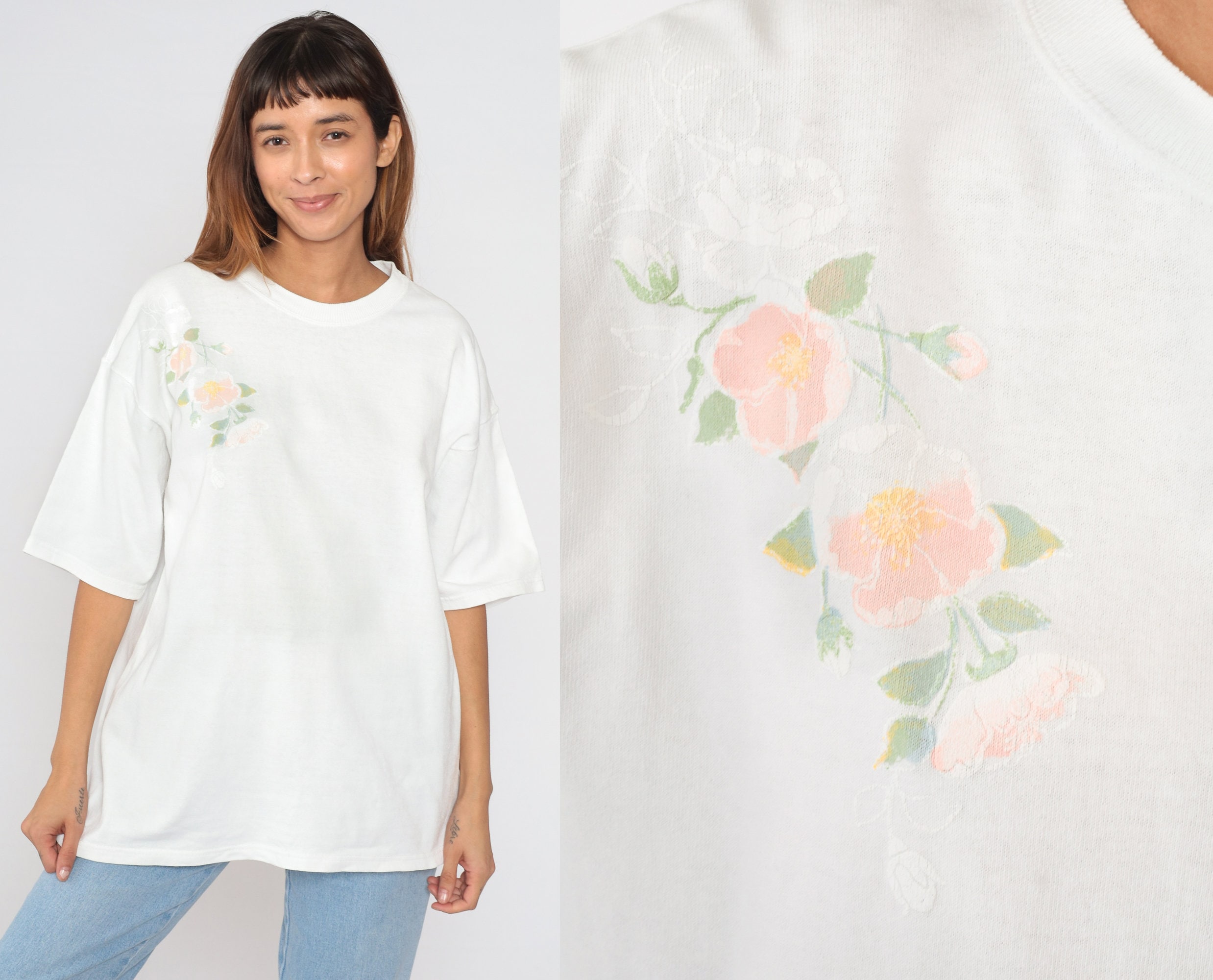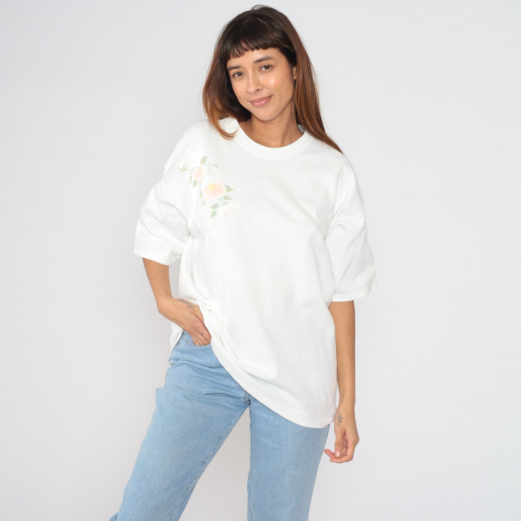 Vintage 90s shirt in white with a floral design on the chest.