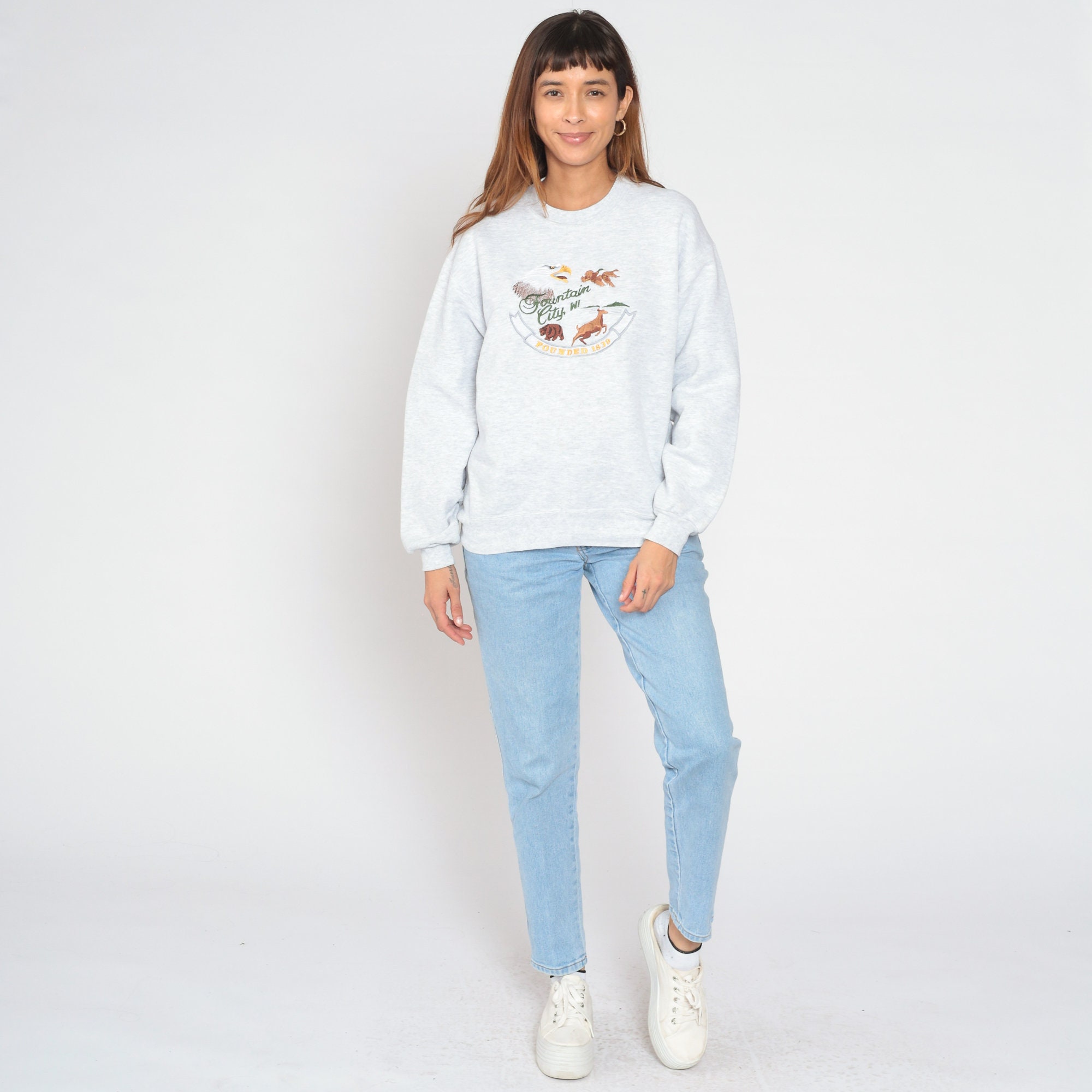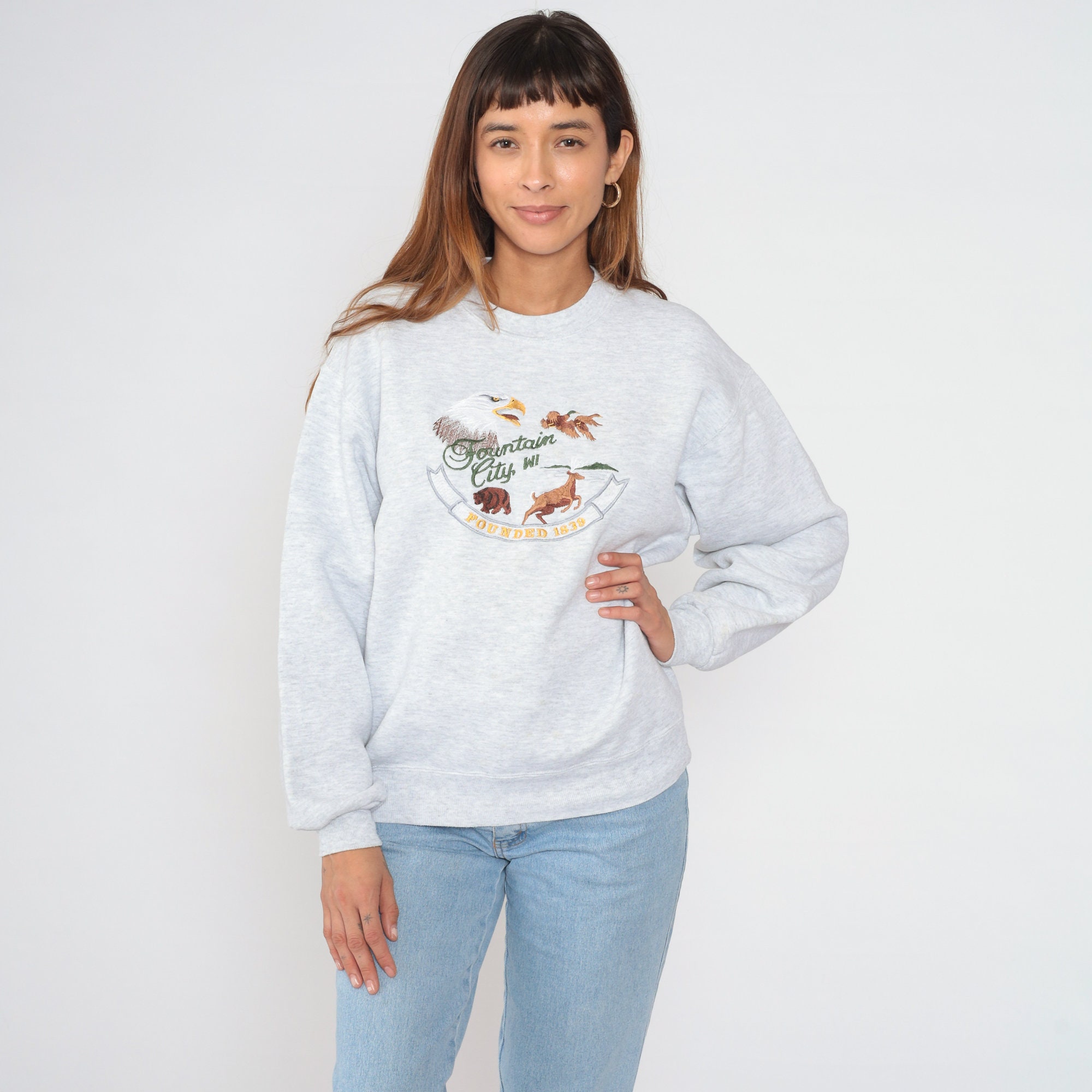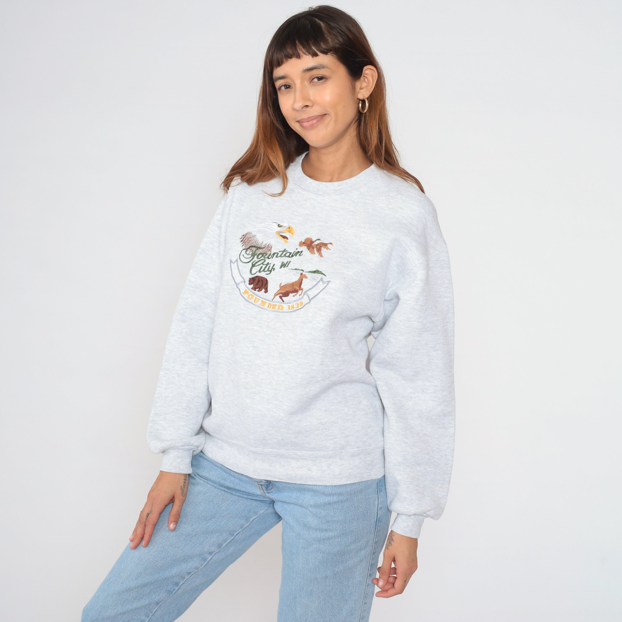 Vintage 90s sweatshirt with embroidered animals and "Fountain City, WI" on the front.