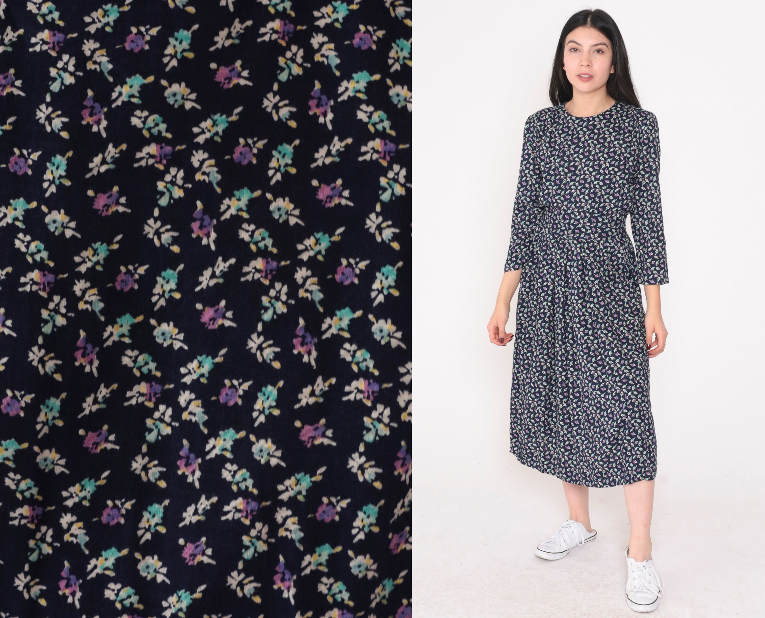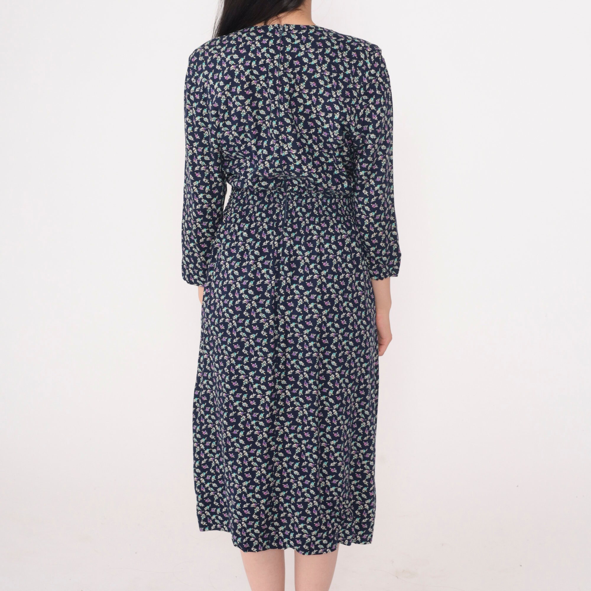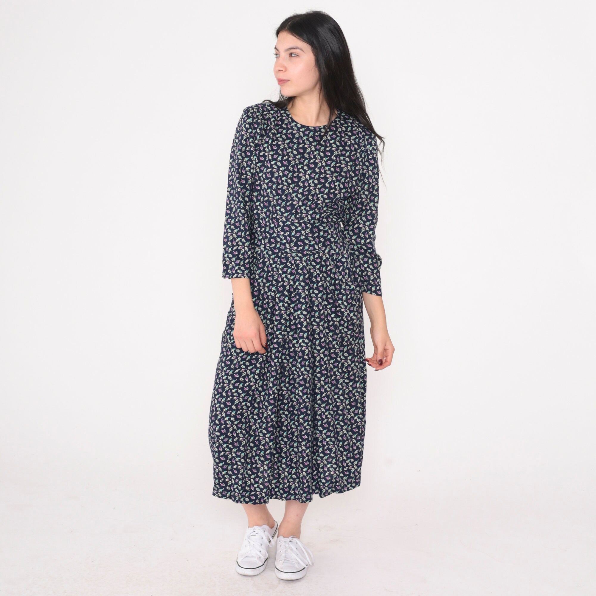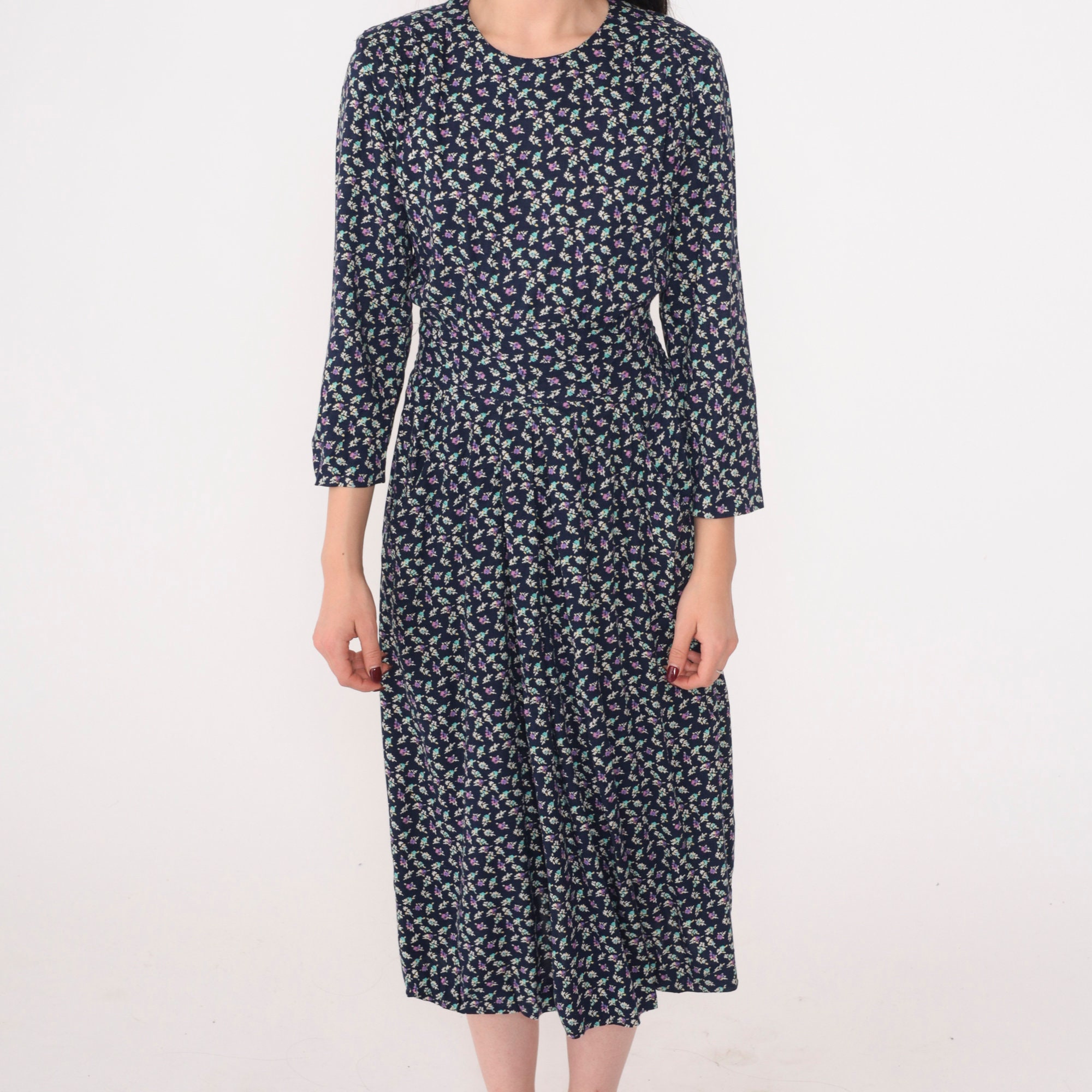 Vintage 90s dress in navy blue with a floral print. High waisted with 3/4 sleeves and a pleated skirt. Midi length with a rear zipper and pokets.