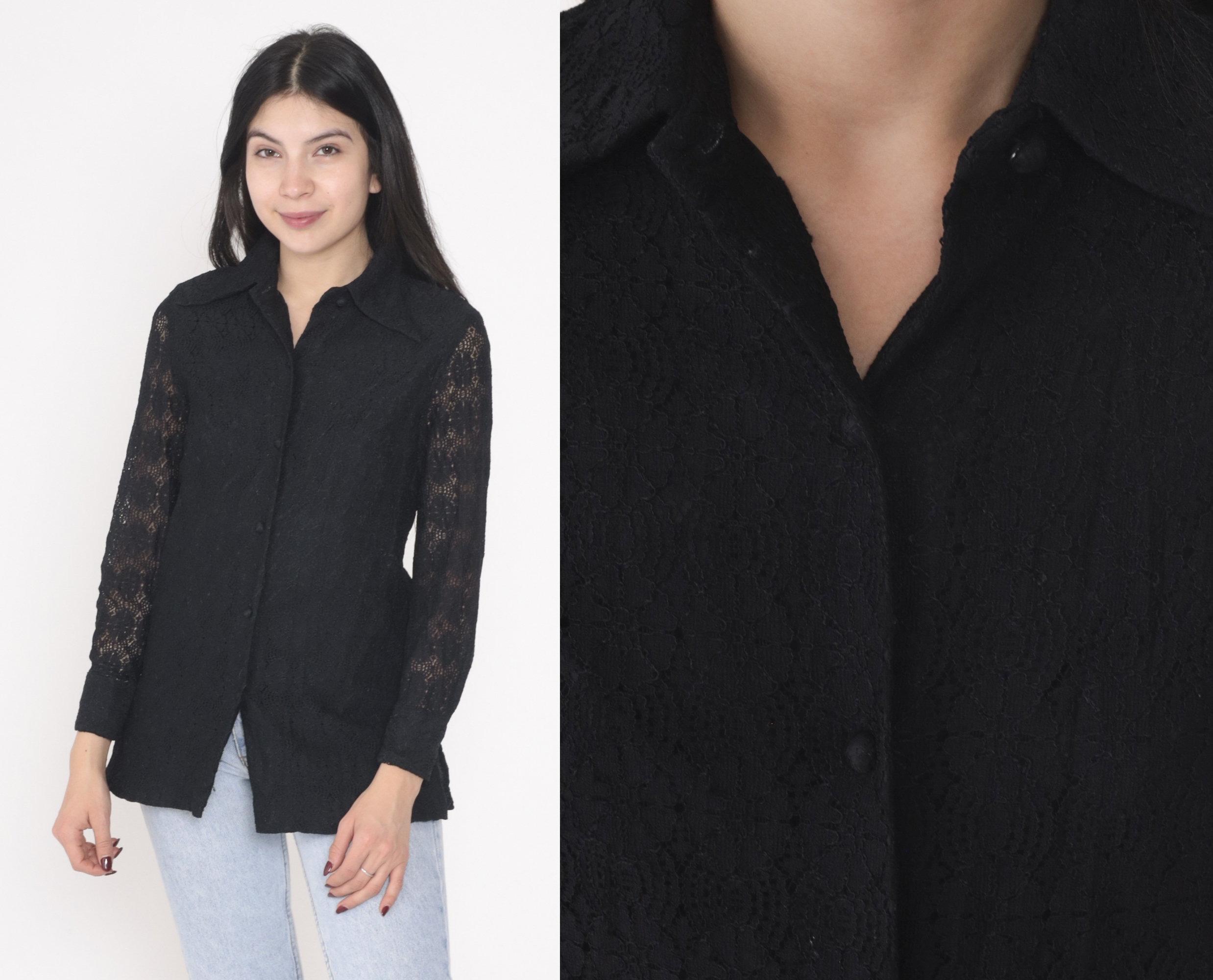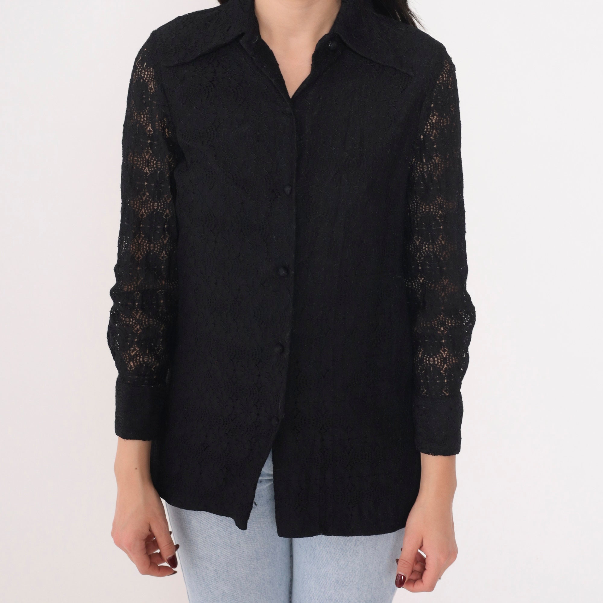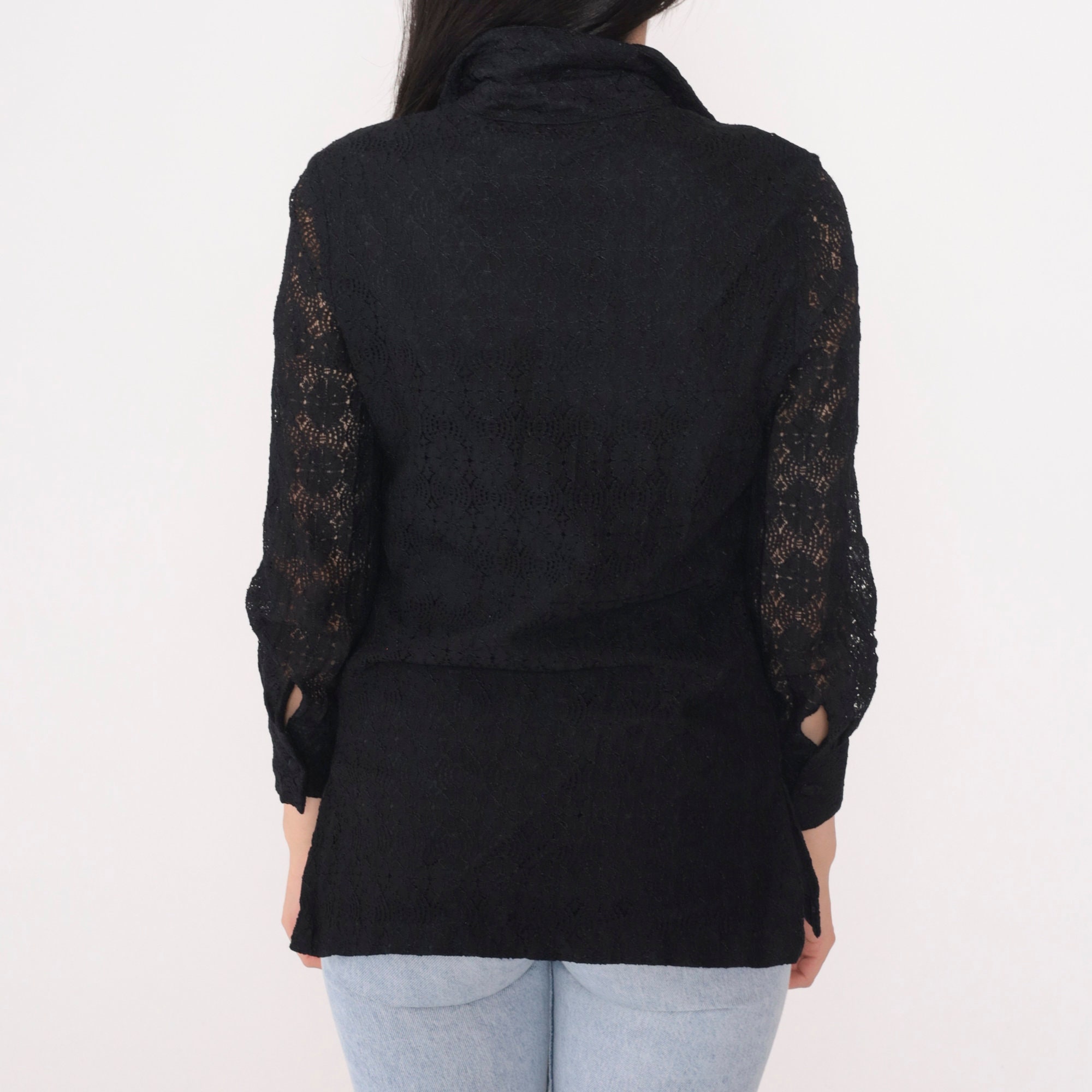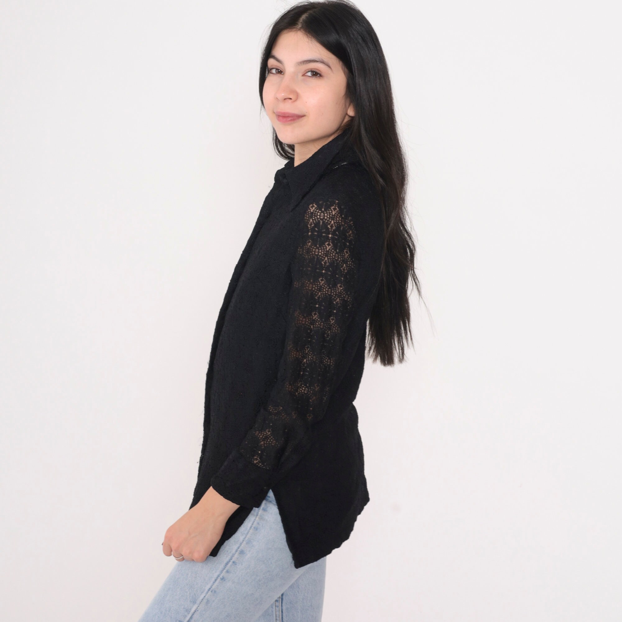 Vintage 80s blouse in black floral lace with long sheer sleeves and buttons up the front.
