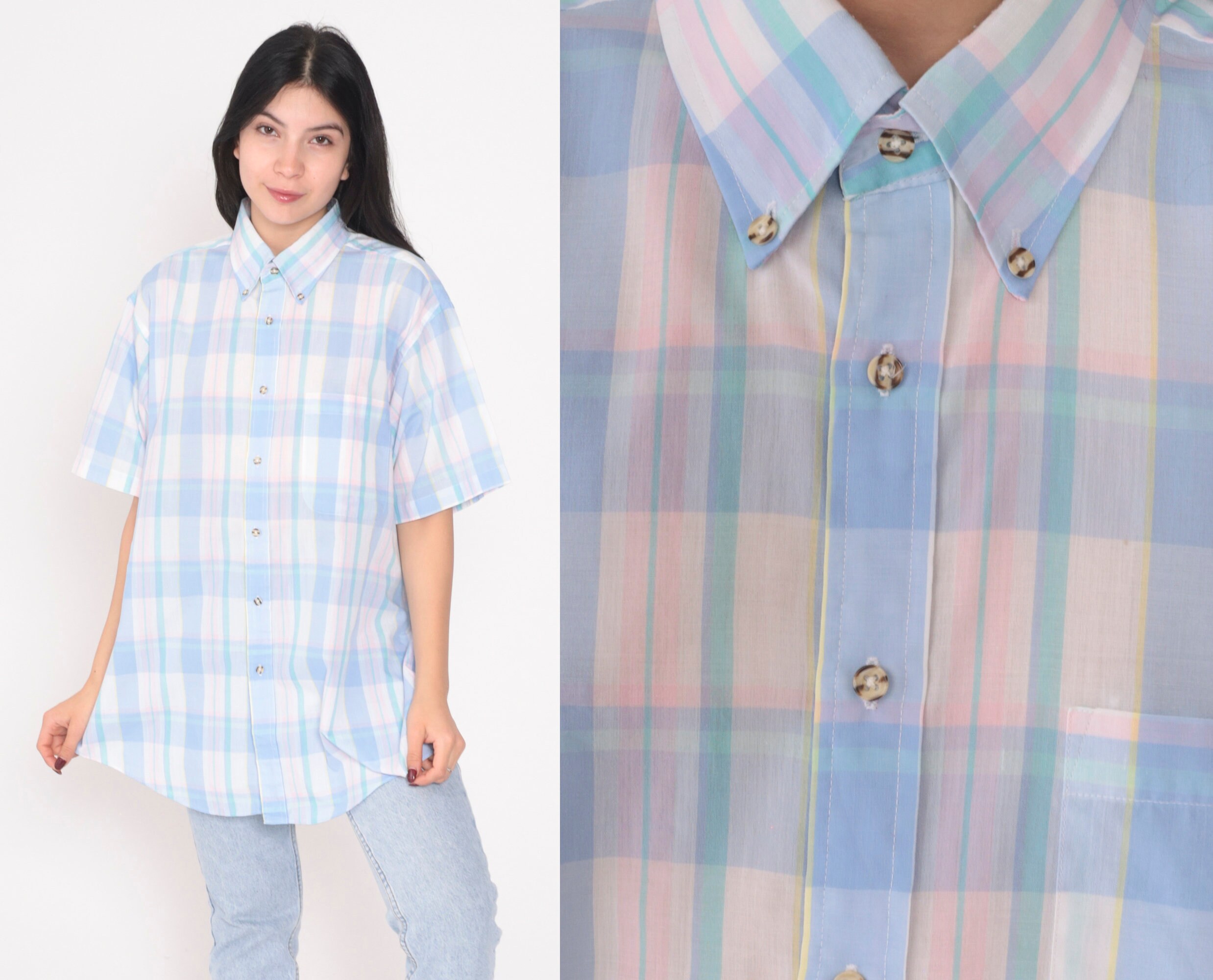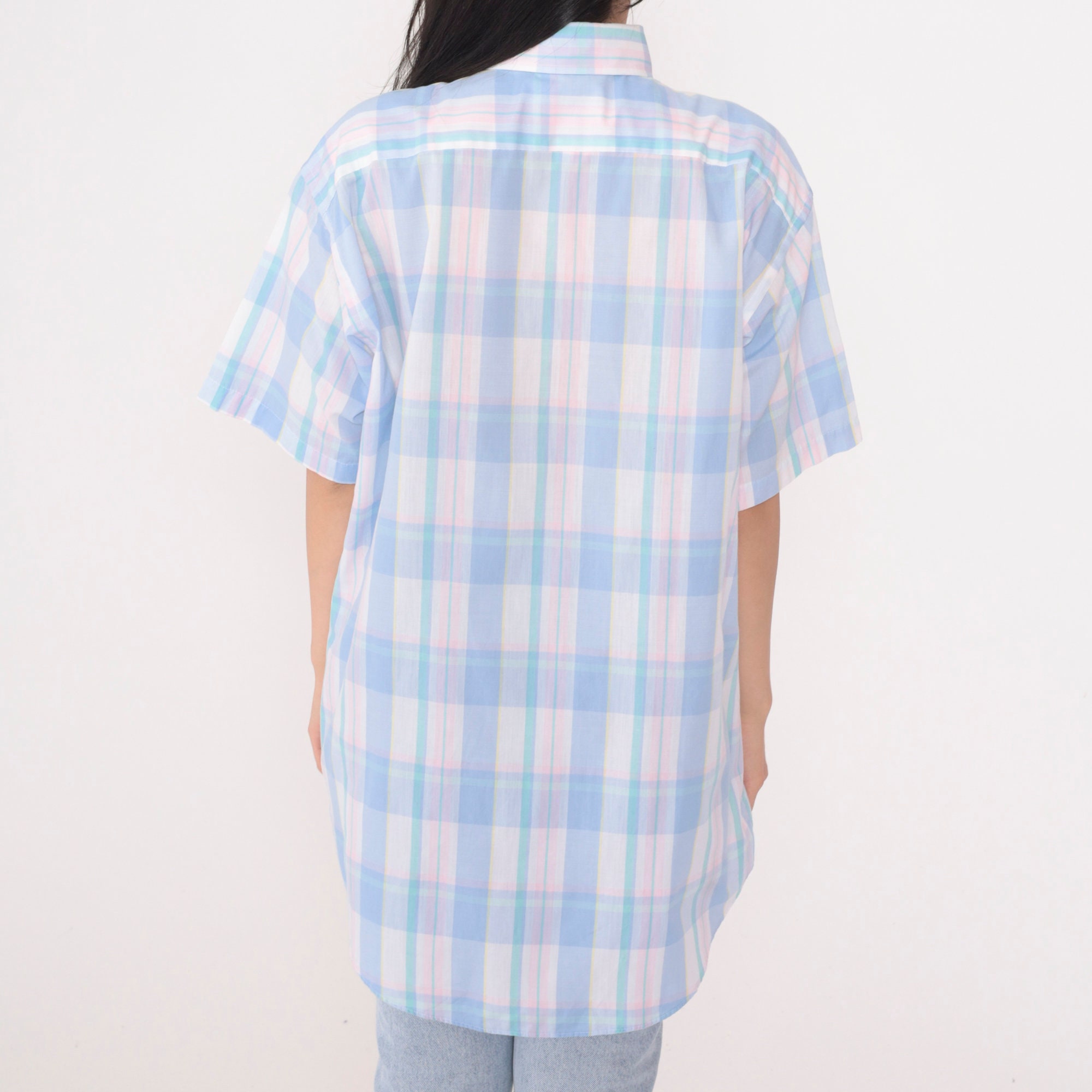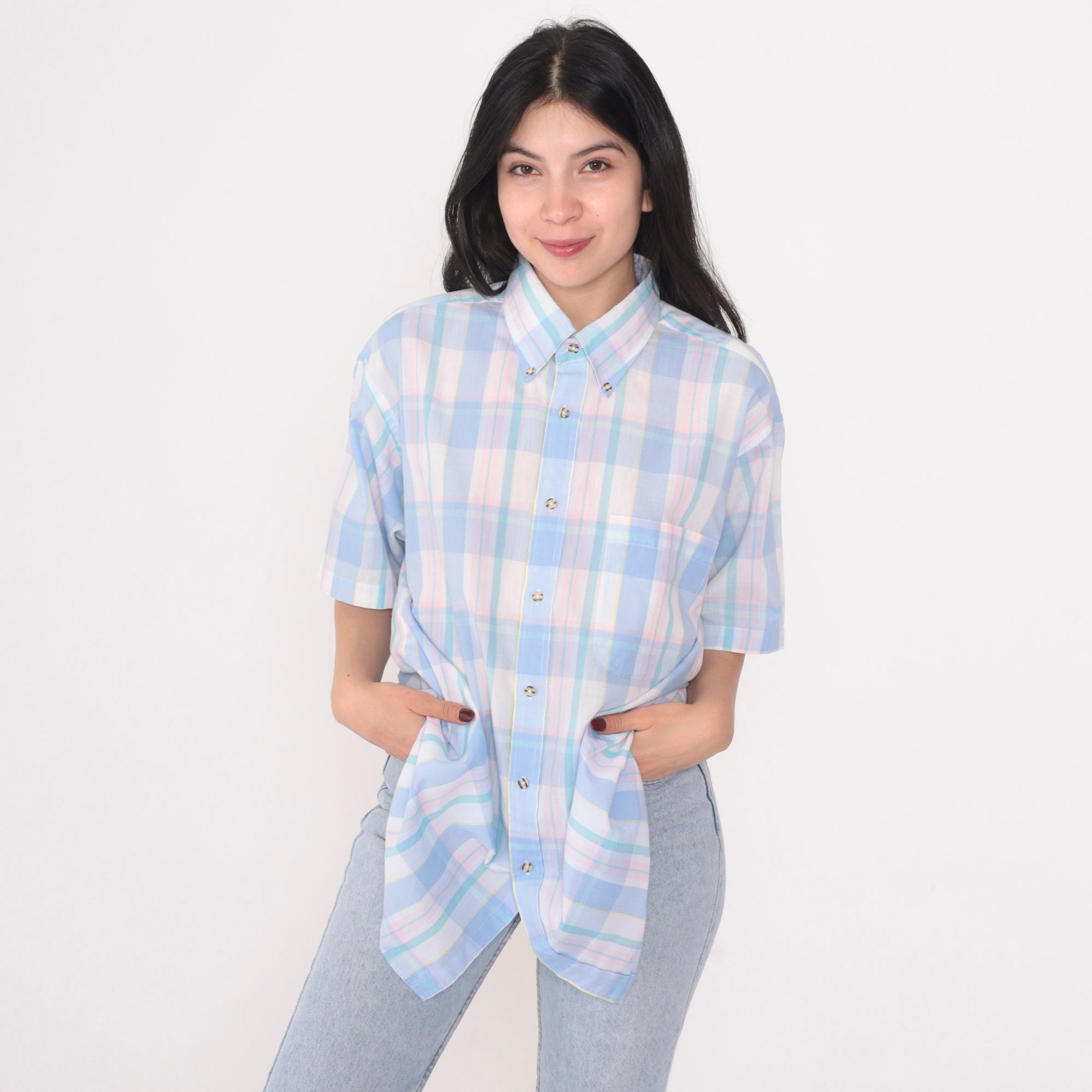 Vintage 90s shirt in plaid. Buttons down the front, short sleeves.
