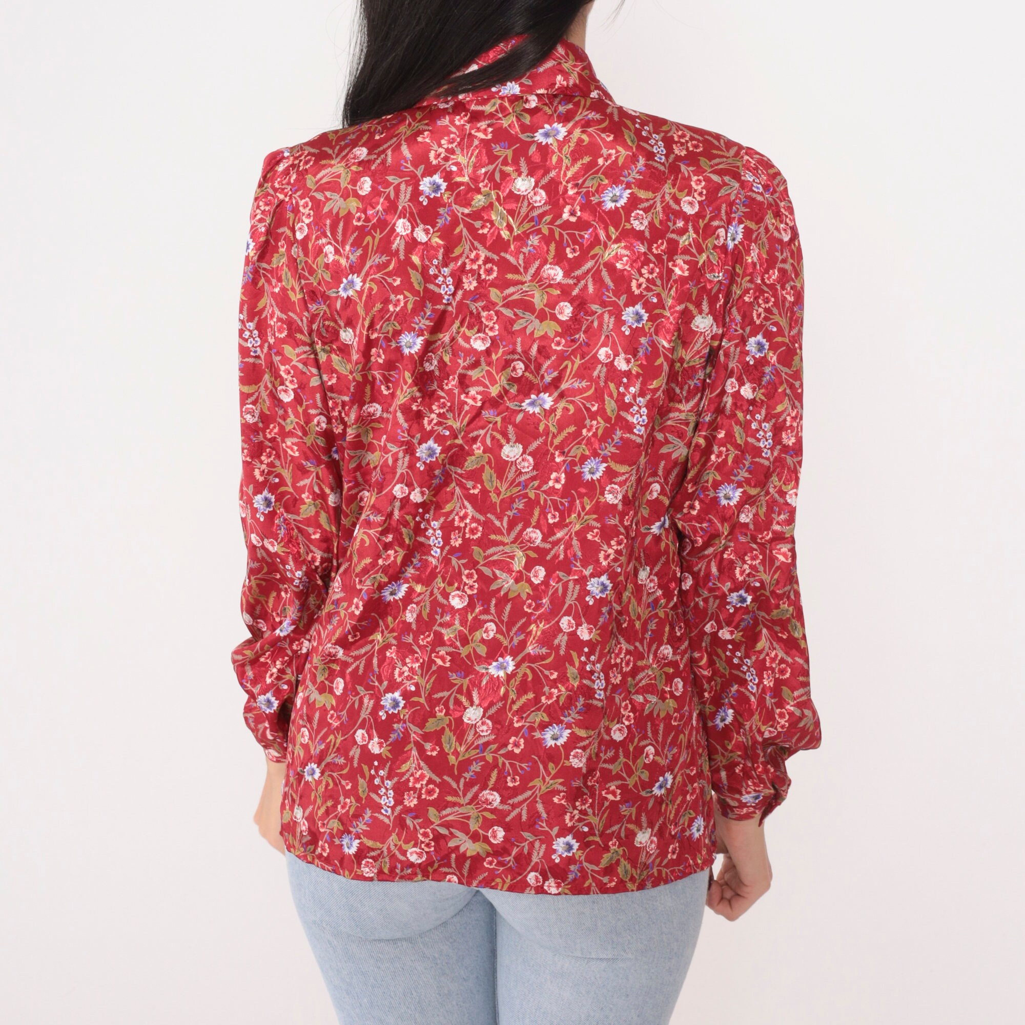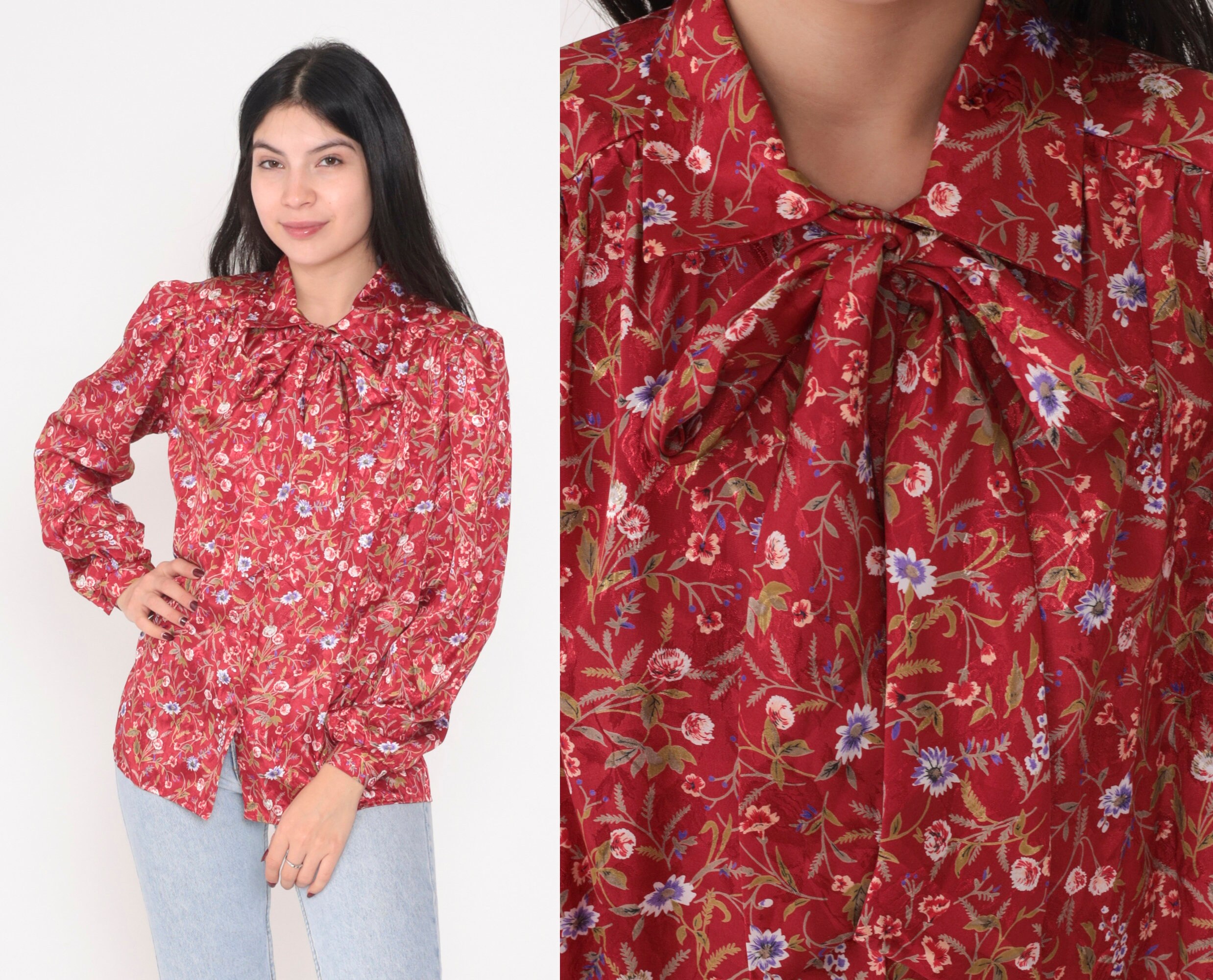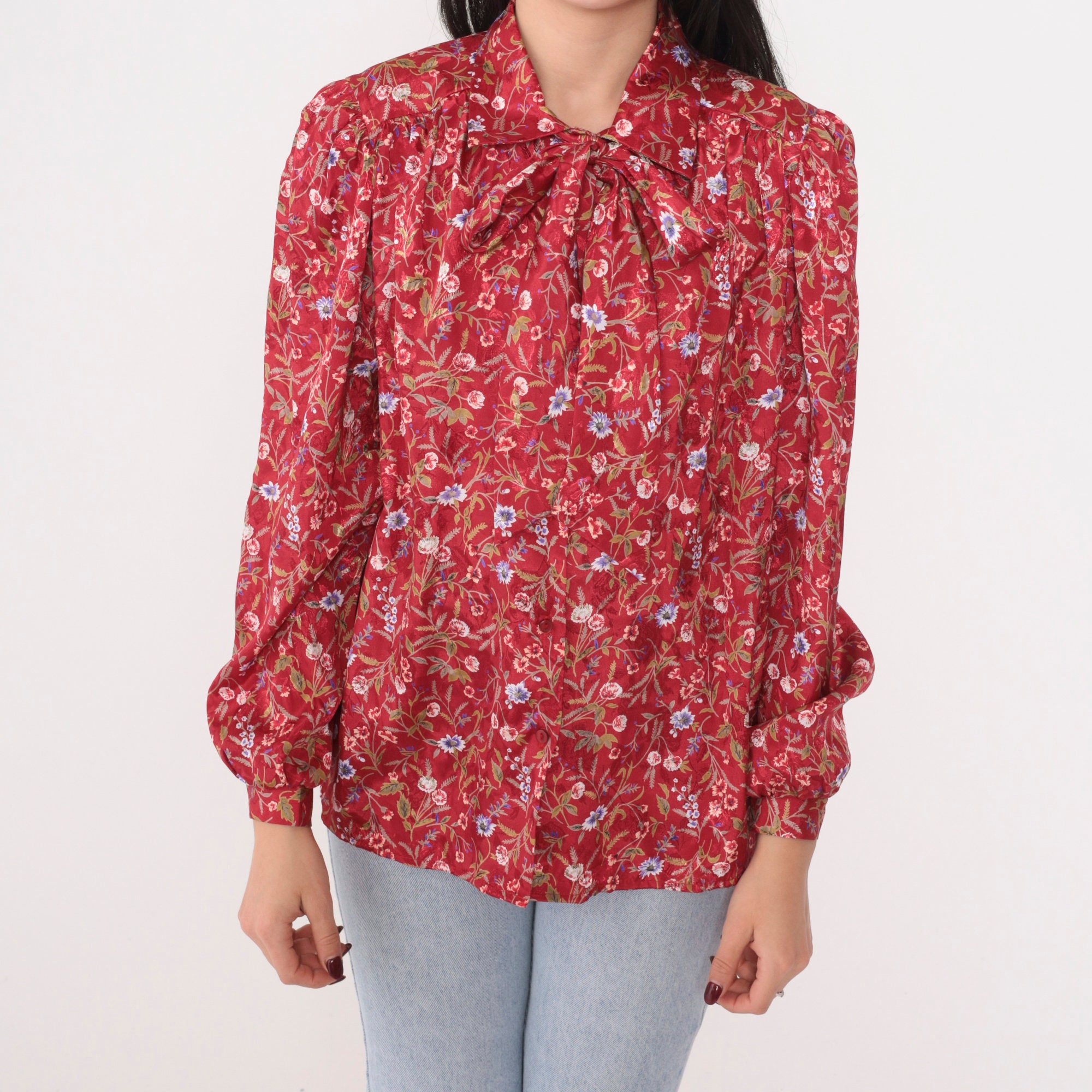 Vintage 80s blouse with a floral print and an ascot bow at the neck. Buttons up the front with long puff sleeves.
