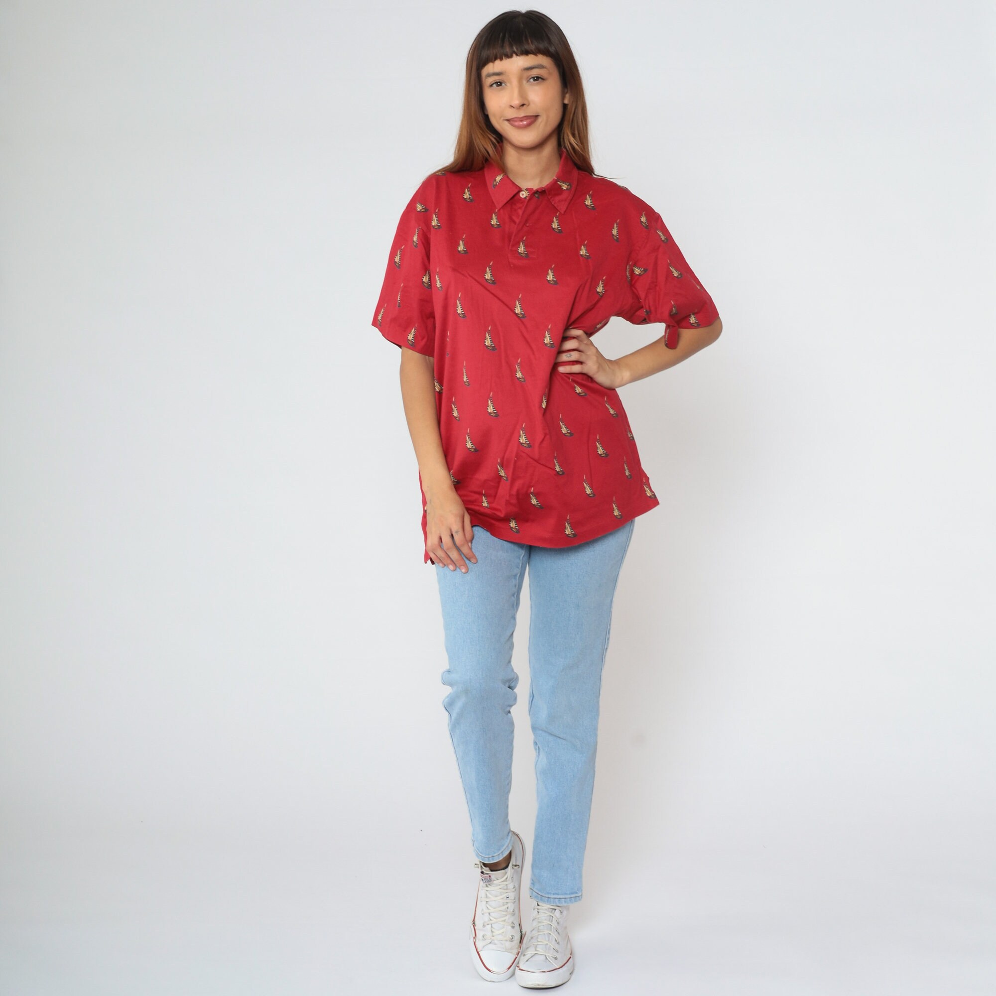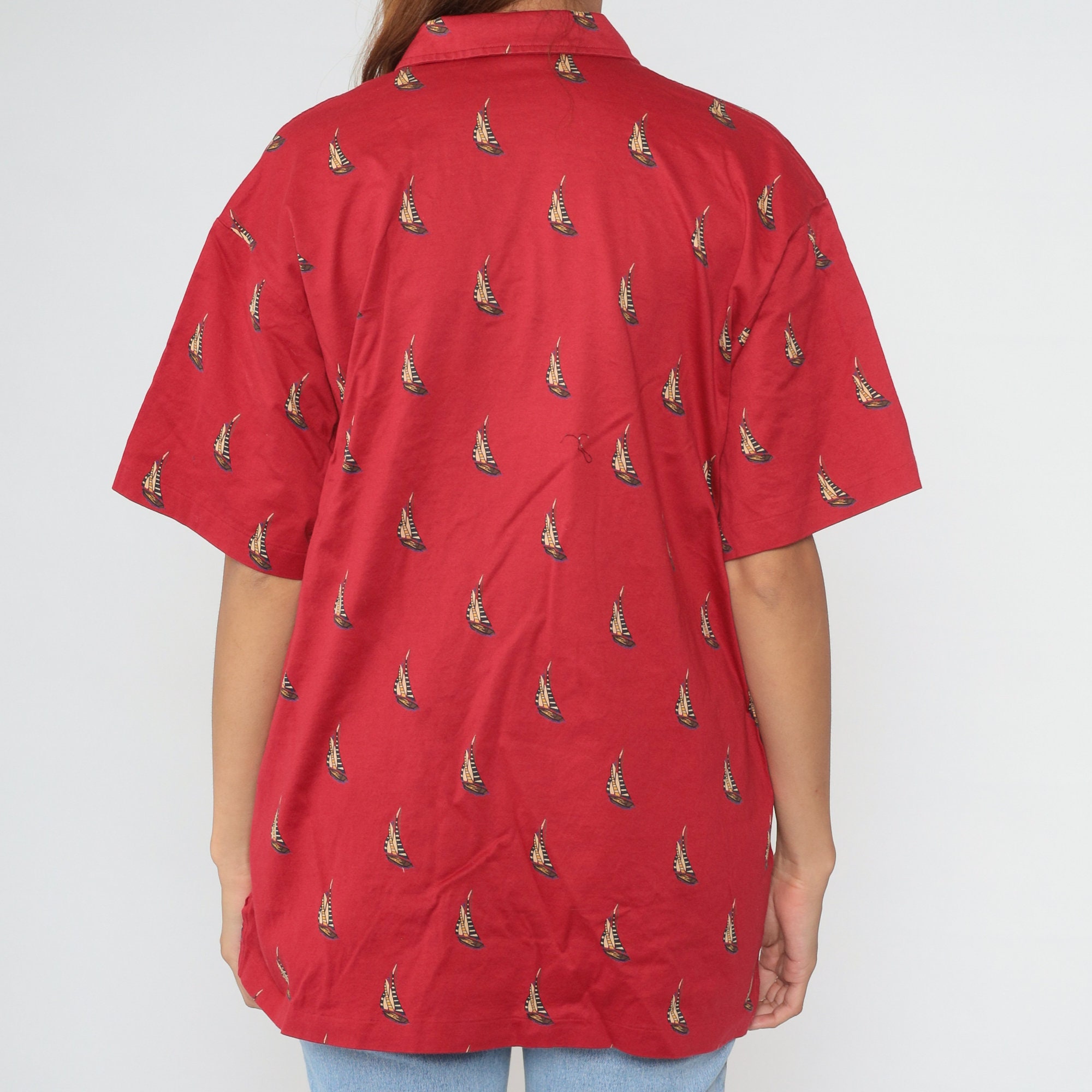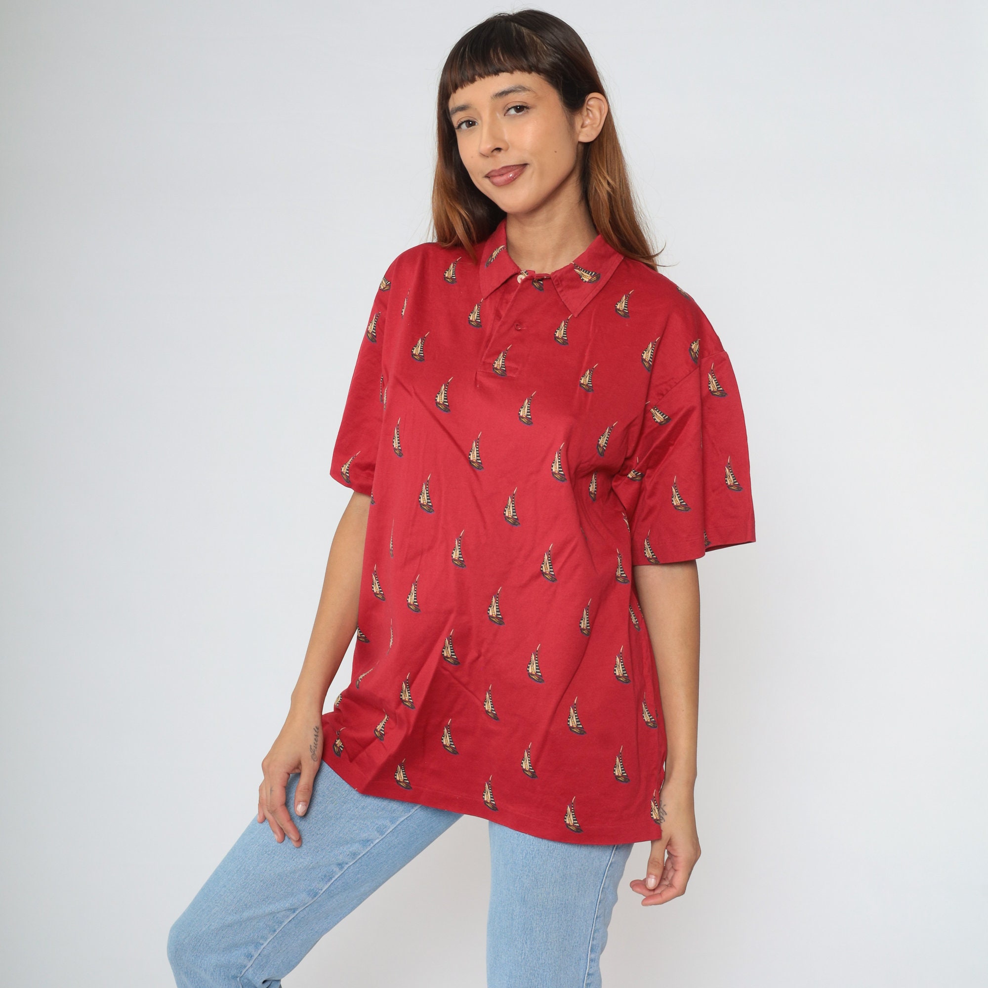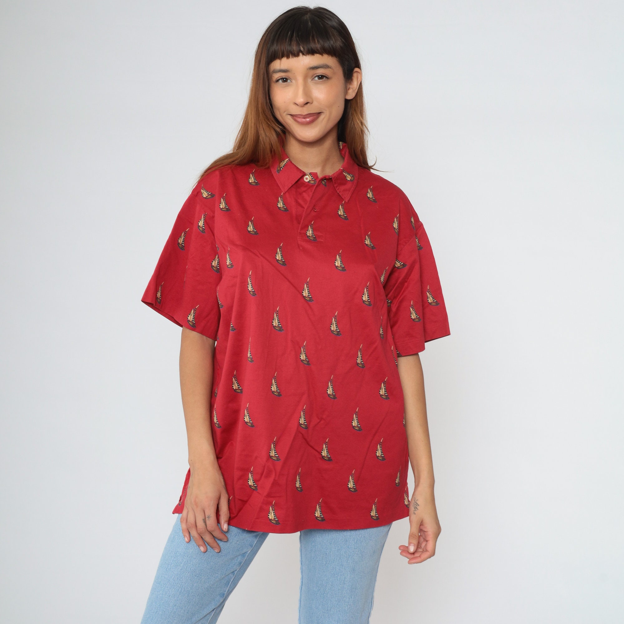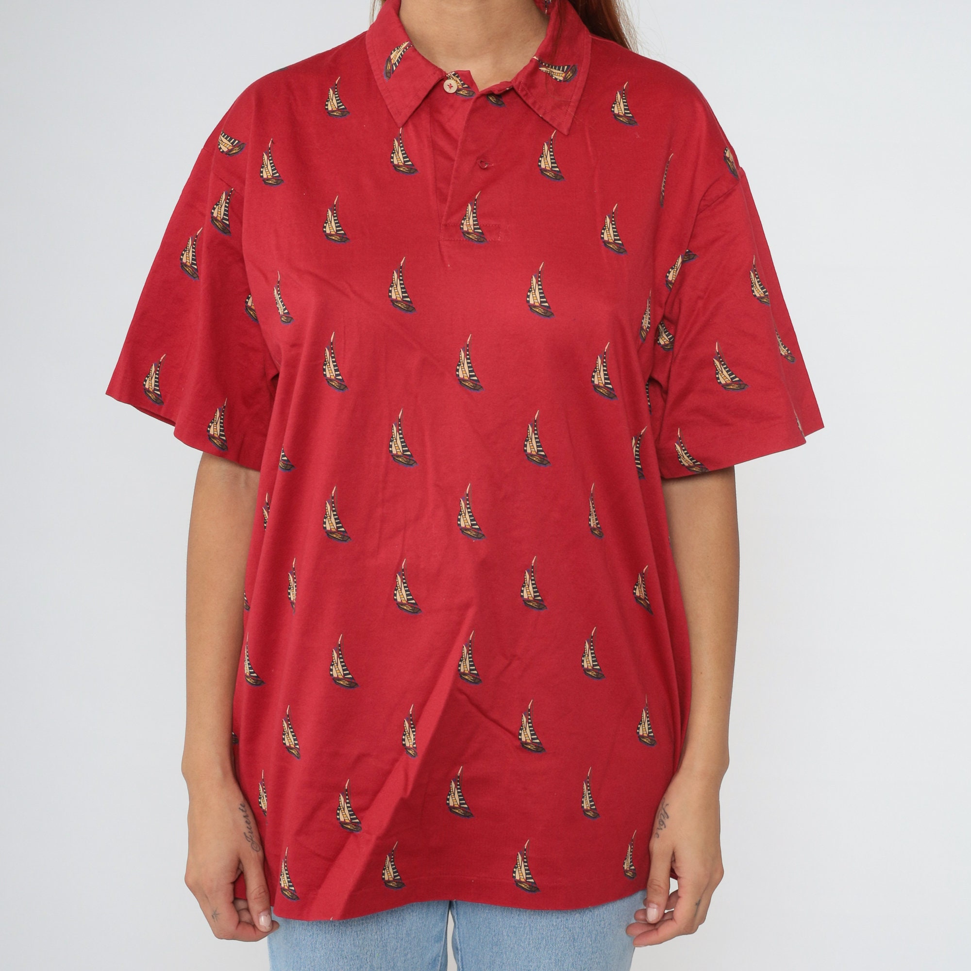 Vintage 90s polo shirt by Ralph Lauren in red with a sailboat print. It has short sleeves, buttons up the chest and a collar.