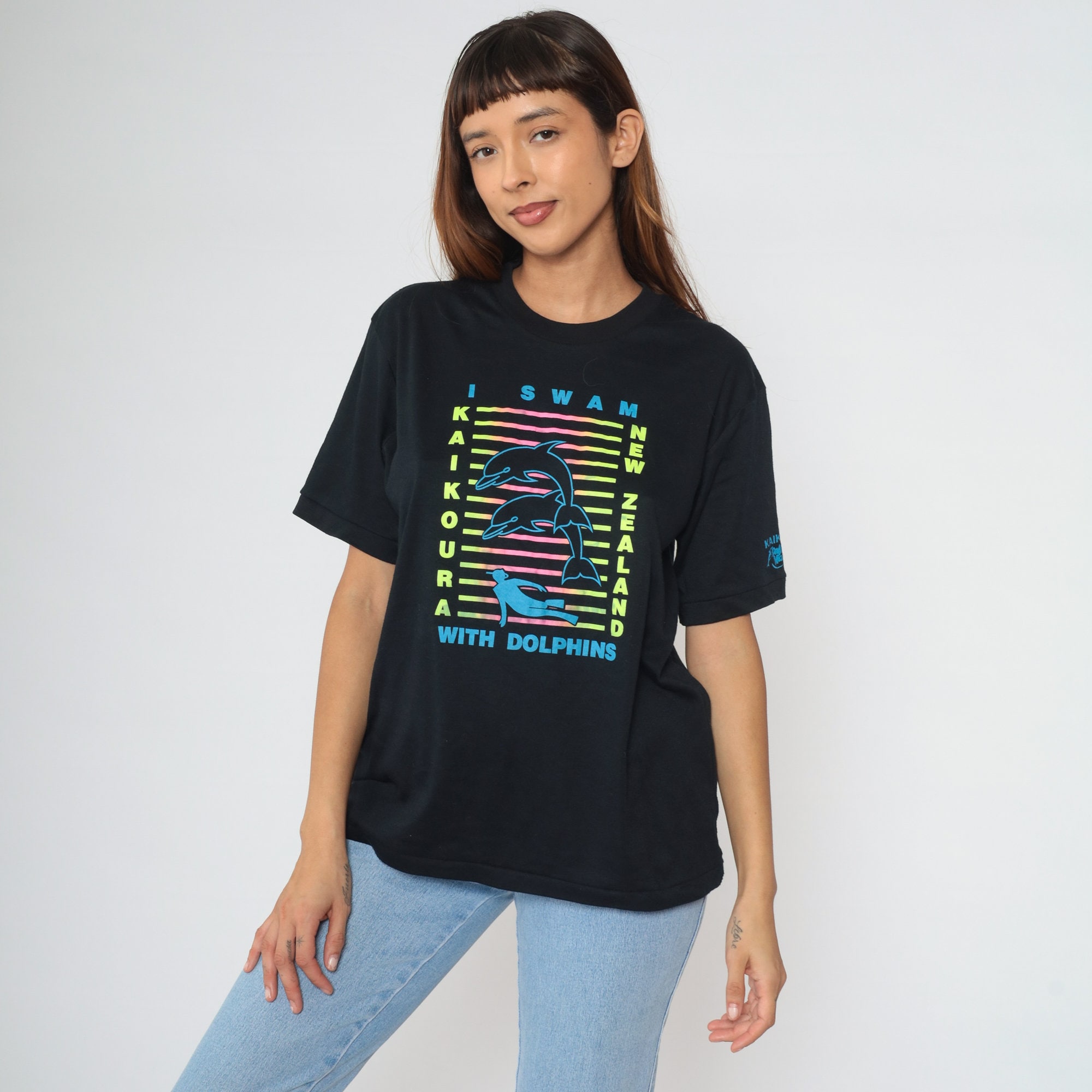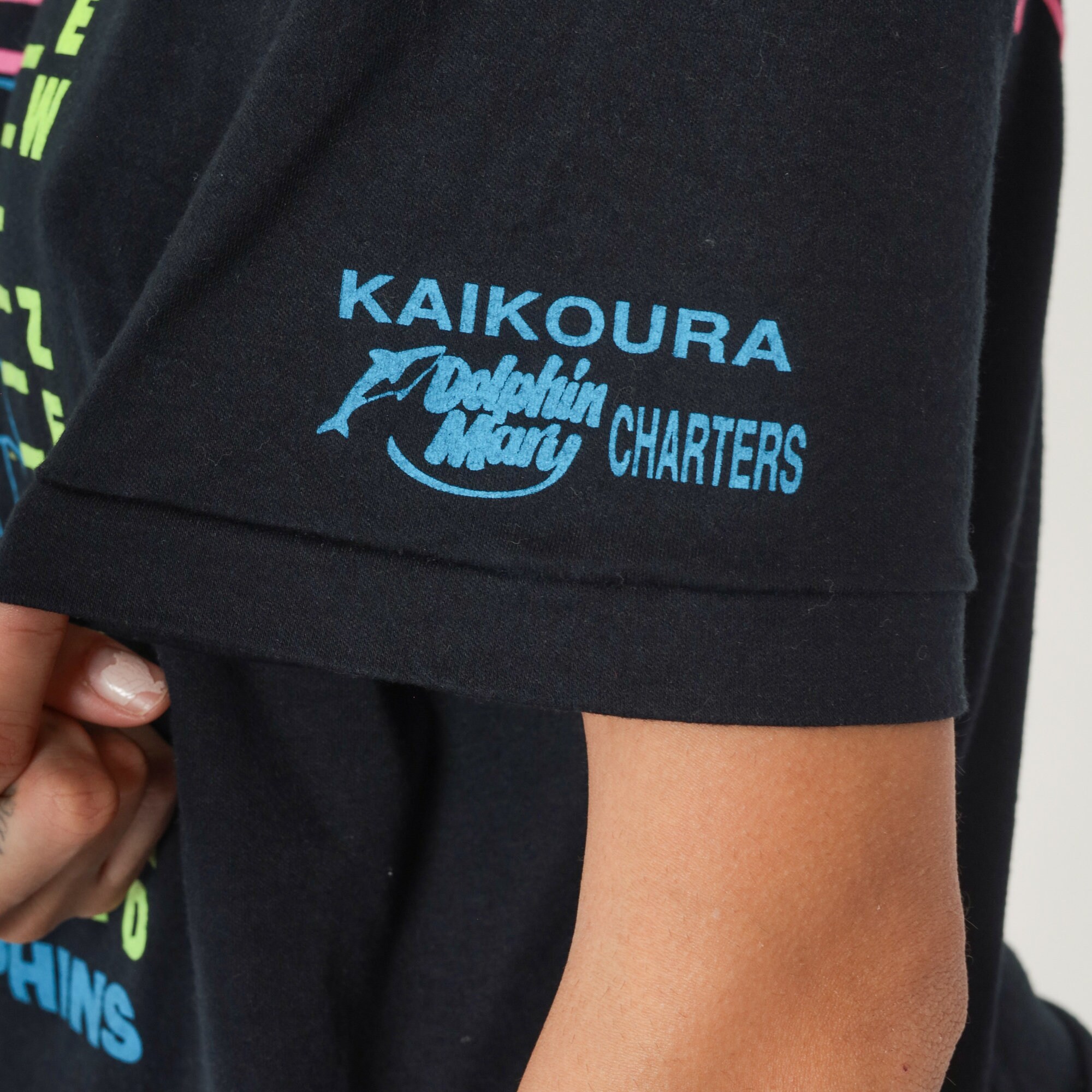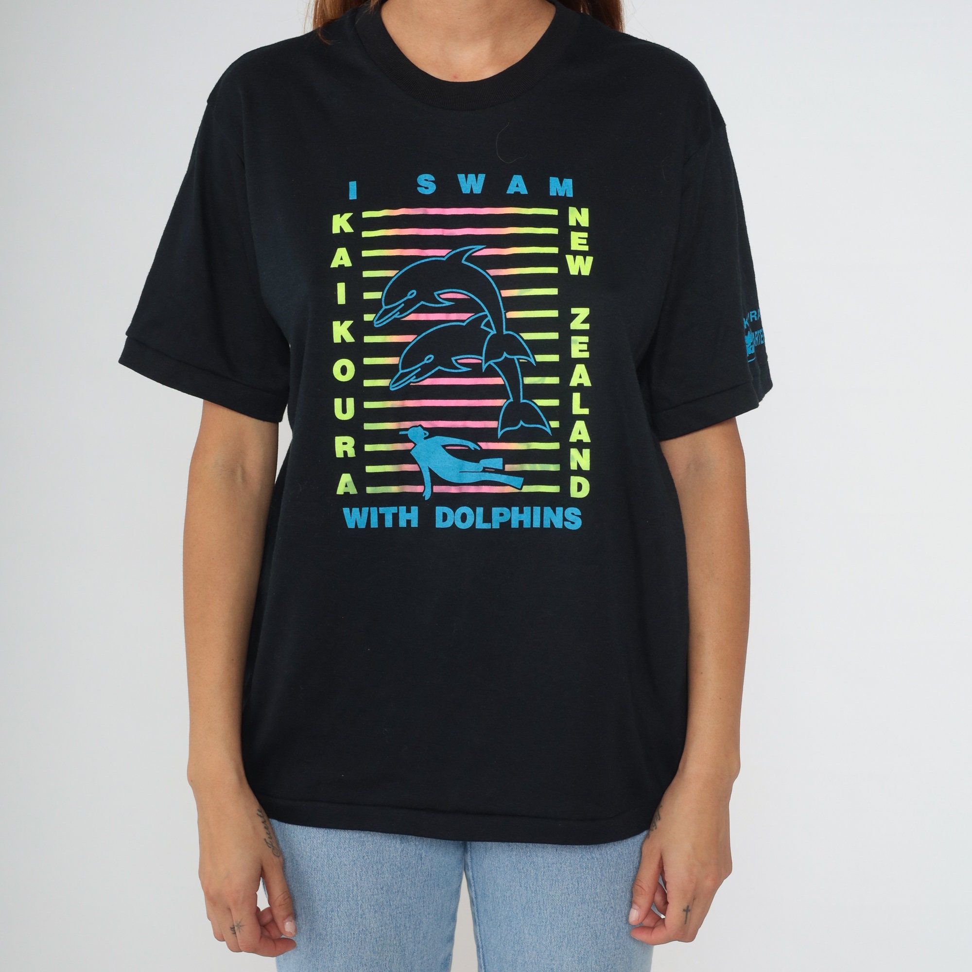 Vintage 00s t shirt with I Swam With Dolphins, Kaikoura New Zealand in neon on the front. The sleeve reads Kaikoura, Dolphin Mary Charters.
