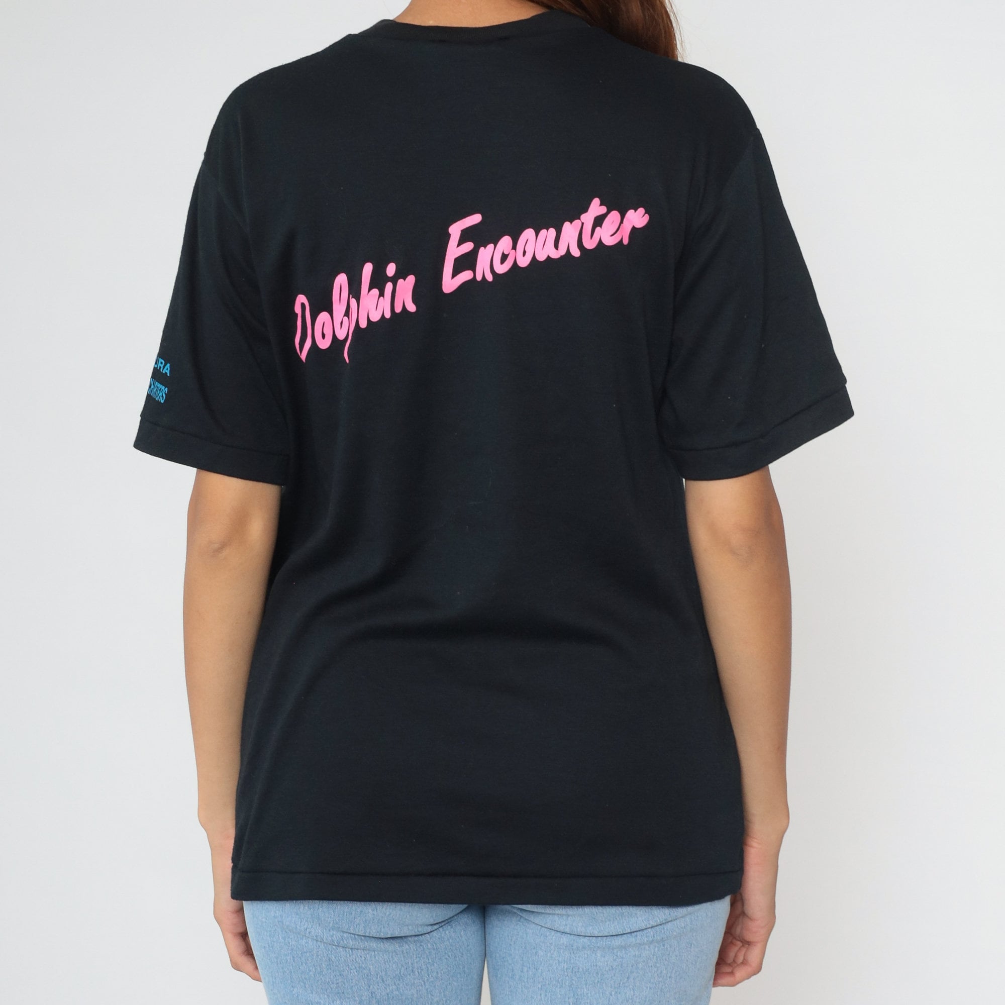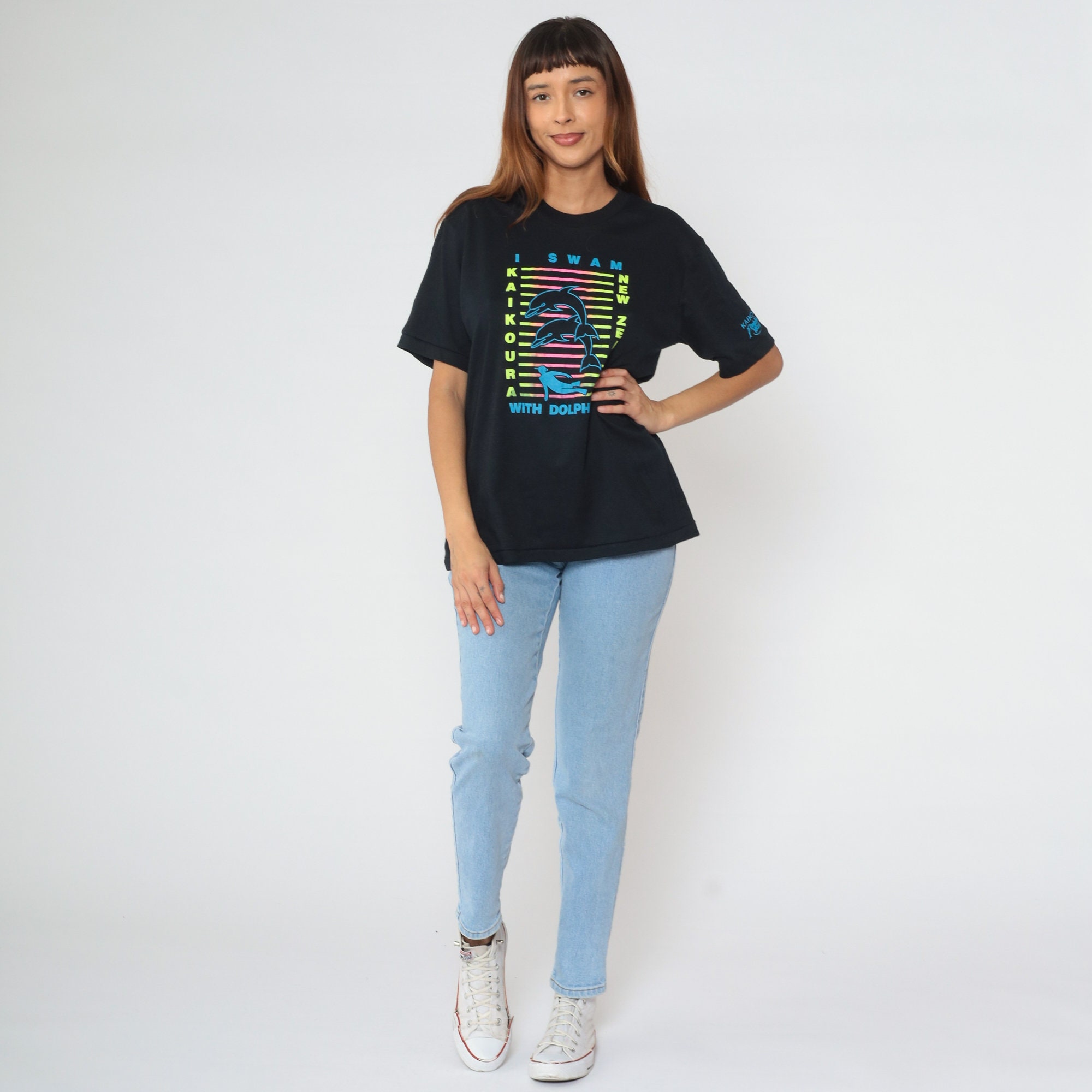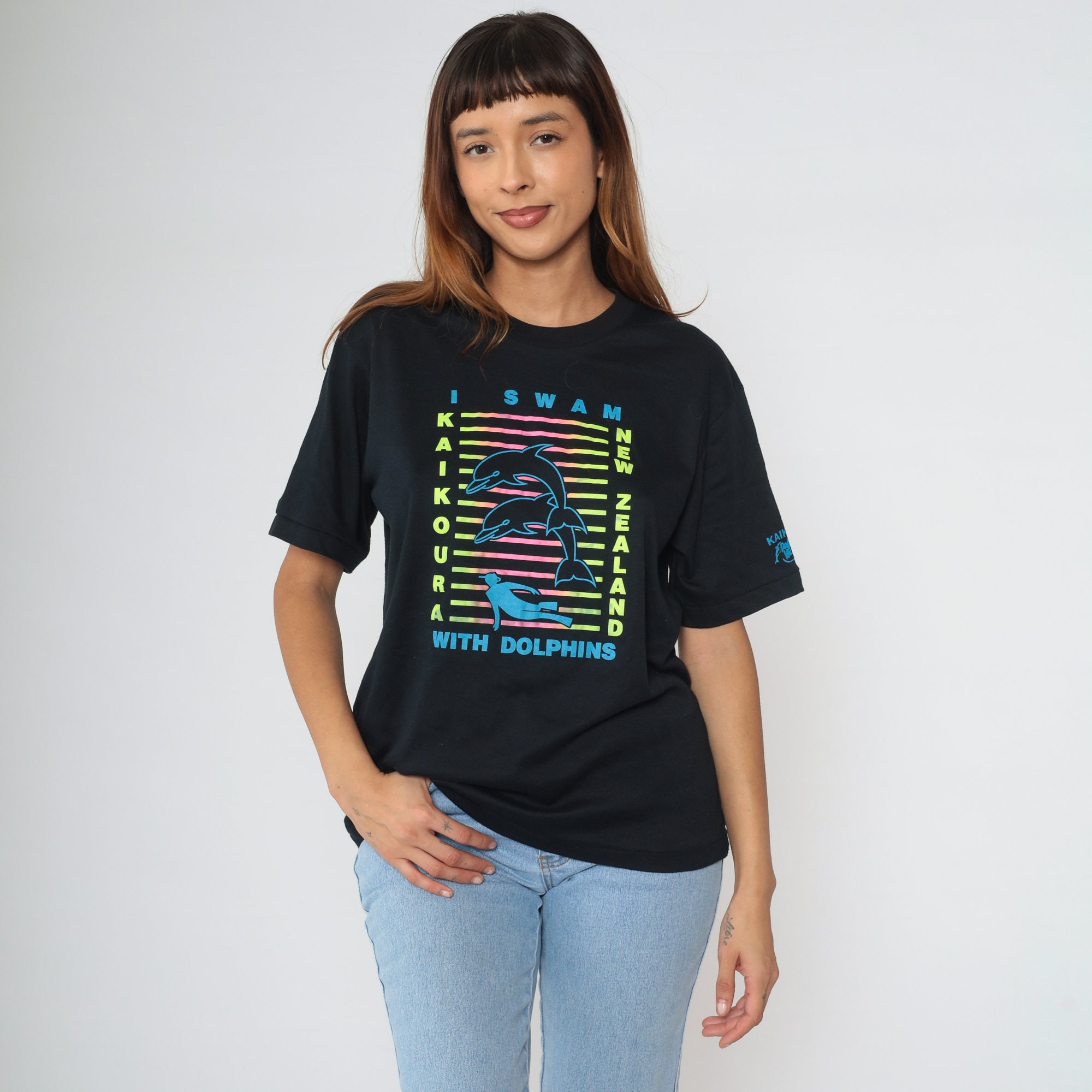 Vintage 00s t shirt with I Swam With Dolphins, Kaikoura New Zealand in neon on the front. The sleeve reads Kaikoura, Dolphin Mary Charters.