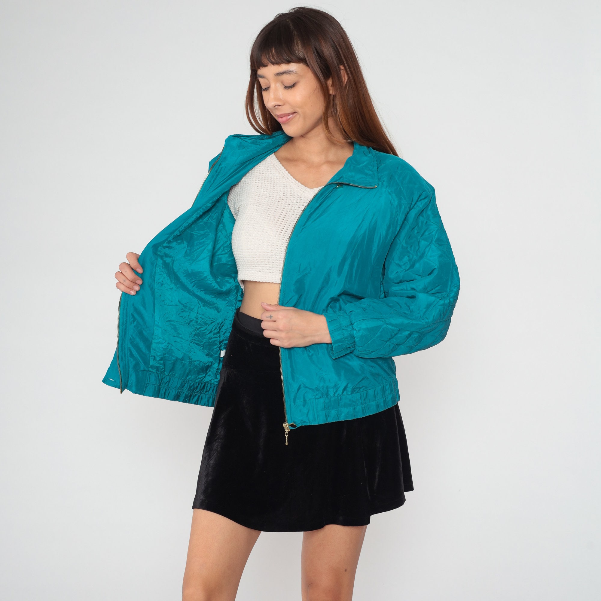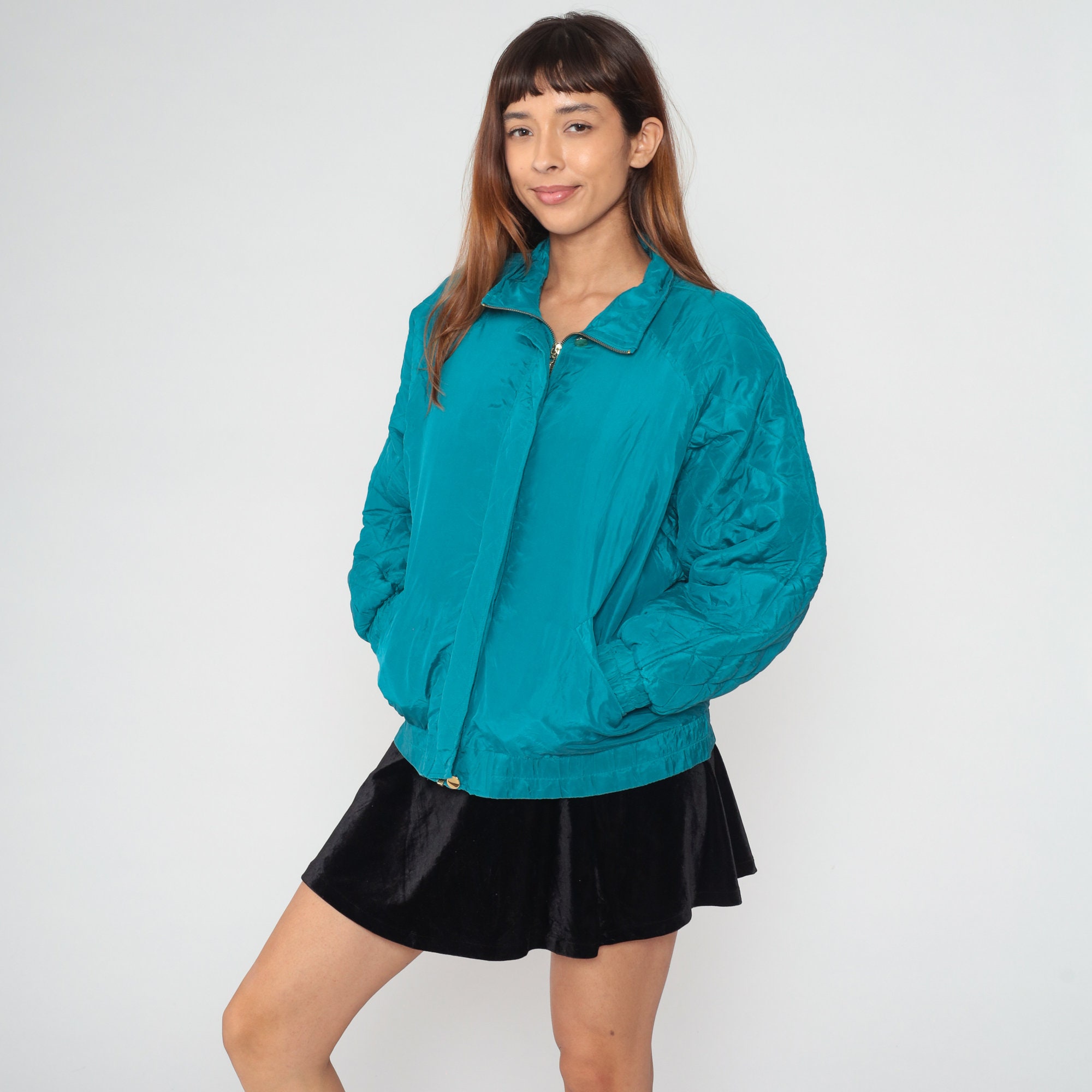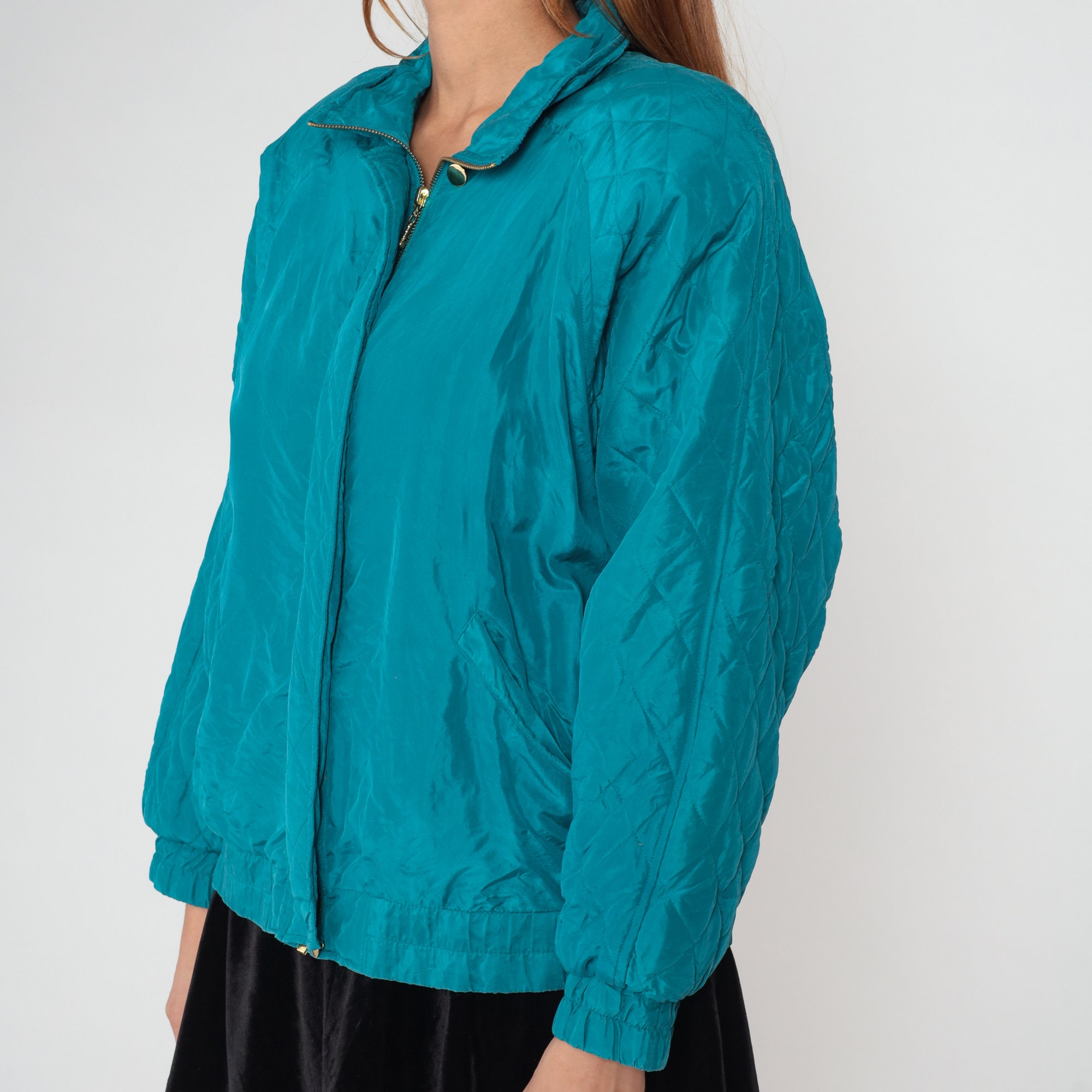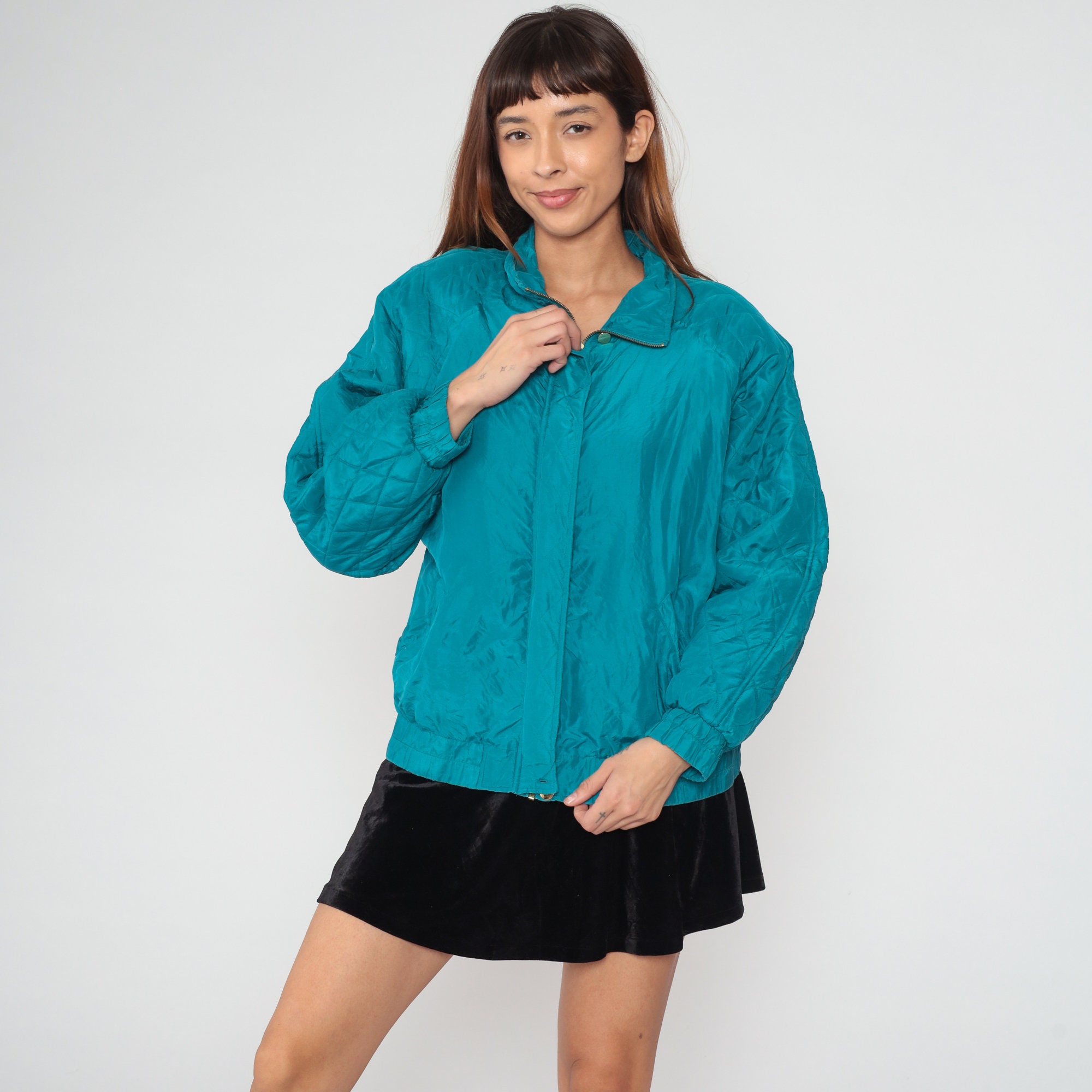 Vintage 90s windbreaker jacket in turquoise blue silk with a zipper up the front.
