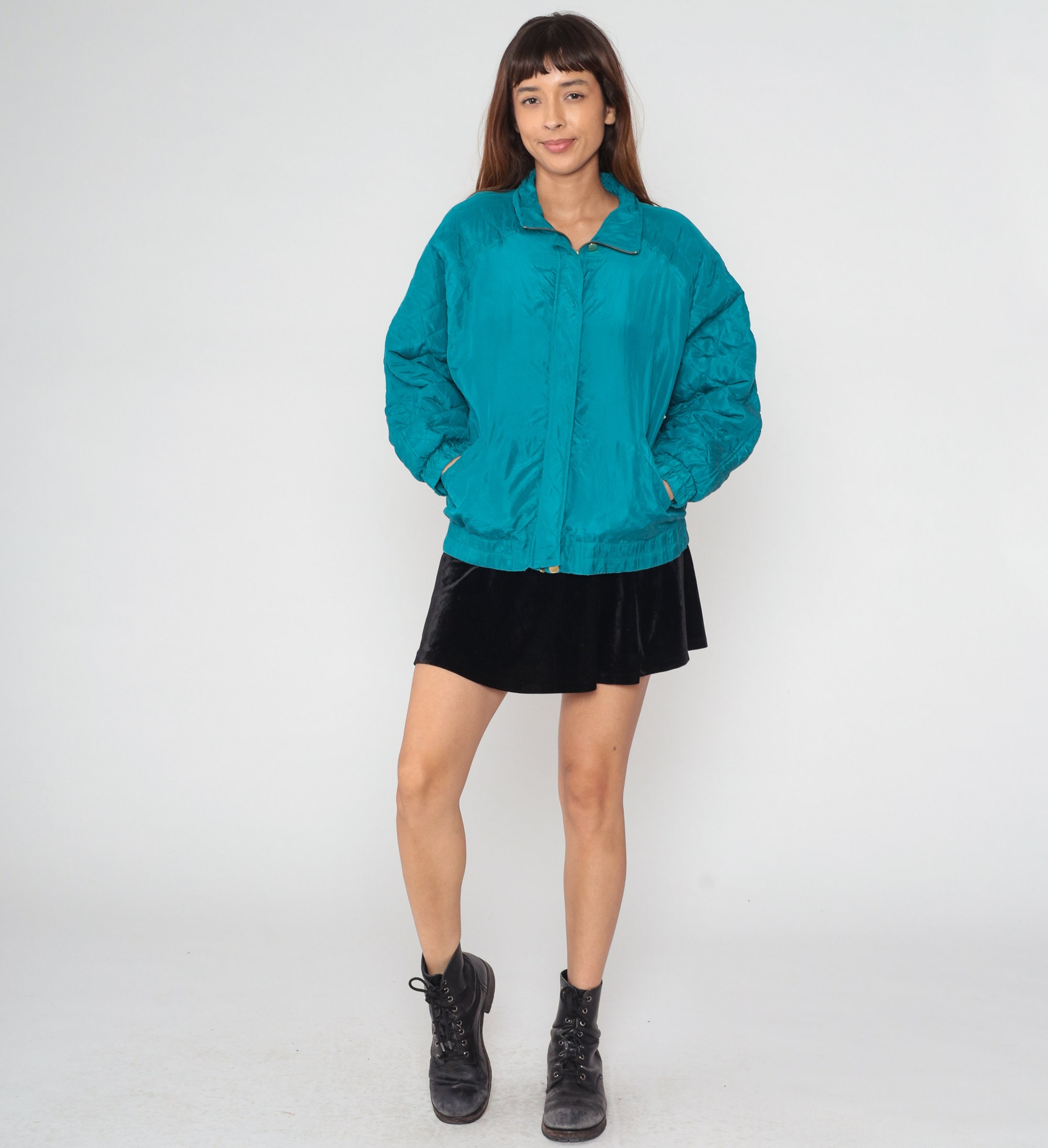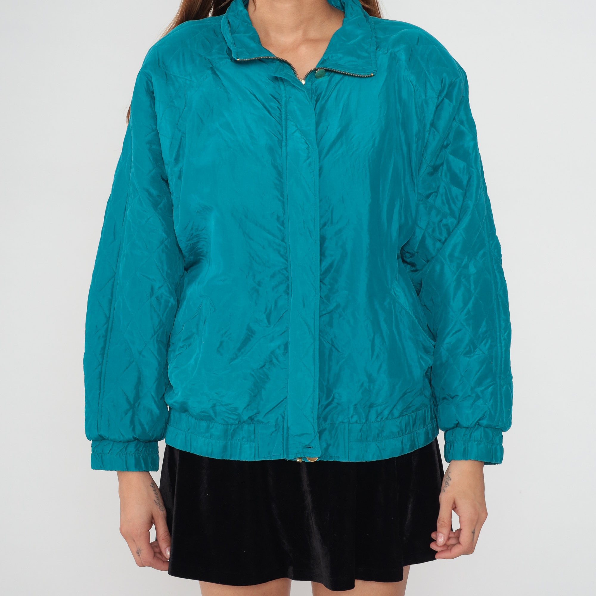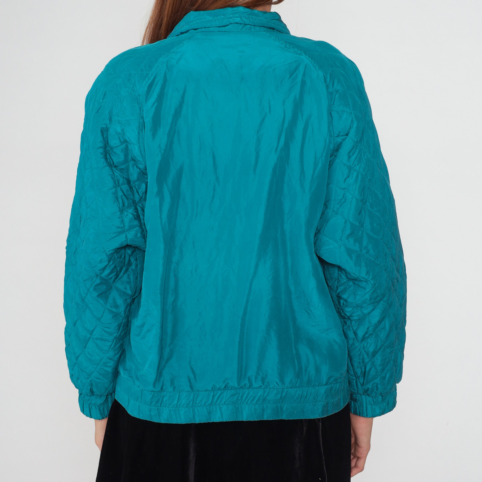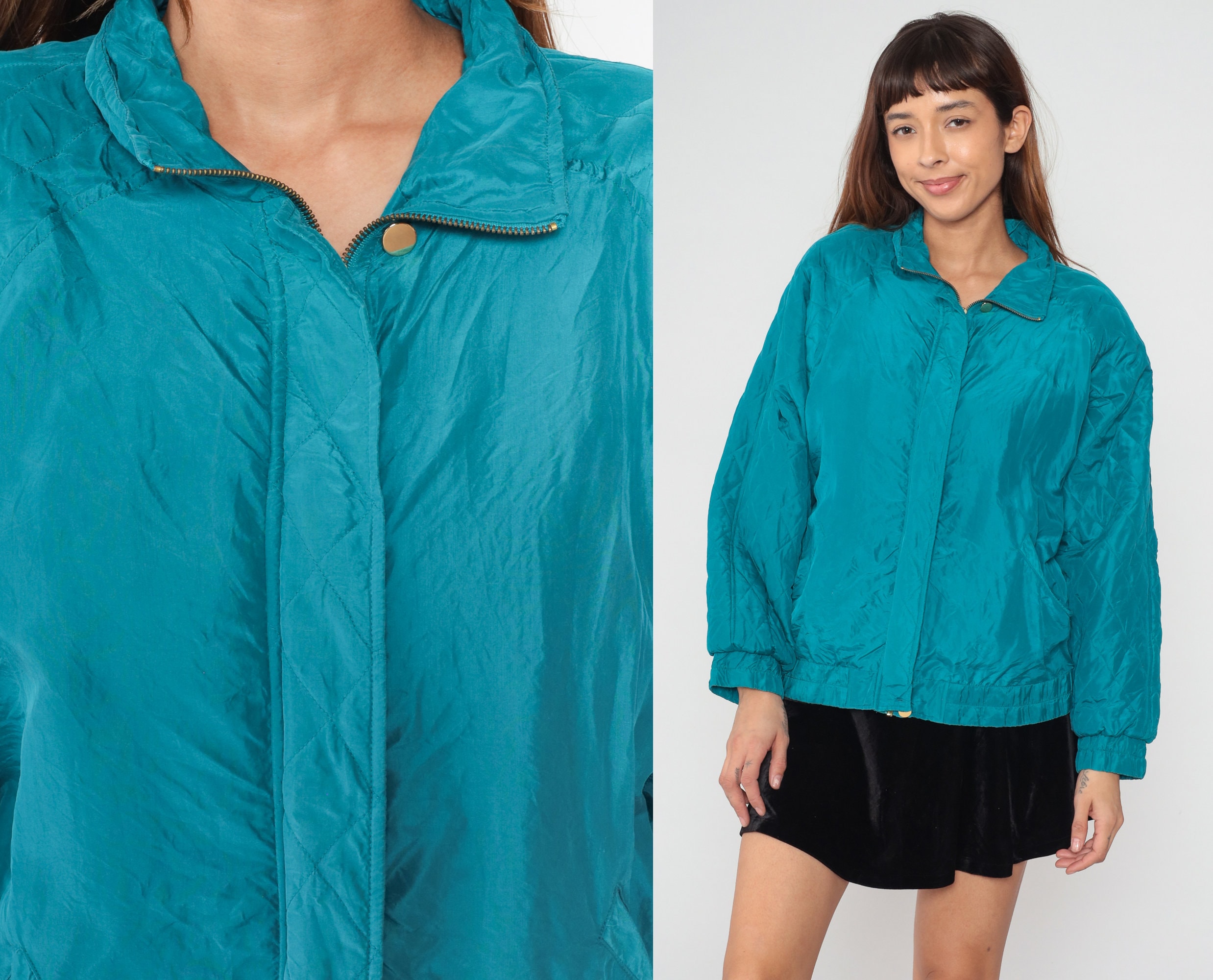 Vintage 90s windbreaker jacket in turquoise blue silk with a zipper up the front.