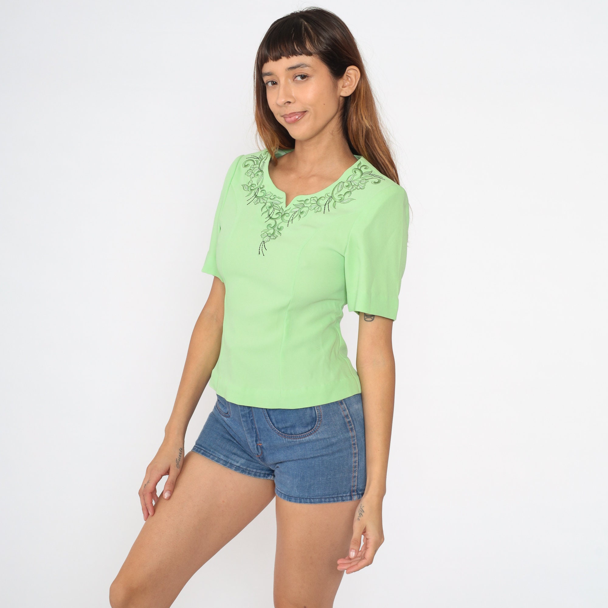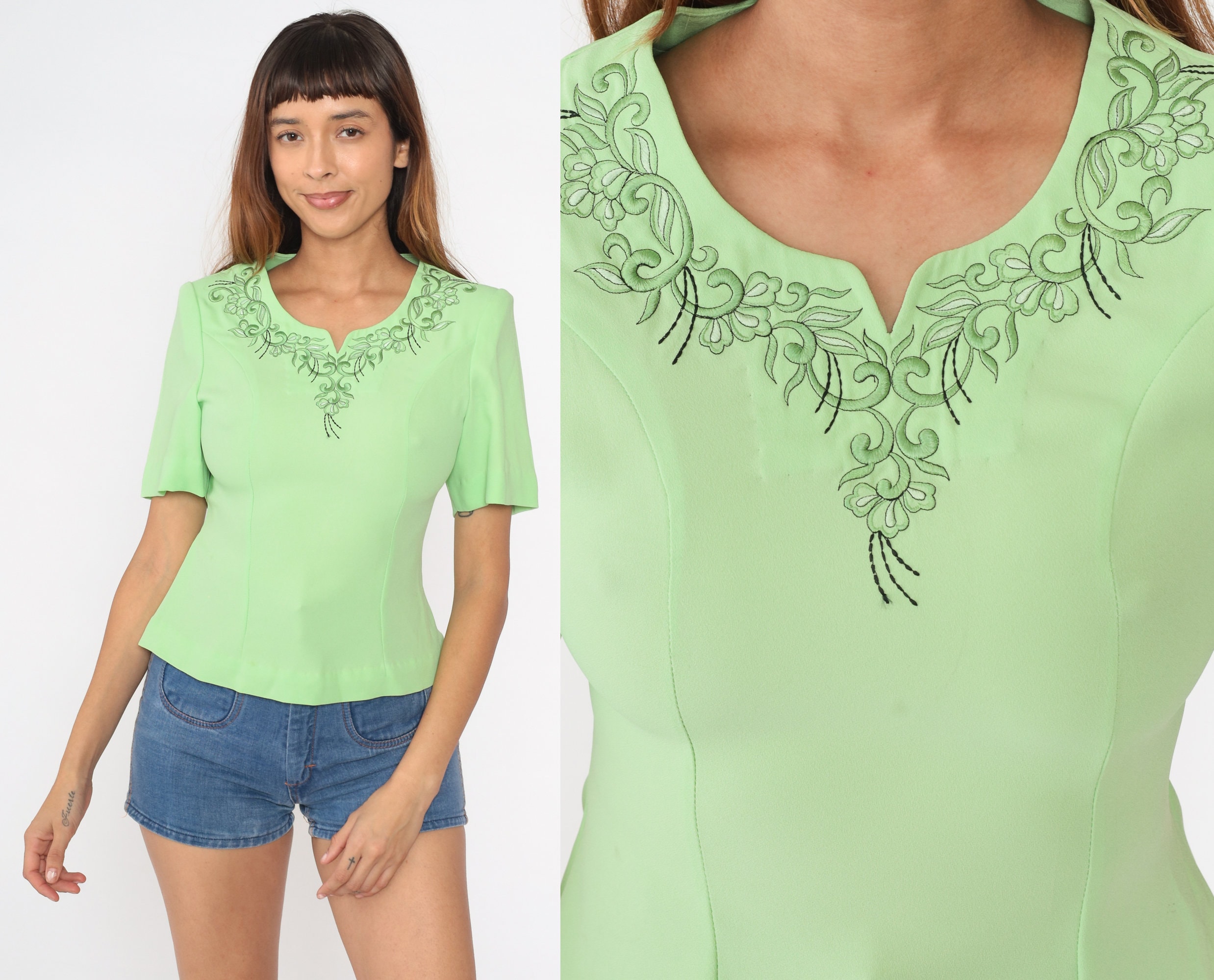 Vintage 80s blouse in light green with floral embroidery along the neckline. It has a fitted cut with princess seams and short sleeves. Rear invisible zipper.