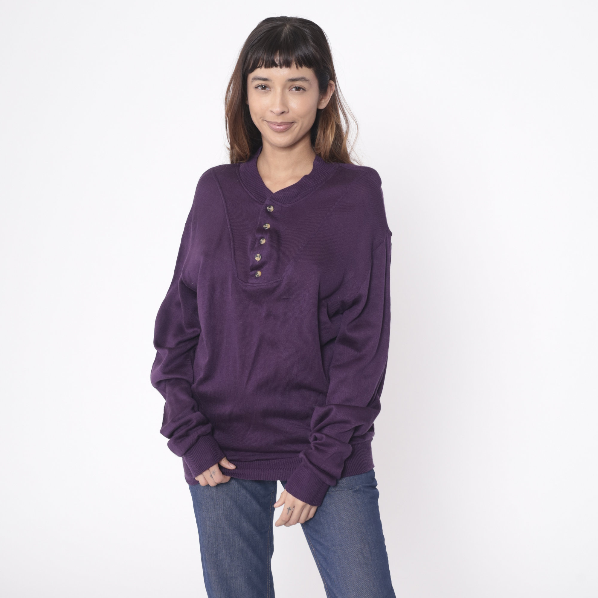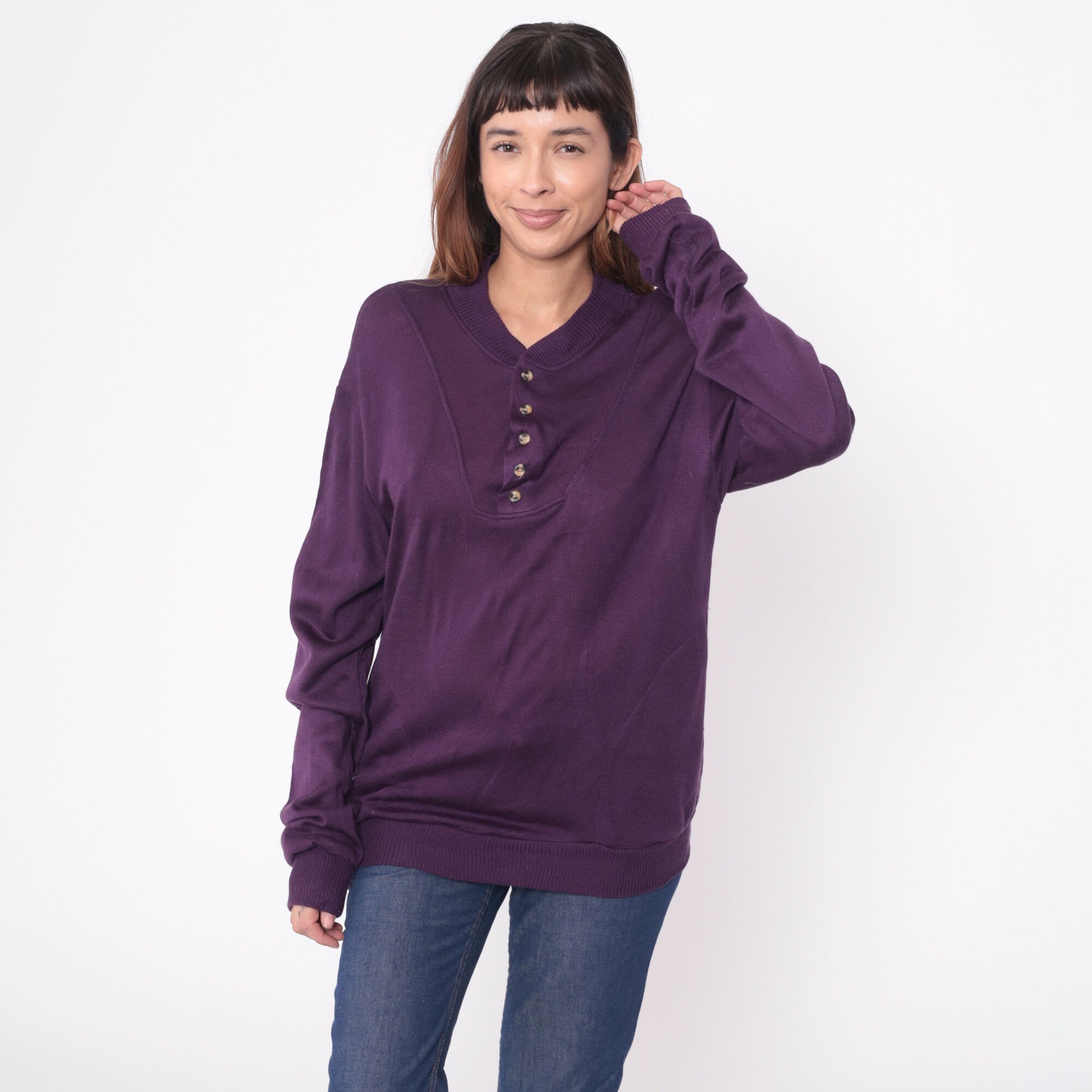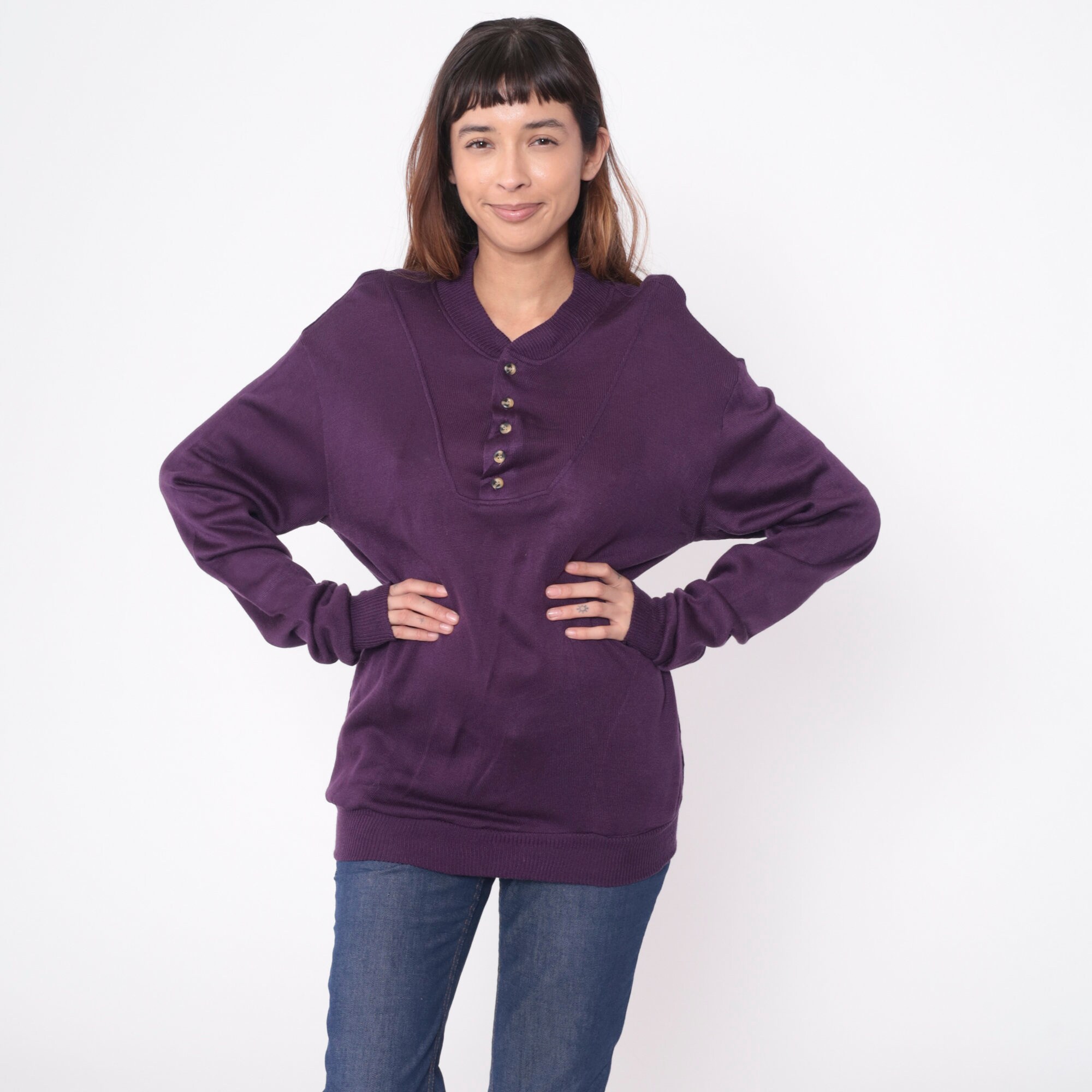 Vintage 80s sweater in dark purple acrylic with buttons up the chest.