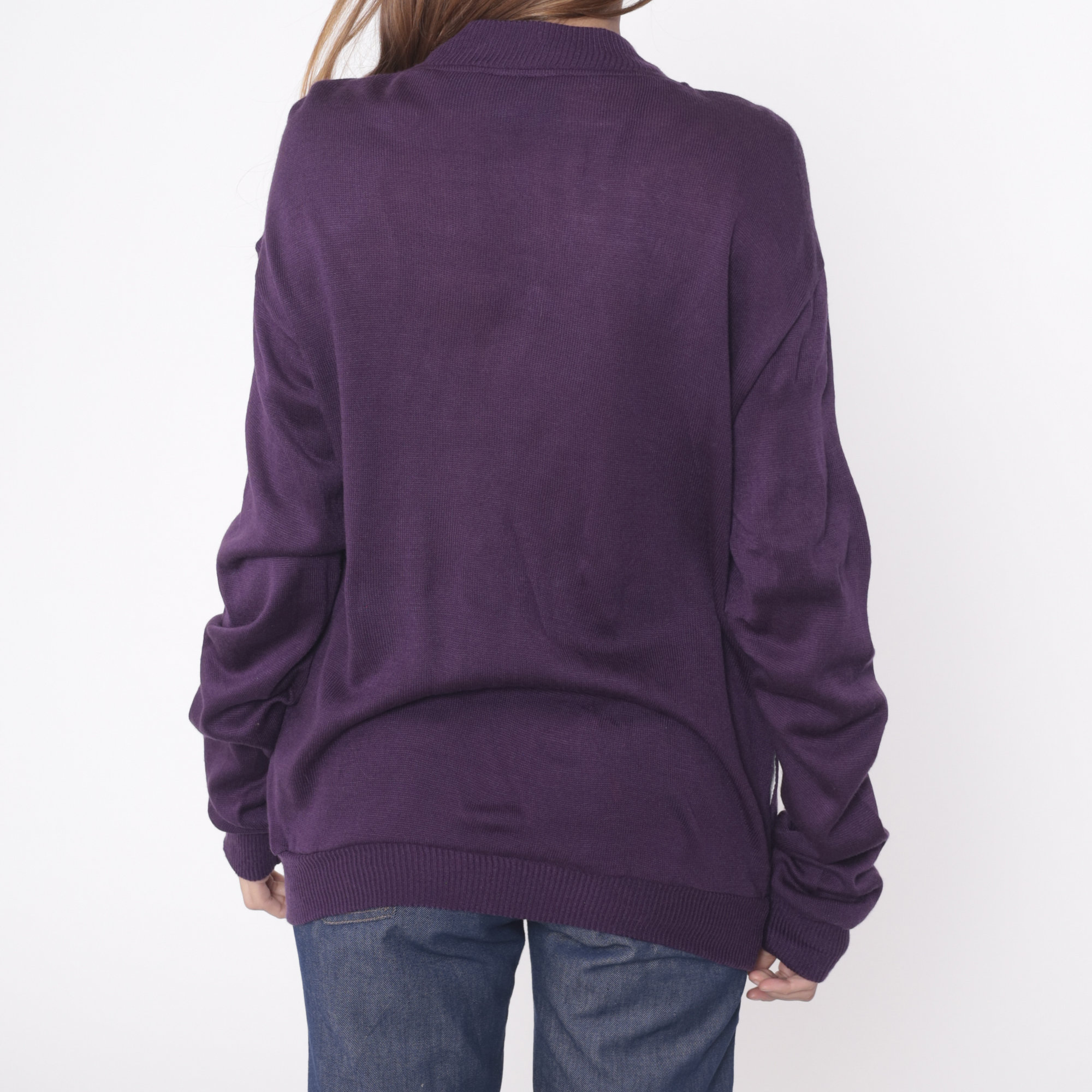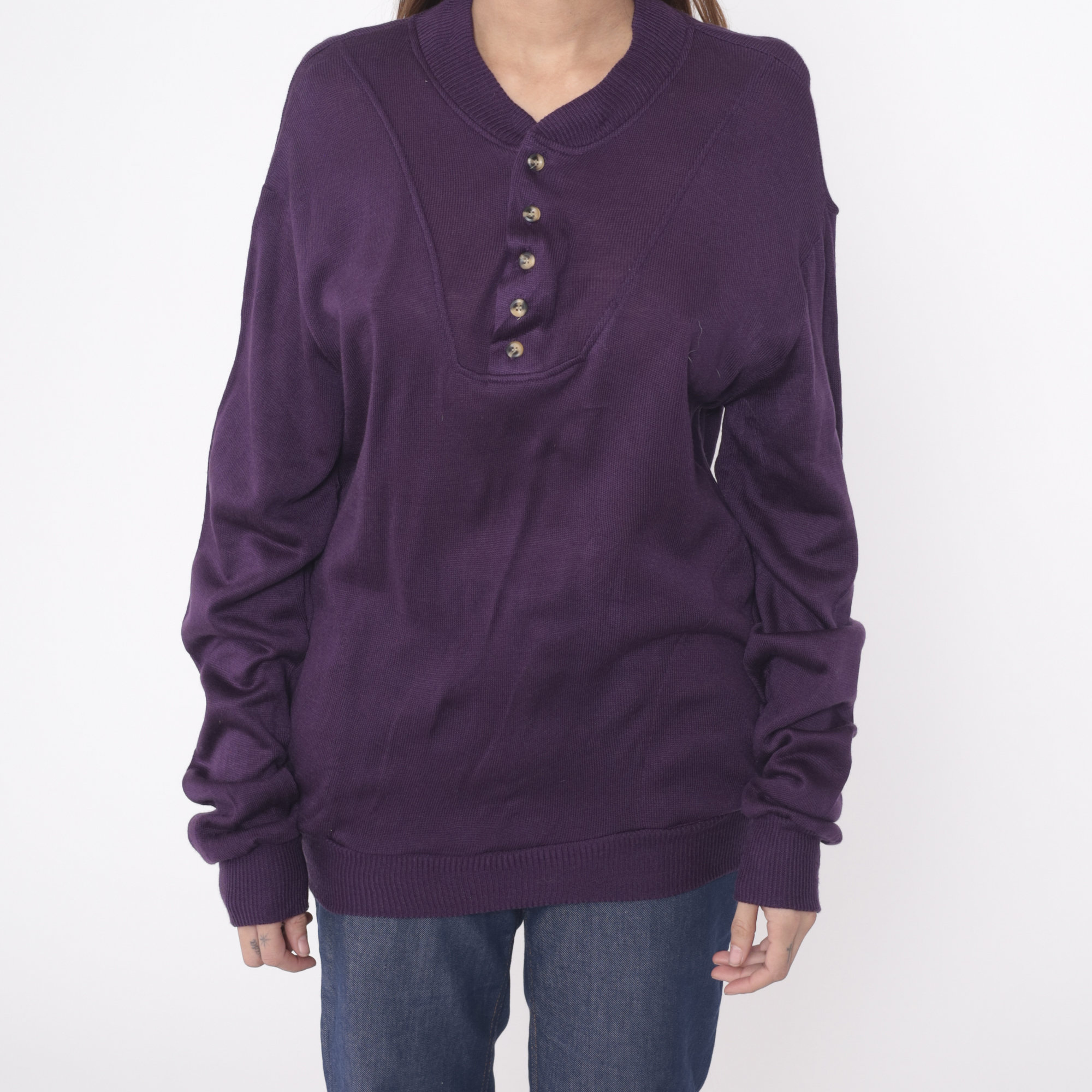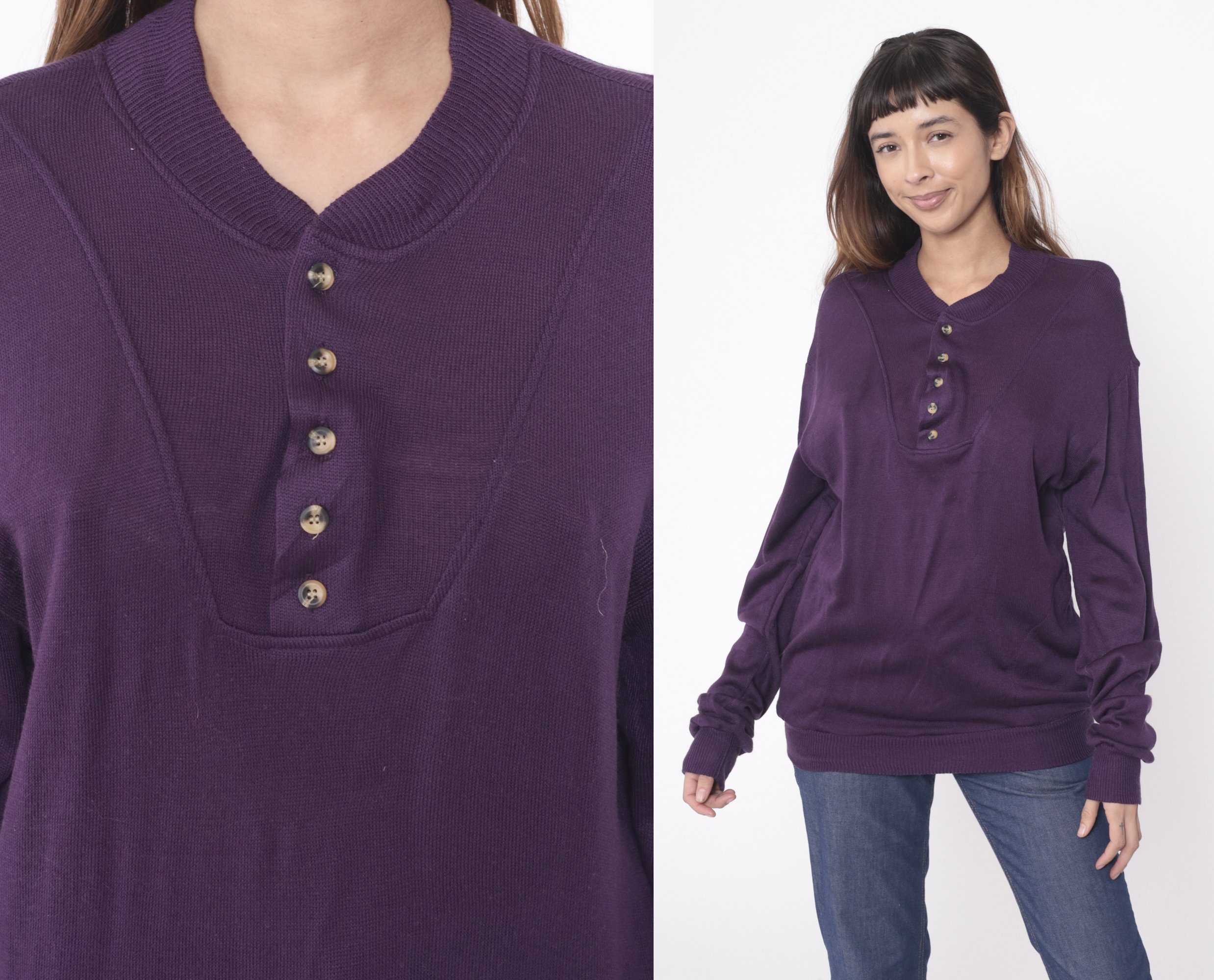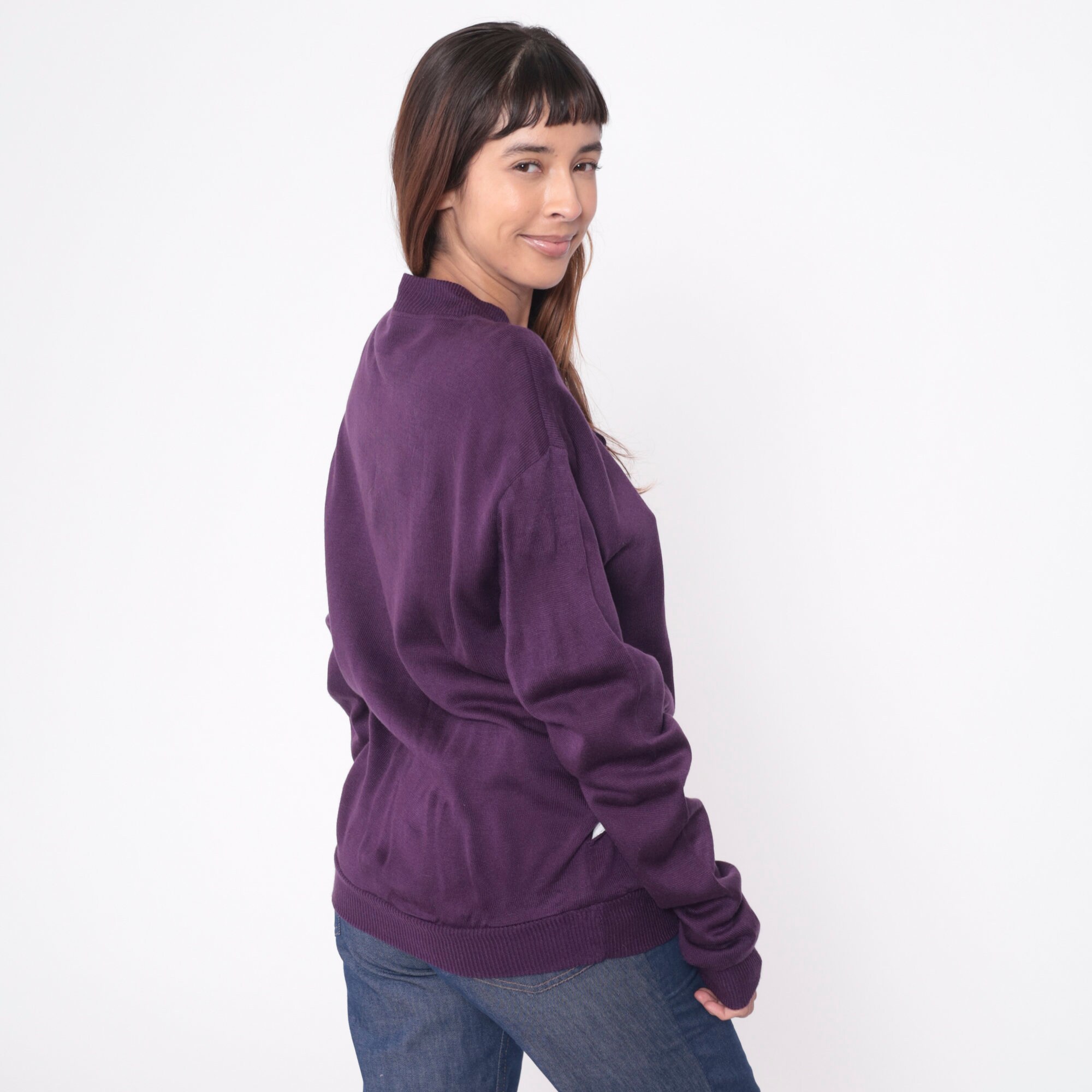 Vintage 80s sweater in dark purple acrylic with buttons up the chest.