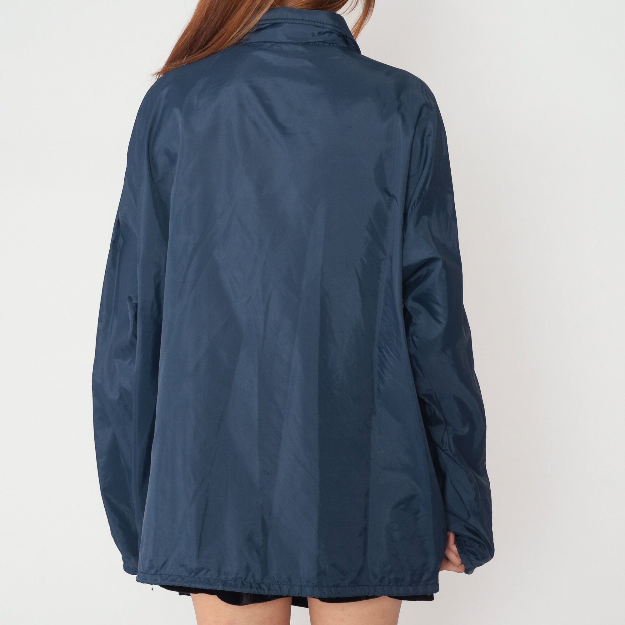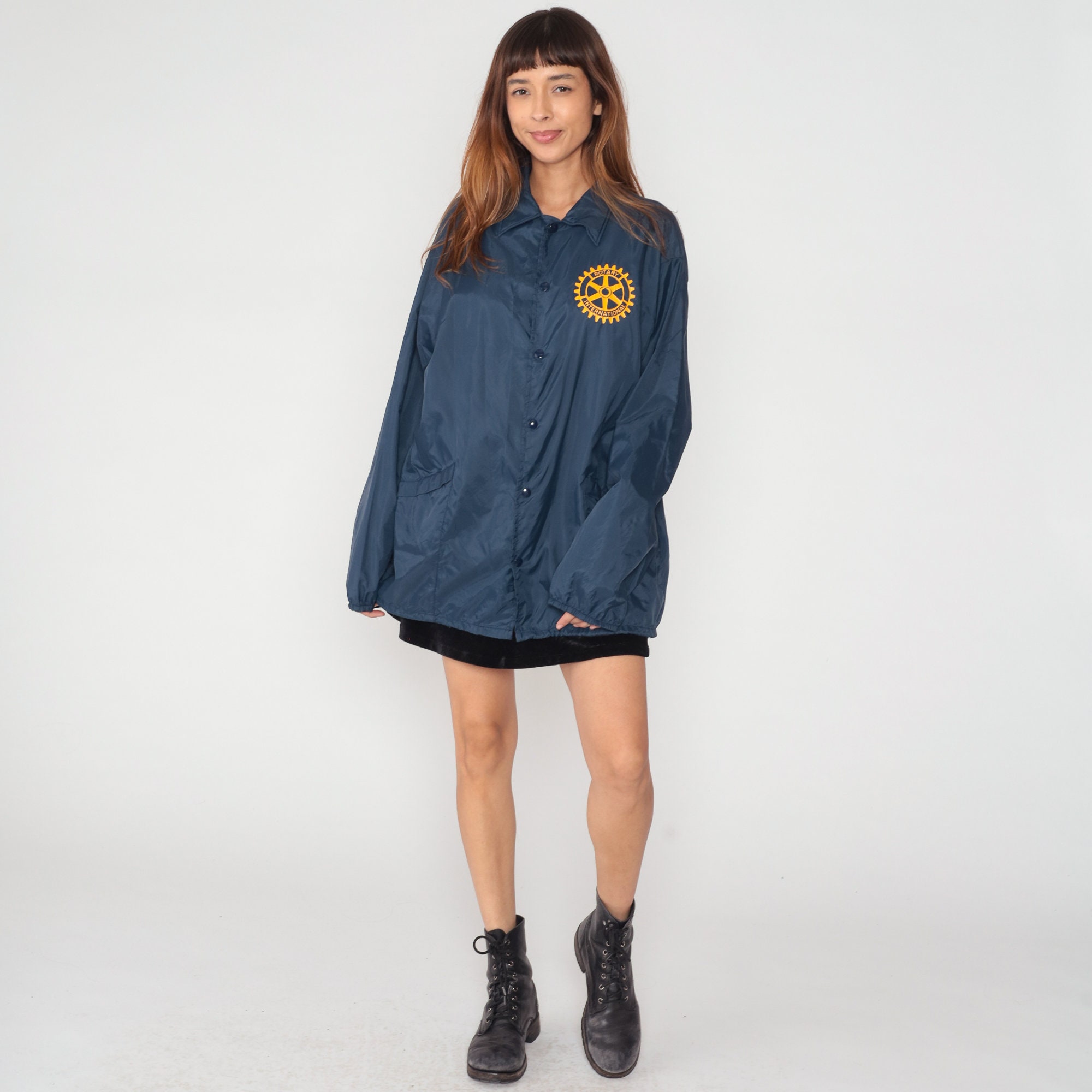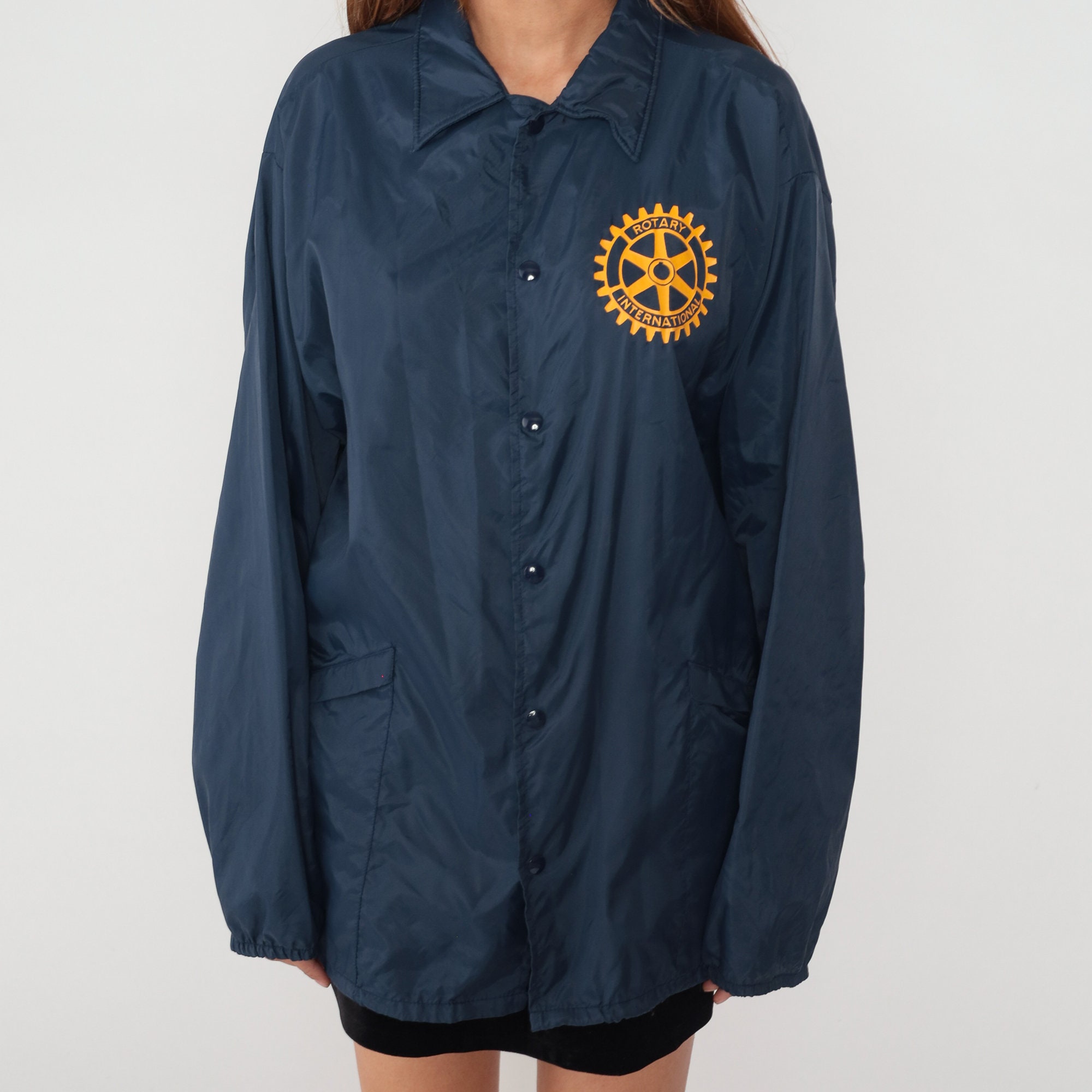 Vintage 80s jacket in navy blue with a Rotary International logo on the chest and snaps up the front.