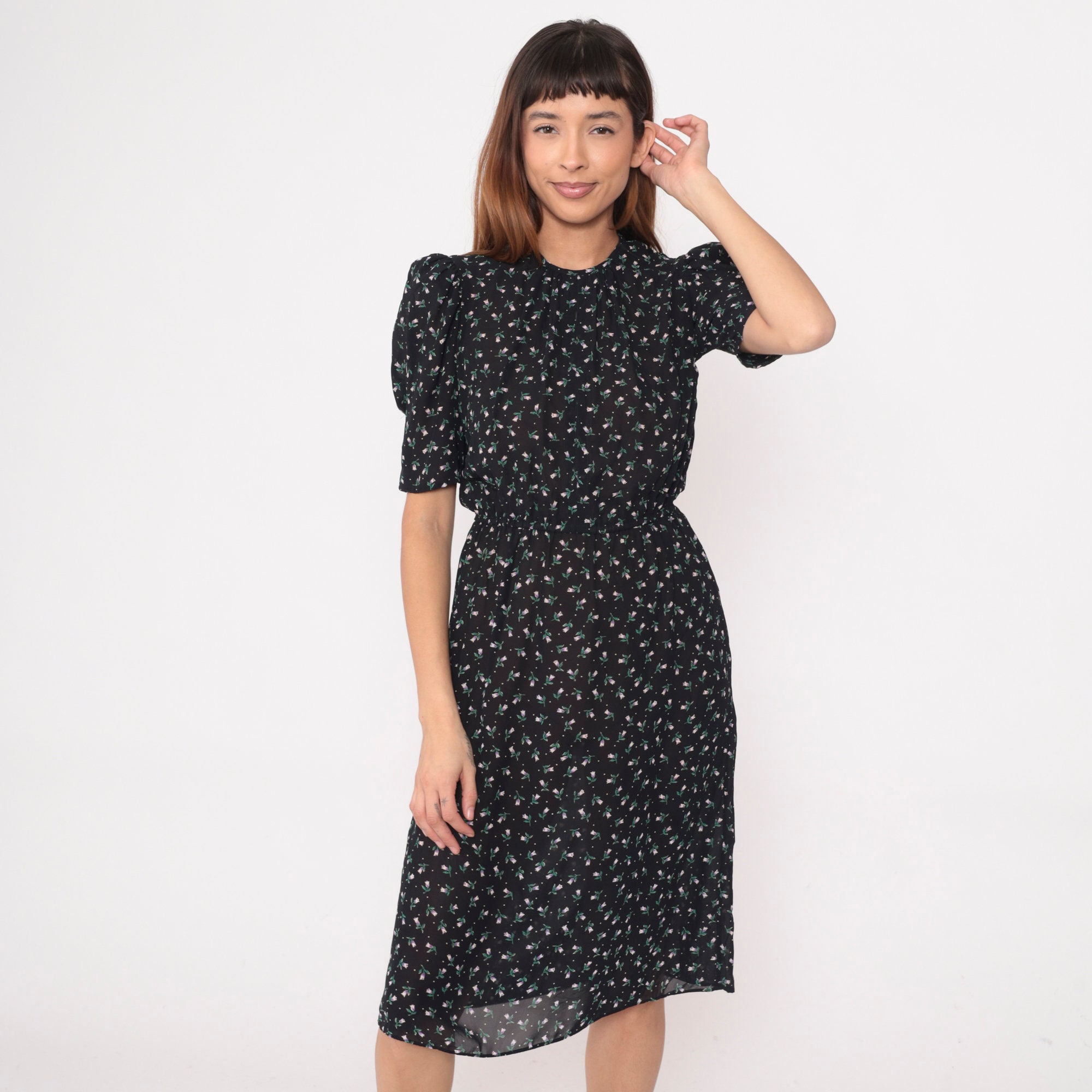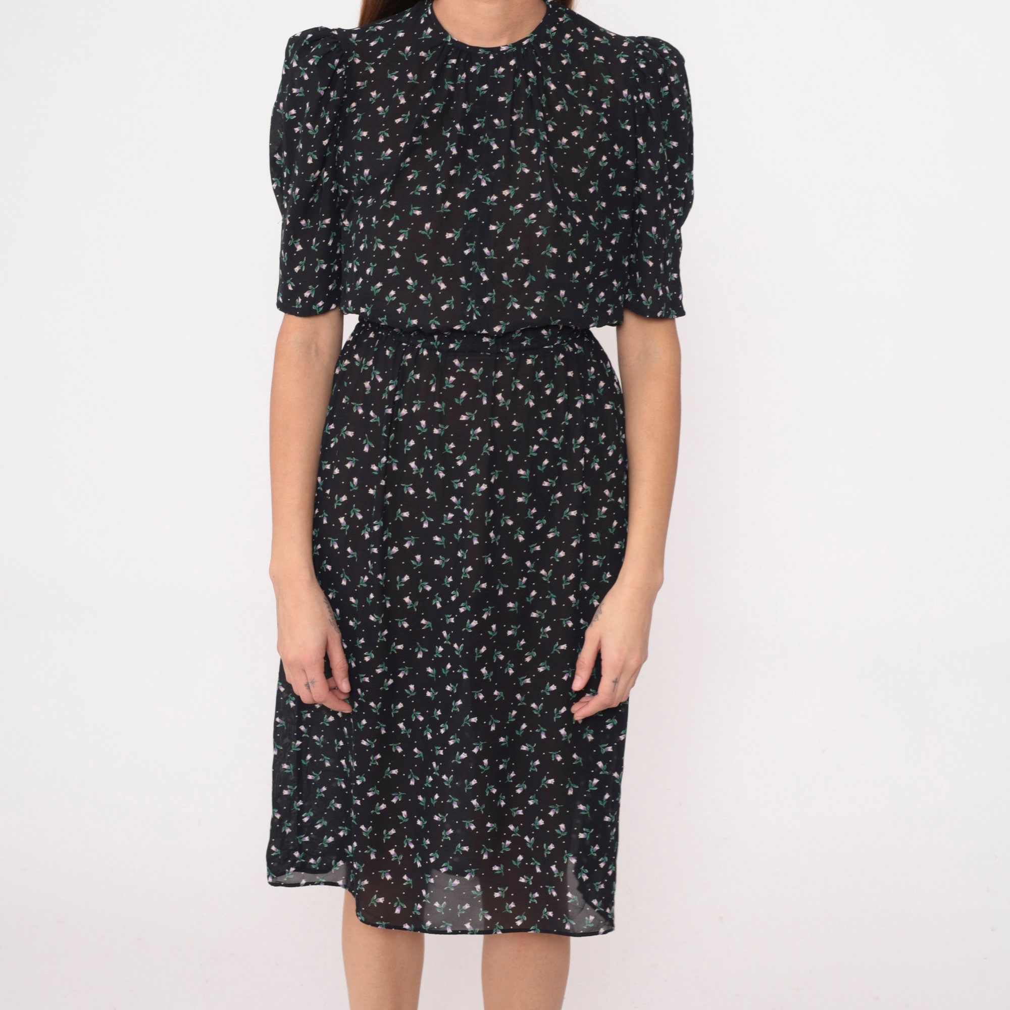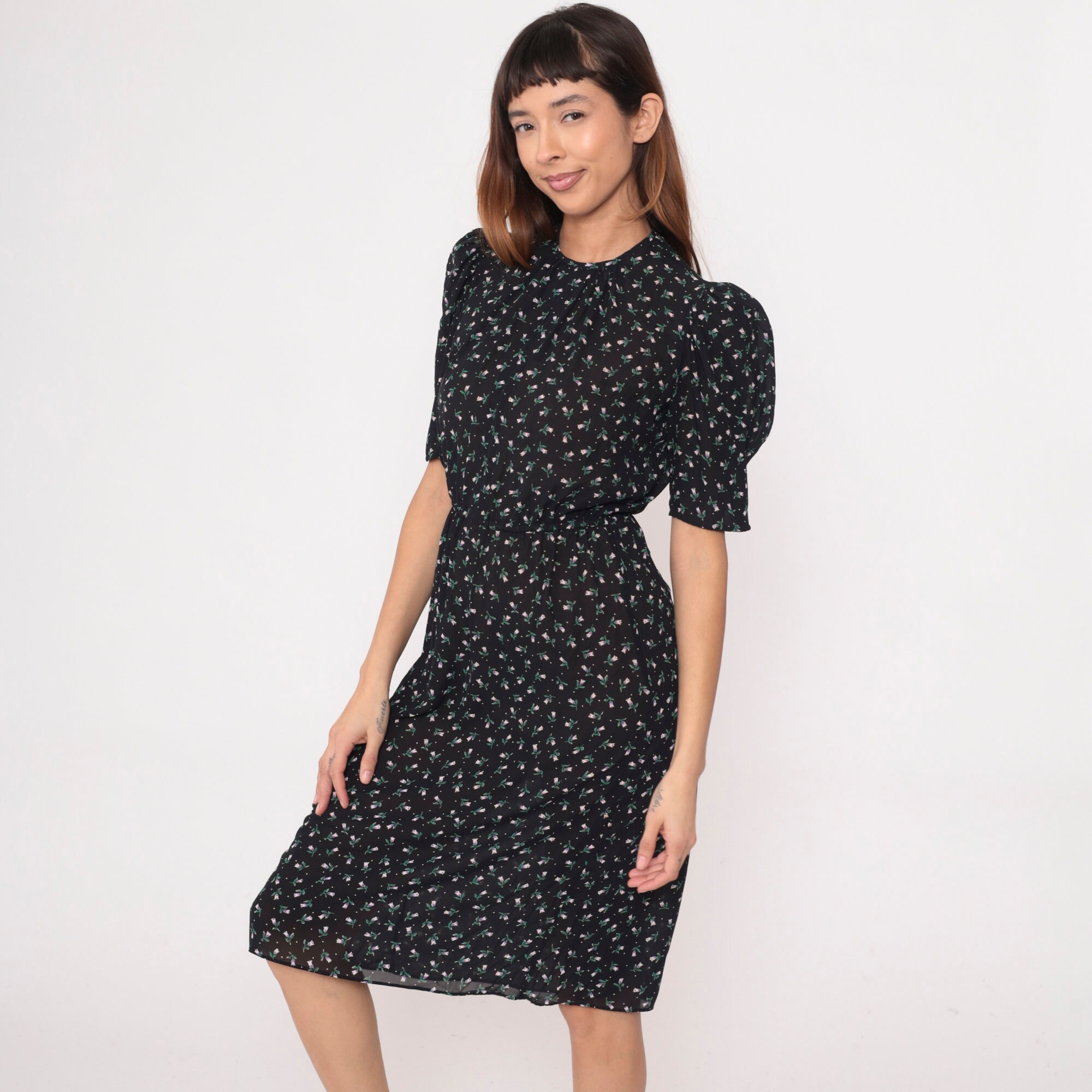 Vintage 80s dress in a black floral print. It has a high waist, puff sleeves and buttons up the back.