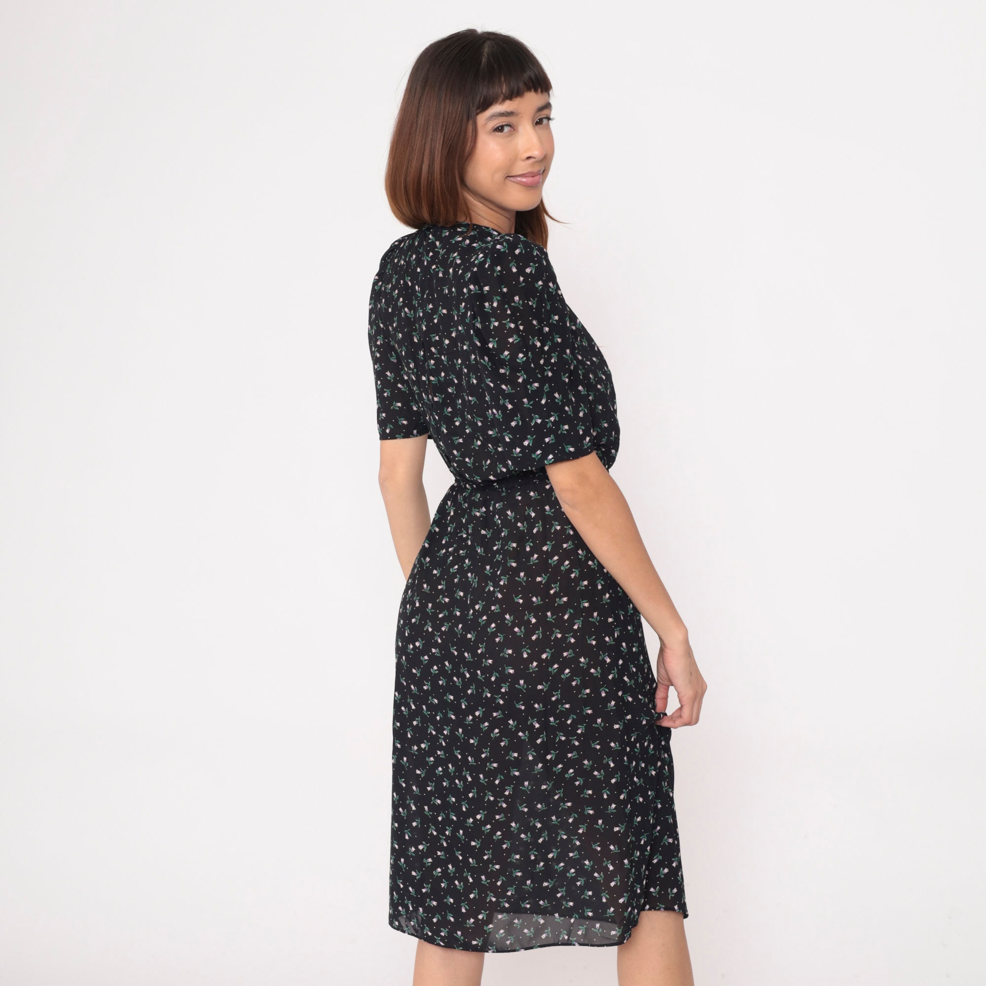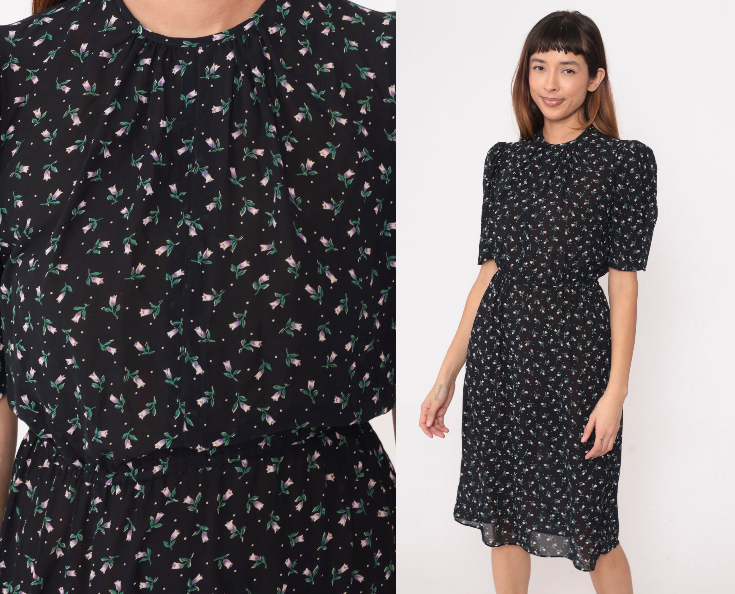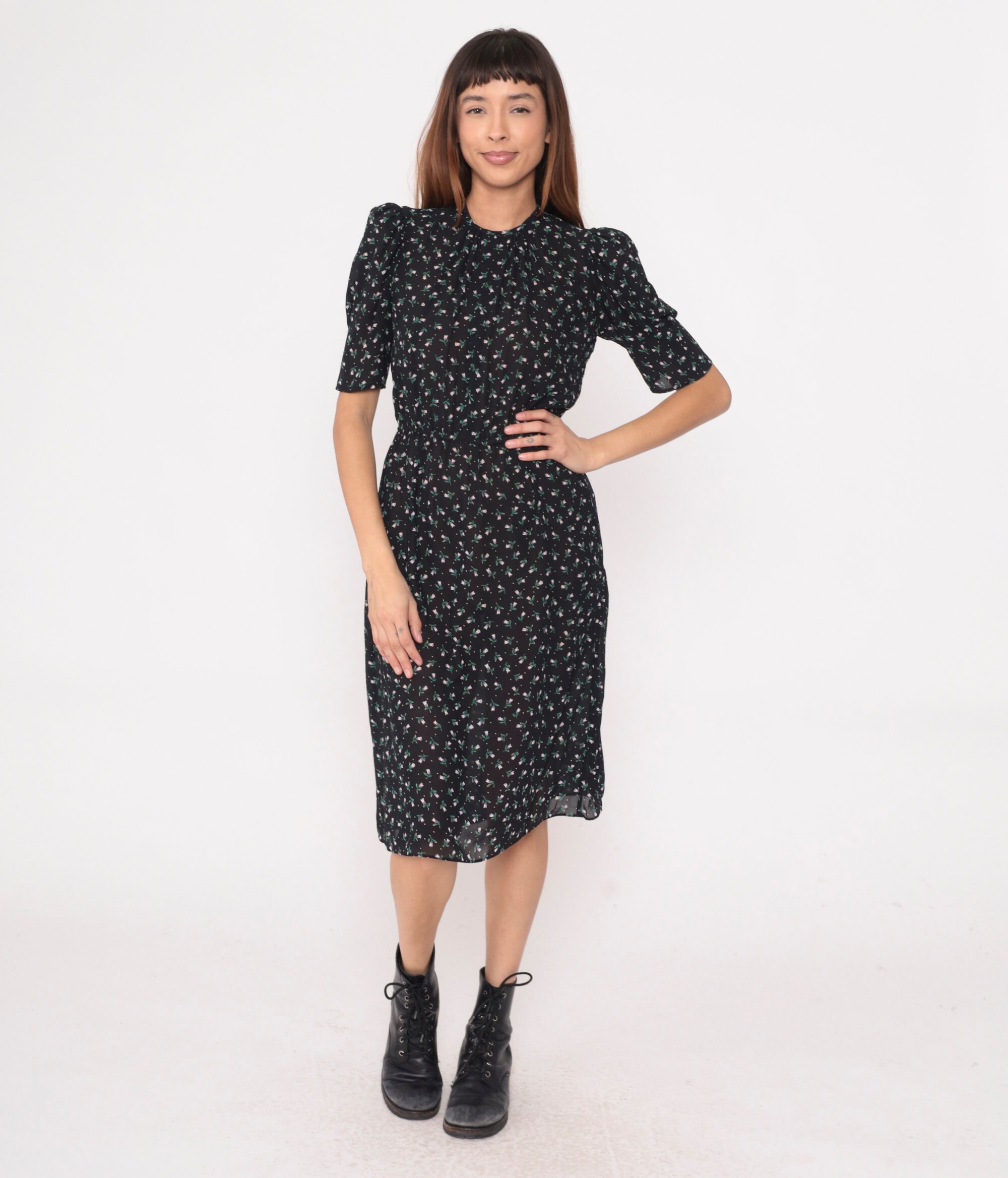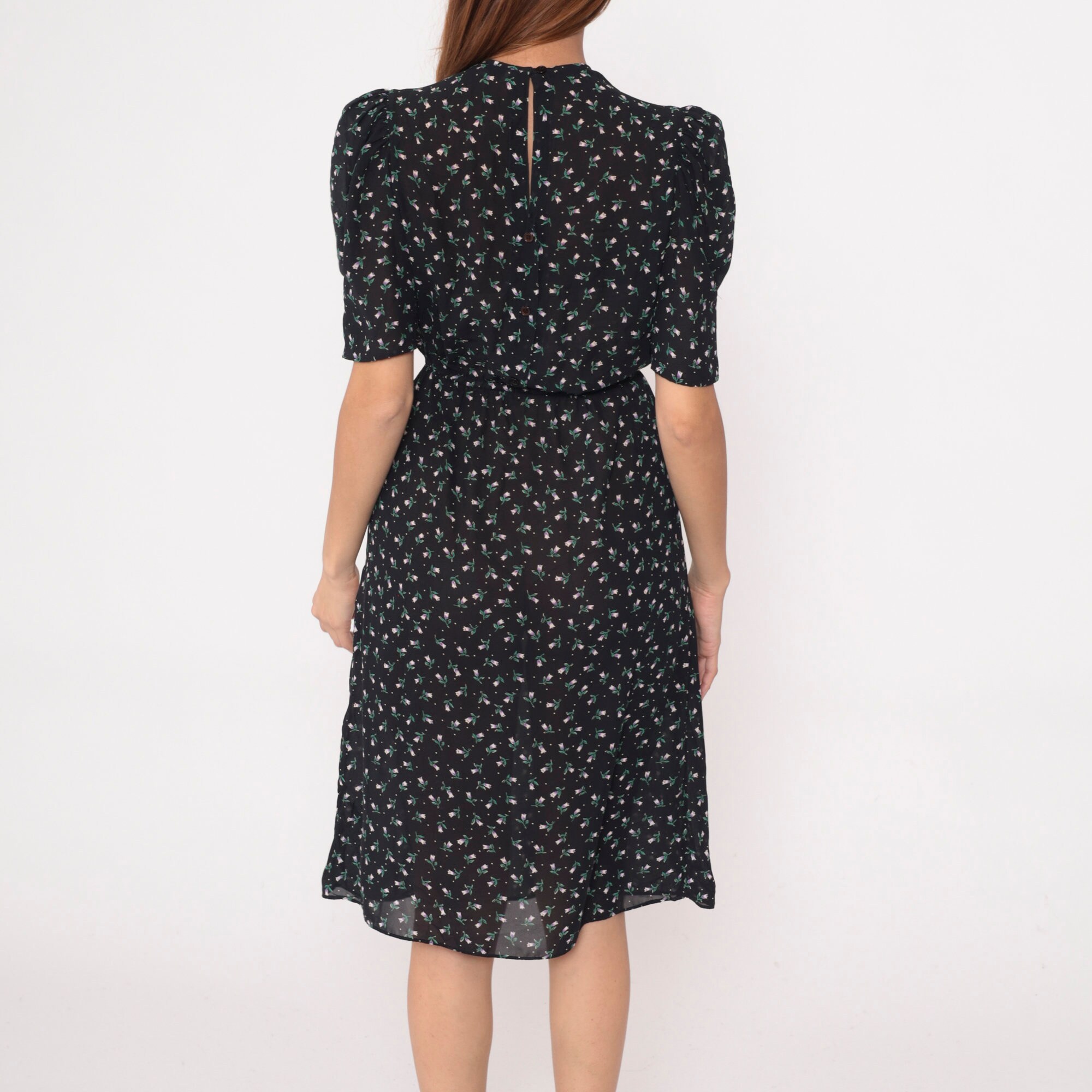 Vintage 80s dress in a black floral print. It has a high waist, puff sleeves and buttons up the back.