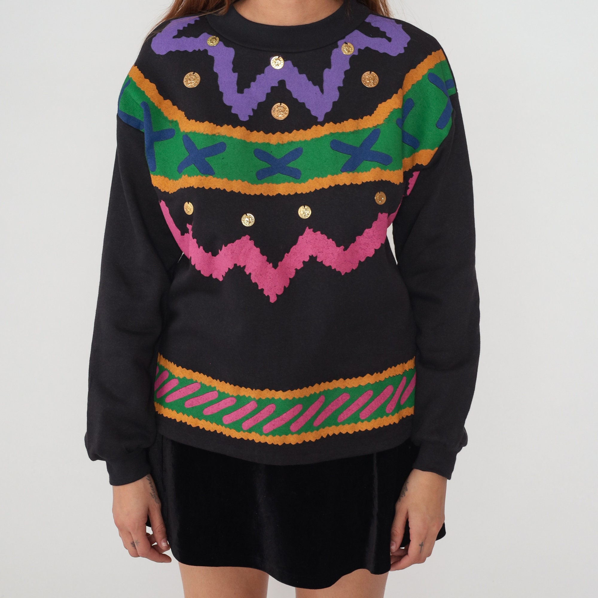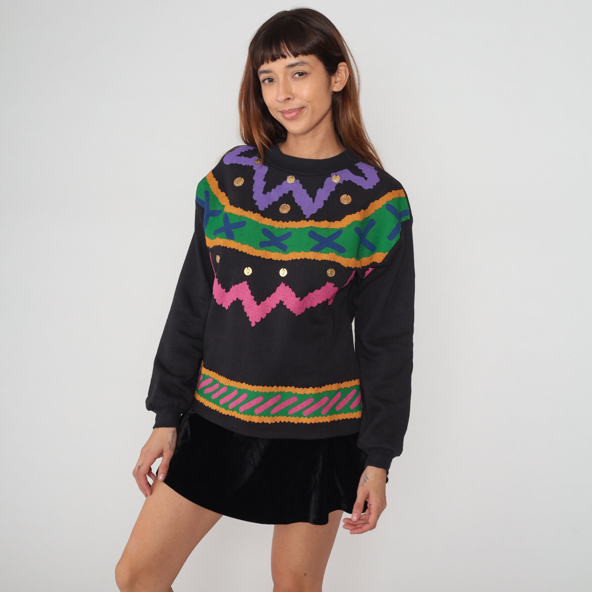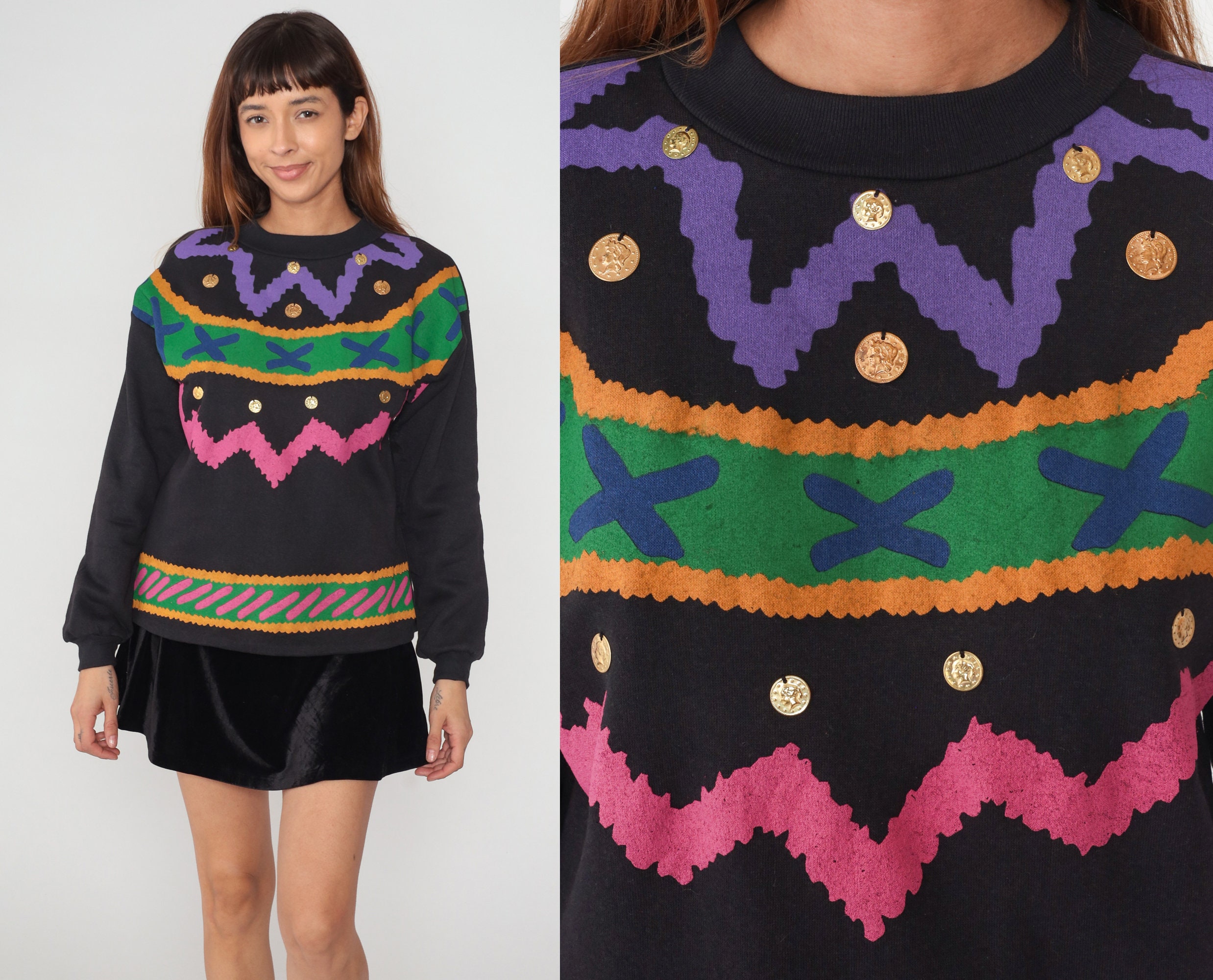 Vintage 90s sweatshirt in black with an abstract squiggle design and gold coin embellishments.