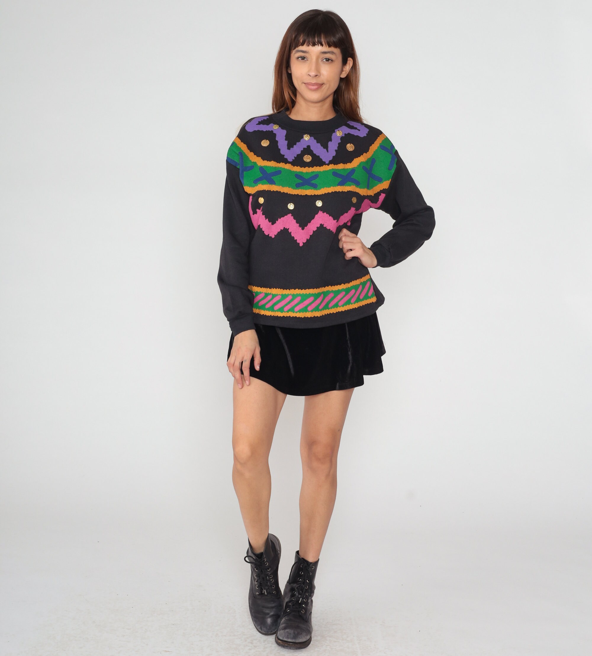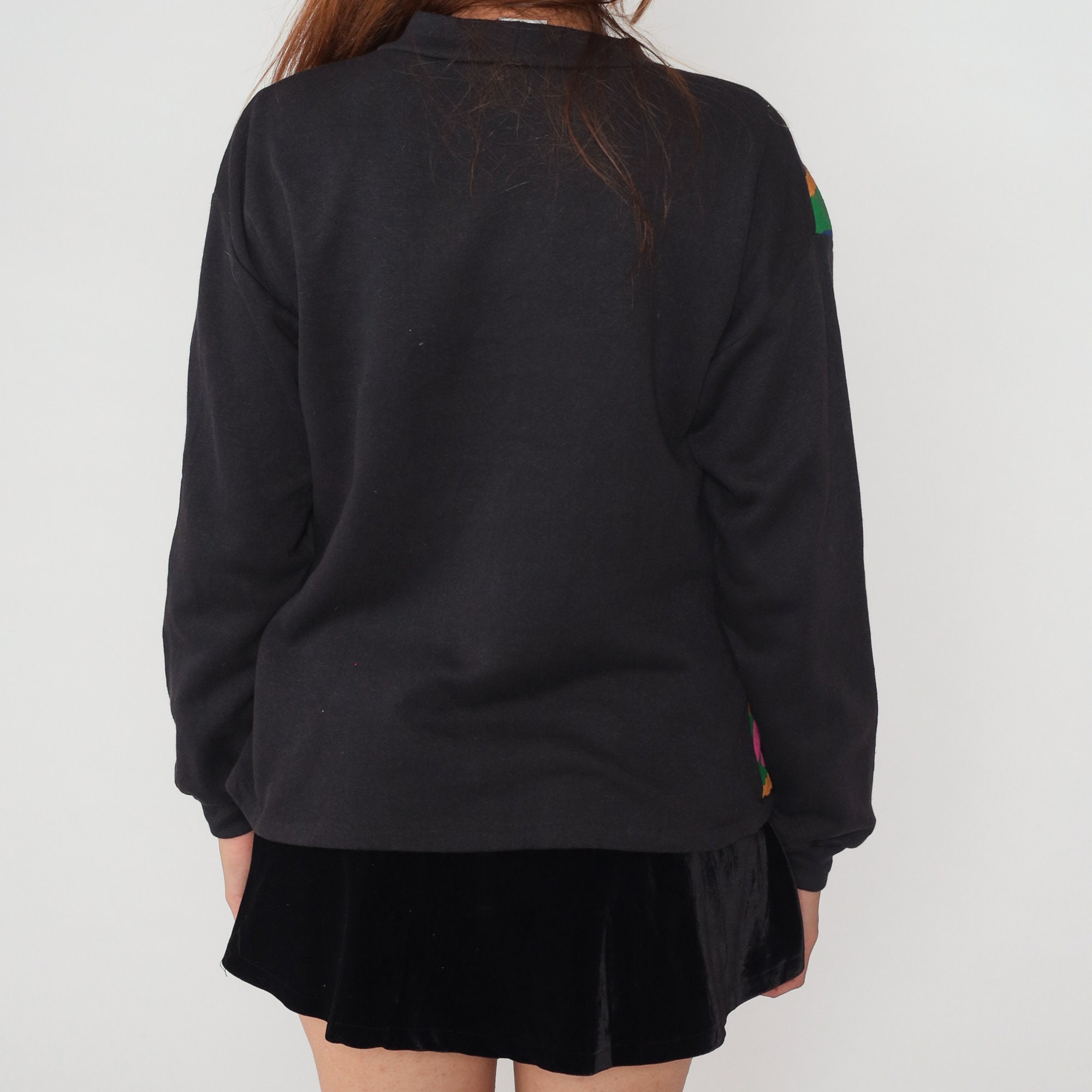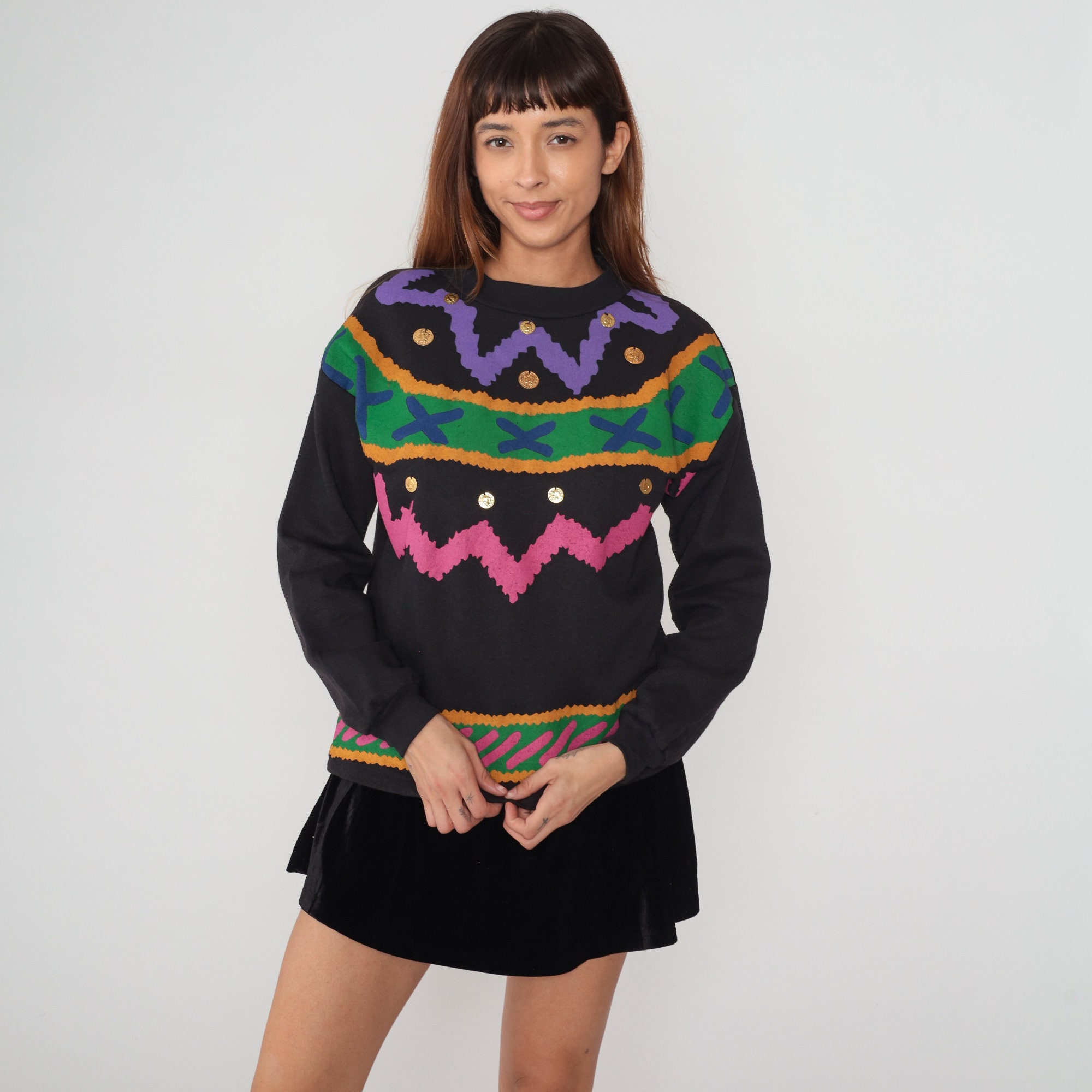 Vintage 90s sweatshirt in black with an abstract squiggle design and gold coin embellishments.