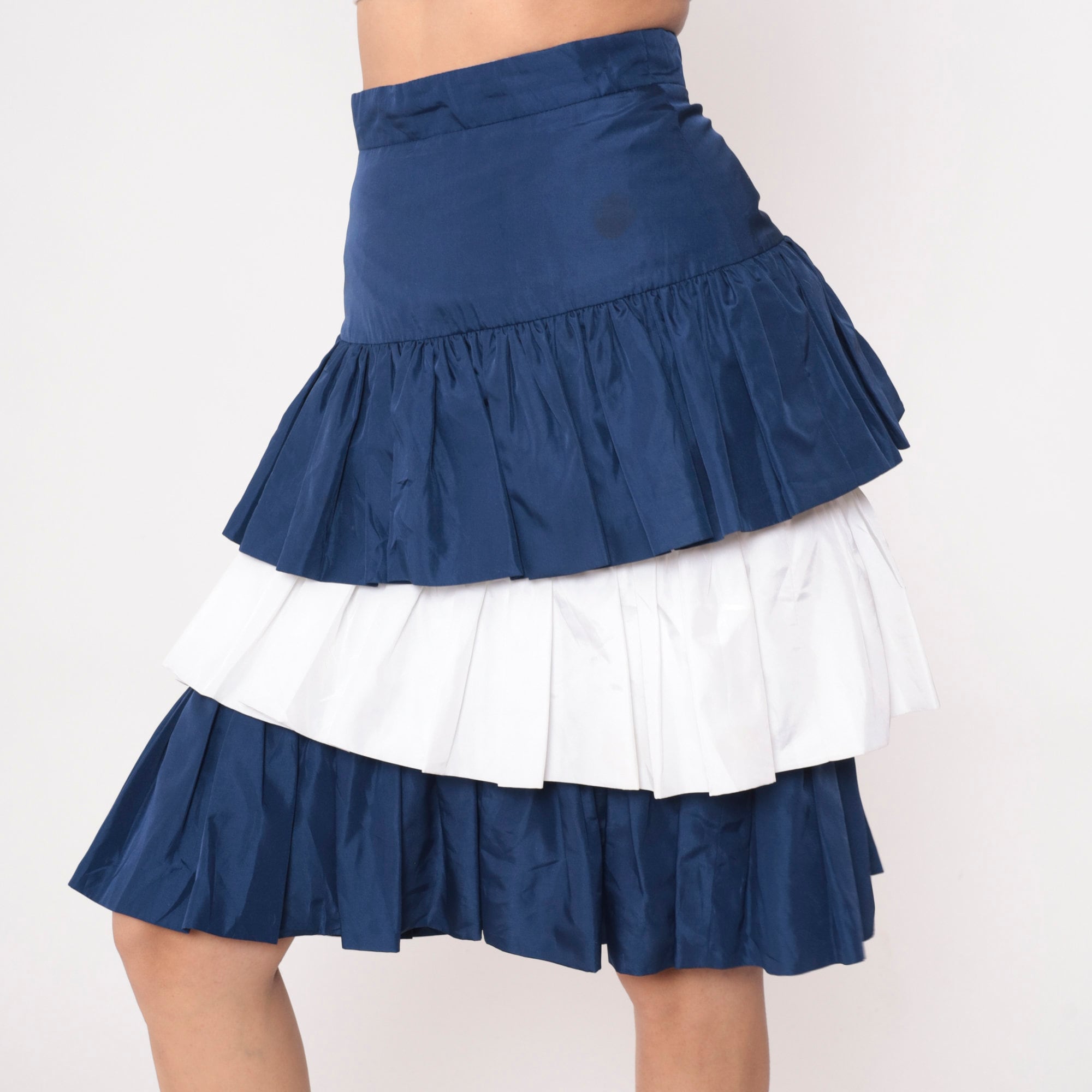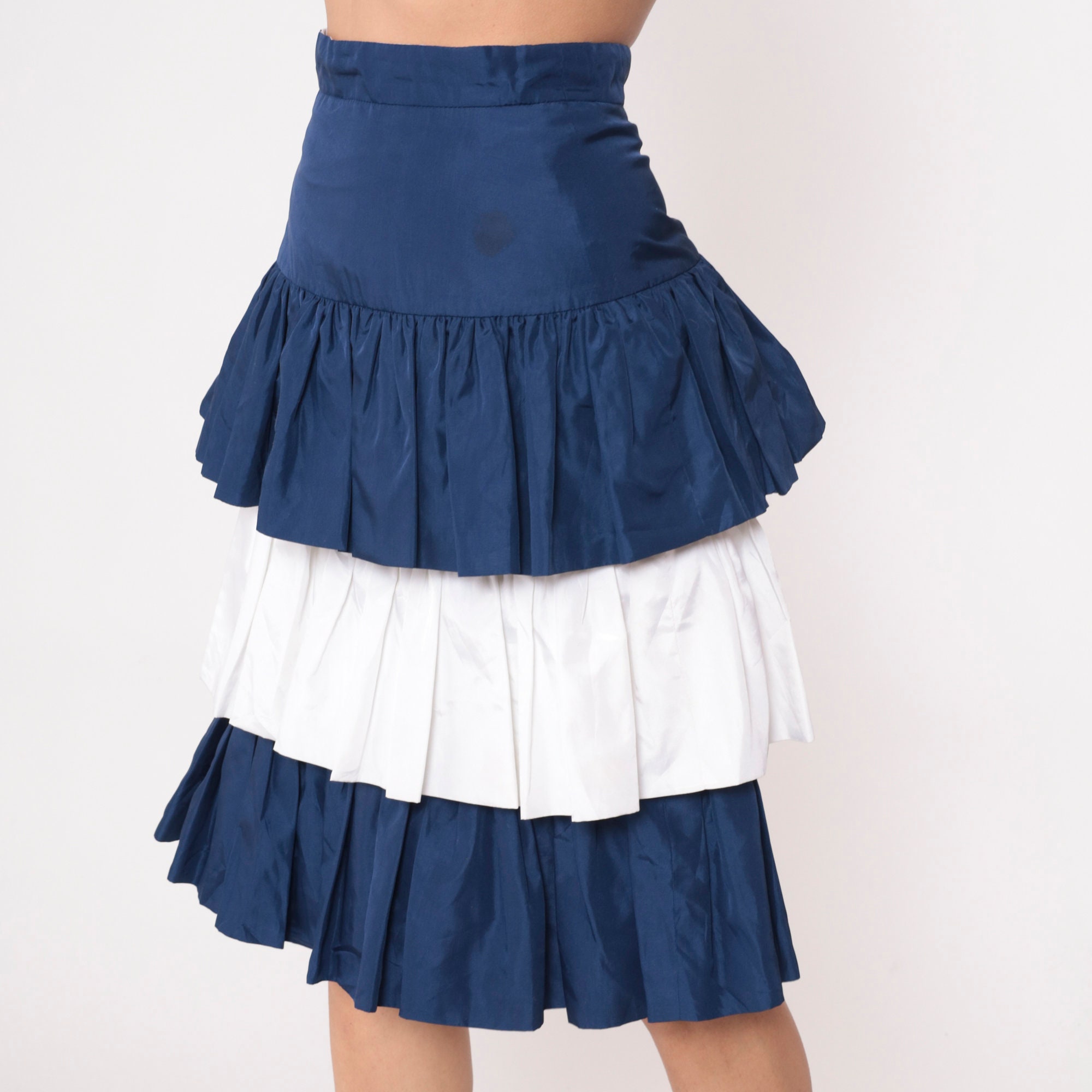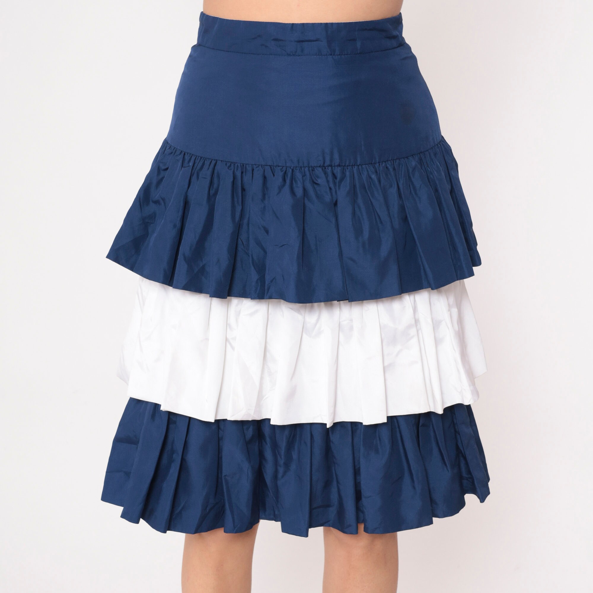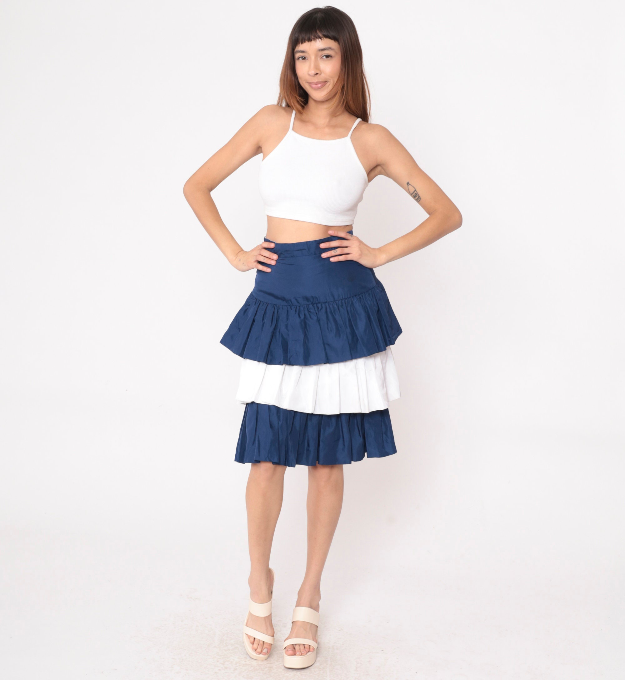 Vintage 90s skirt in tiered dark blue and white with a high waist and a rear zipper.