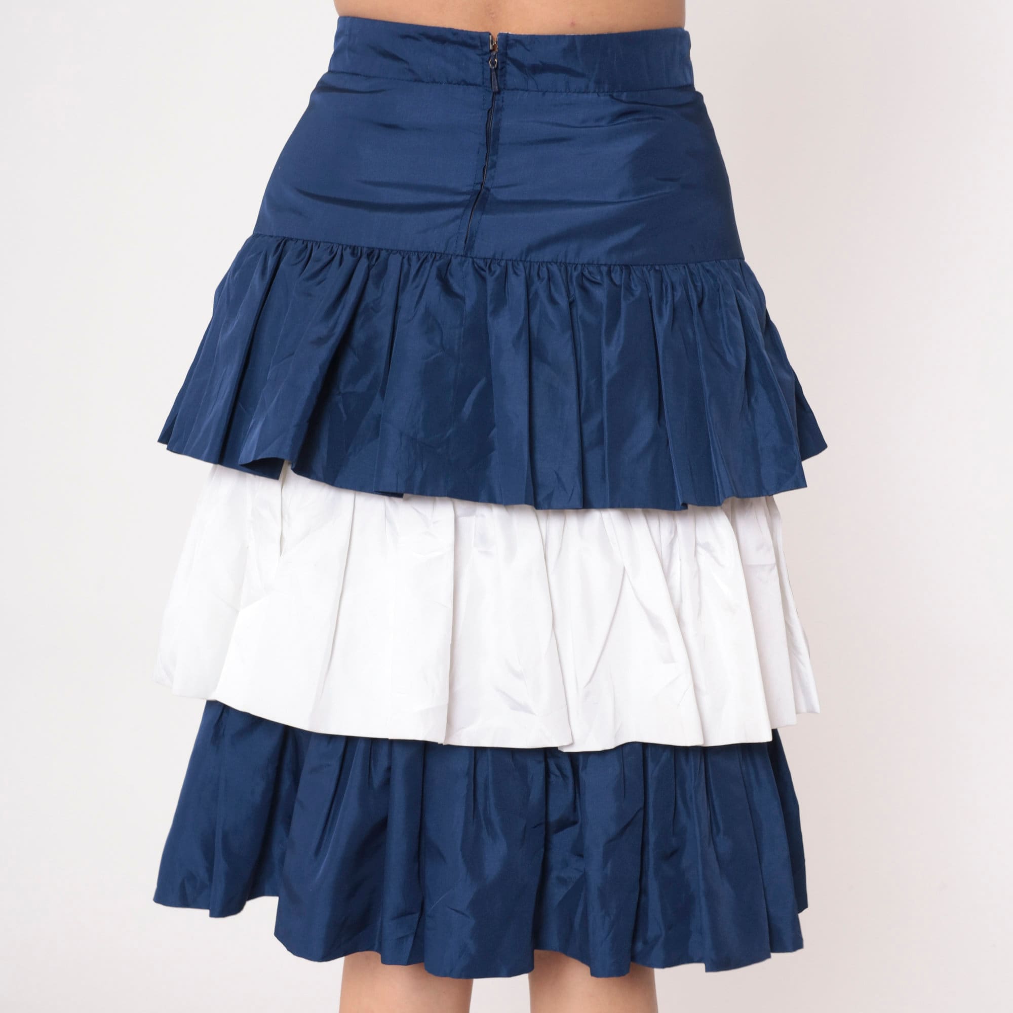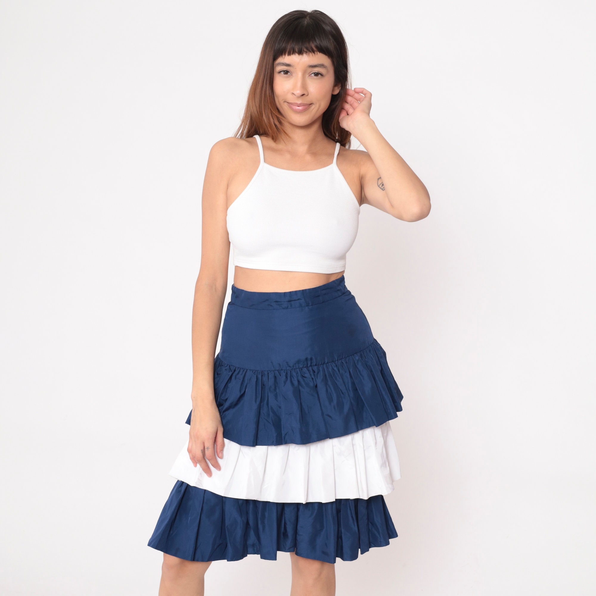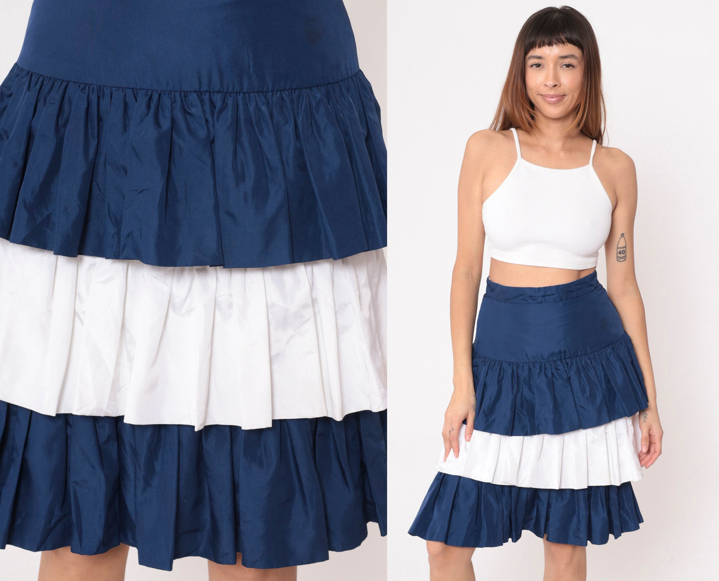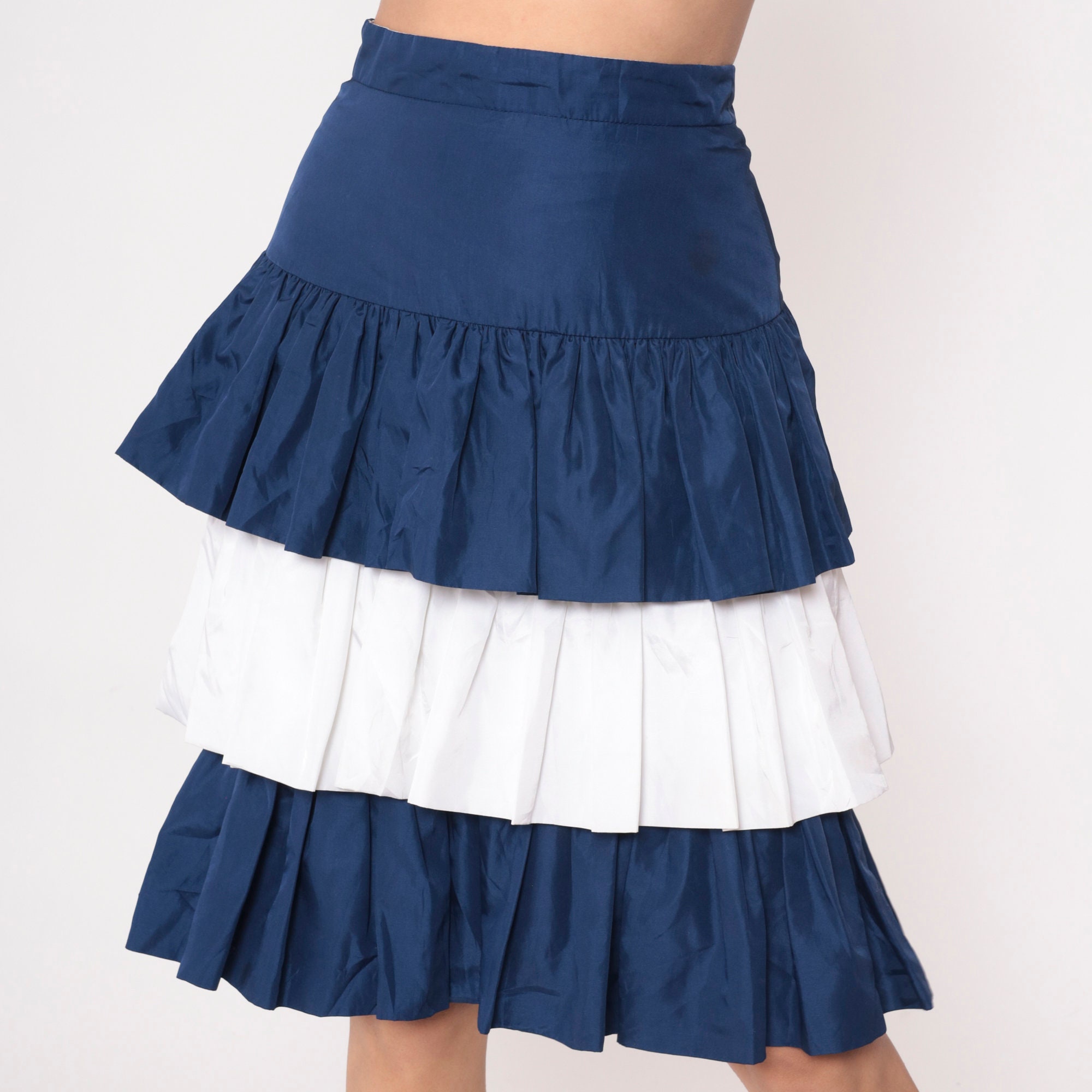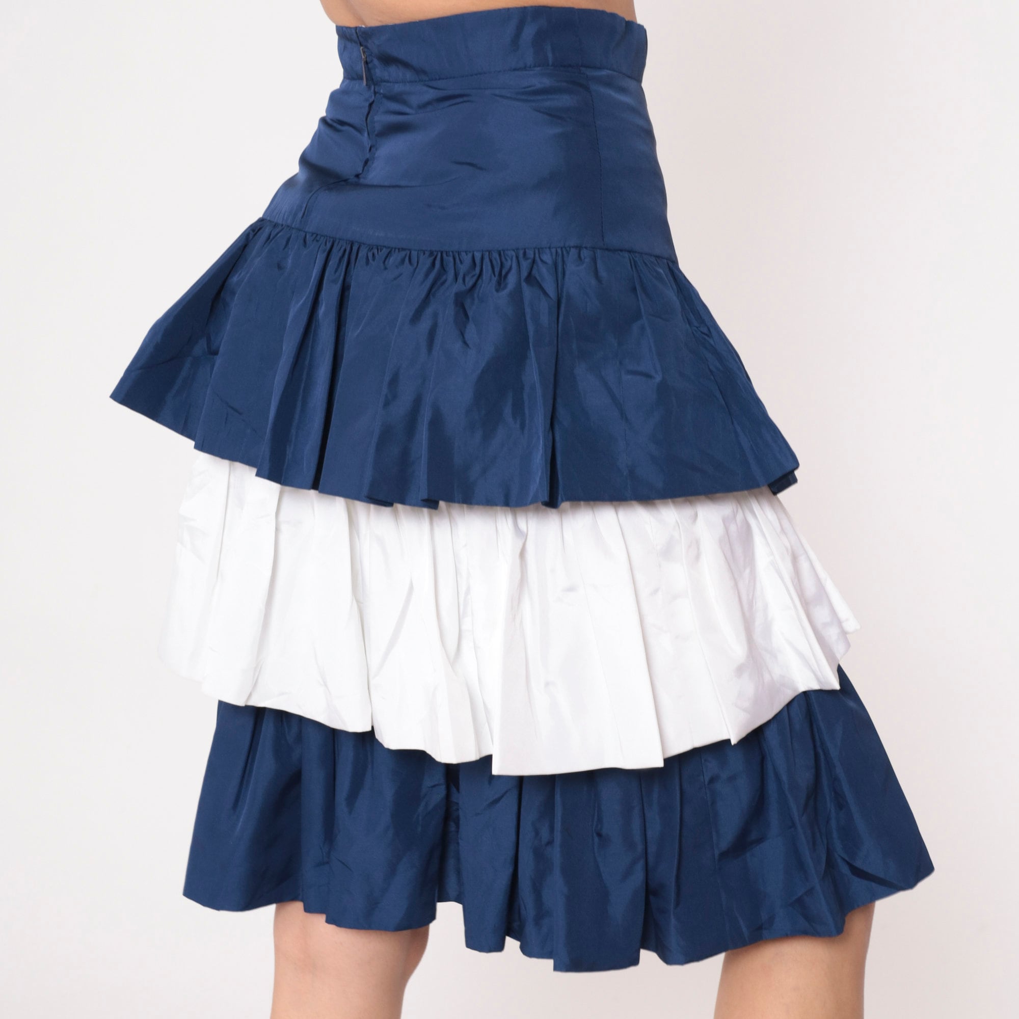 Vintage 90s skirt in tiered dark blue and white with a high waist and a rear zipper.