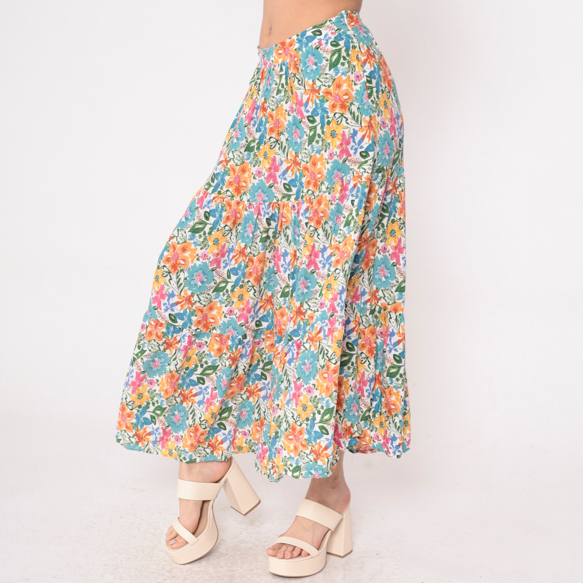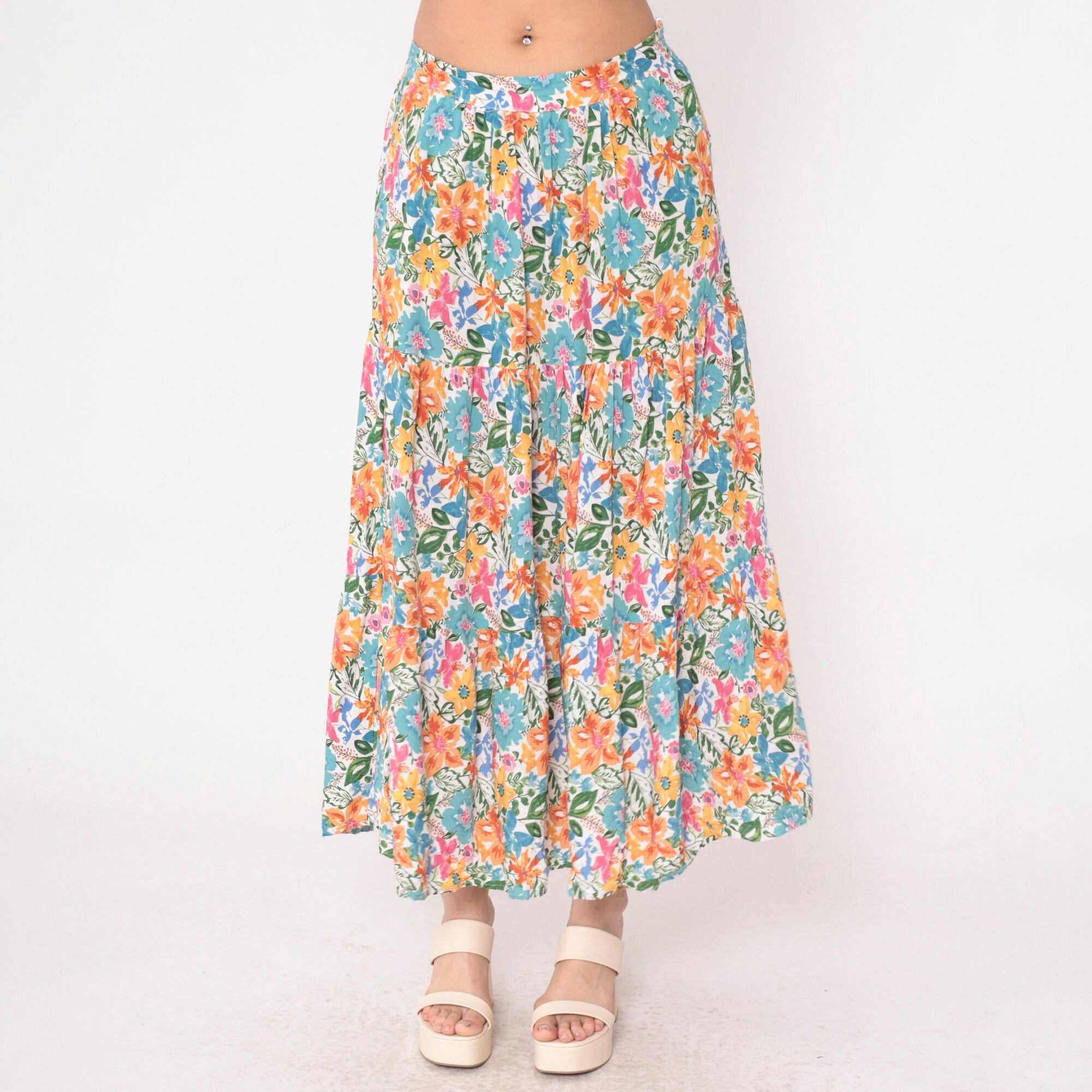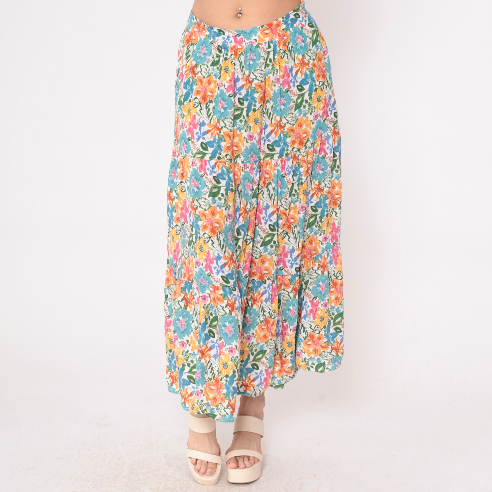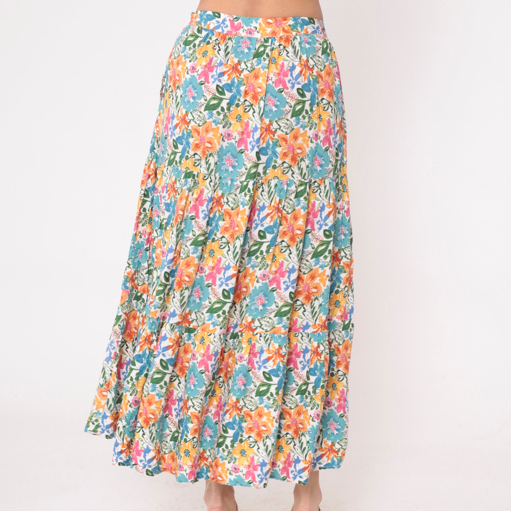 Vintage 00s skirt with a bright floral print and tiered panels.