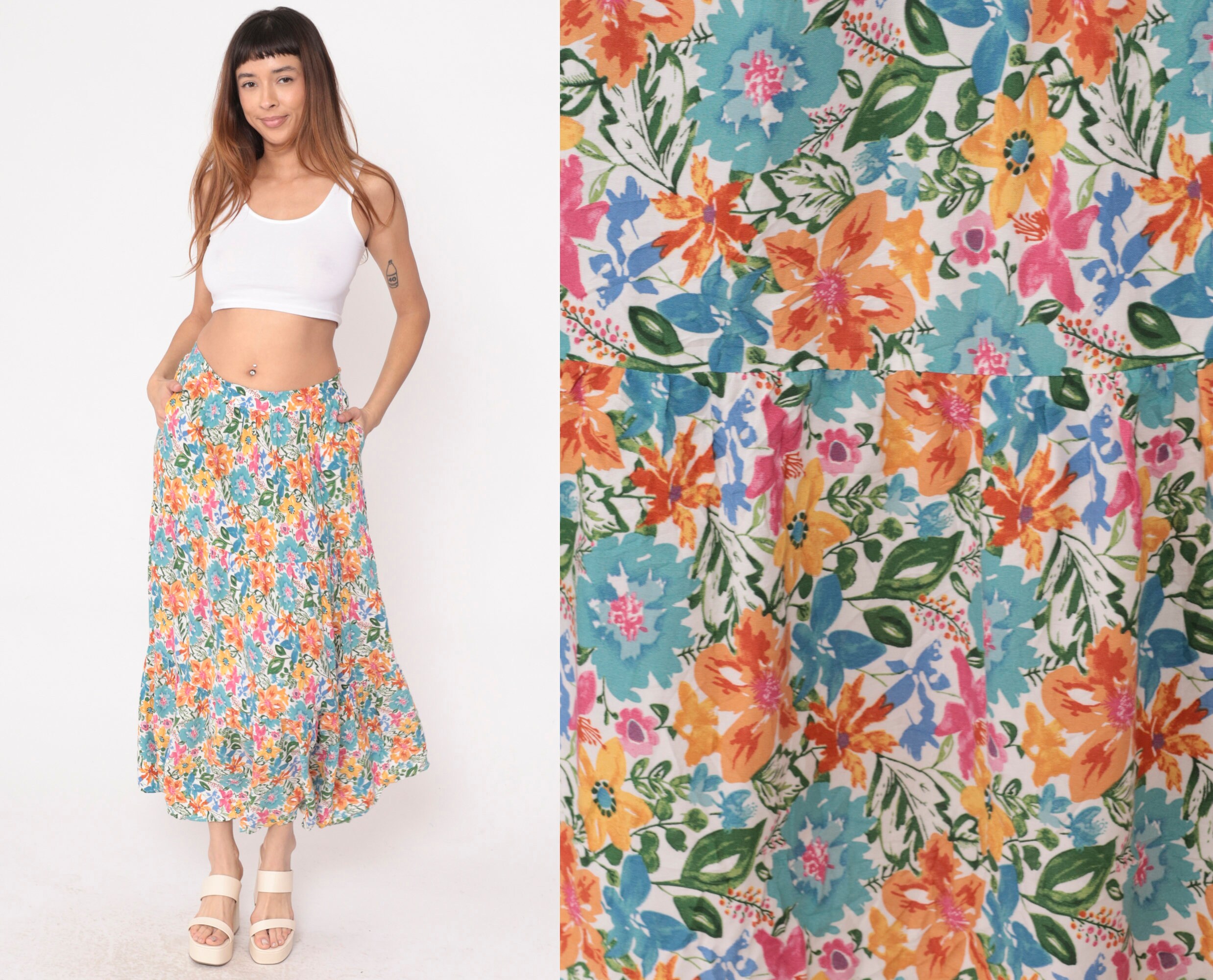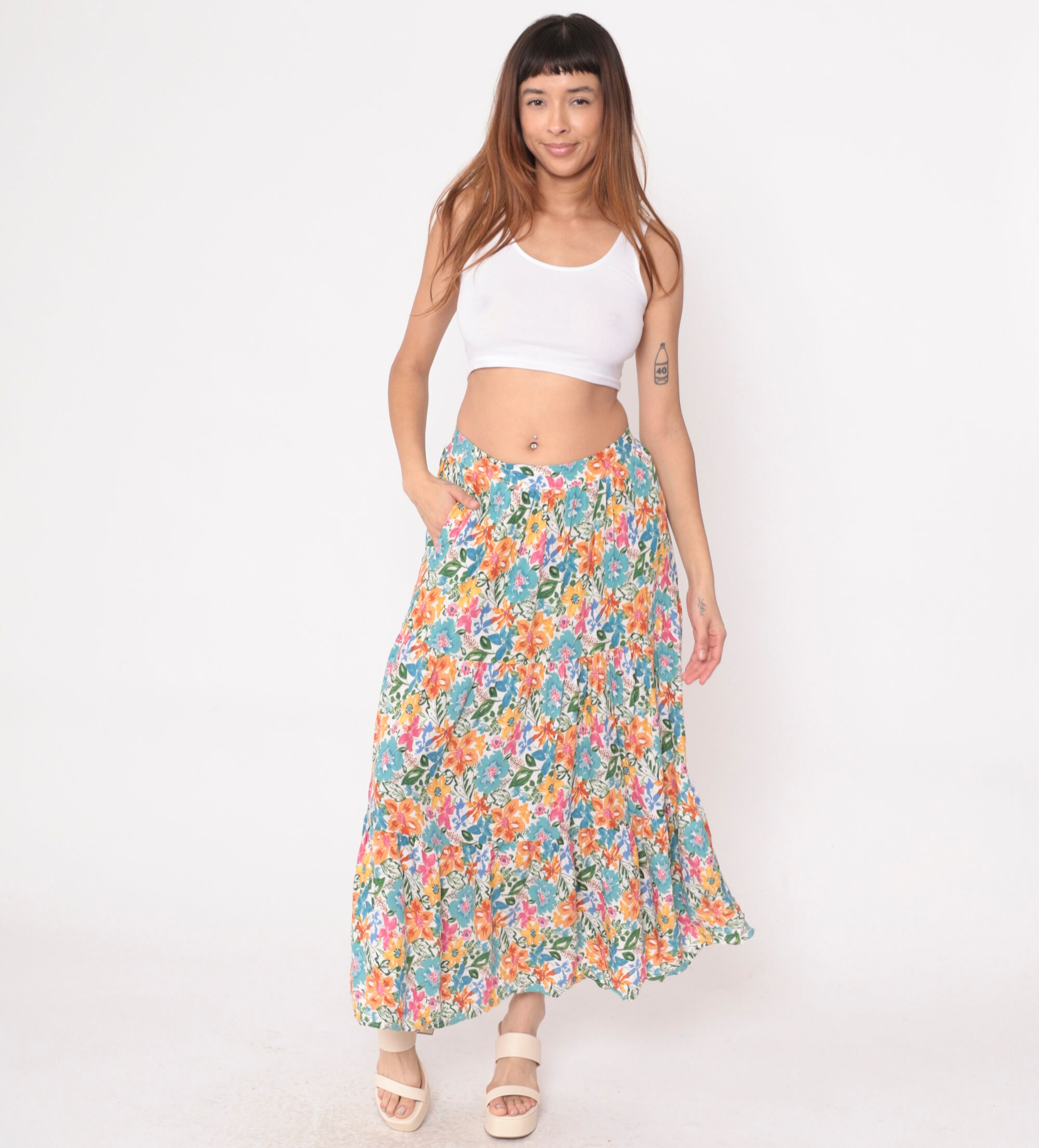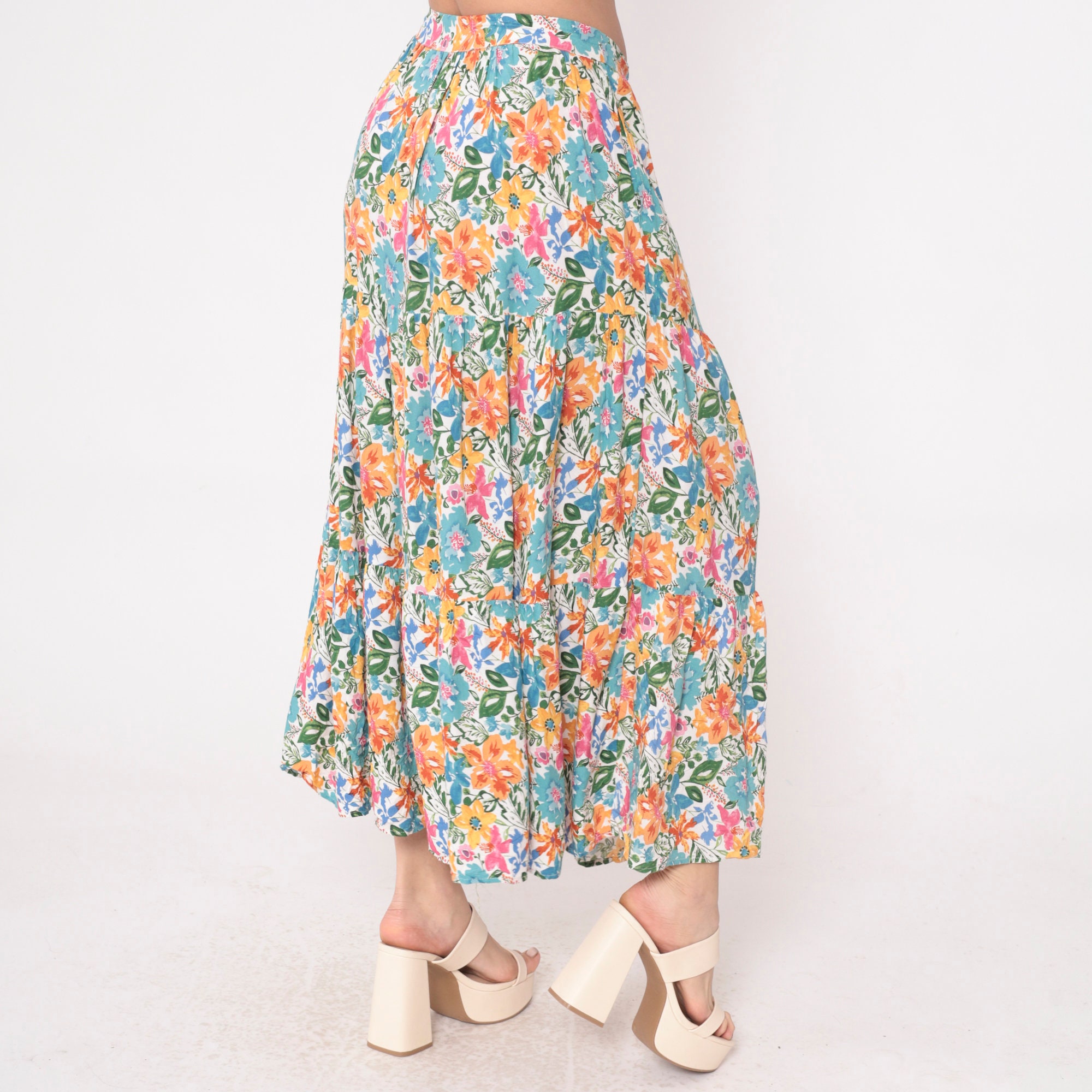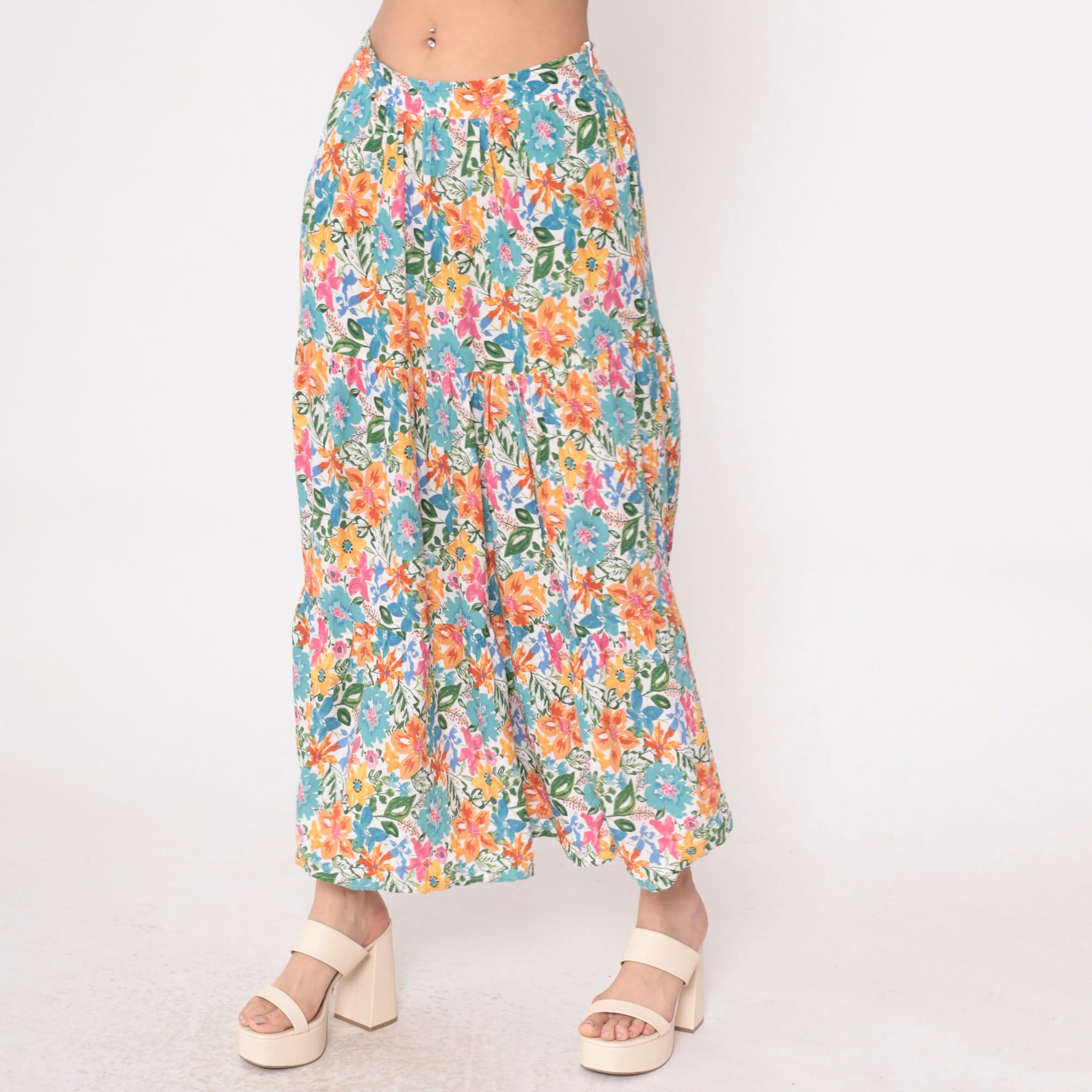 Vintage 00s skirt with a bright floral print and tiered panels.