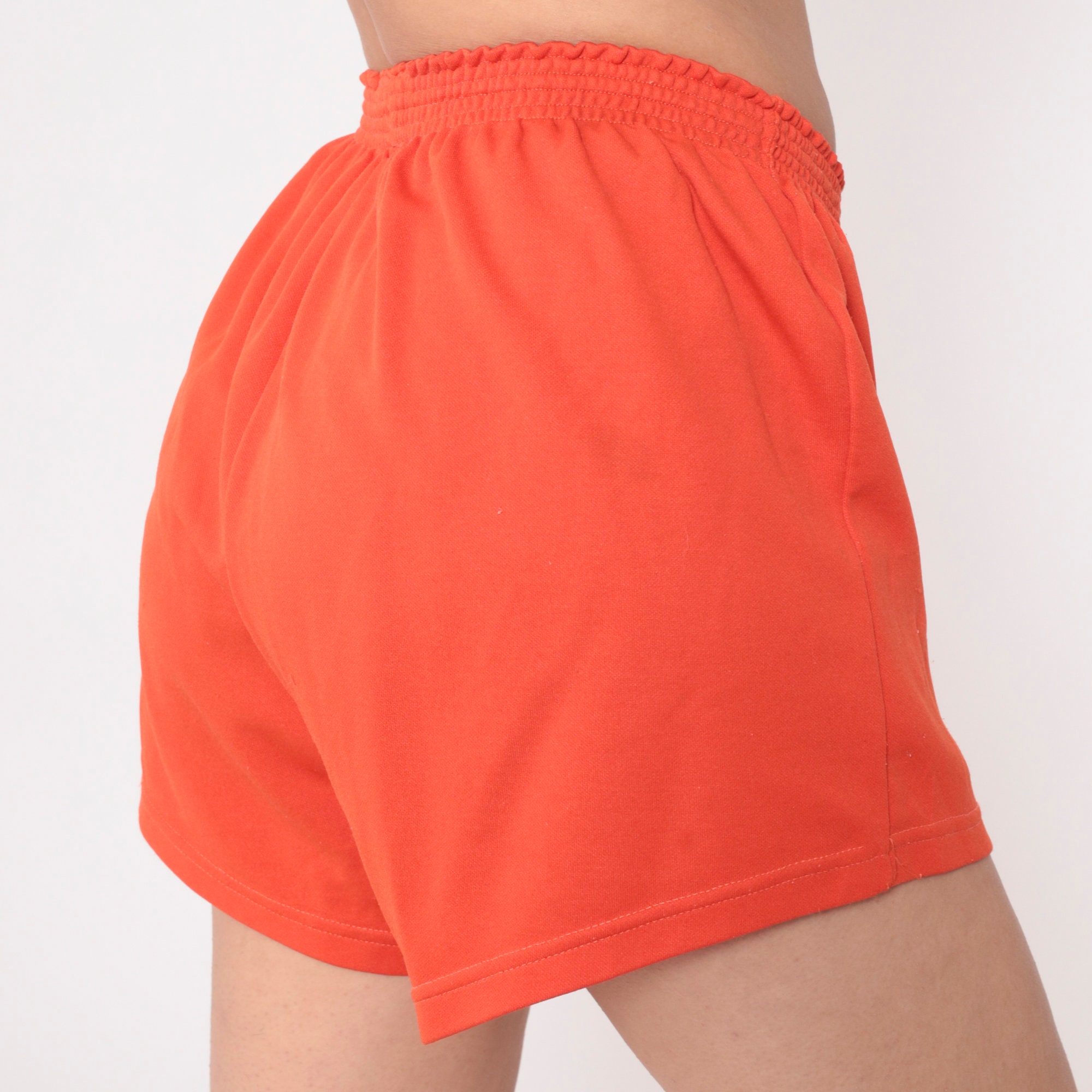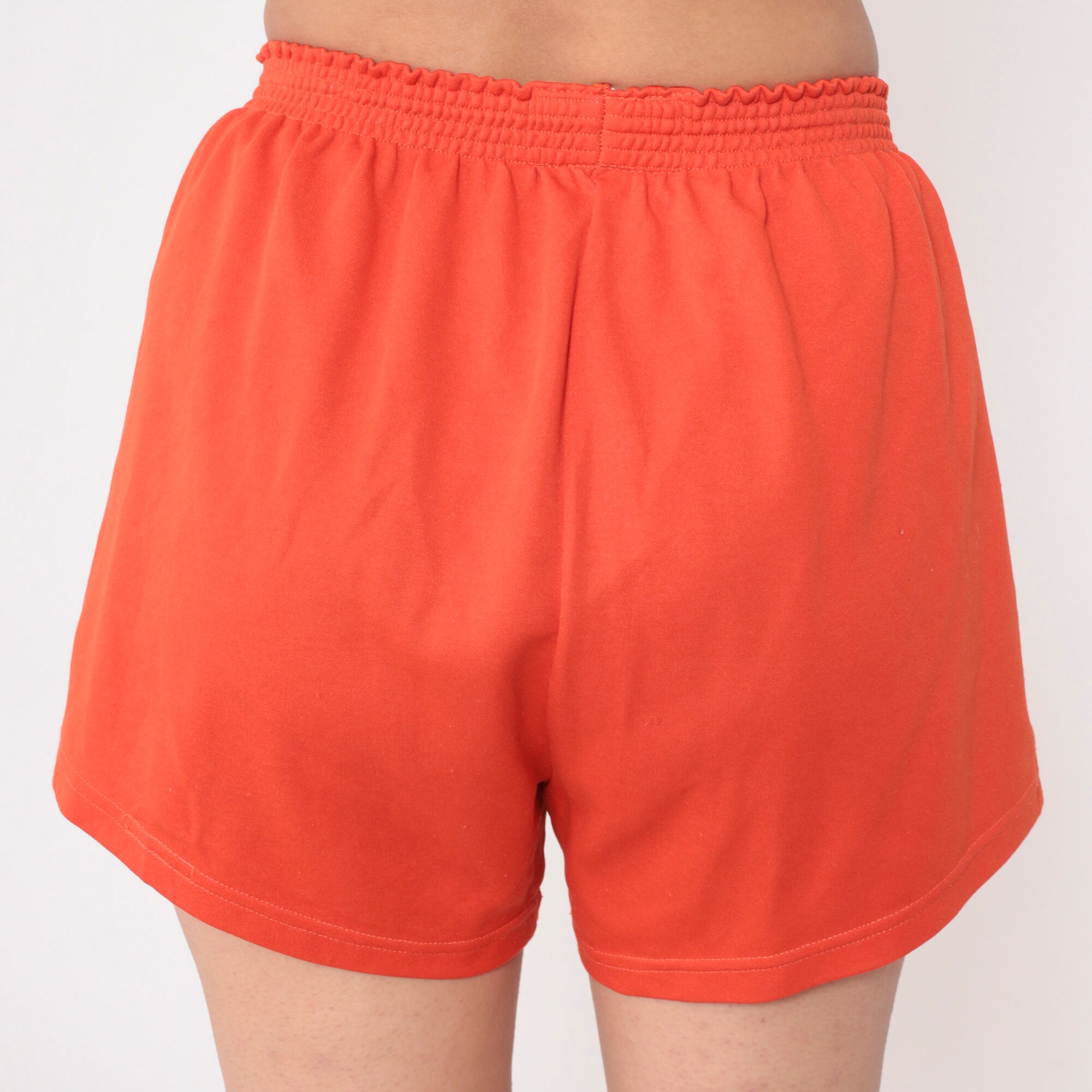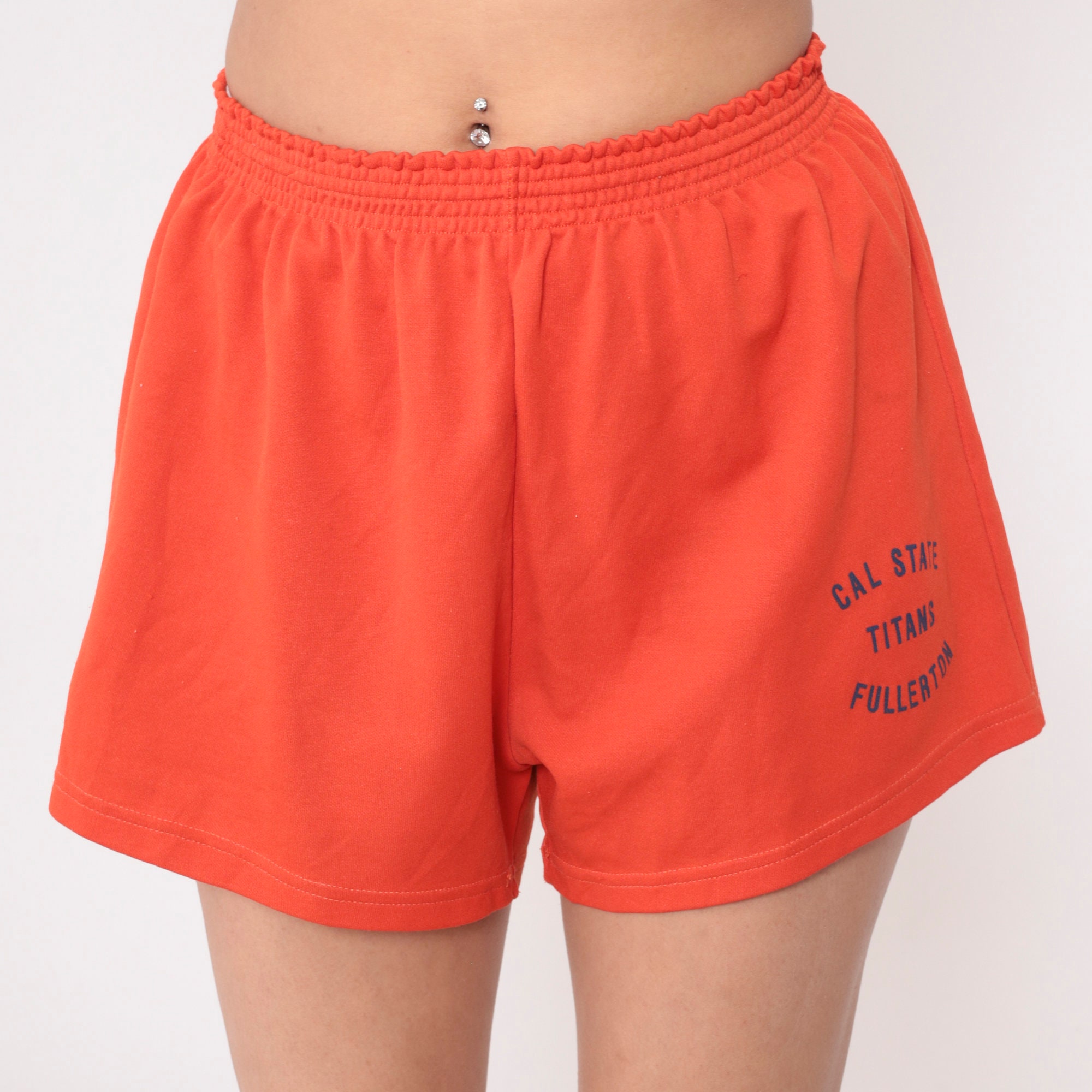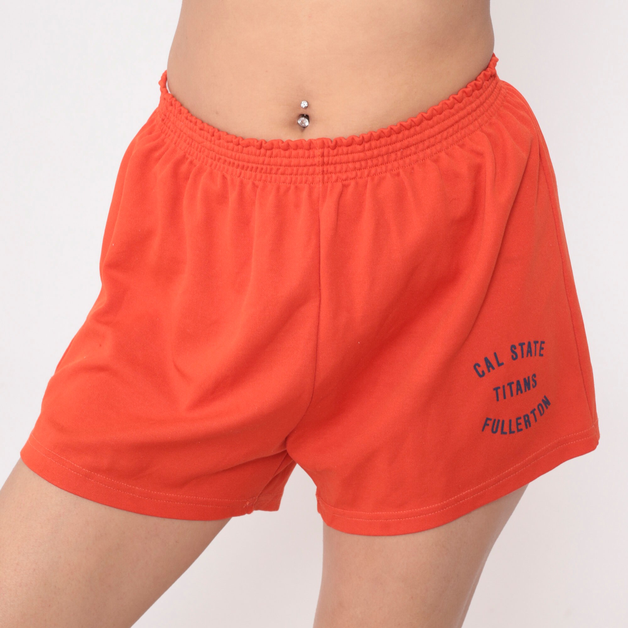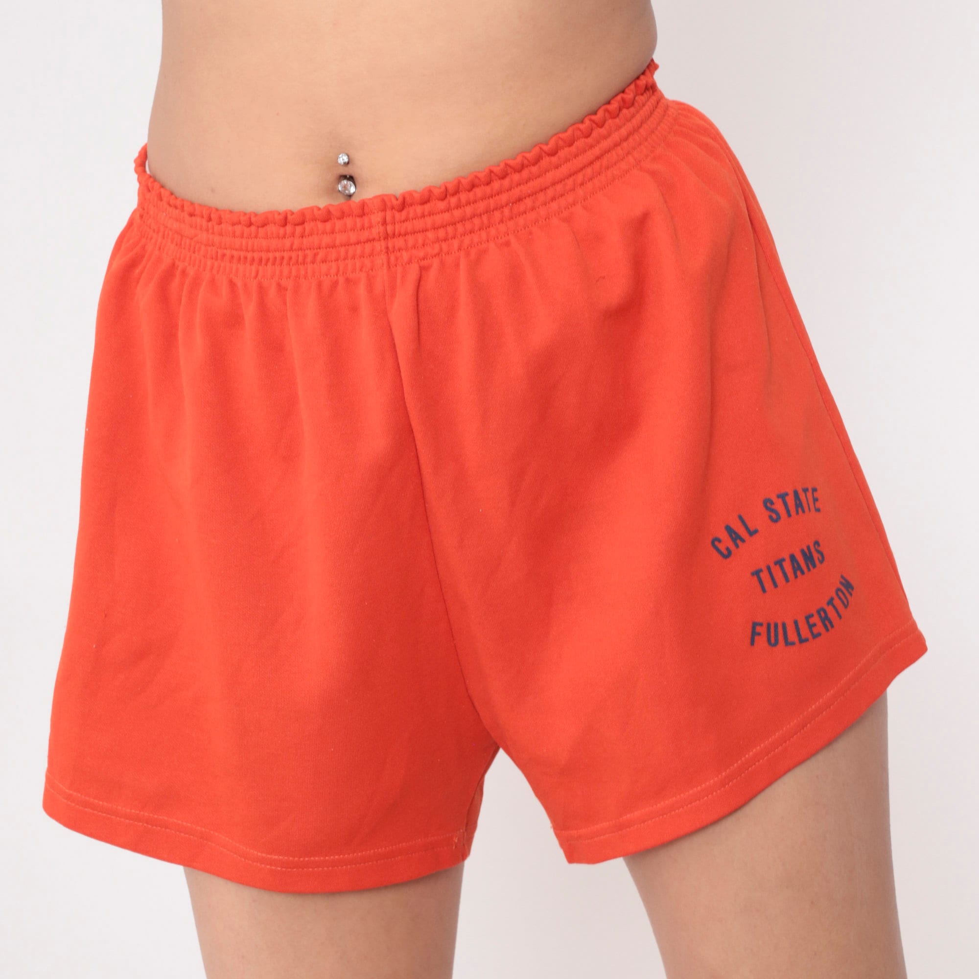 Vintage 80s gym shorts in orange with a Call State Titans Fullerton print.
