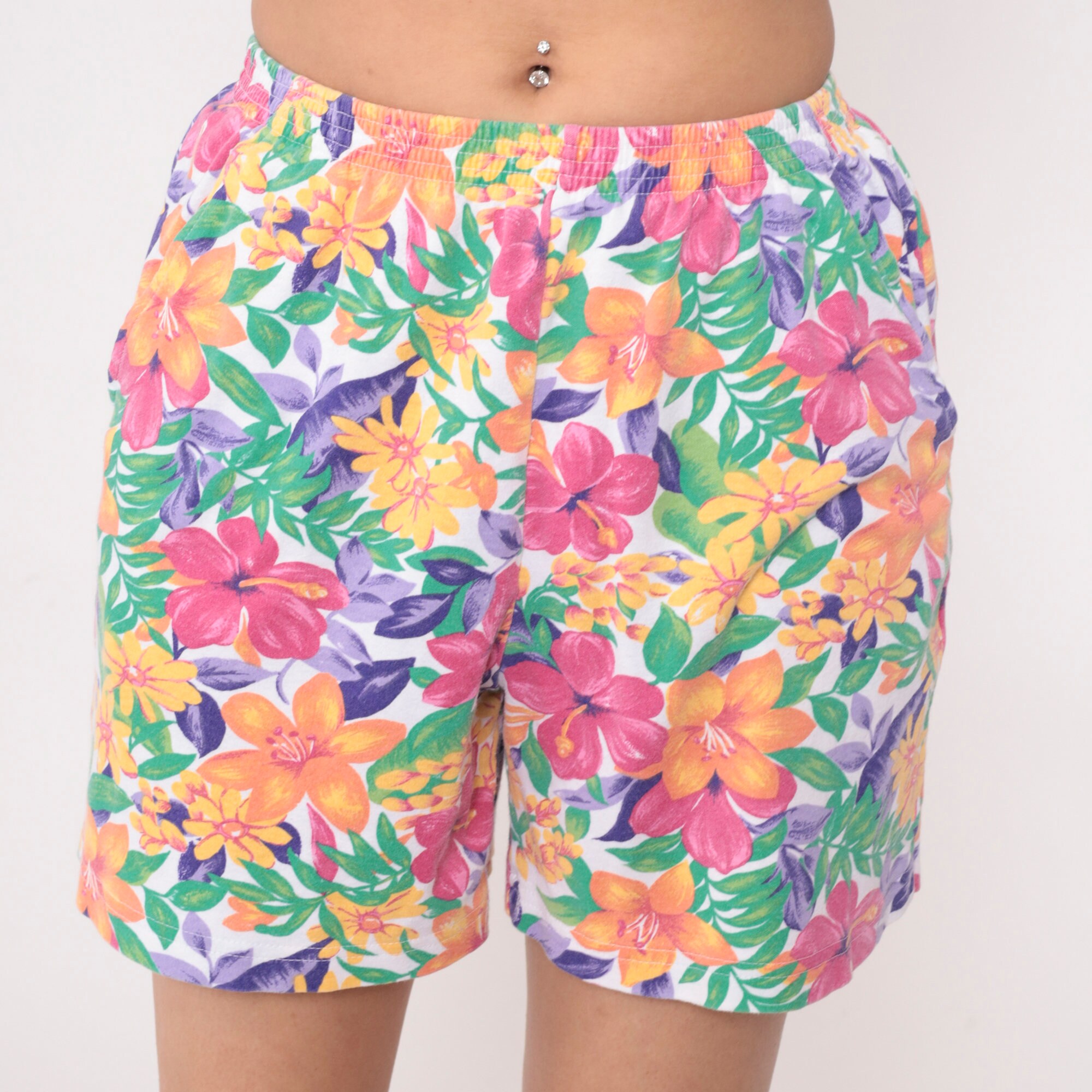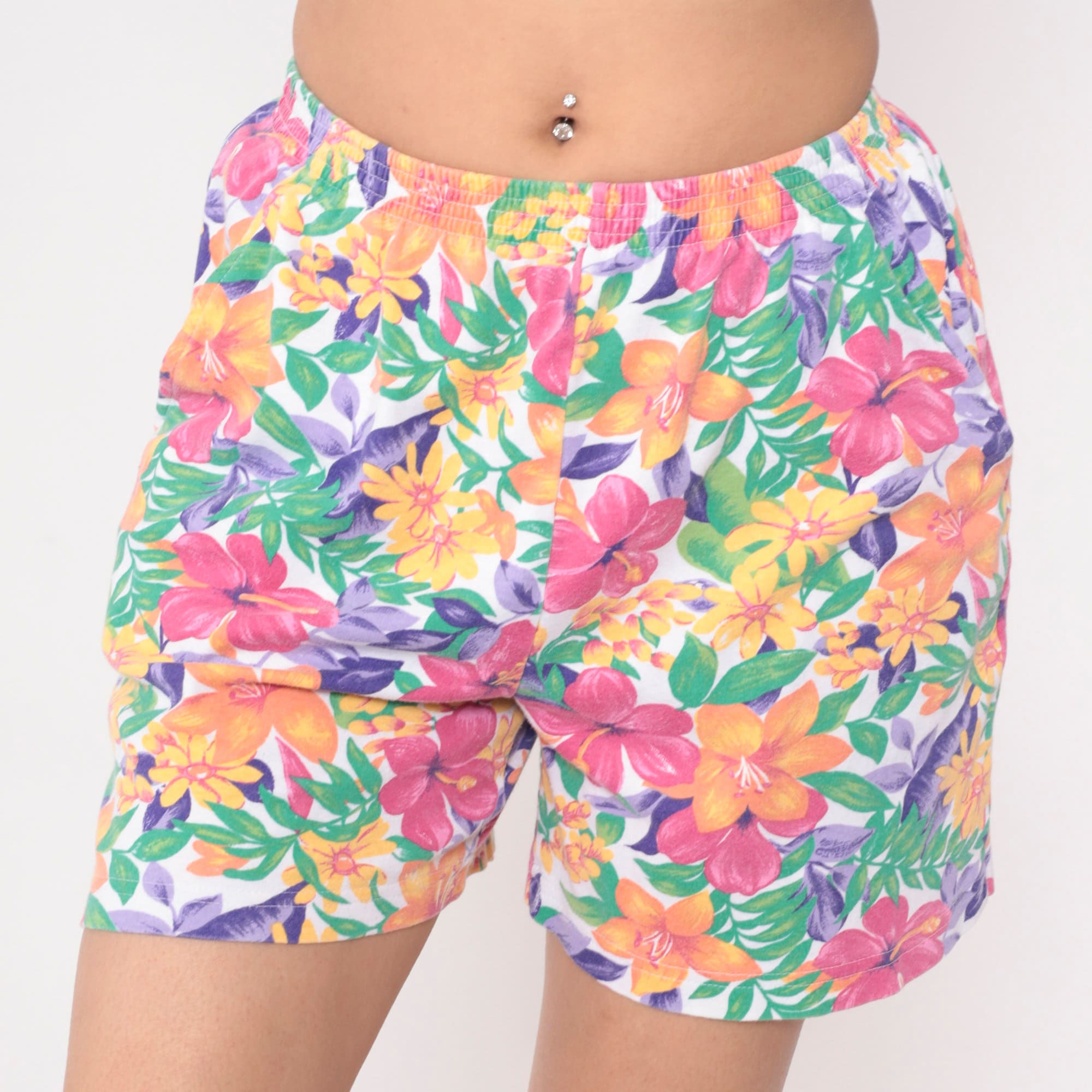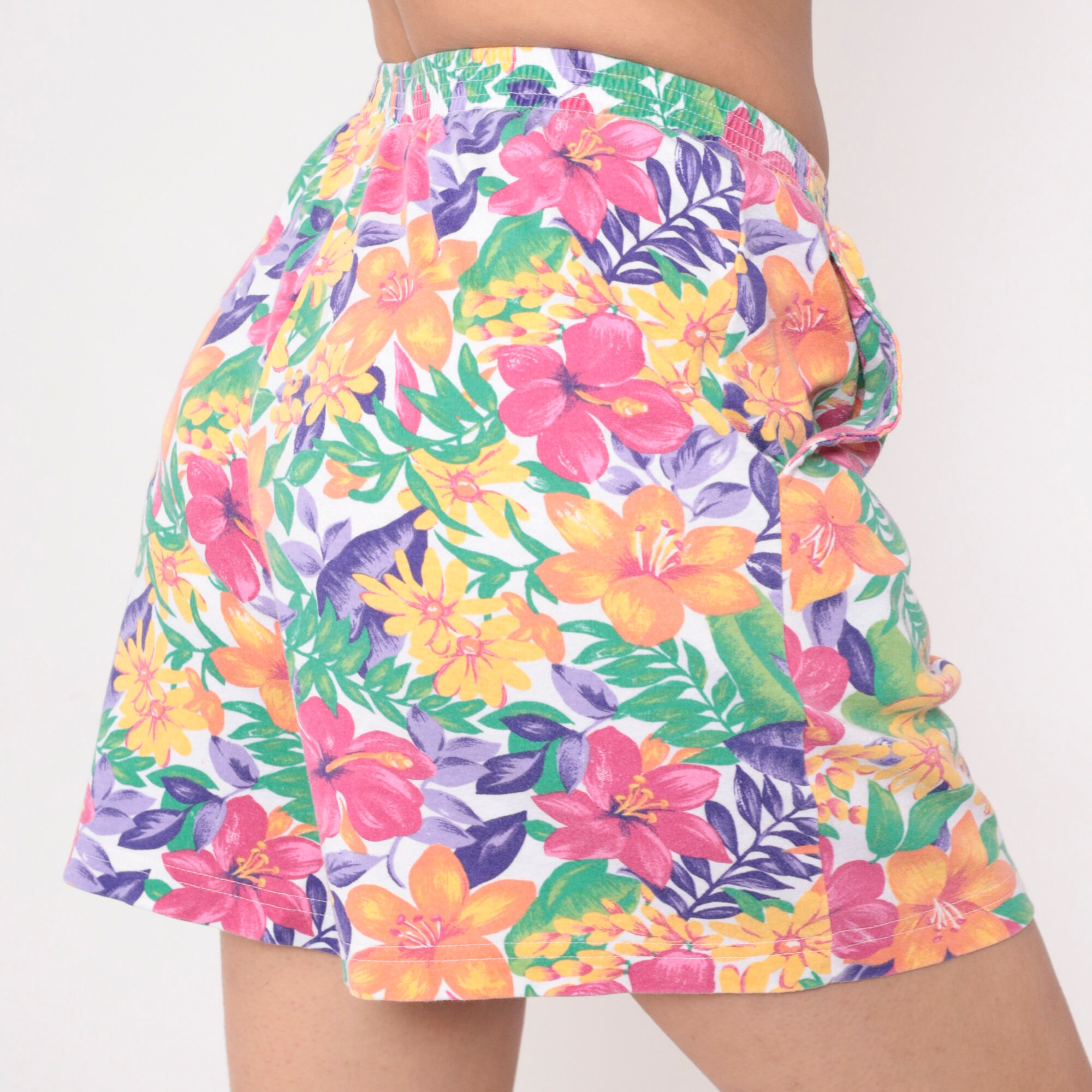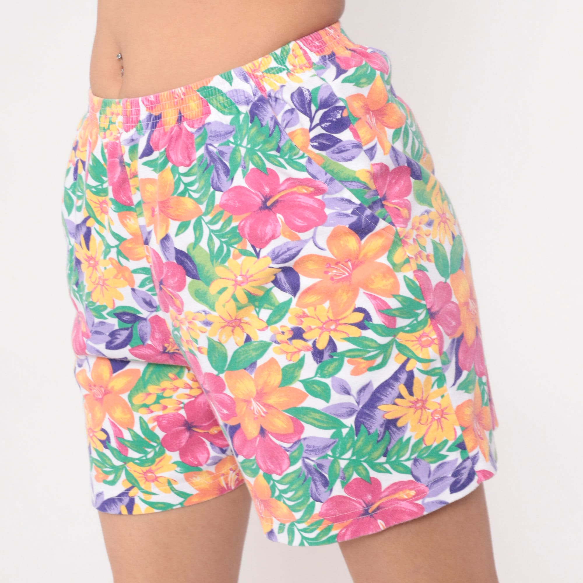 Vintage 90s shorts in a tropical floral and leaf print with a high elastic waist.