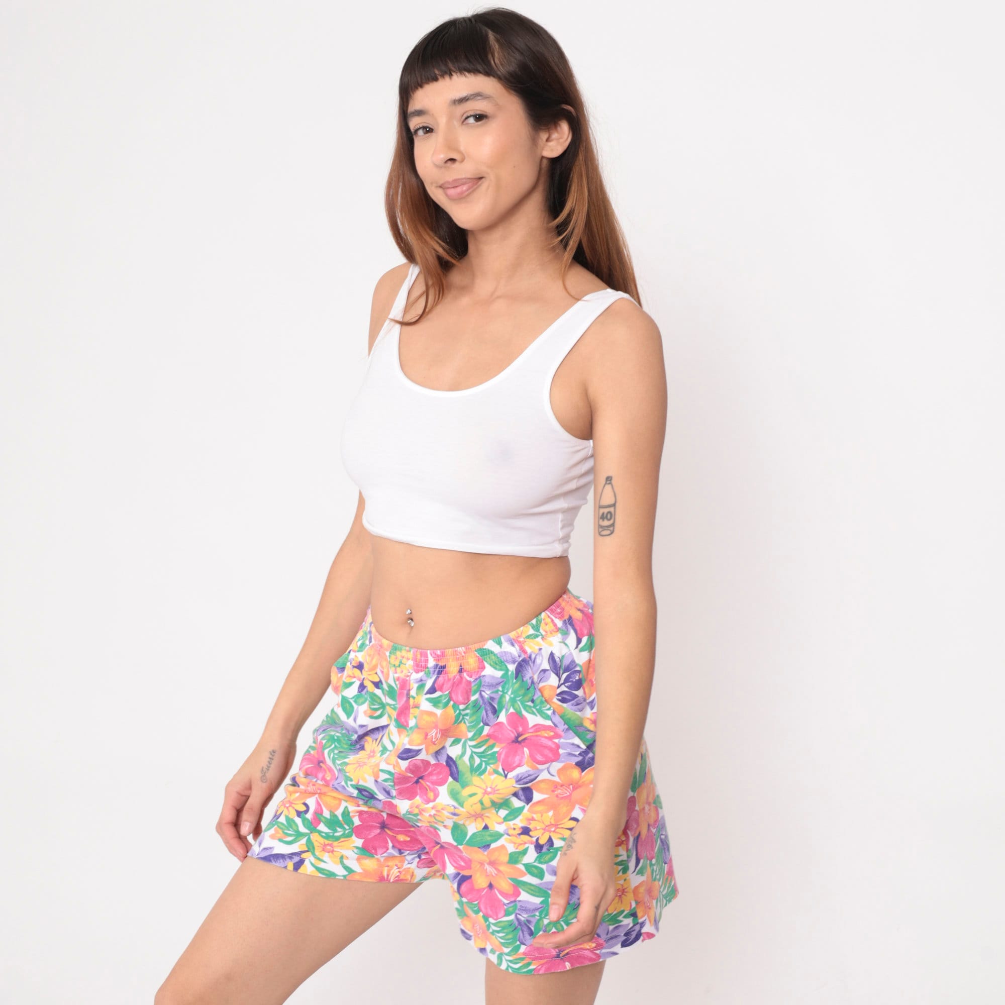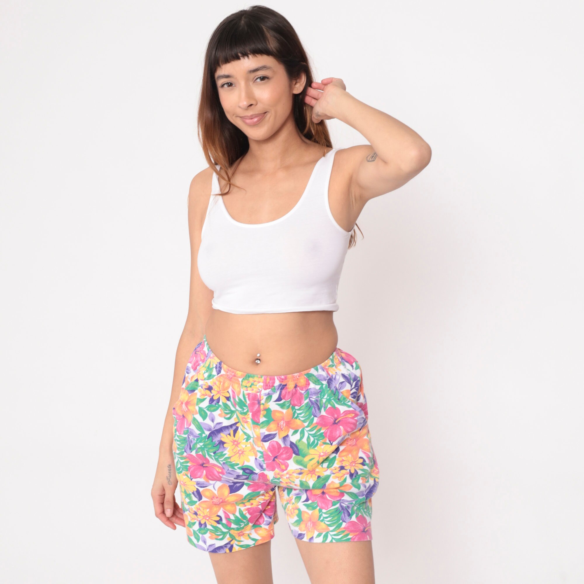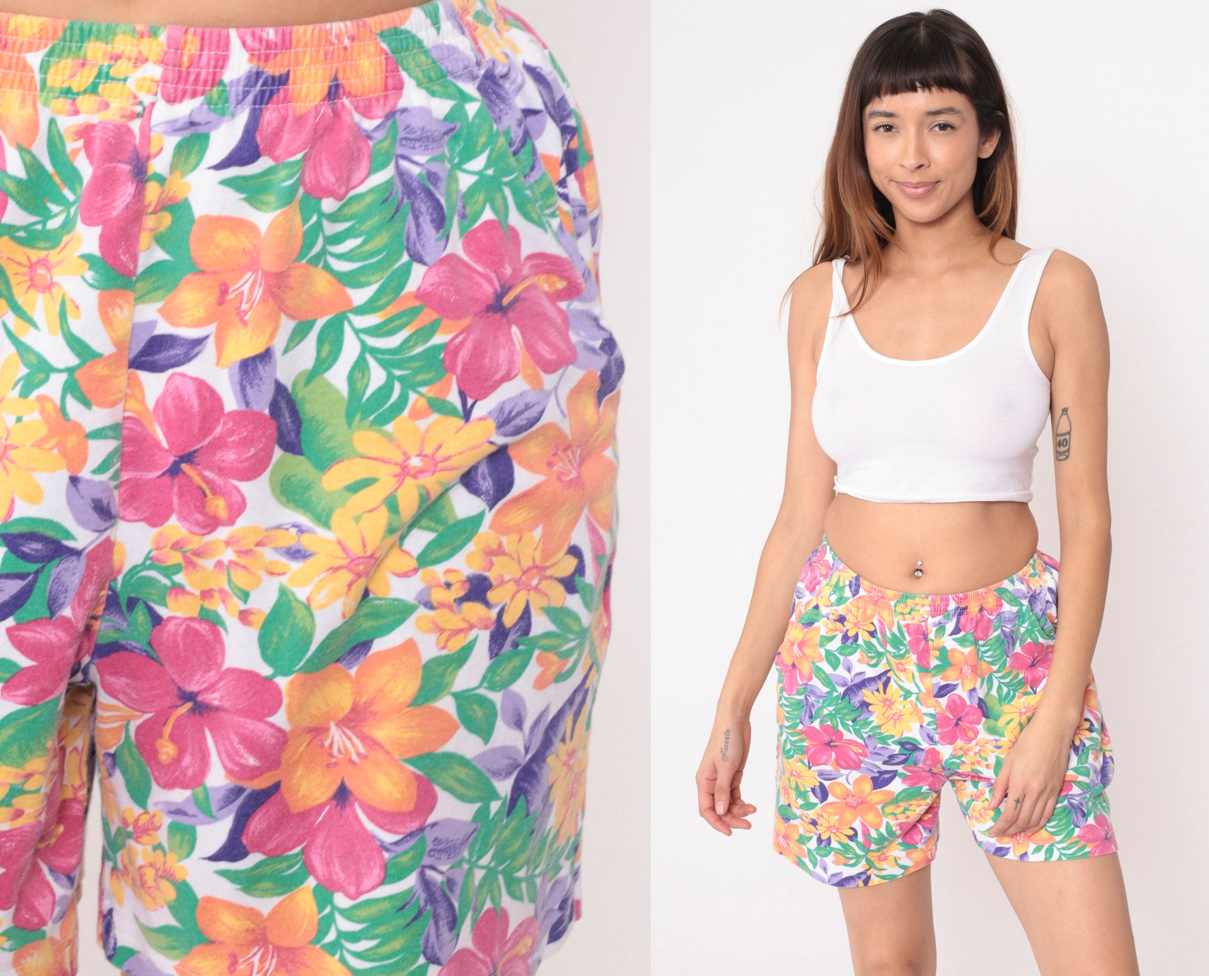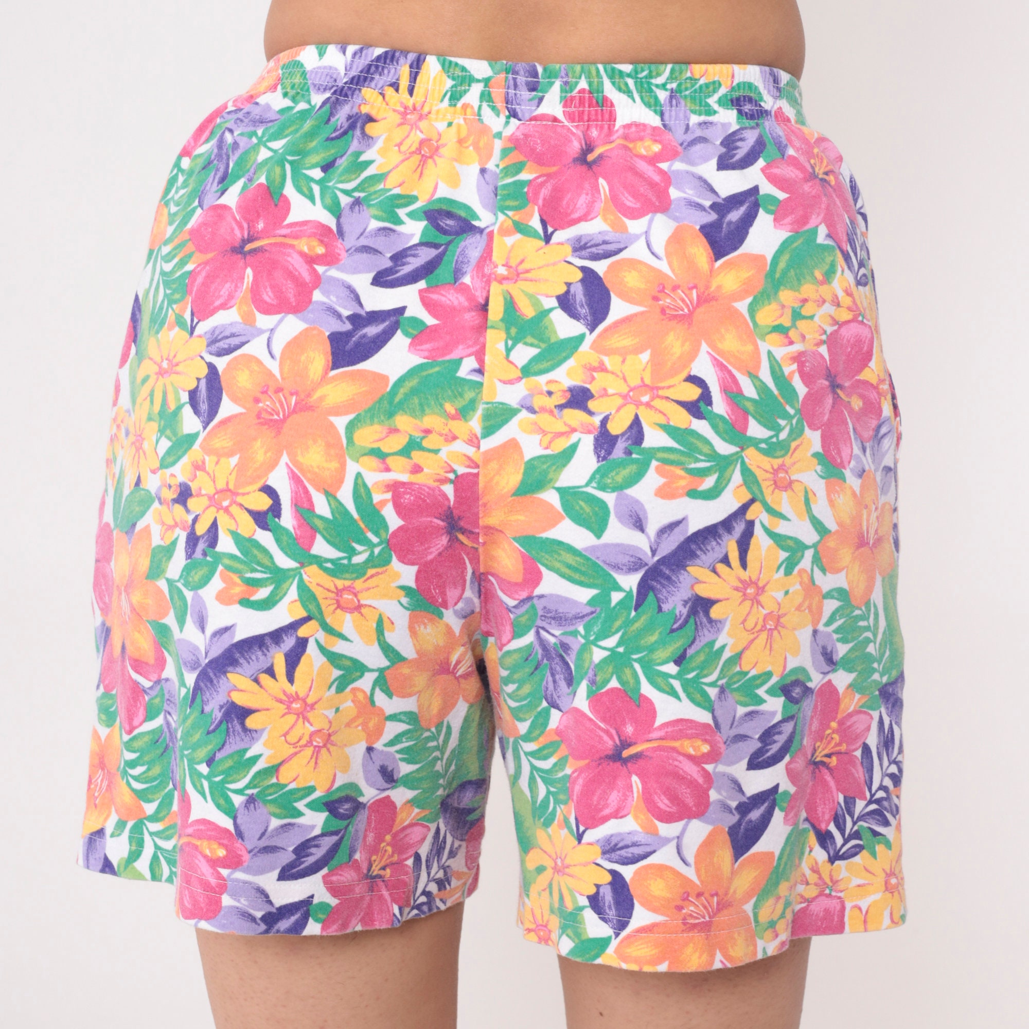Vintage 90s shorts in a tropical floral and leaf print with a high elastic waist.