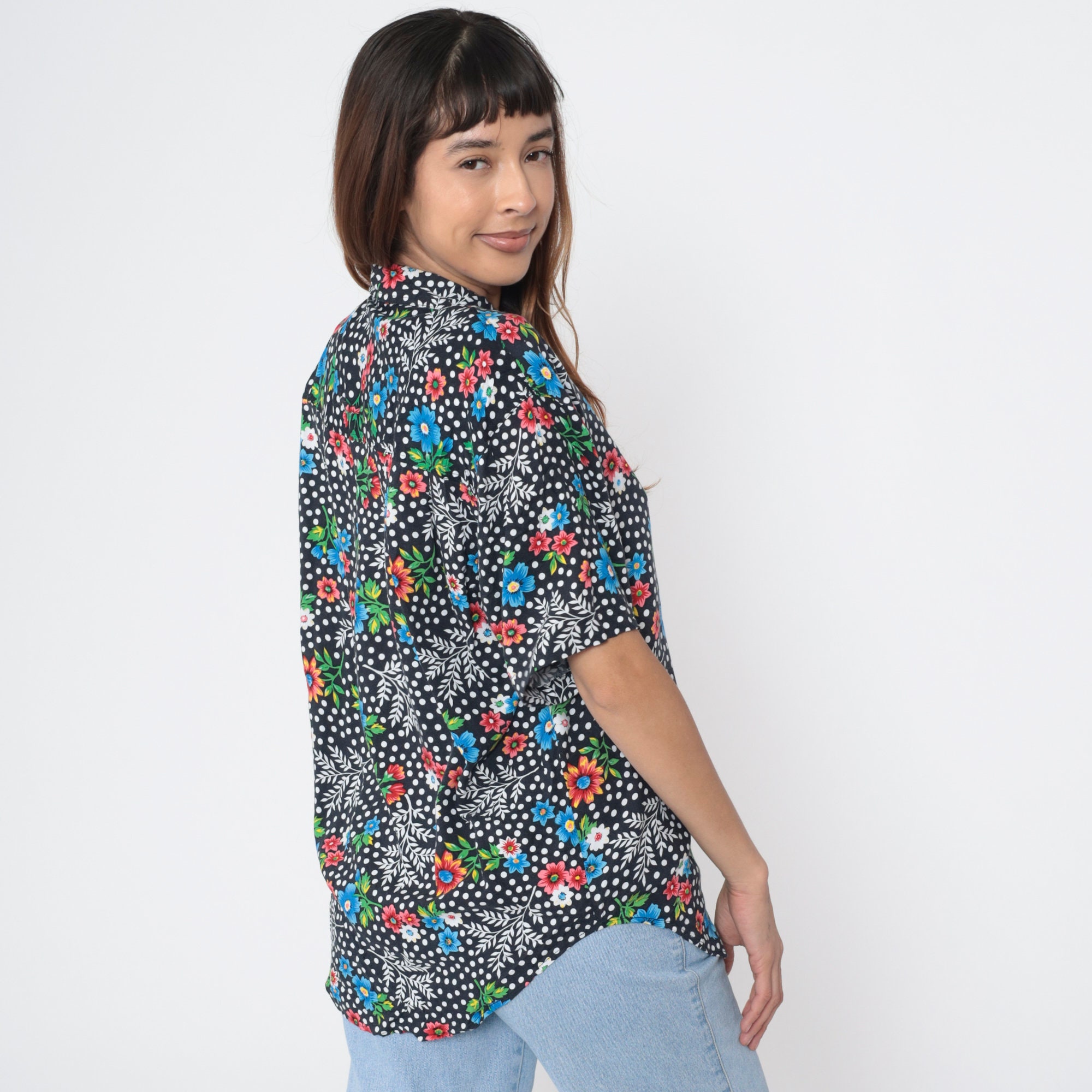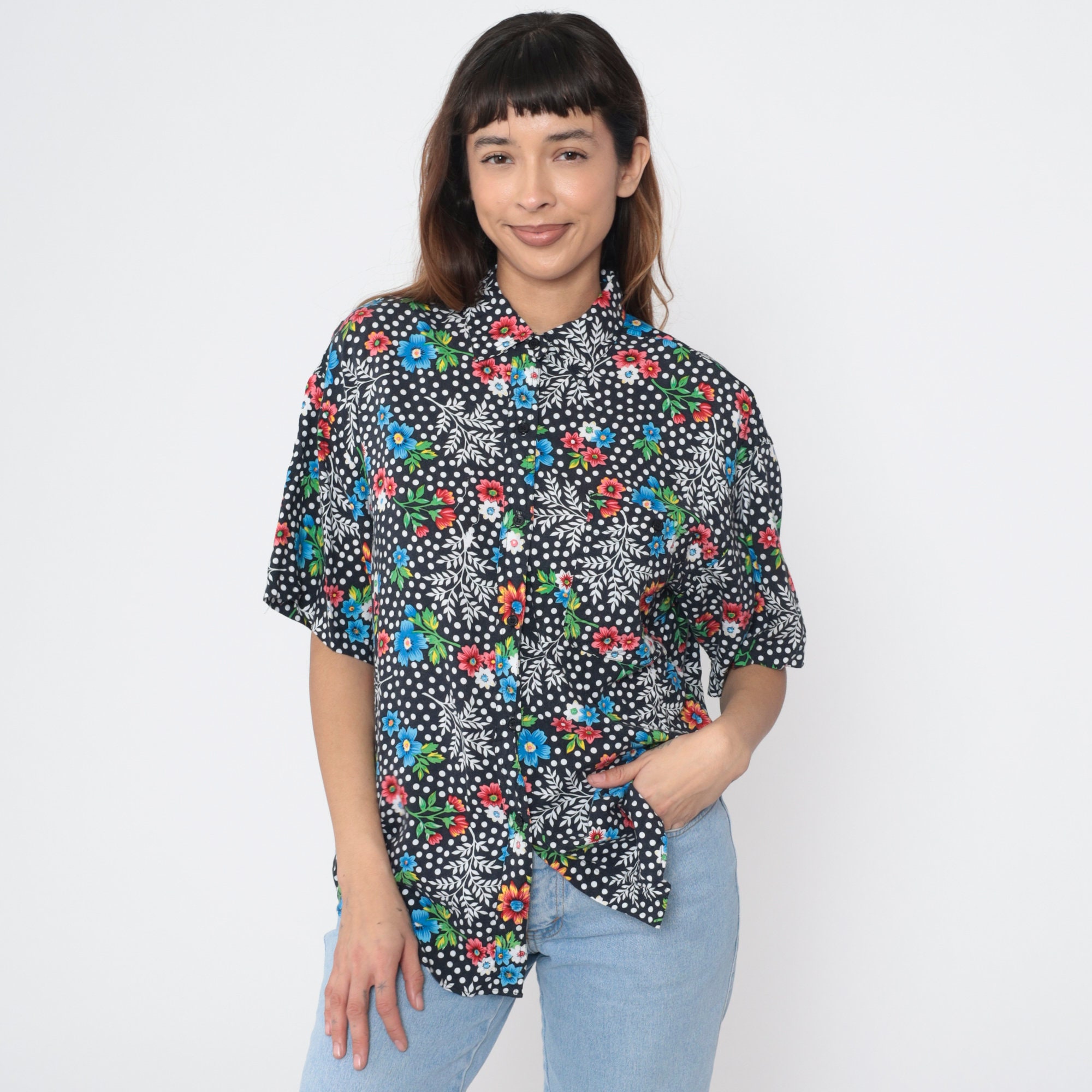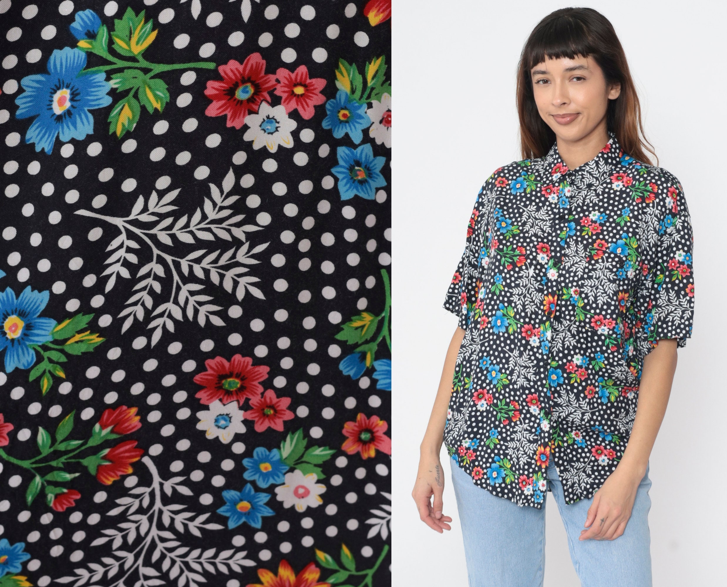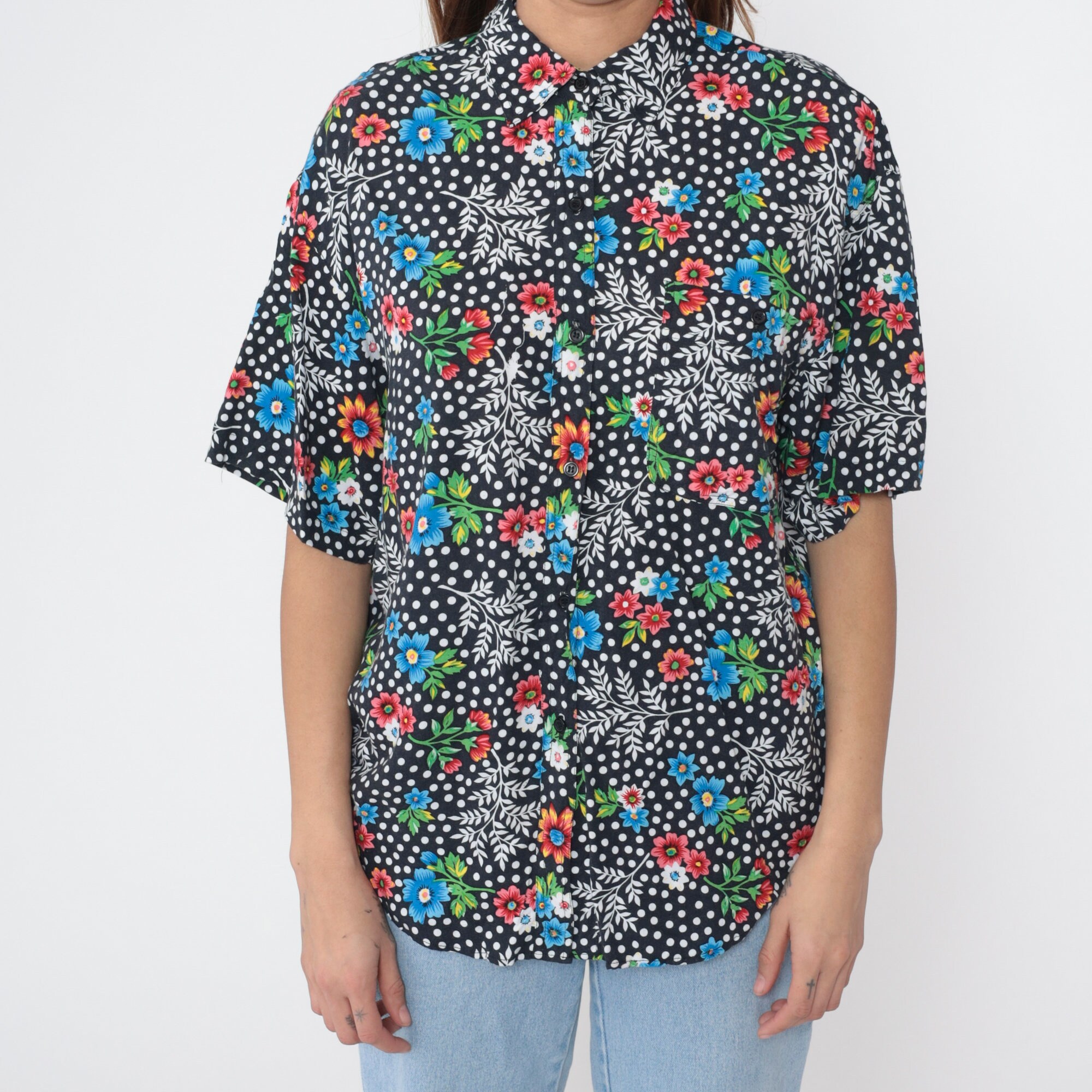 Vintage 90s shirt in a floral and polka dot print. It has short sleeves and buttons up the front.