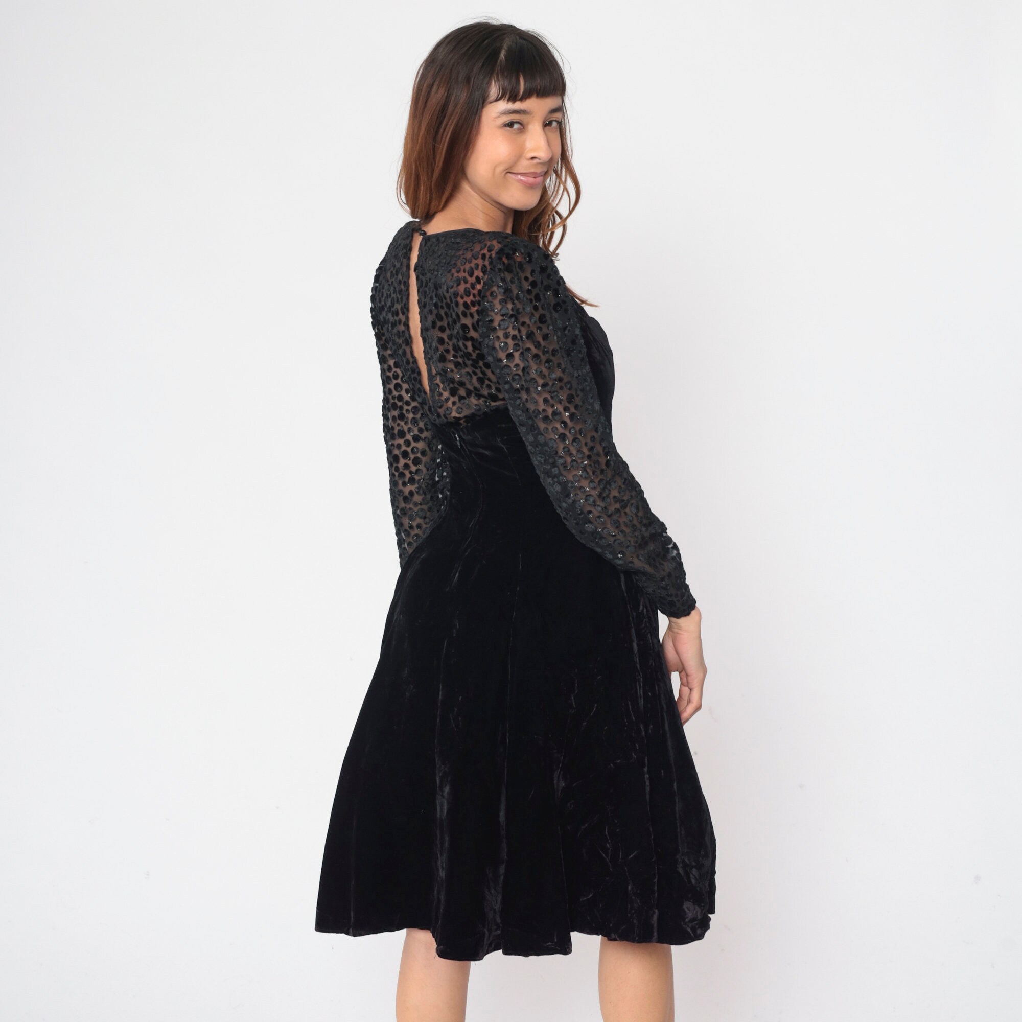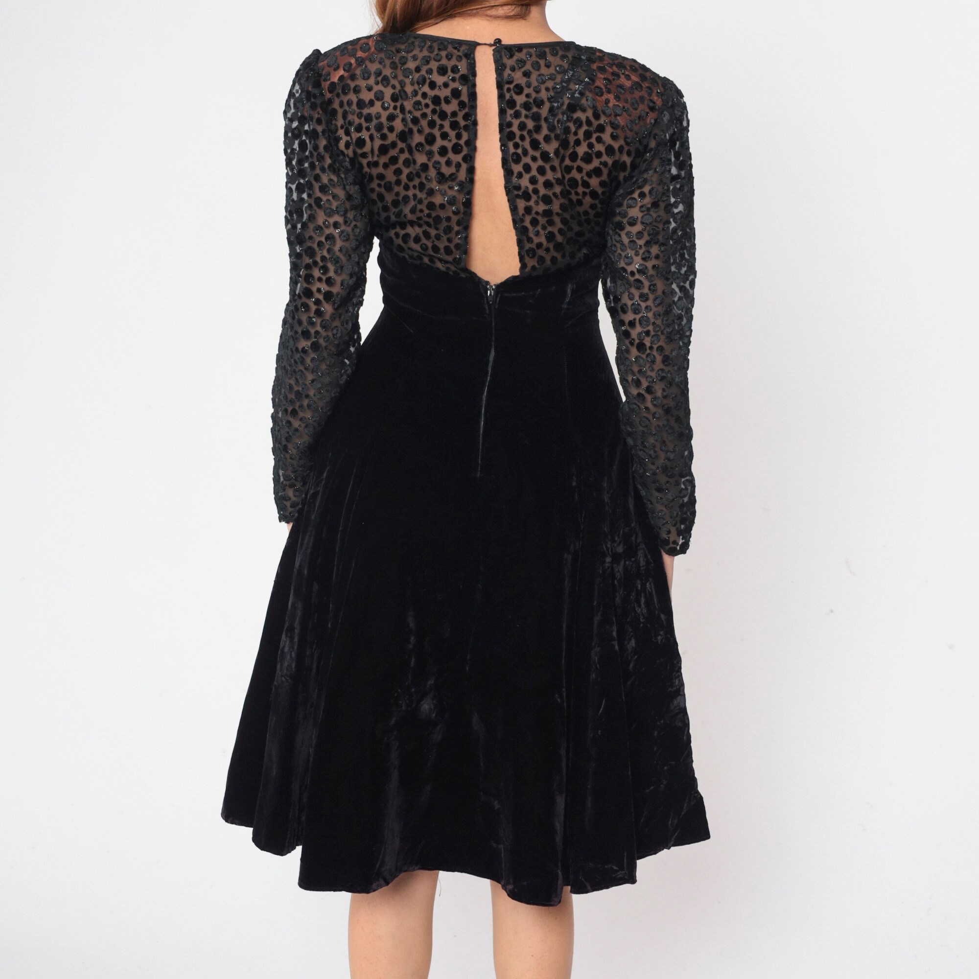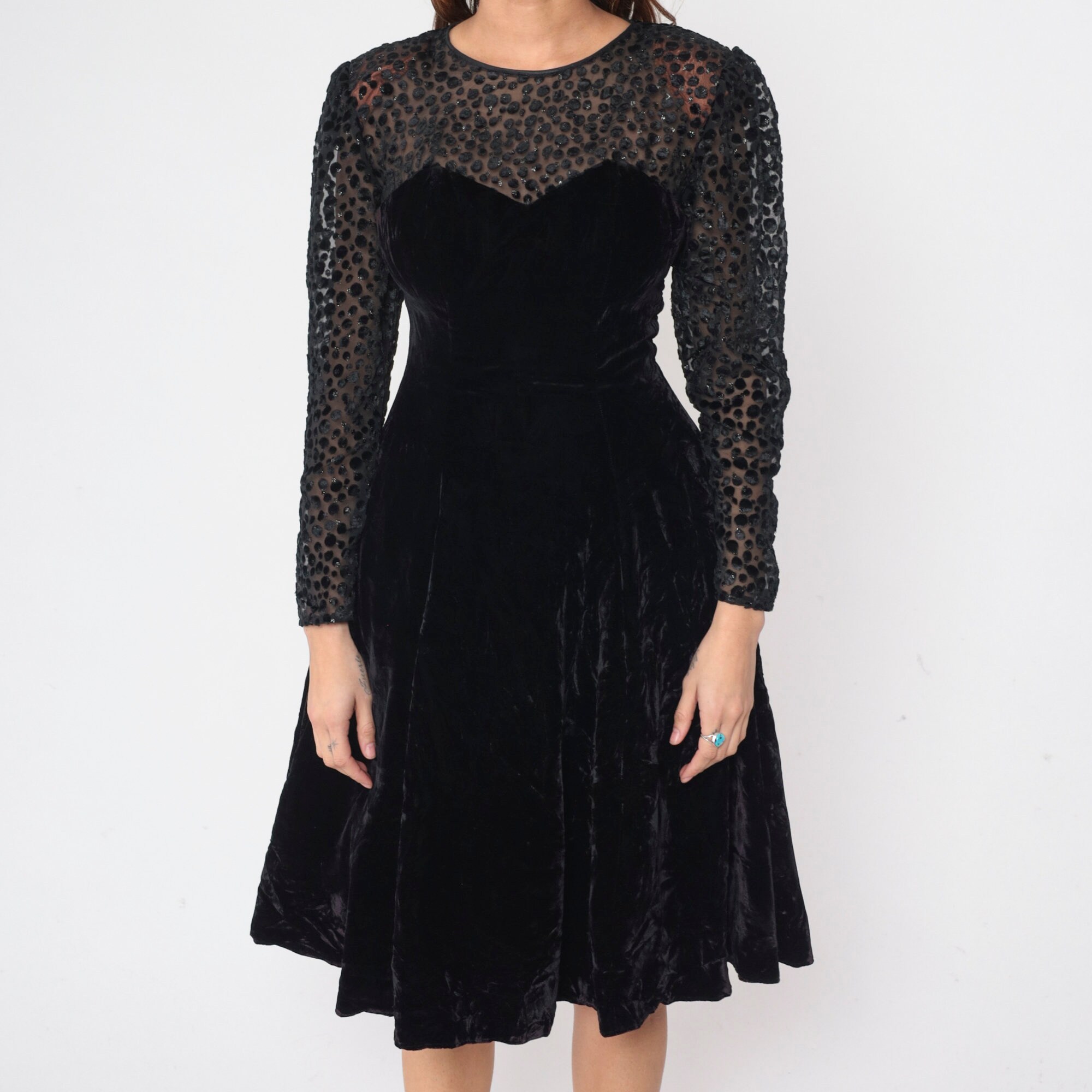 Vintage 80s dress in black velvet with a sheer illusion neckline with sparkly dots and a slit in the upper back. It has shoulder pads, a flared skirt, and a rear zipper.