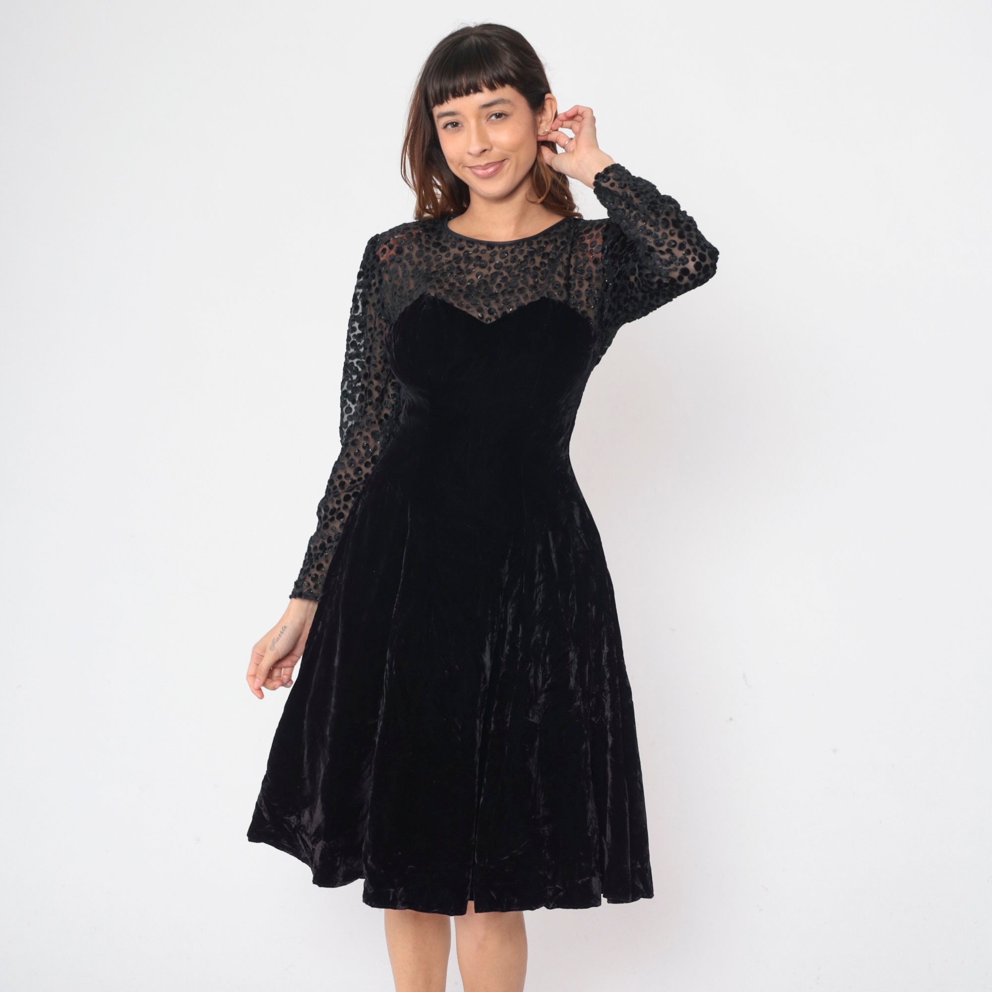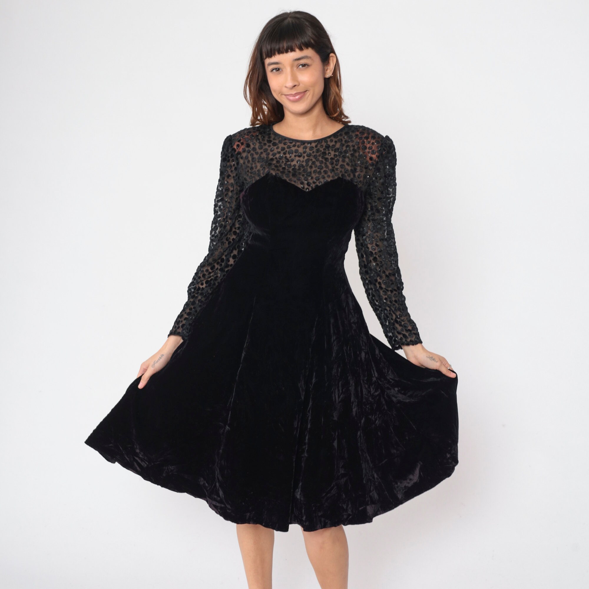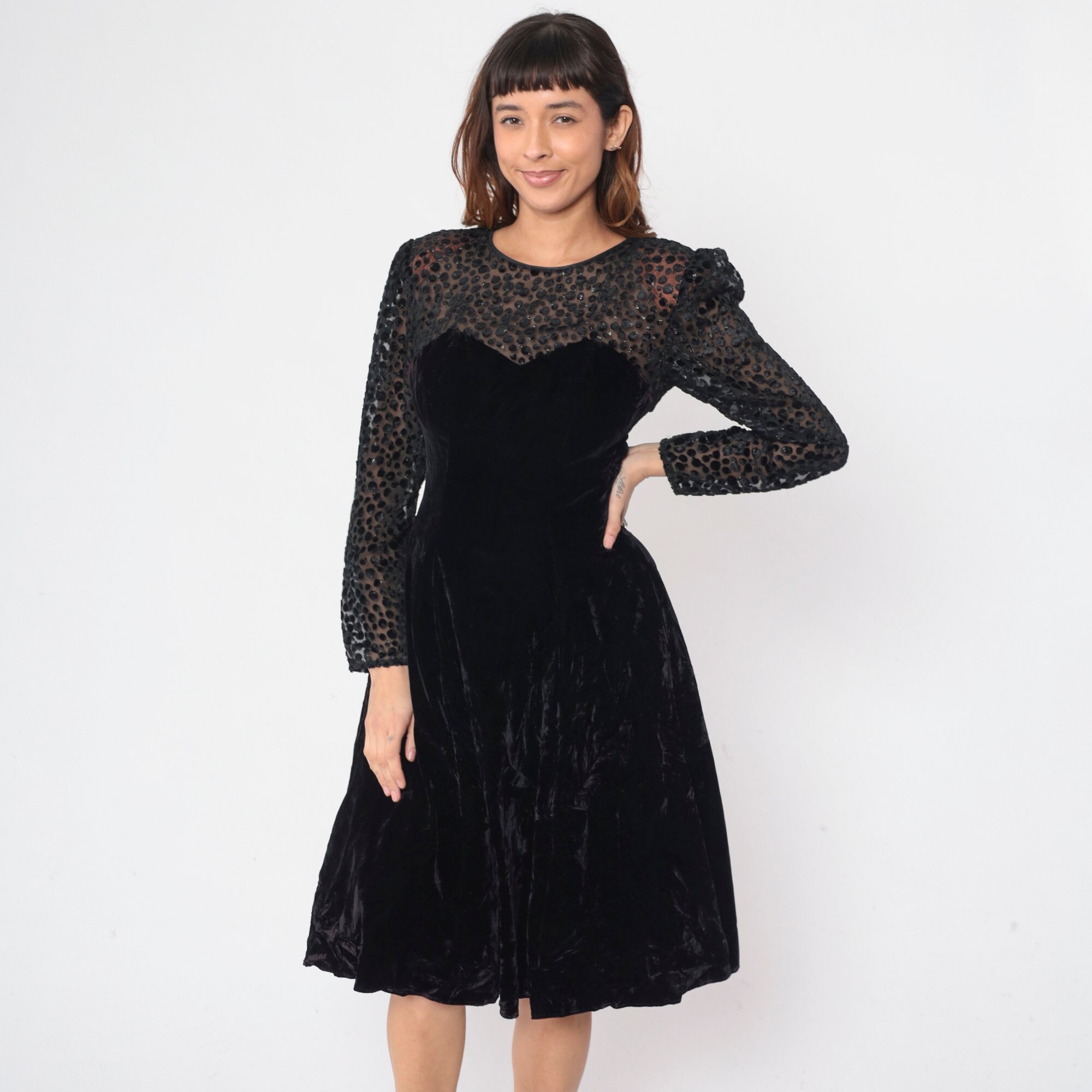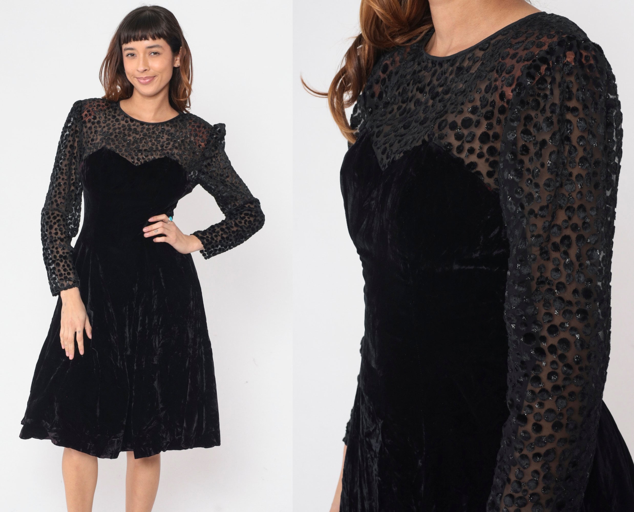 Vintage 80s dress in black velvet with a sheer illusion neckline with sparkly dots and a slit in the upper back. It has shoulder pads, a flared skirt, and a rear zipper.