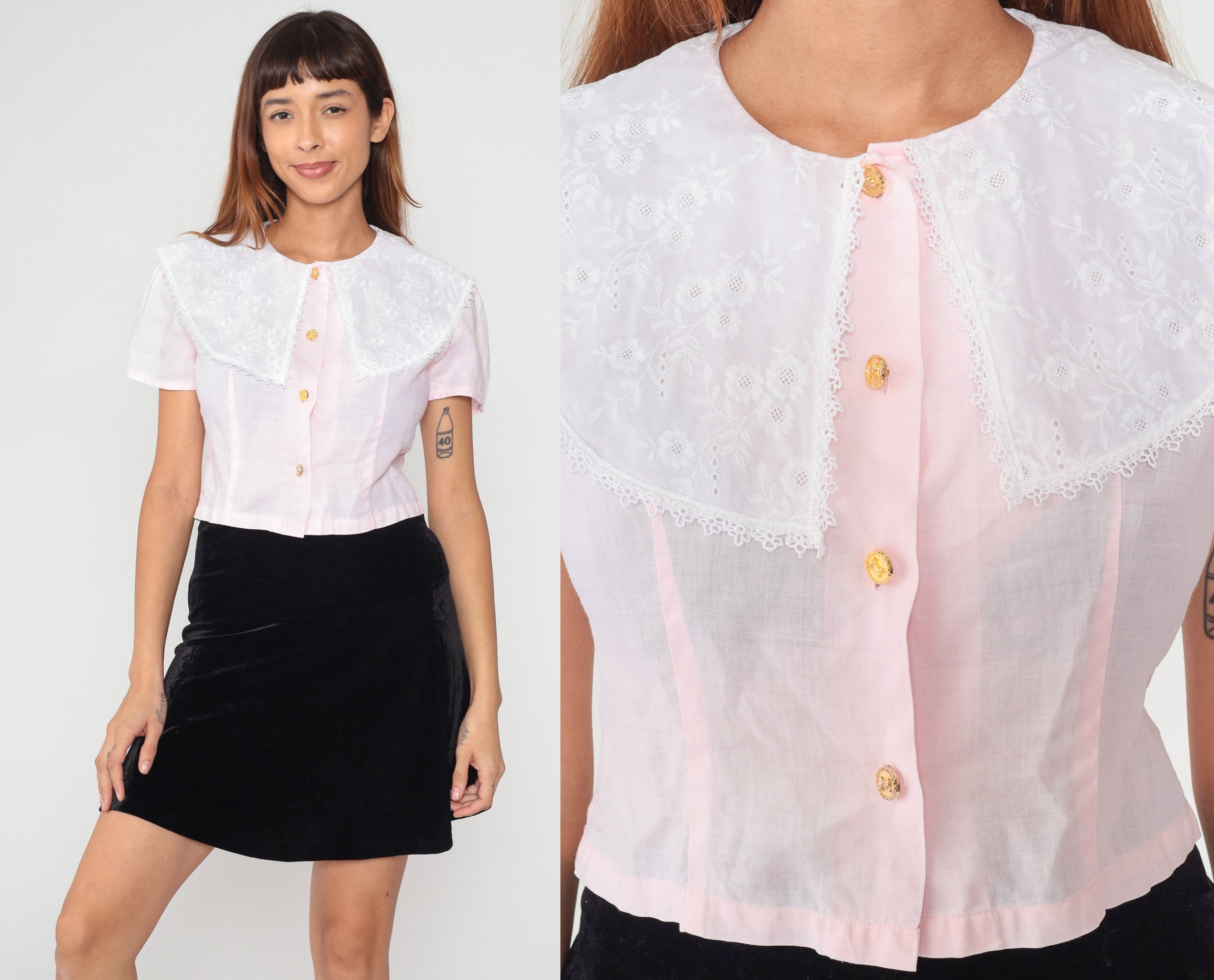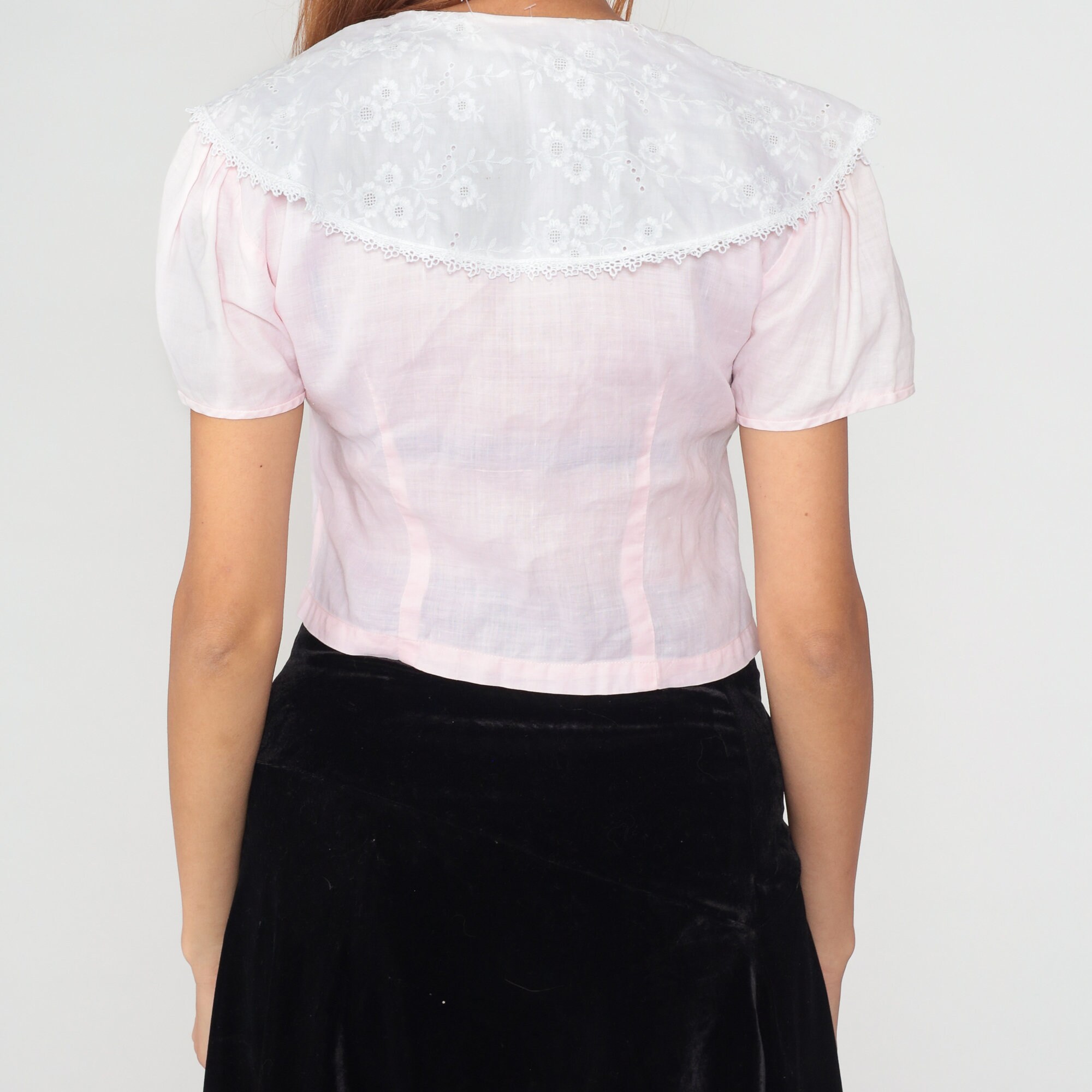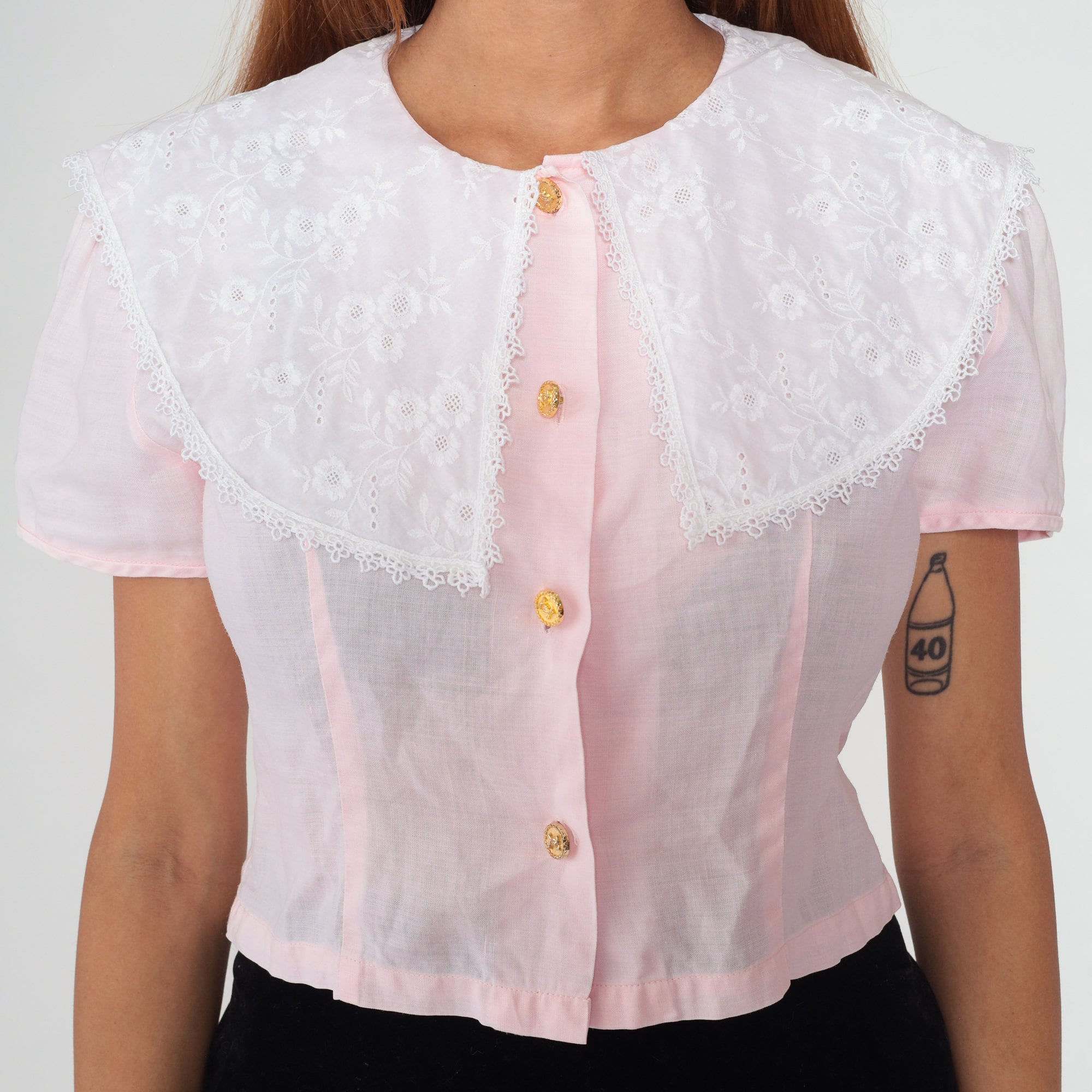 Vintage 80s blouse in Semi-Sheer baby pink with a white floral lace bertha collar. Buttons up the front with short puff sleeves and a cropped fit.