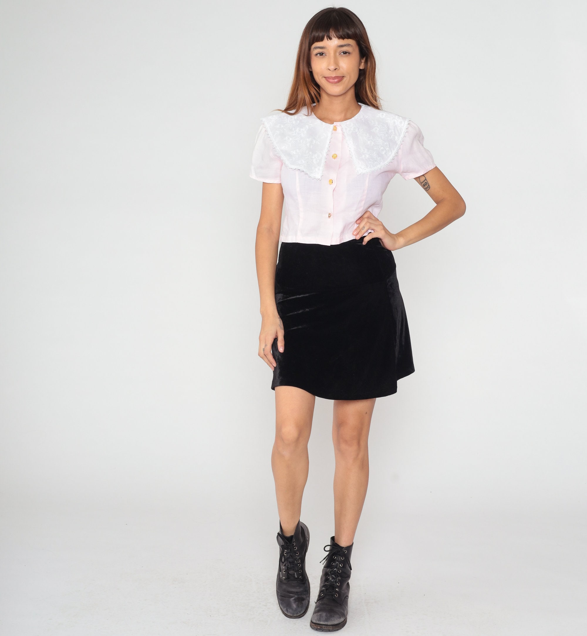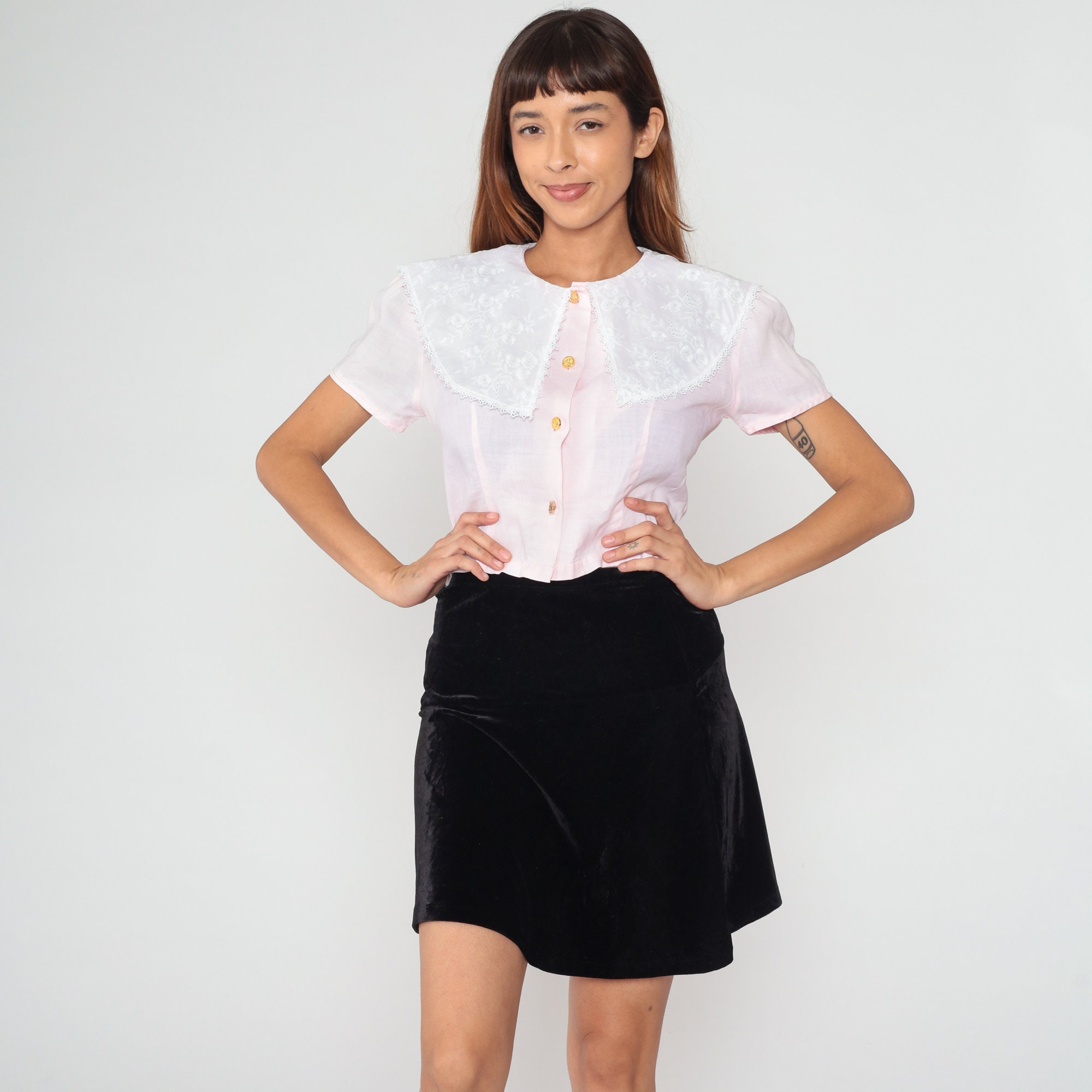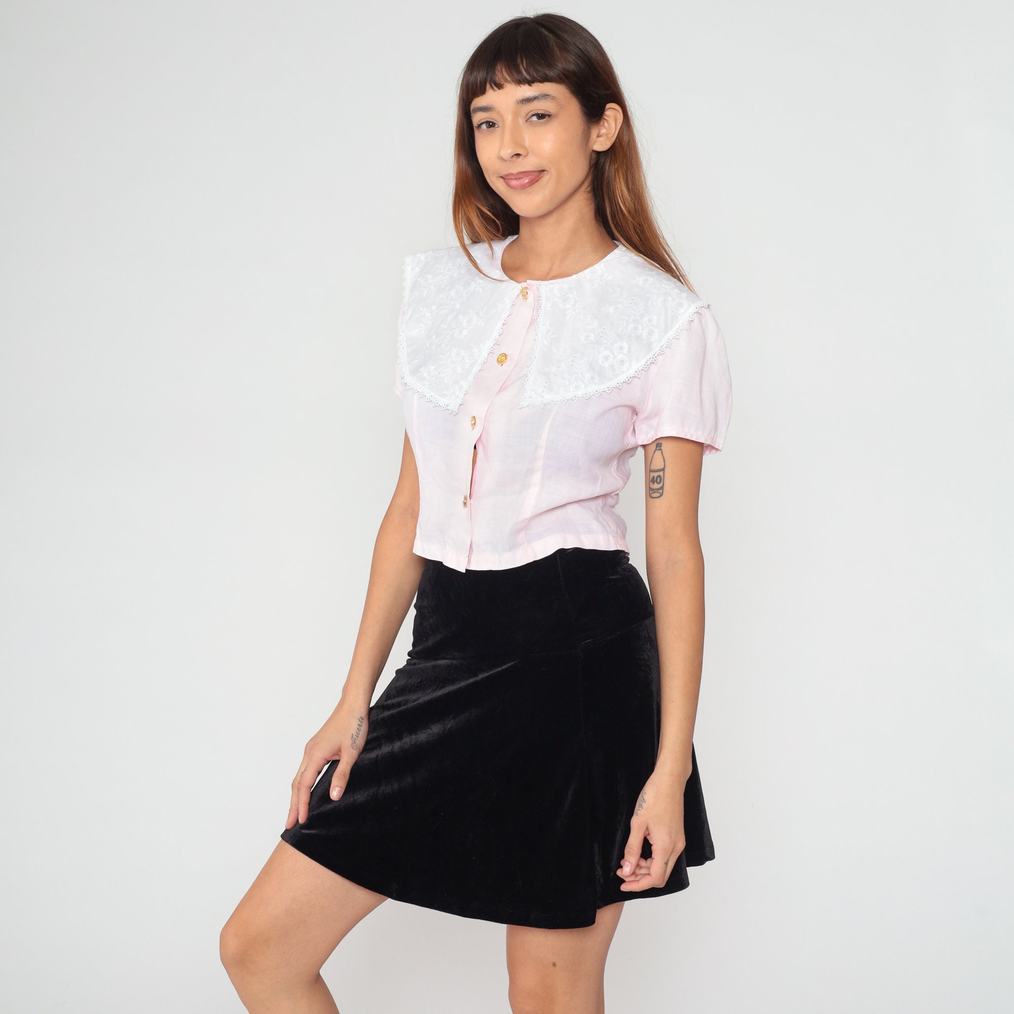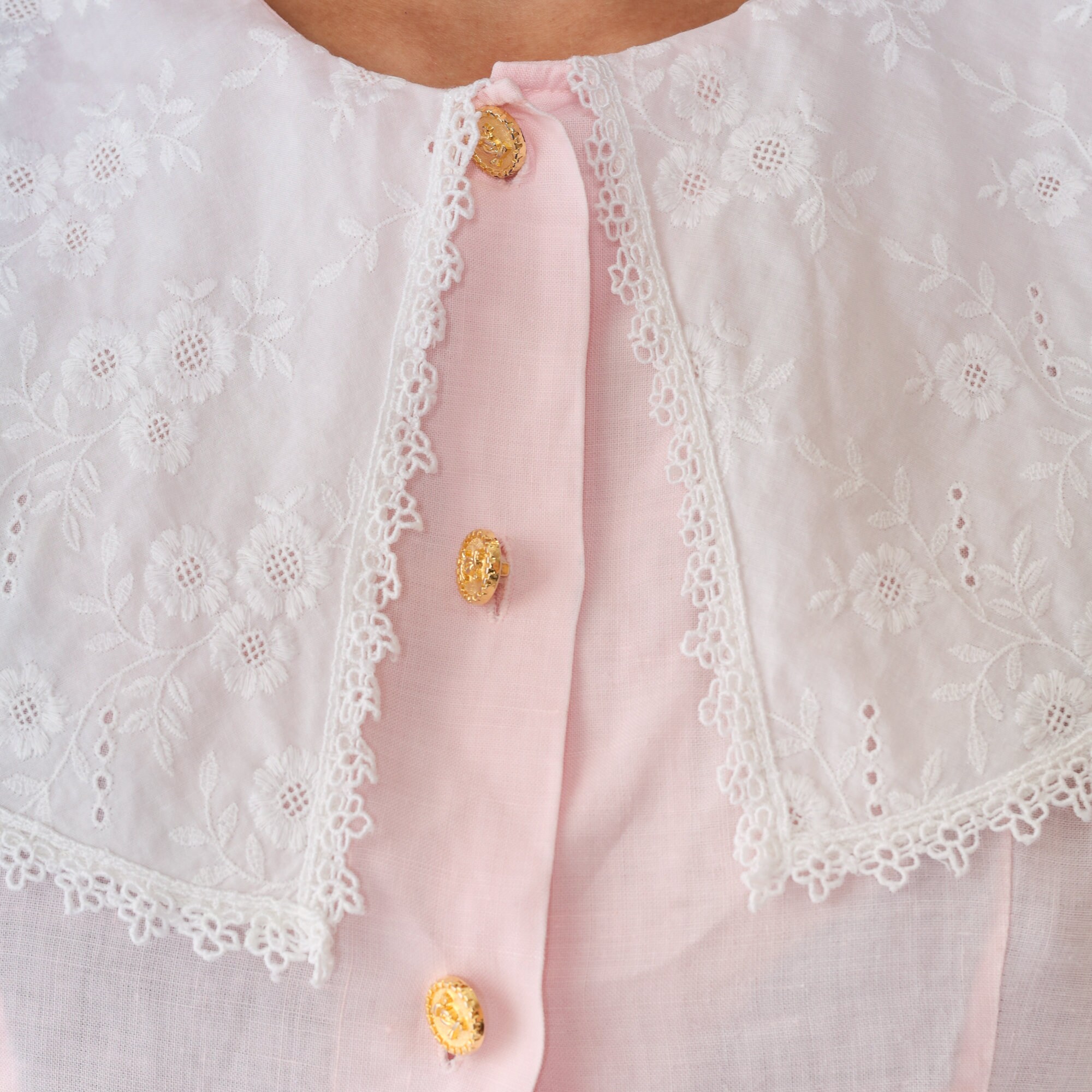 Vintage 80s blouse in Semi-Sheer baby pink with a white floral lace bertha collar. Buttons up the front with short puff sleeves and a cropped fit.