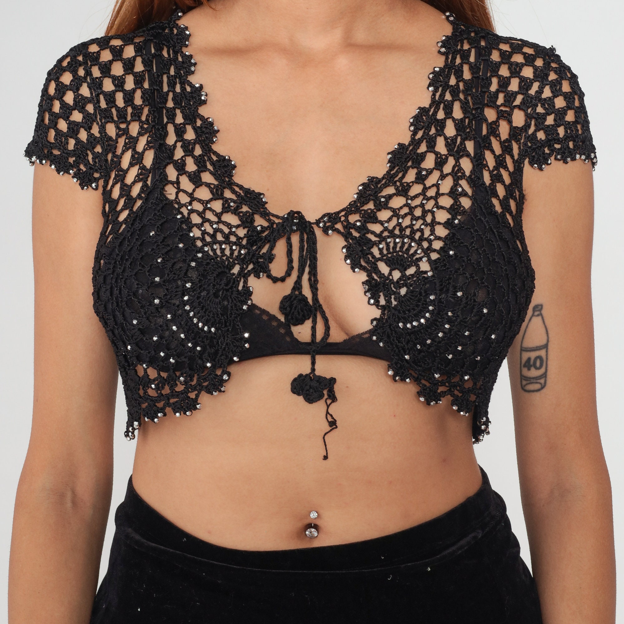 Vintage 90s blouse in sheer black crochet knit with rhinestone beading. Short sleeves and an open front with a single tie. Cropped fit.