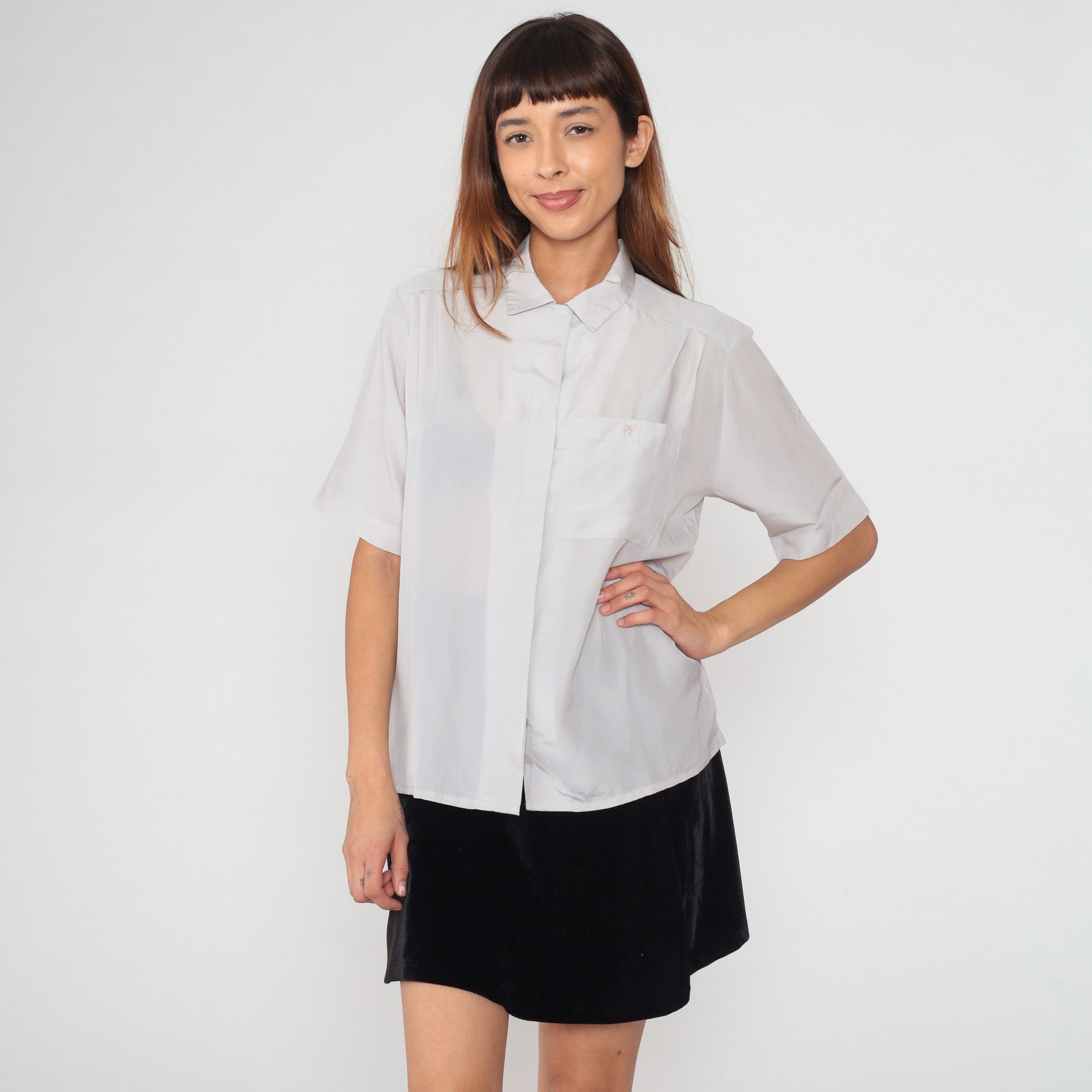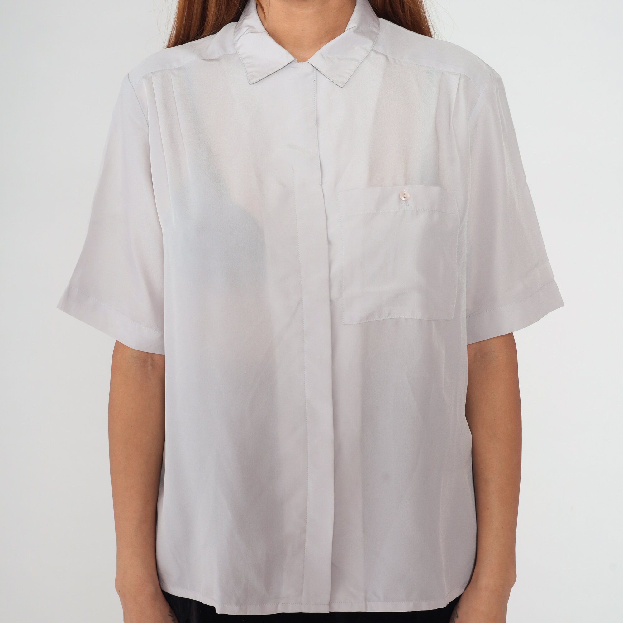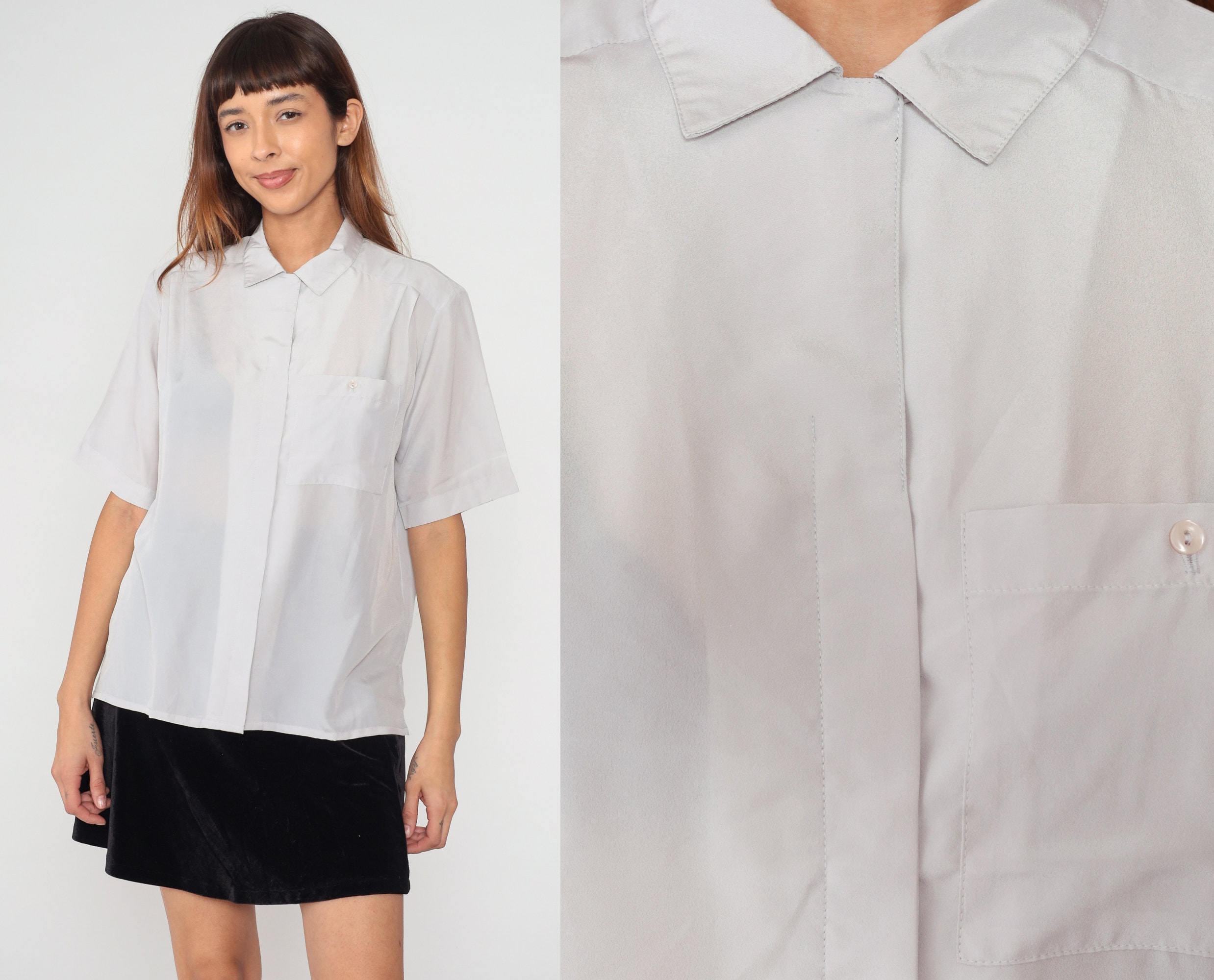 Vintage 80s shirt in semi-sheer pale grey with short sleeves, a collar, and hidden button placket up the front.