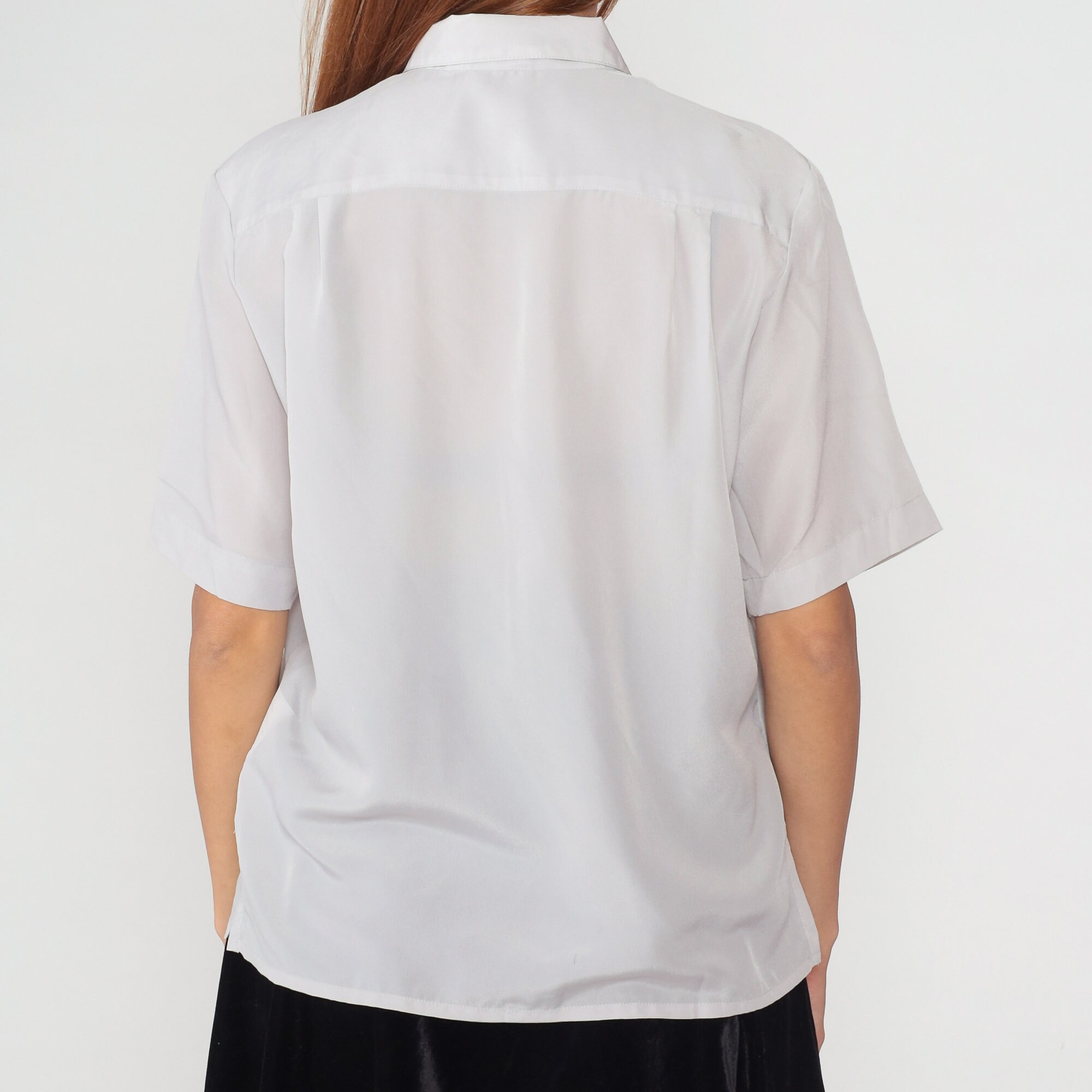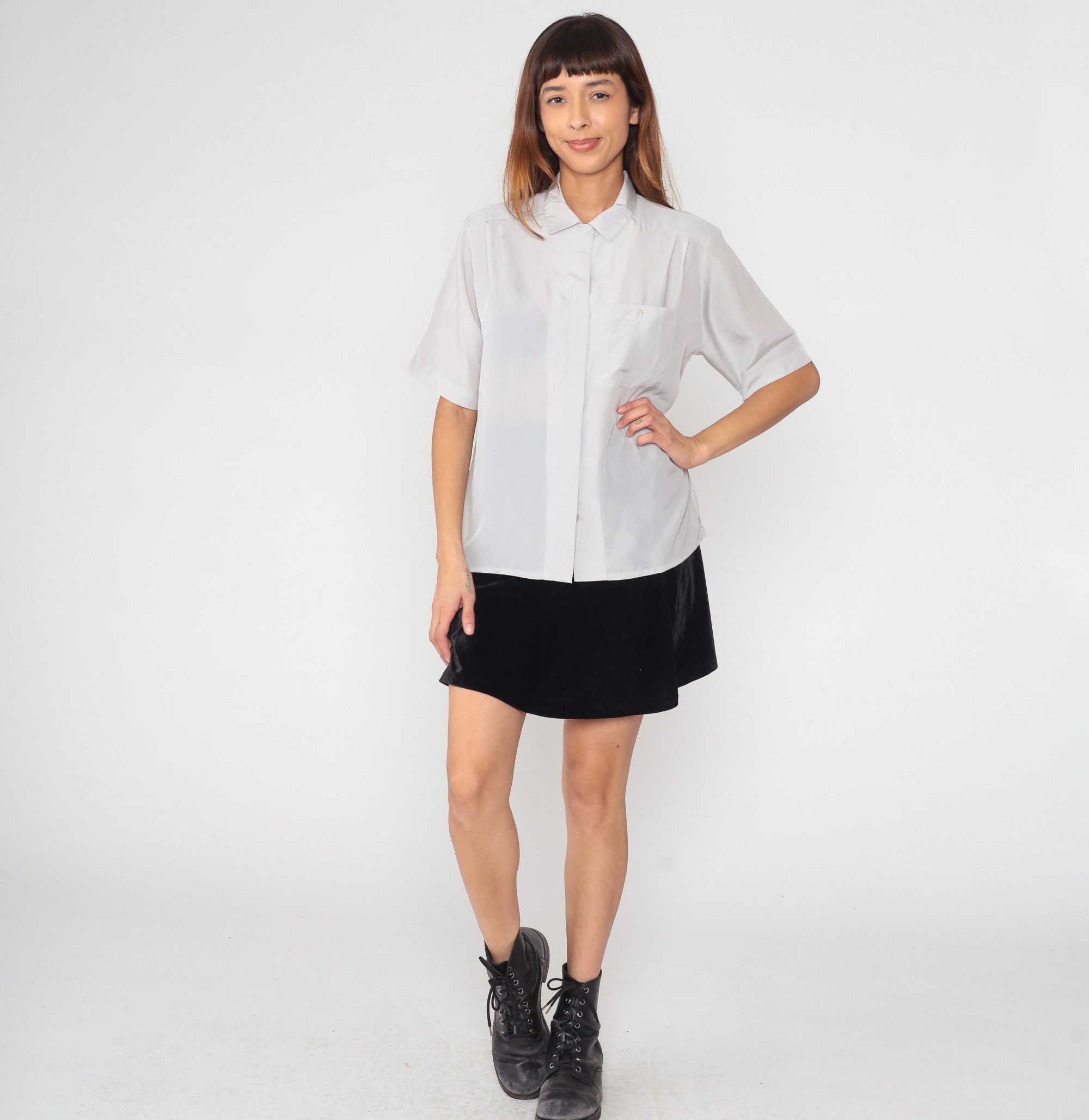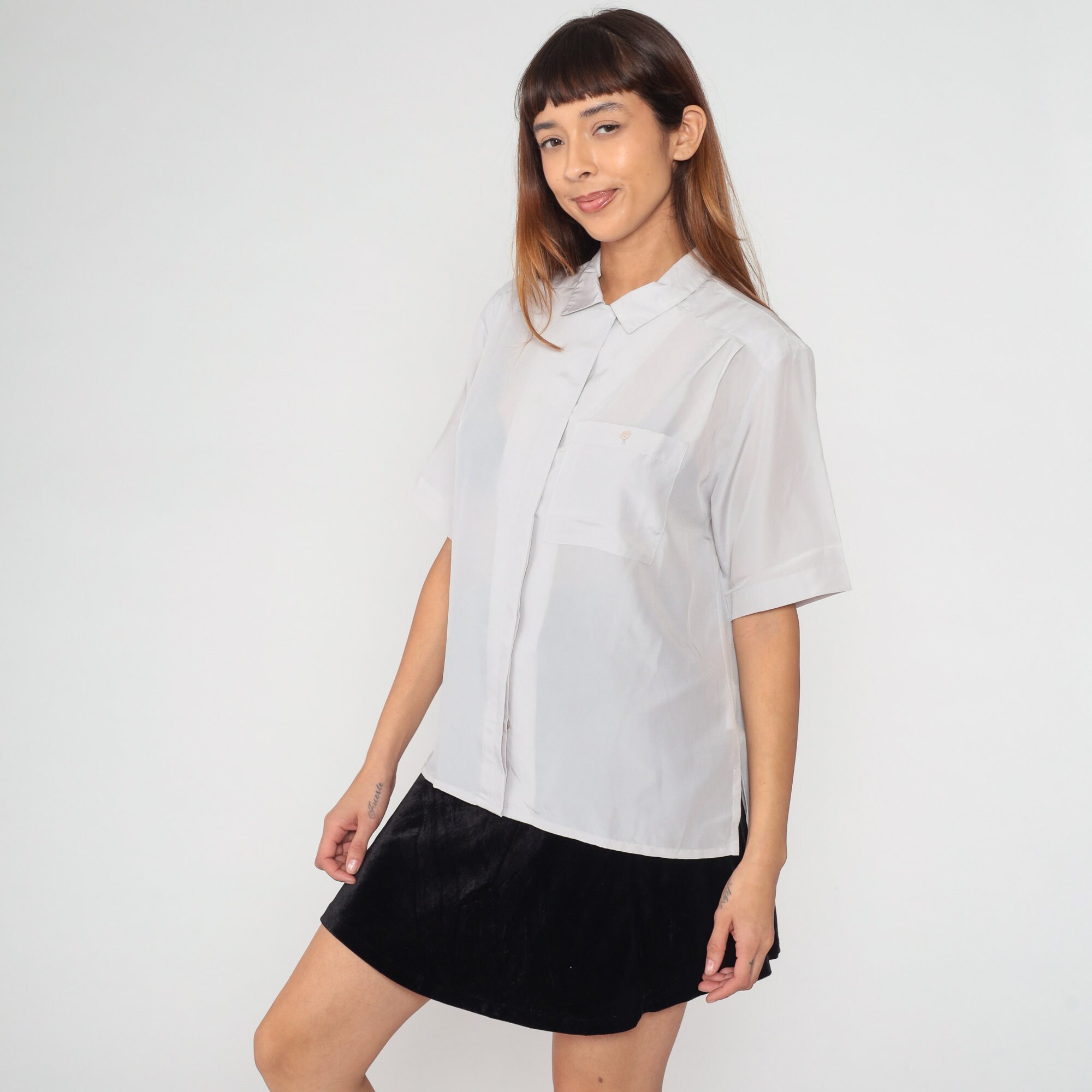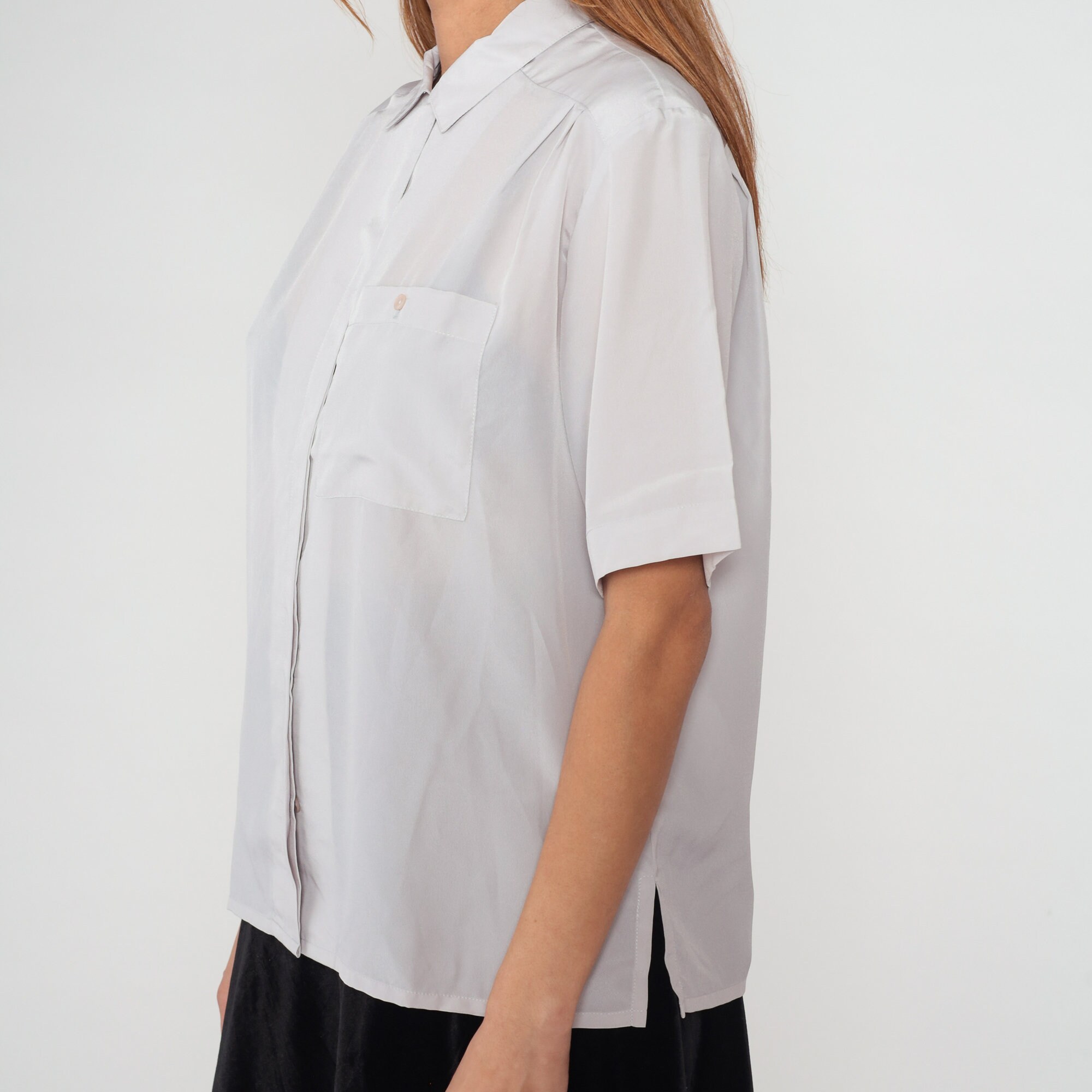 Vintage 80s shirt in semi-sheer pale grey with short sleeves, a collar, and hidden button placket up the front.