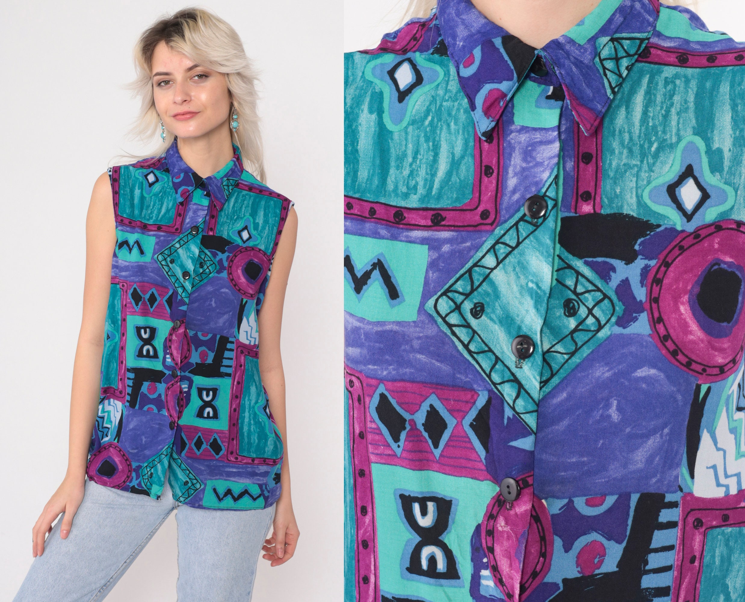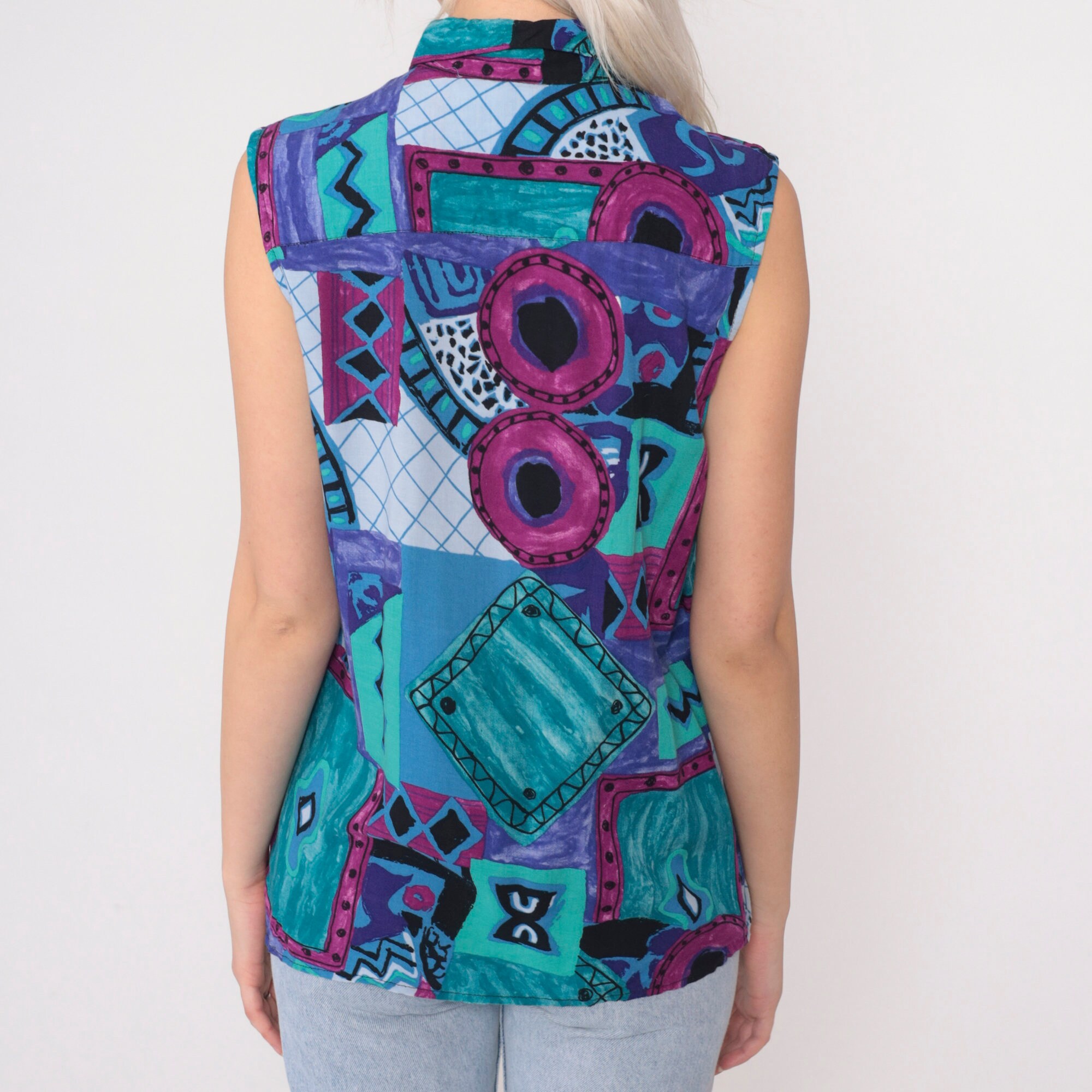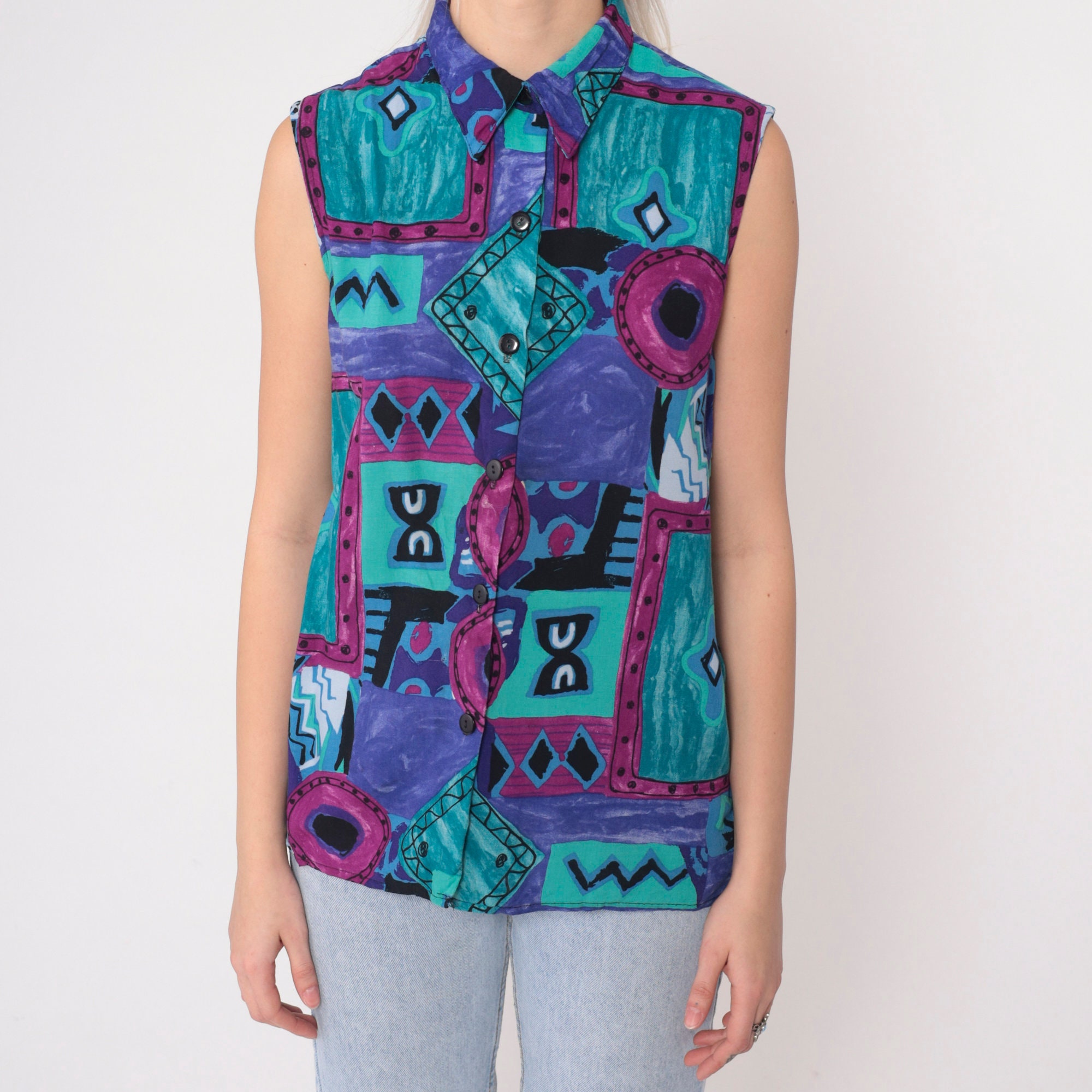 Vintage 90s tank top in a patchwork geometric print. Sleeveless with buttons up the front.