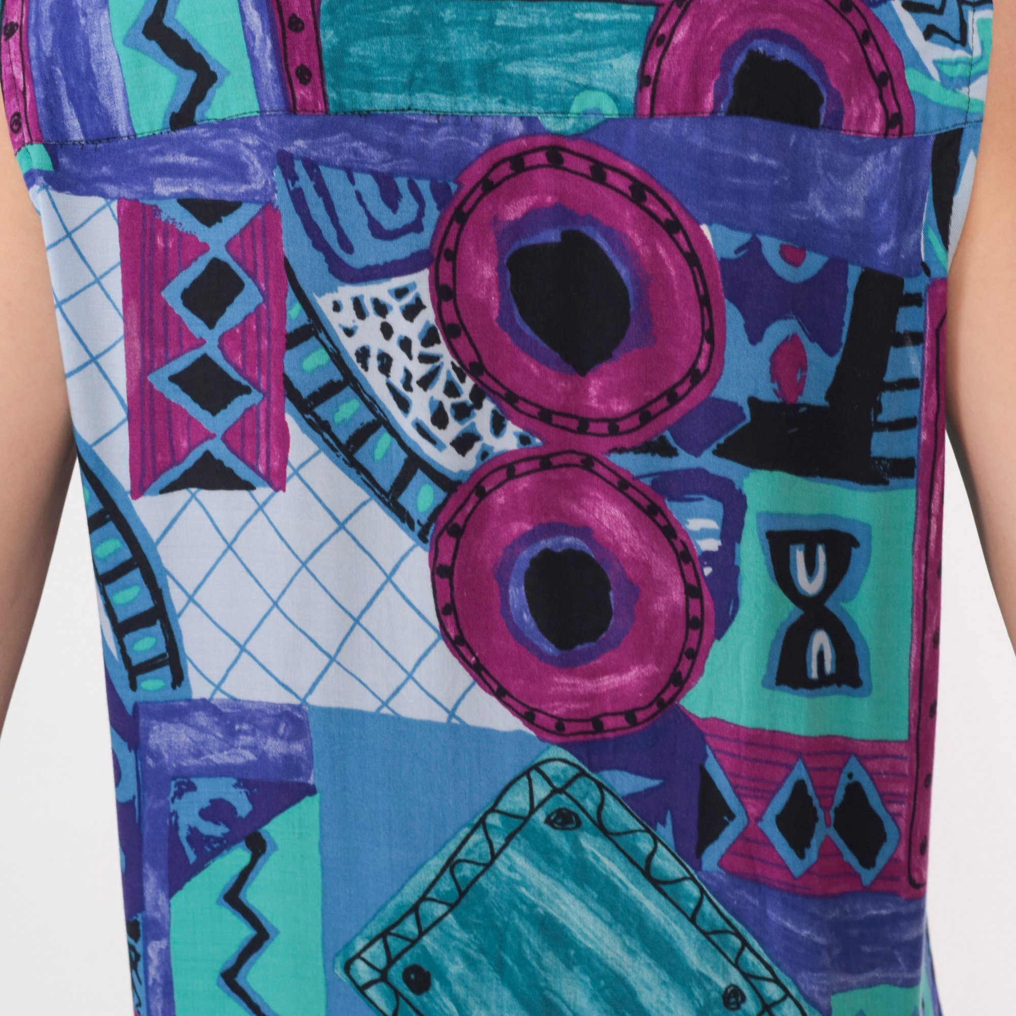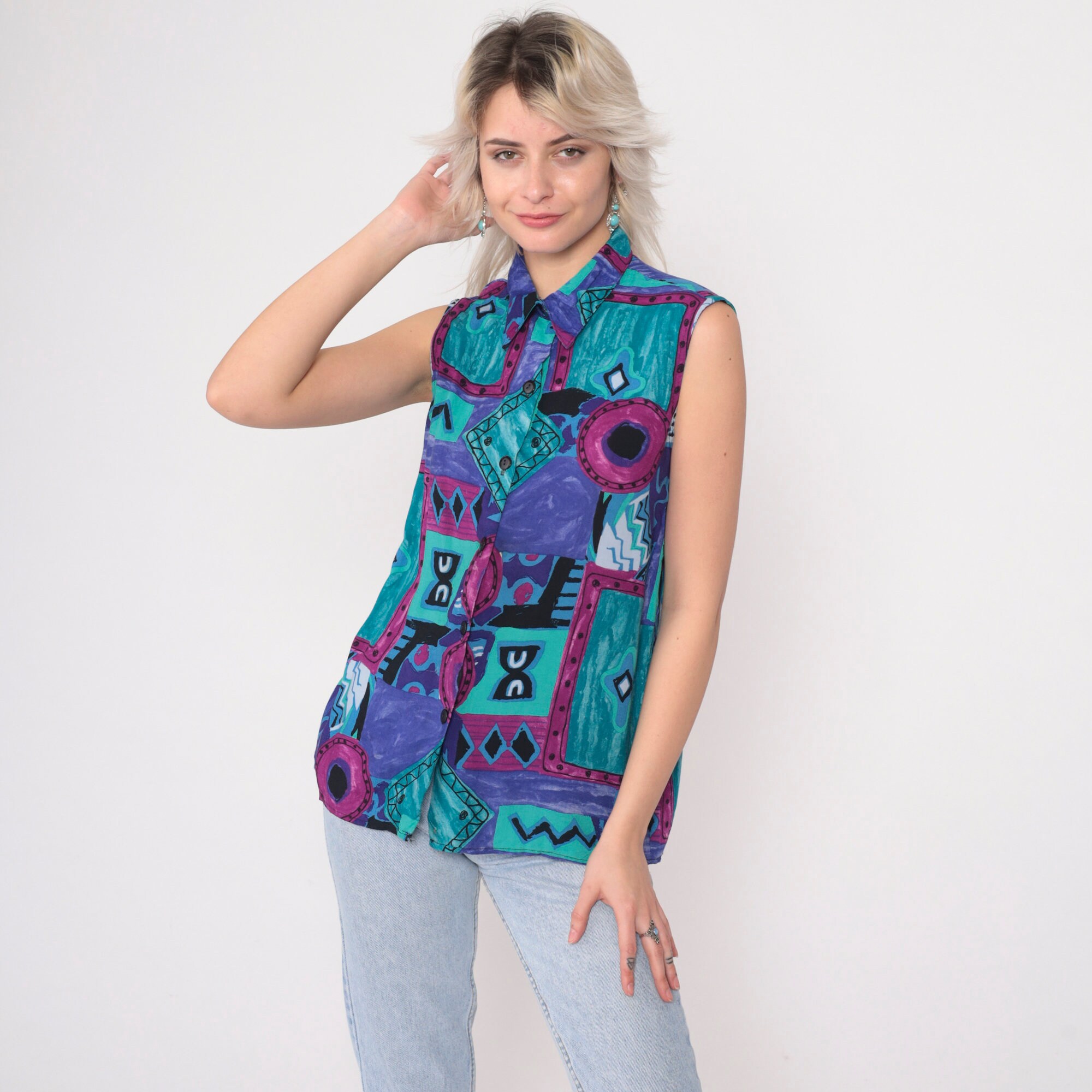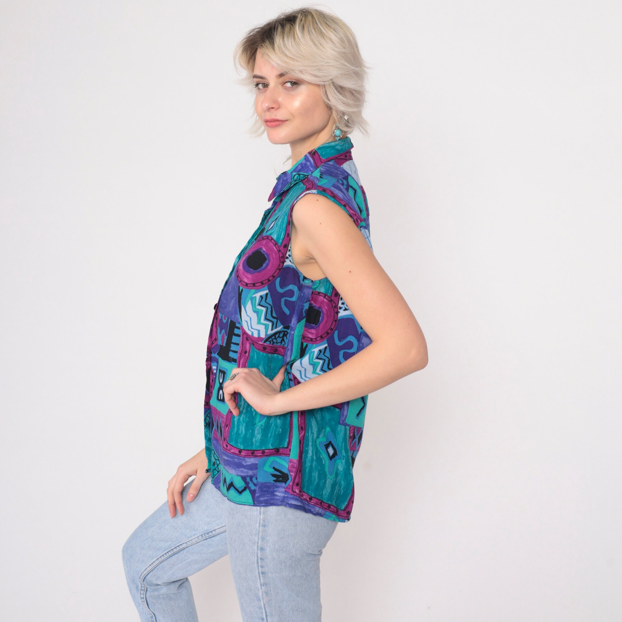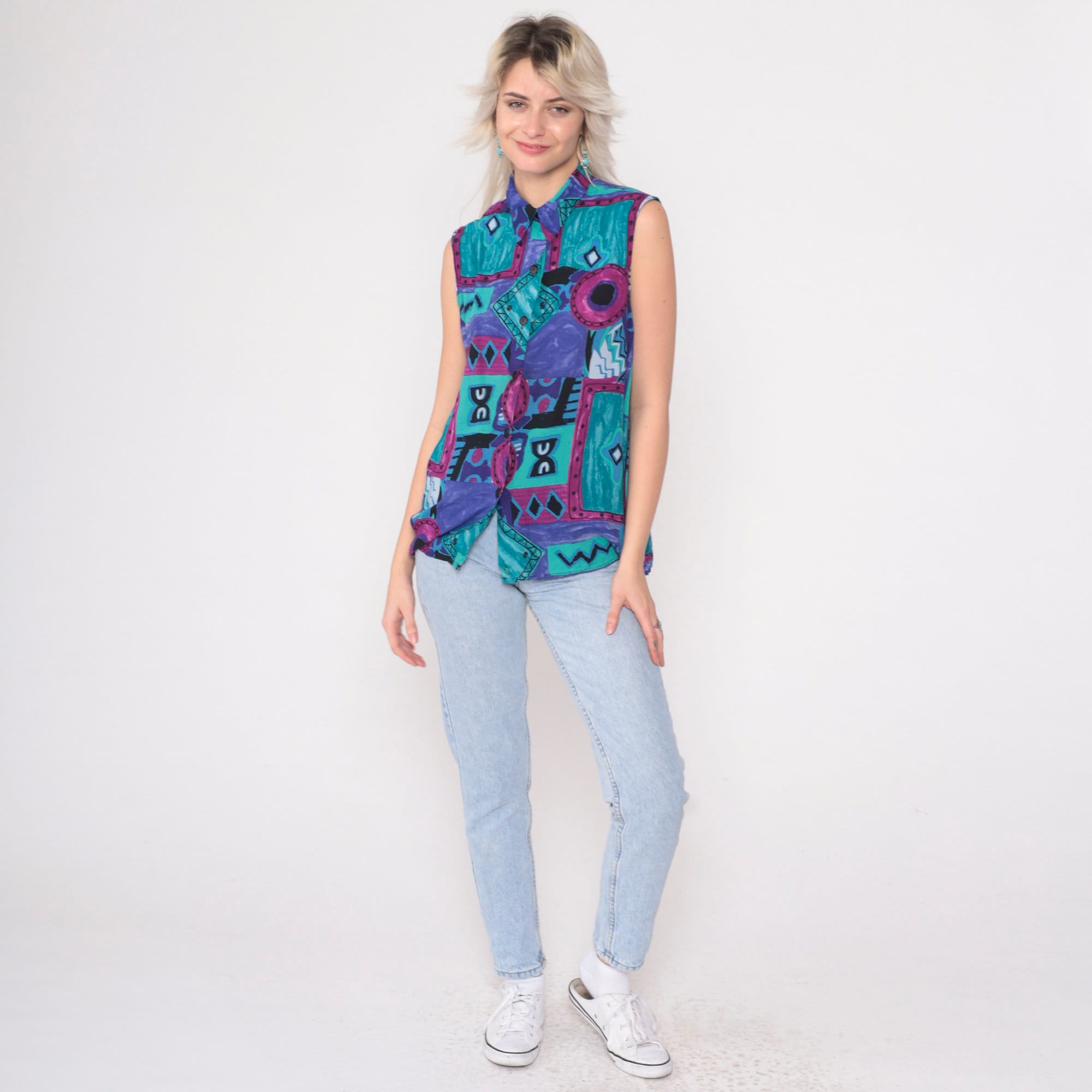 Vintage 90s tank top in a patchwork geometric print. Sleeveless with buttons up the front.