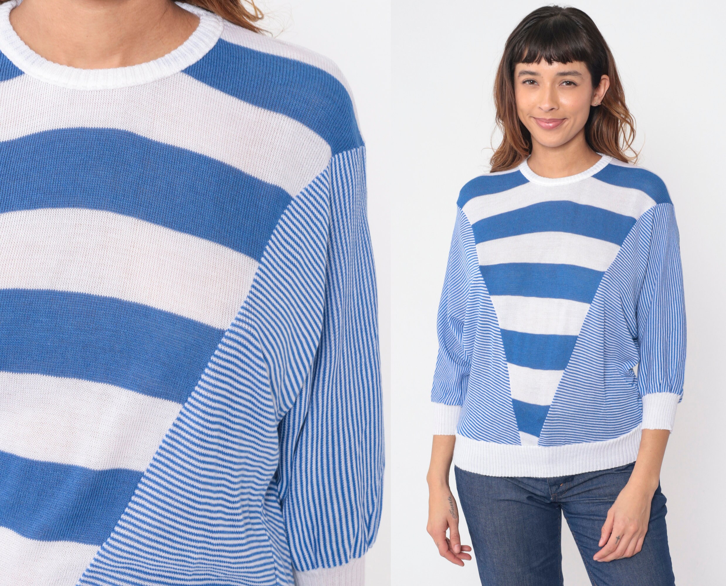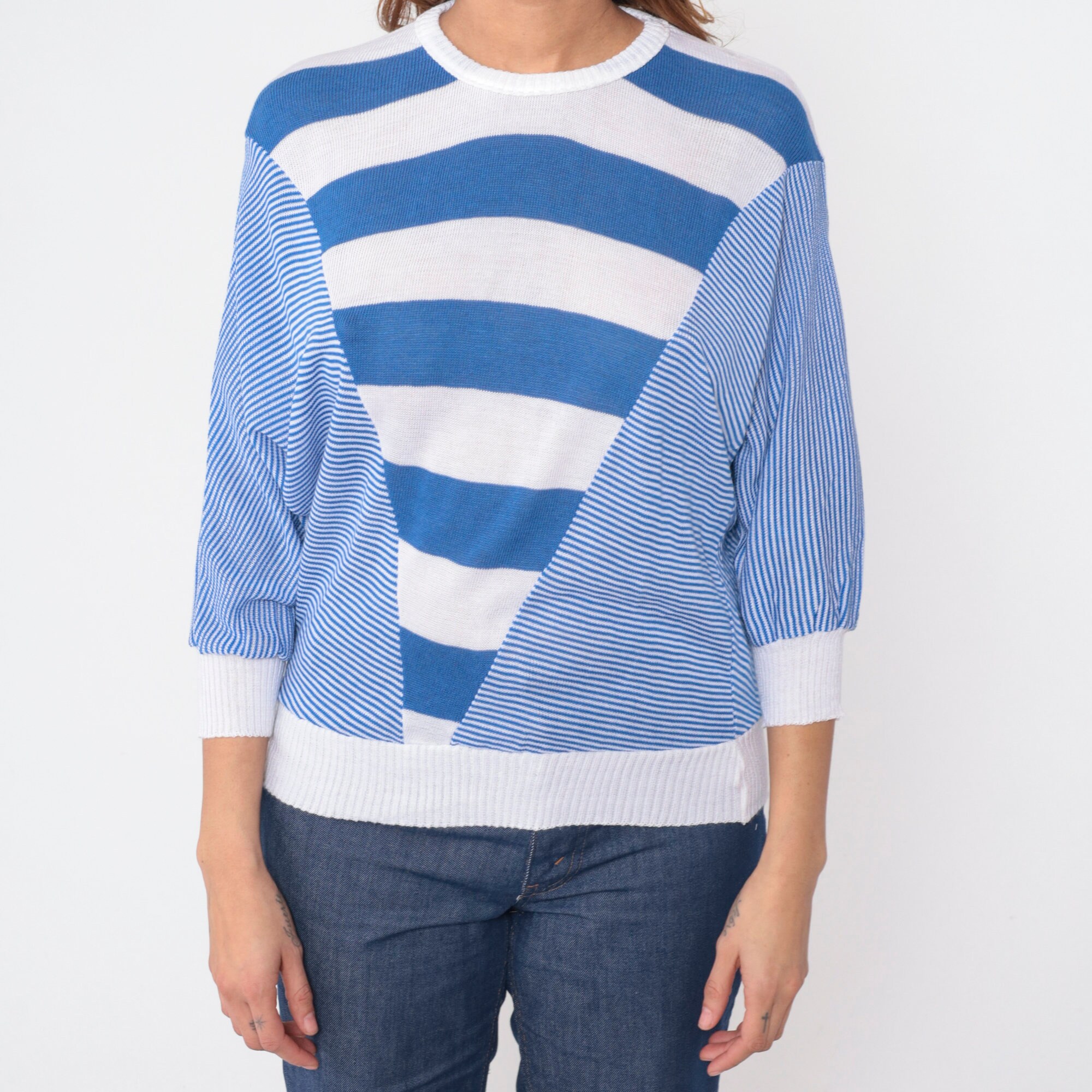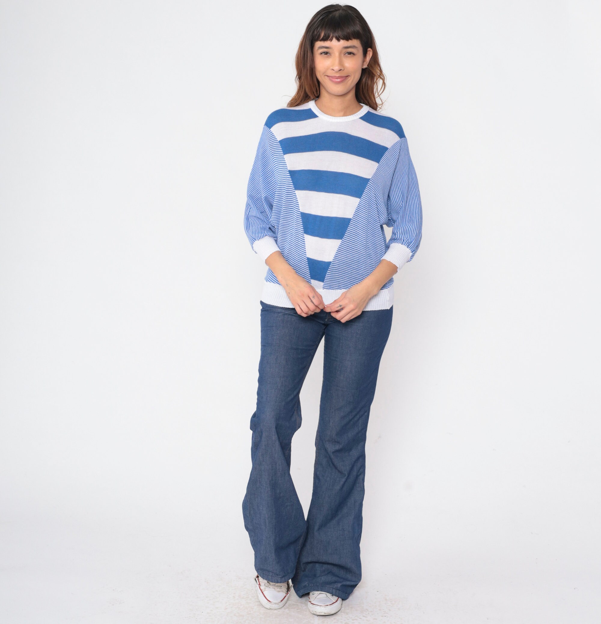 Vintage 80s sweater in white and blue stripes with 3/4 dolman sleeves.