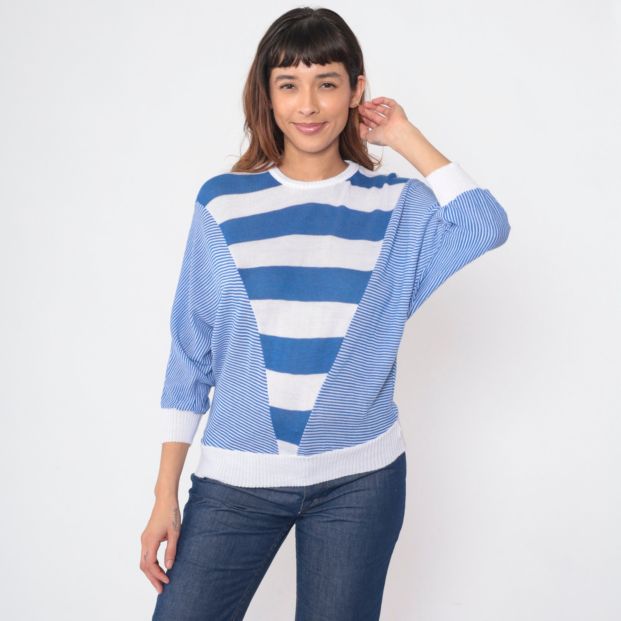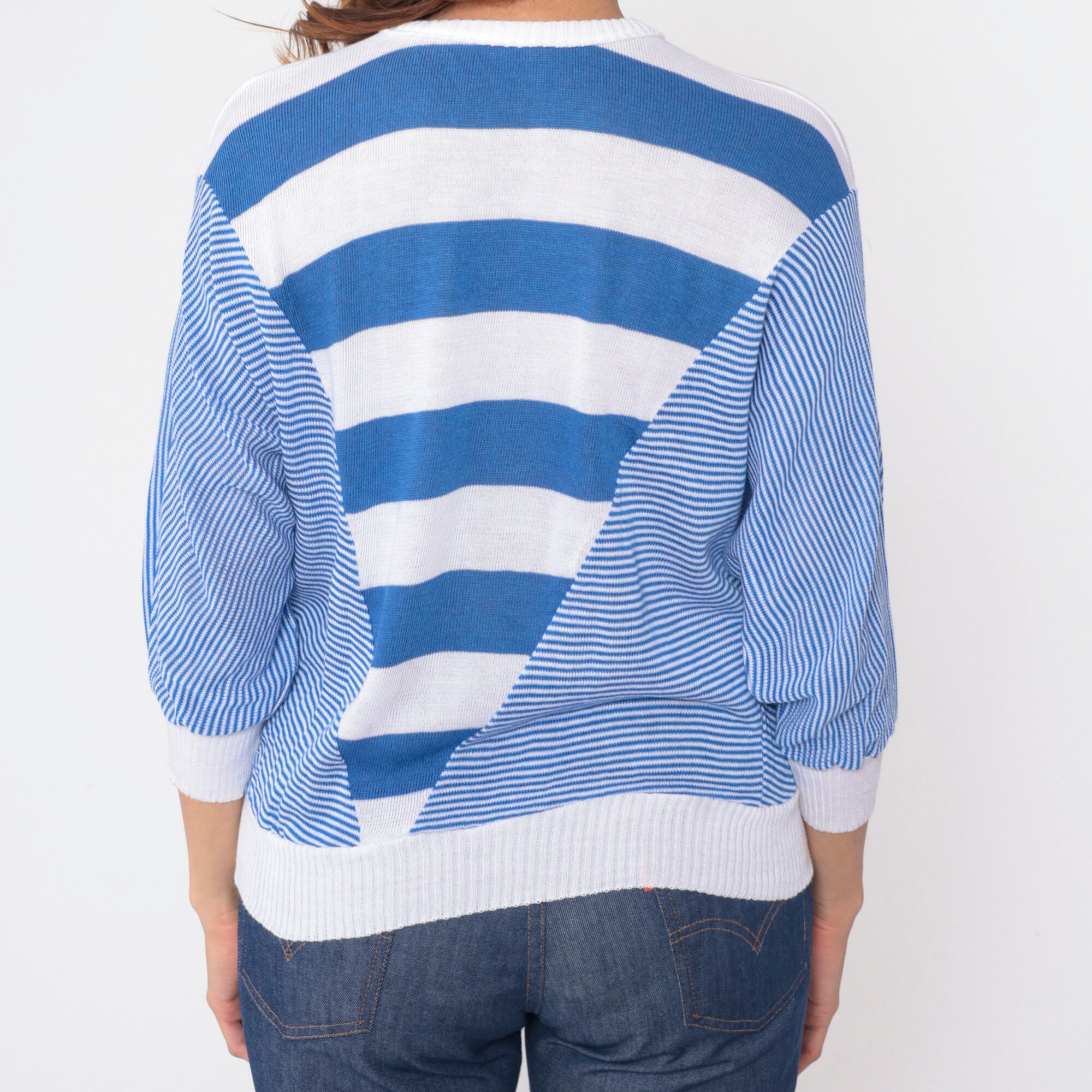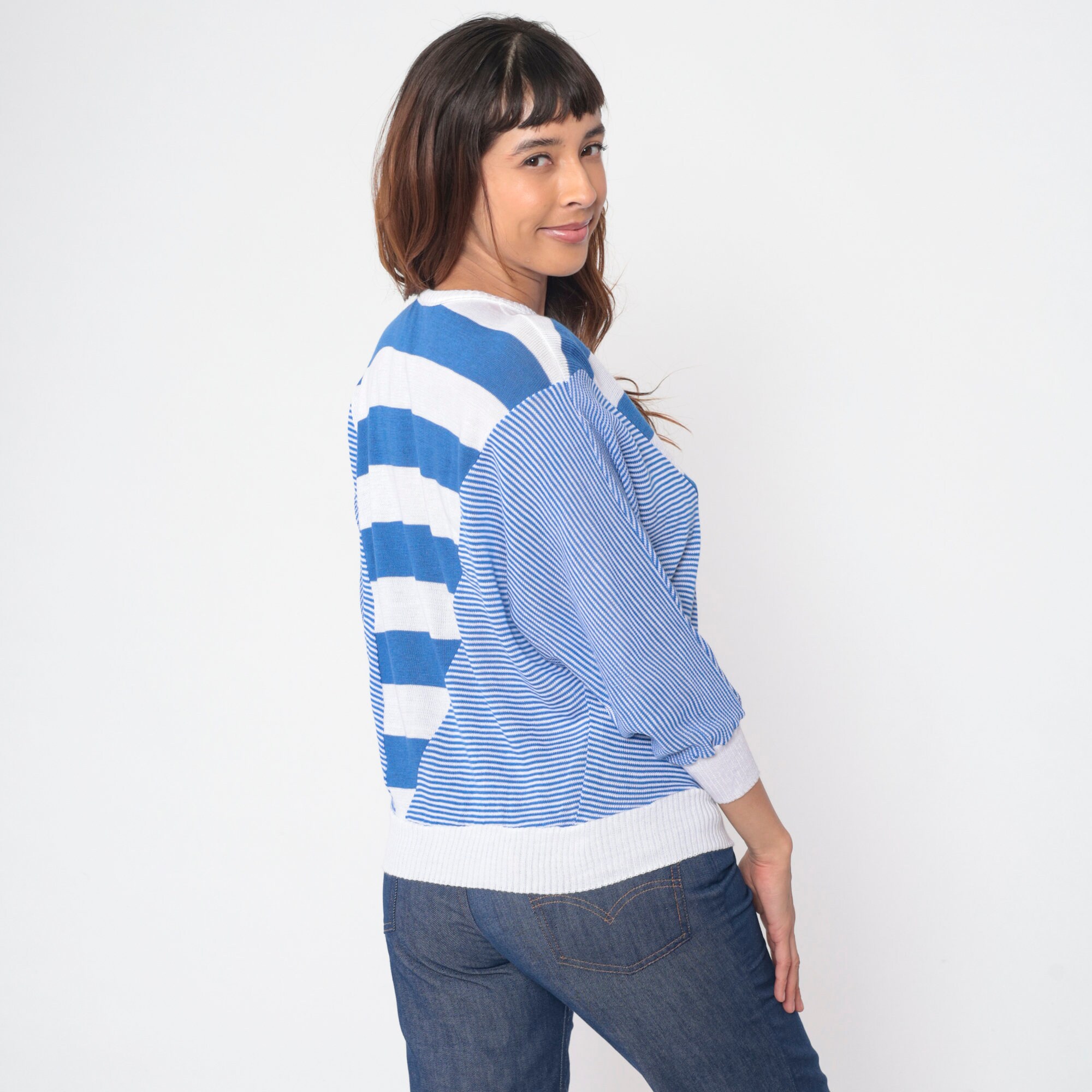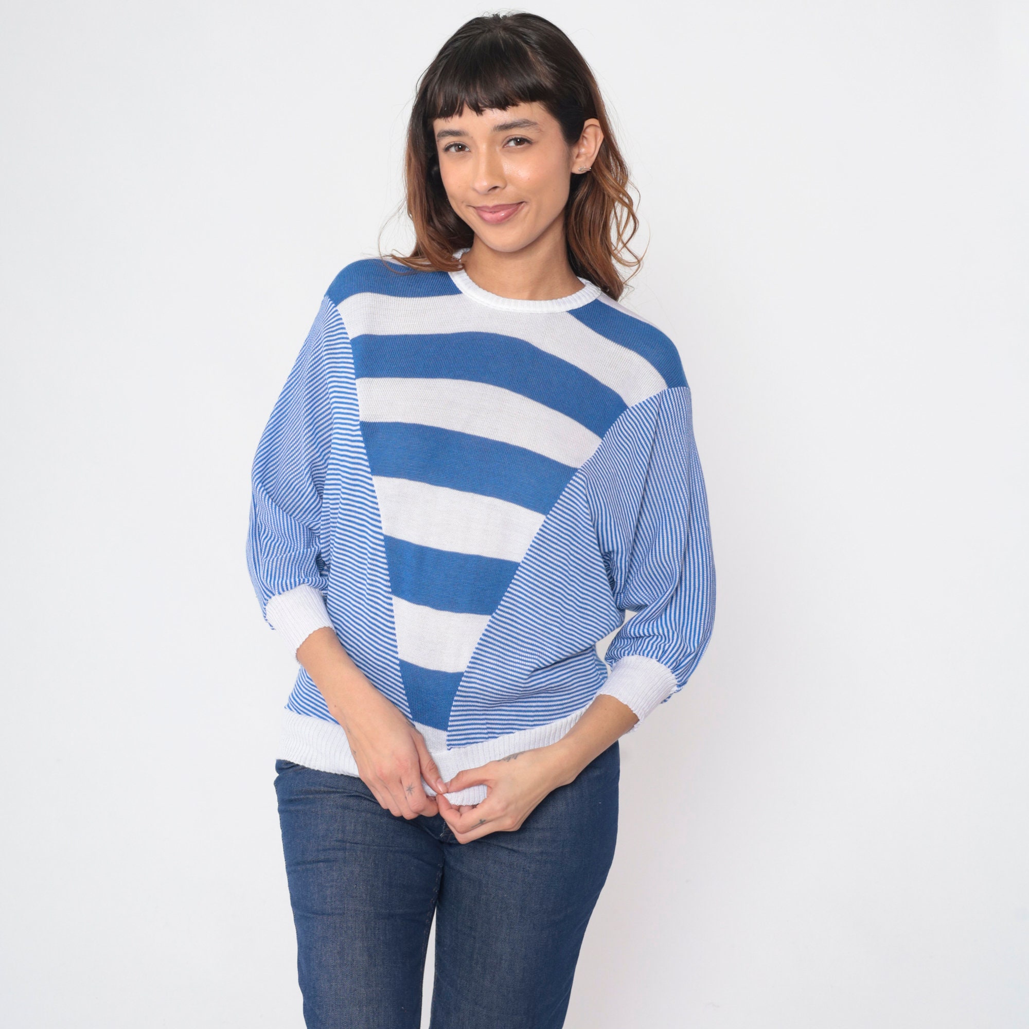 Vintage 80s sweater in white and blue stripes with 3/4 dolman sleeves.