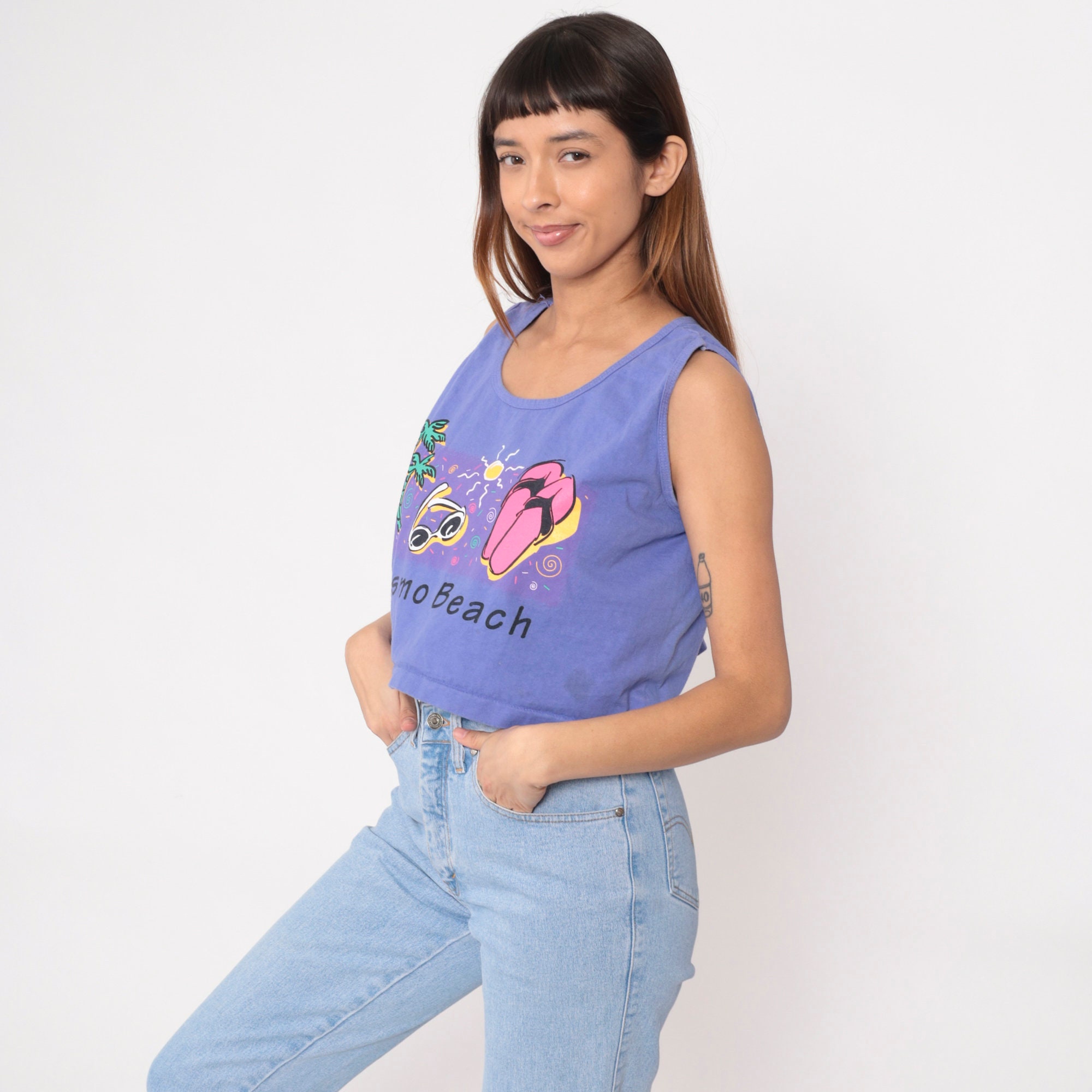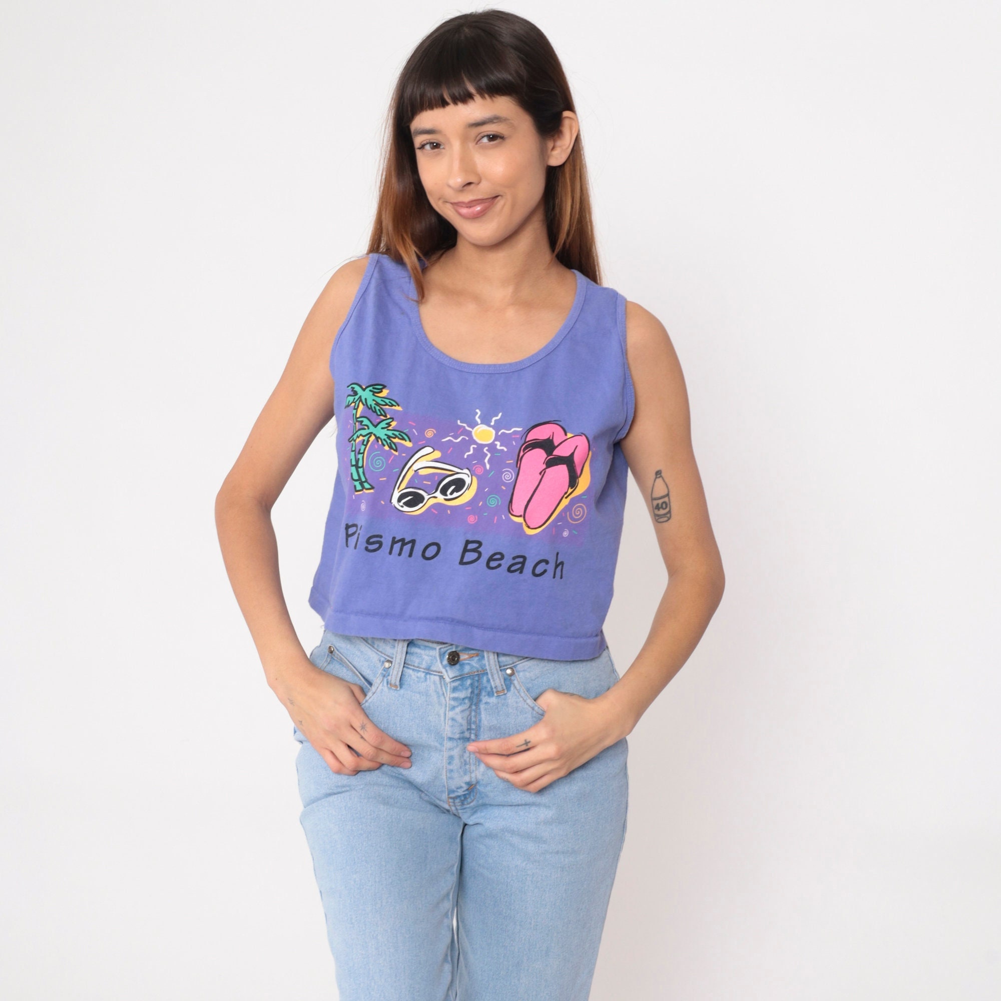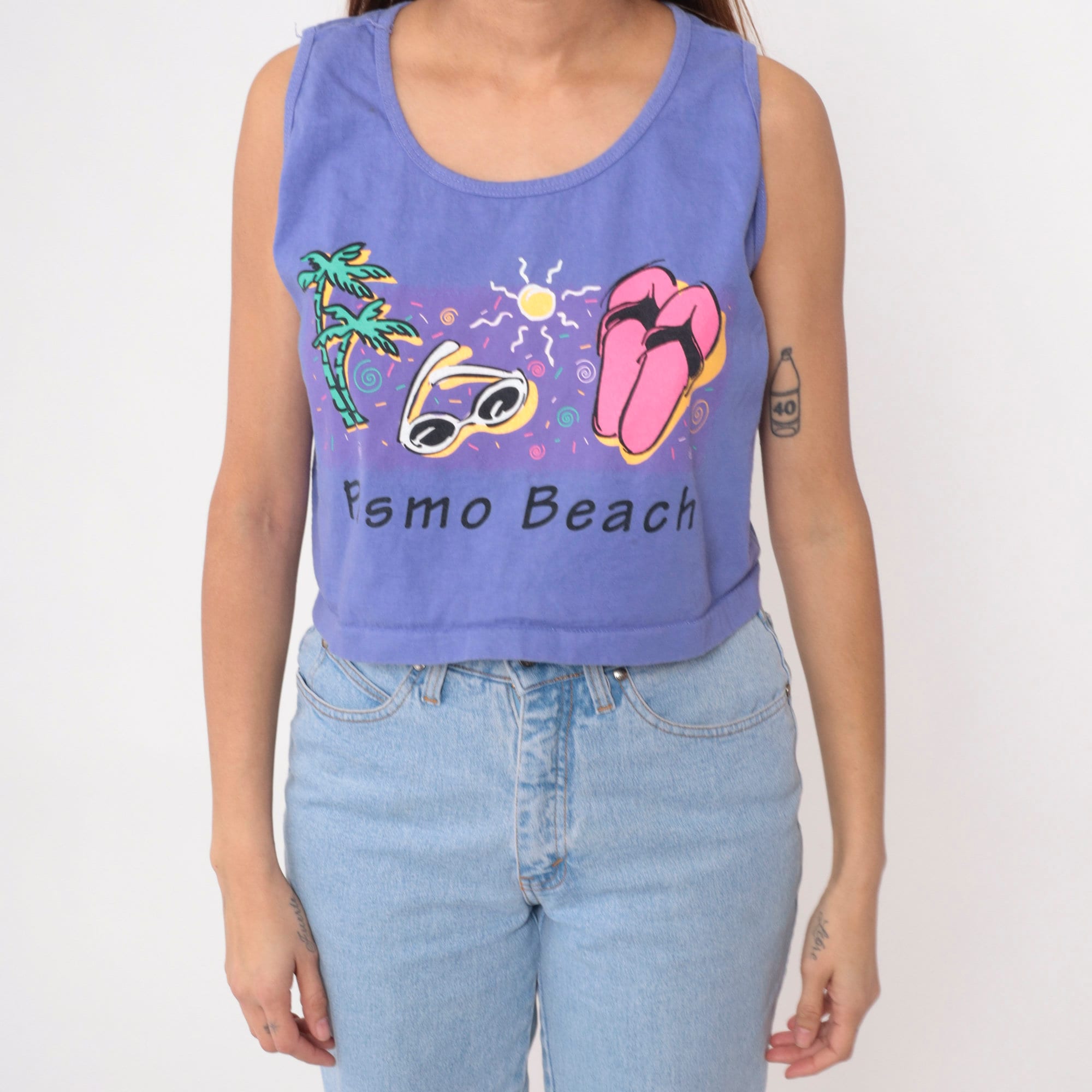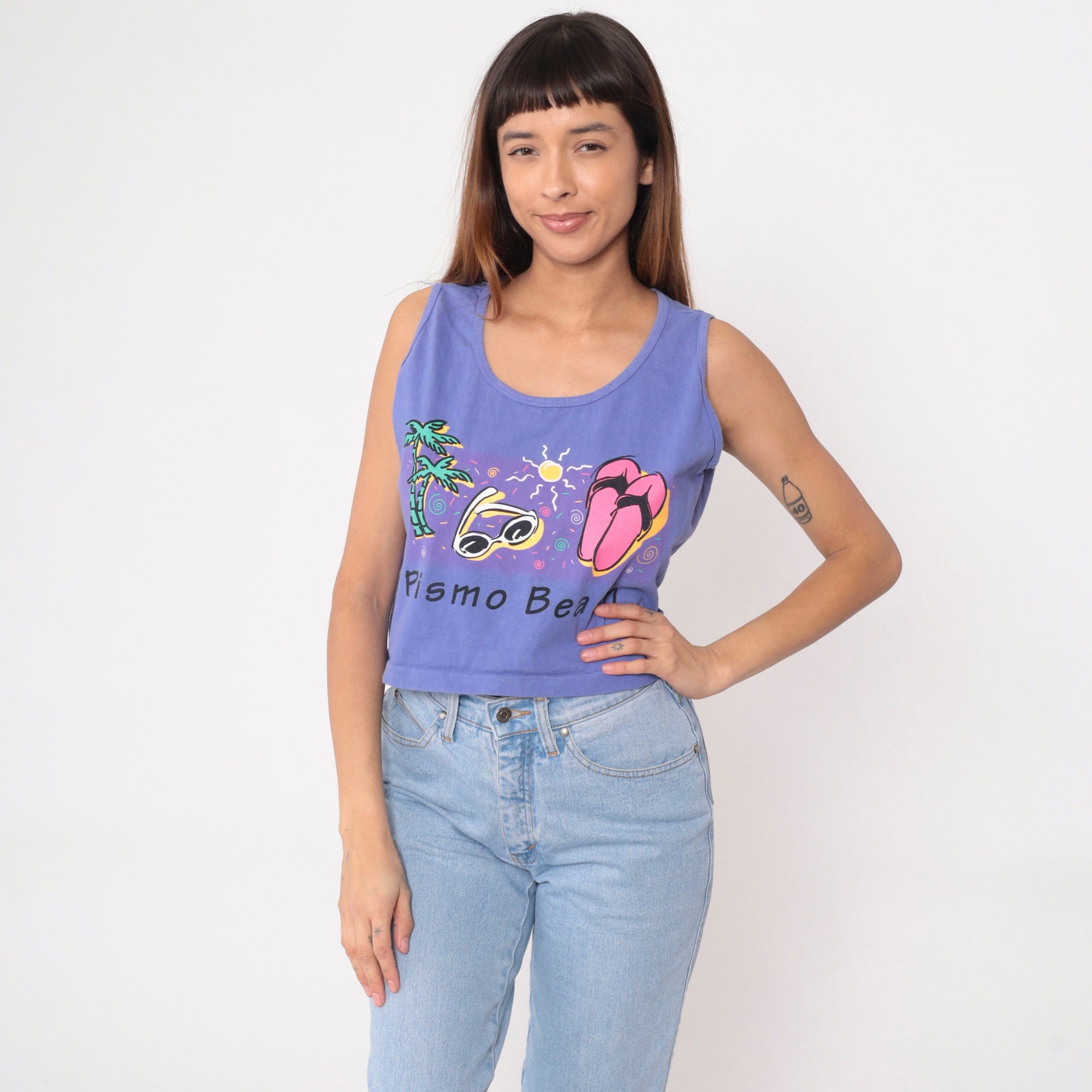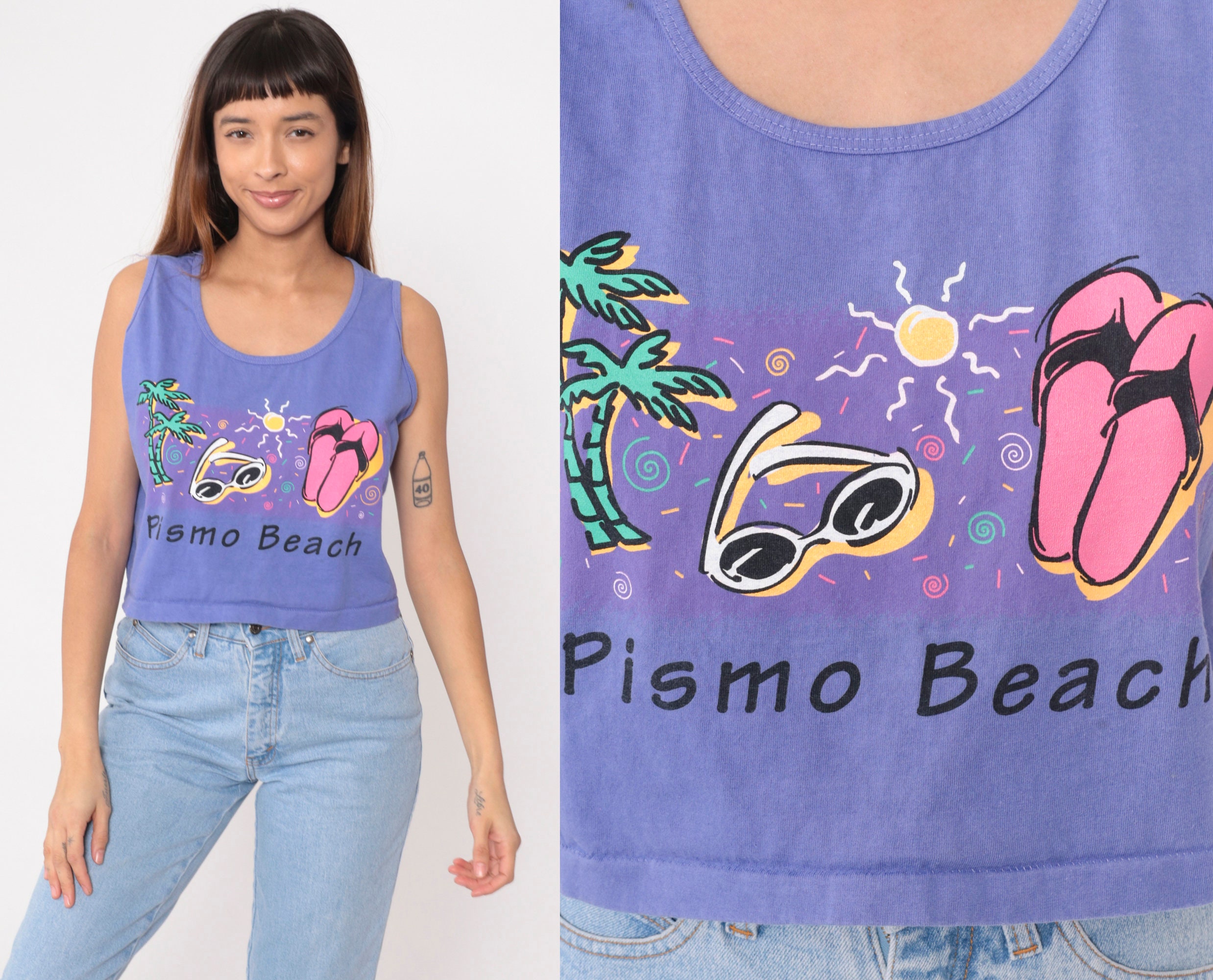 Vintage 90s tank top with a Pismo Beach graphic with palm trees, sunglasses and flip flops under the sun.