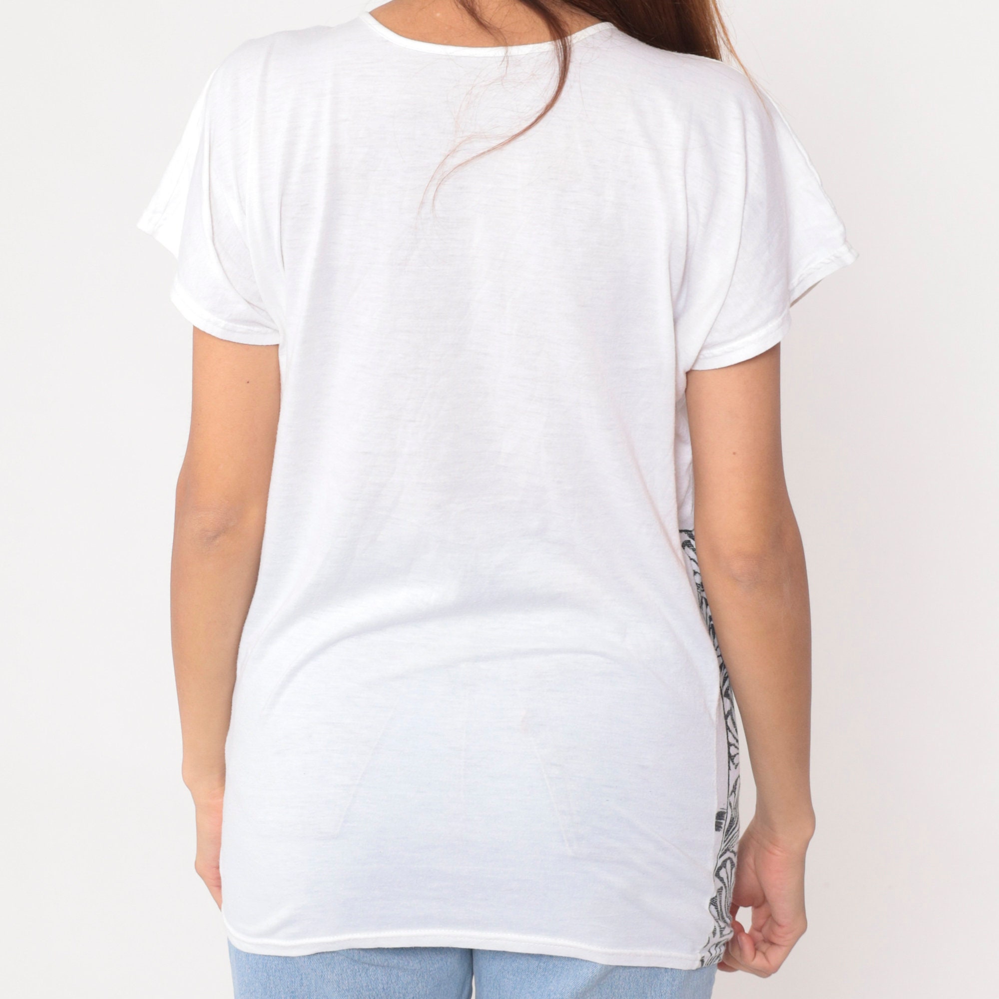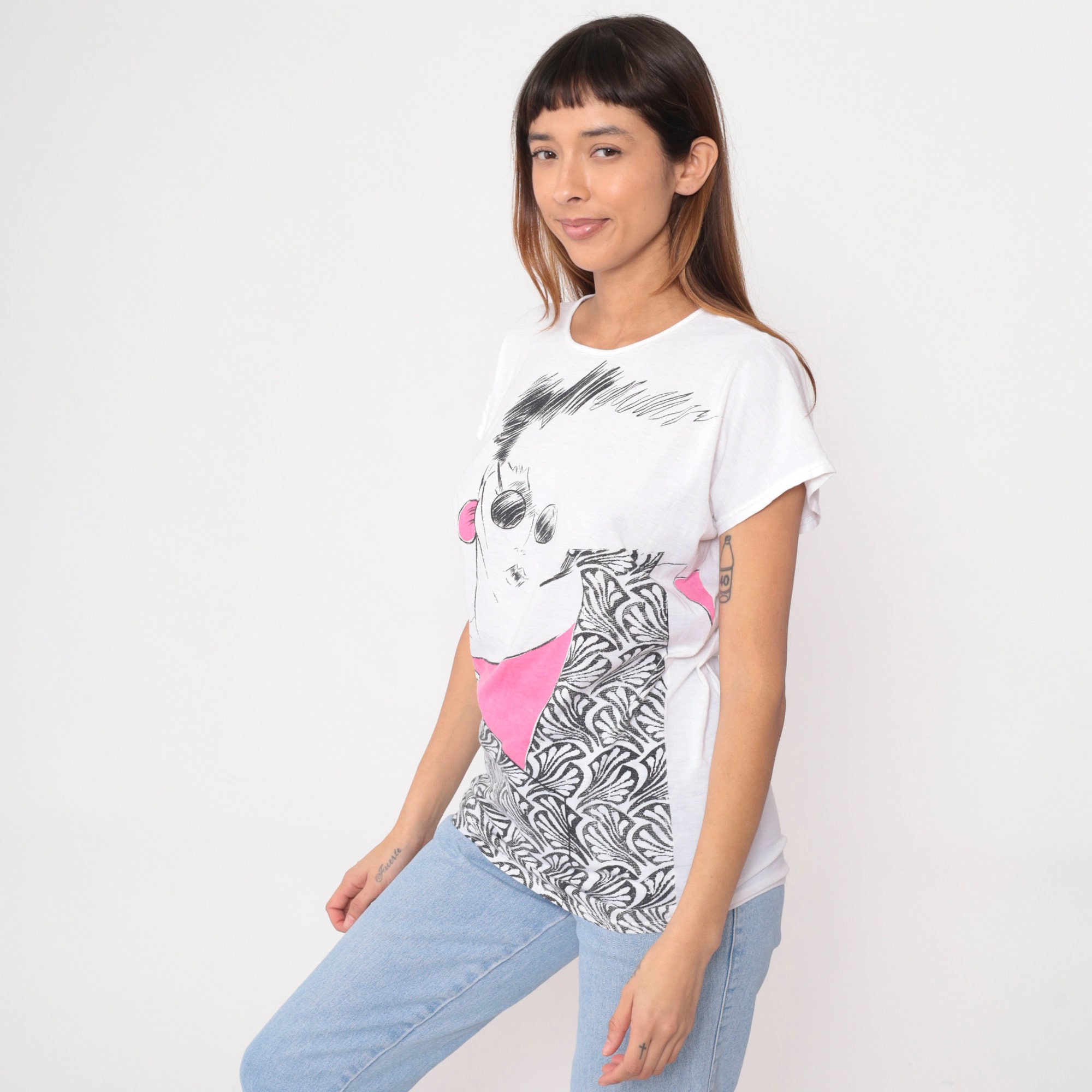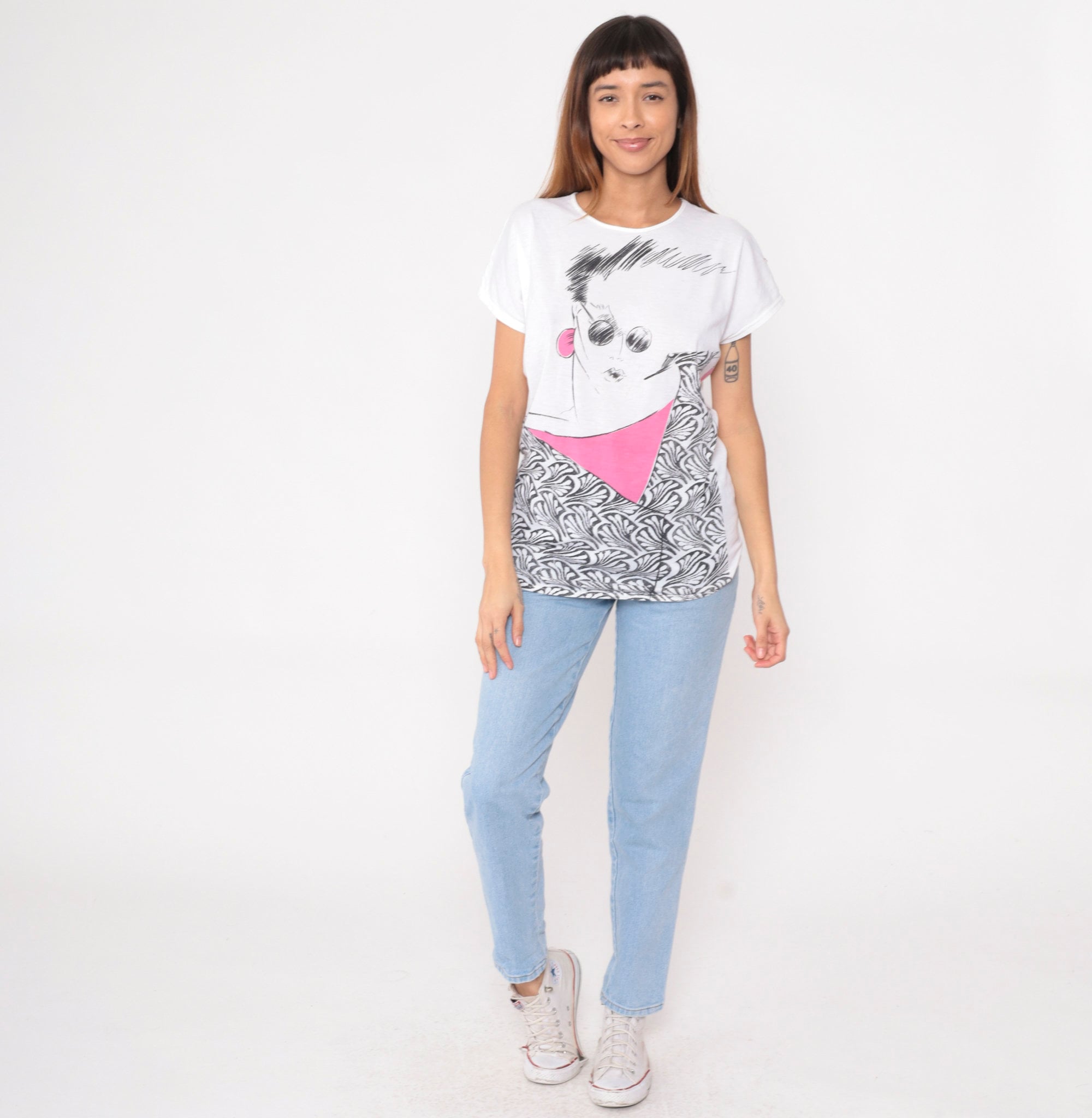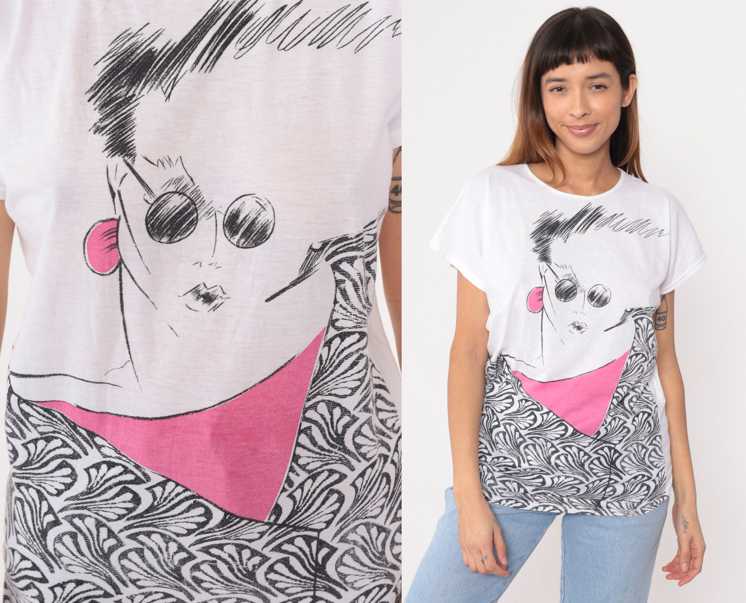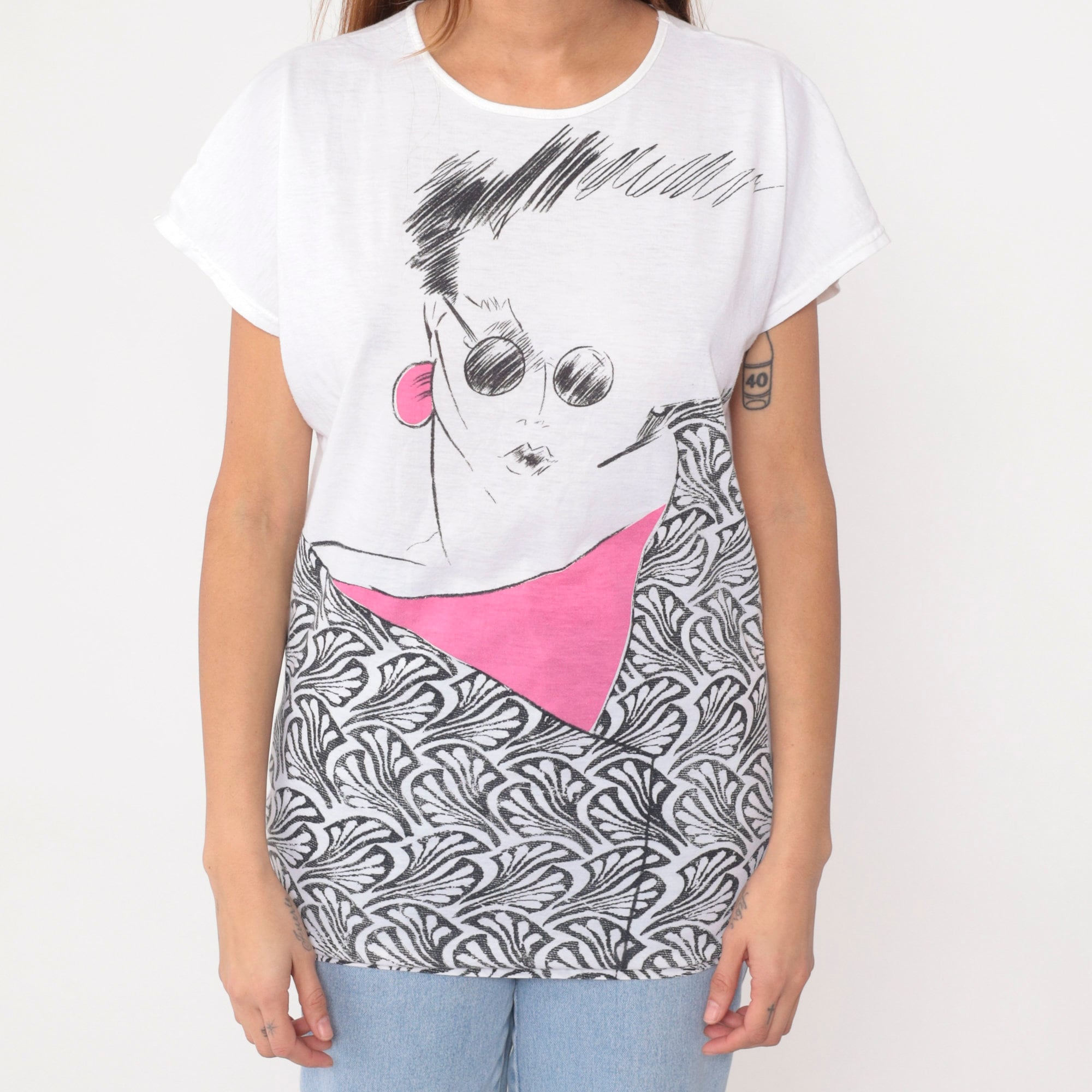 Vintage 90s shirt in white with an art print of a woman with round sunglasses and big earrings.