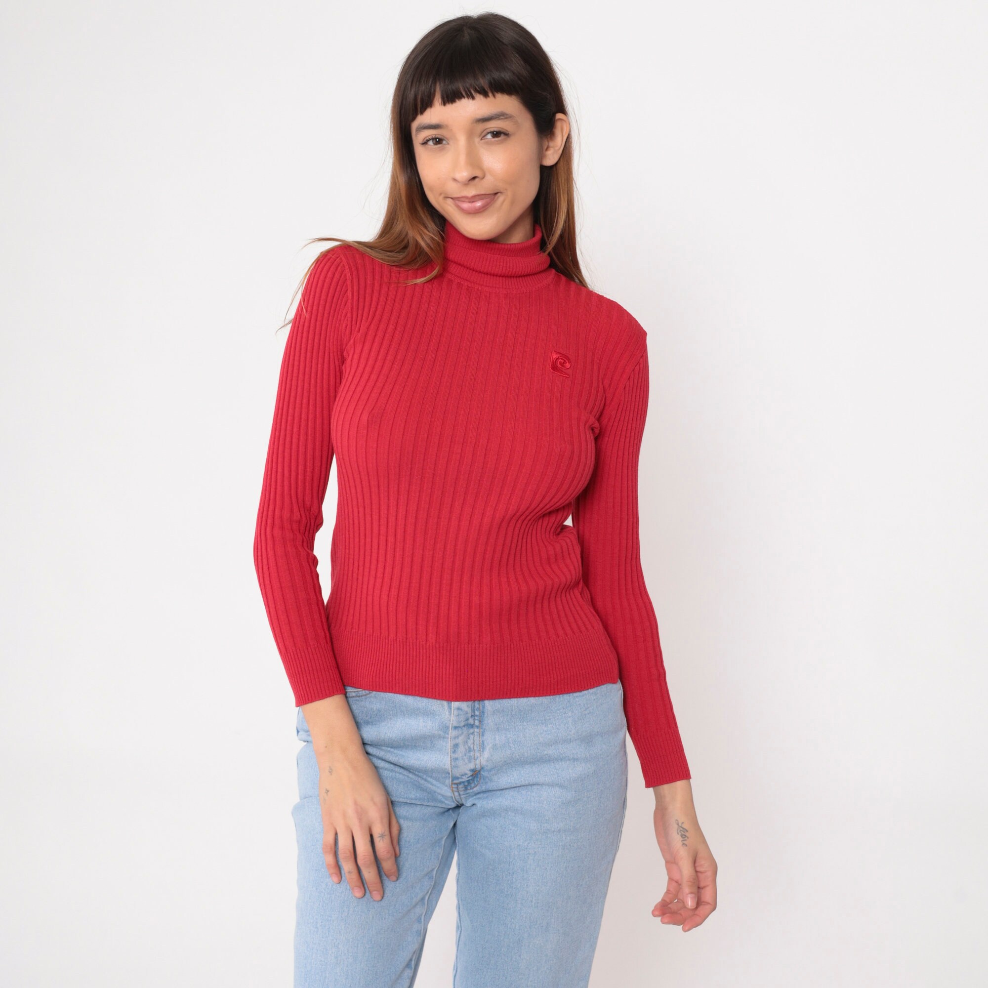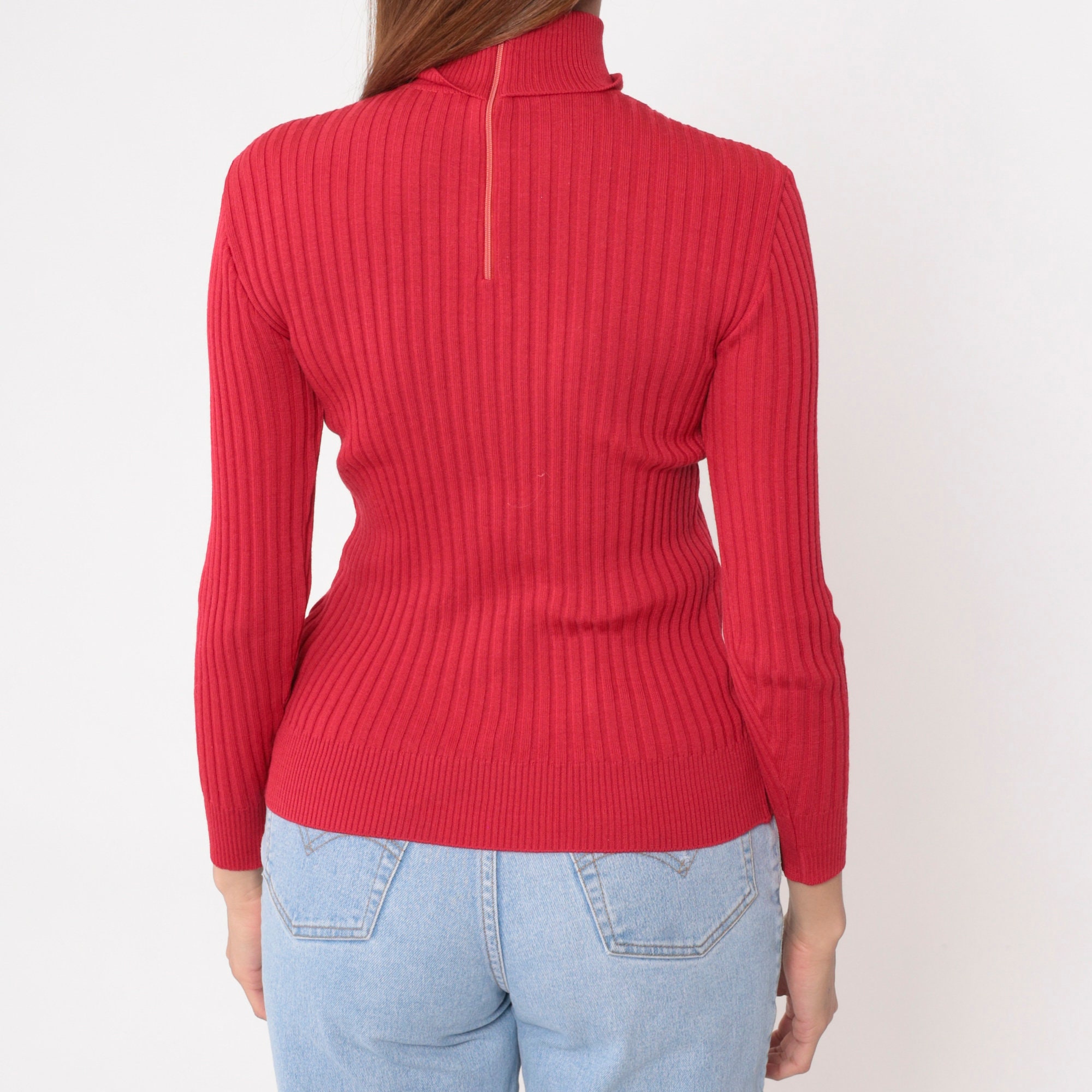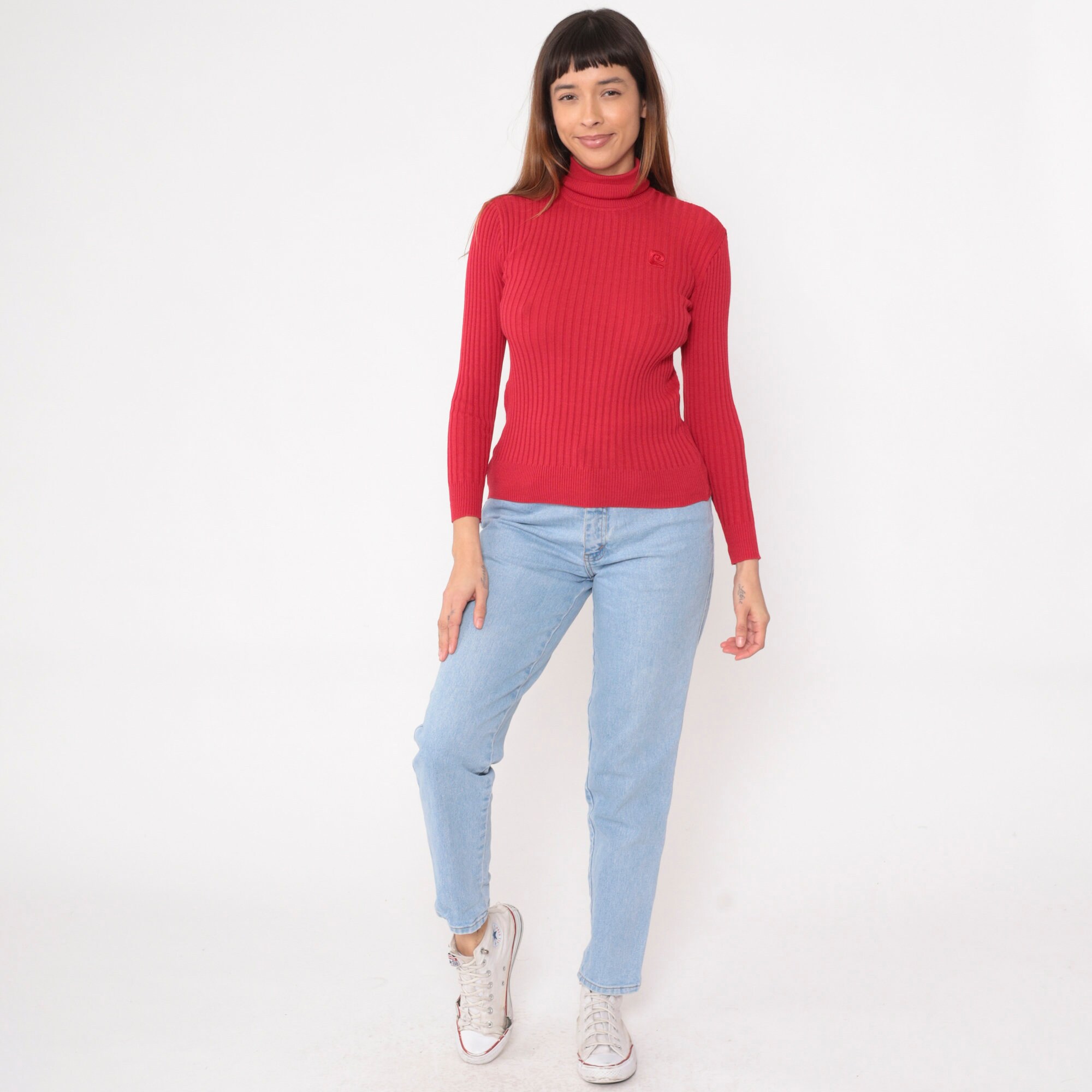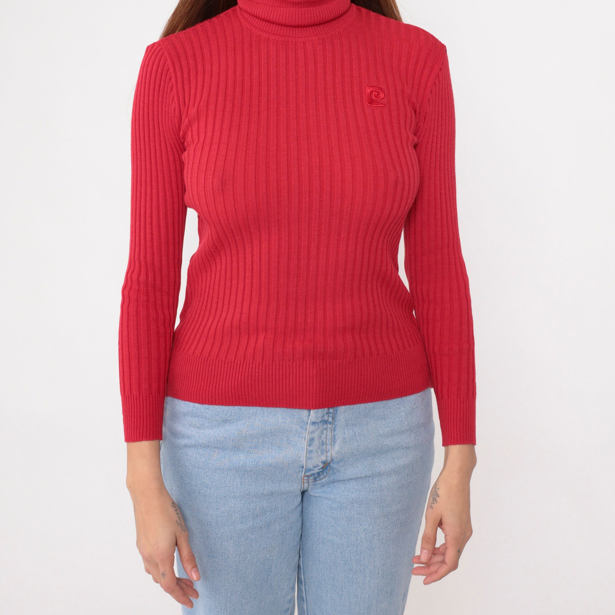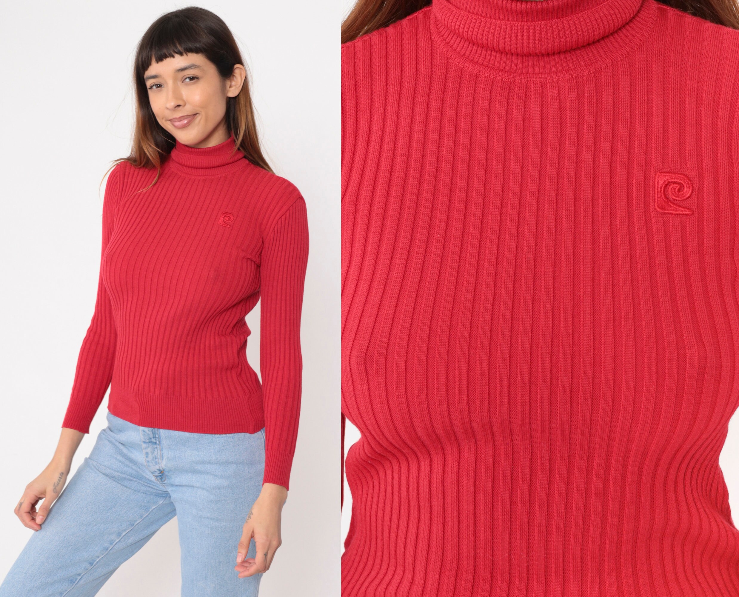 Vintage 80s sweater by Pierre Cardin in red ribbed knit with a turtleneck.