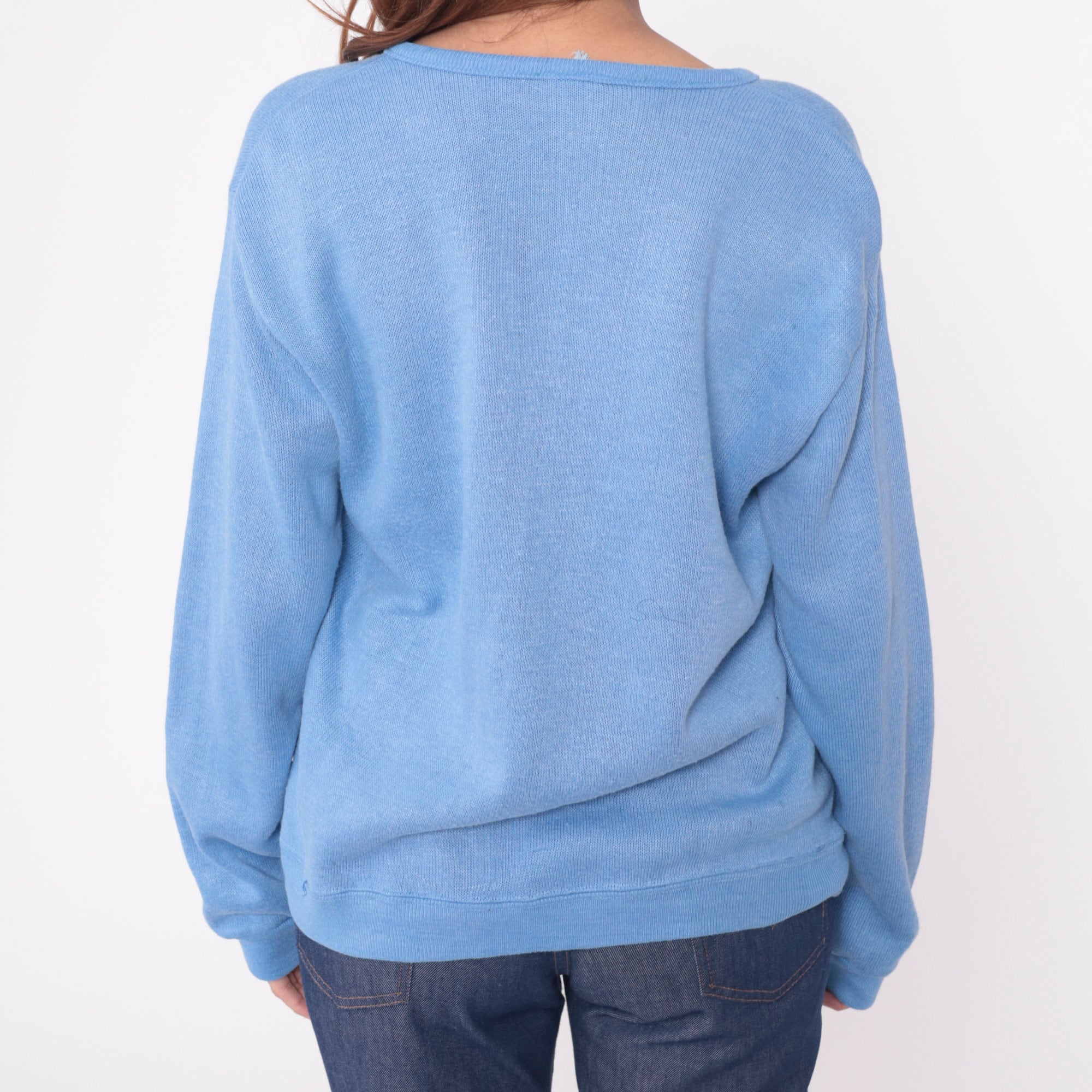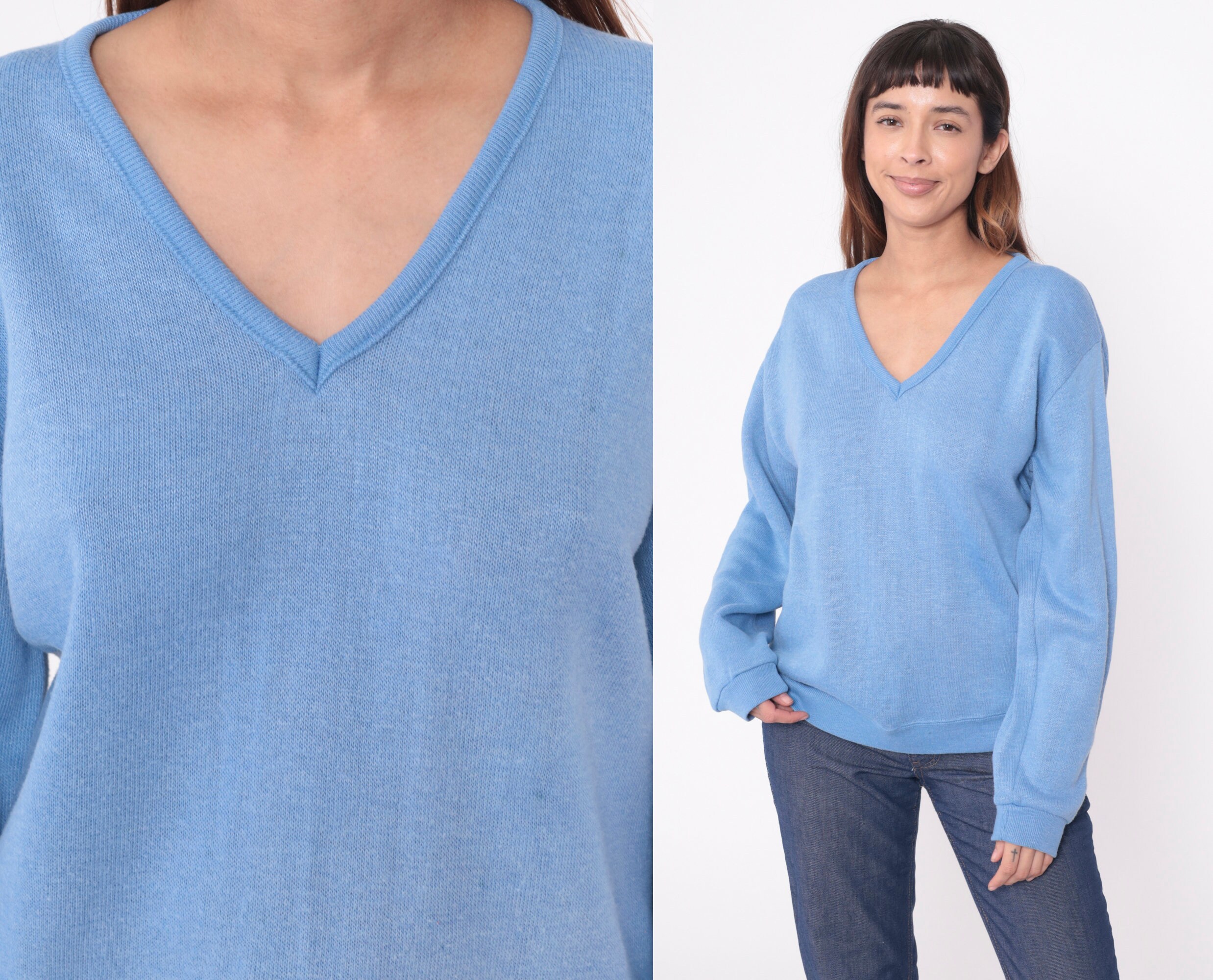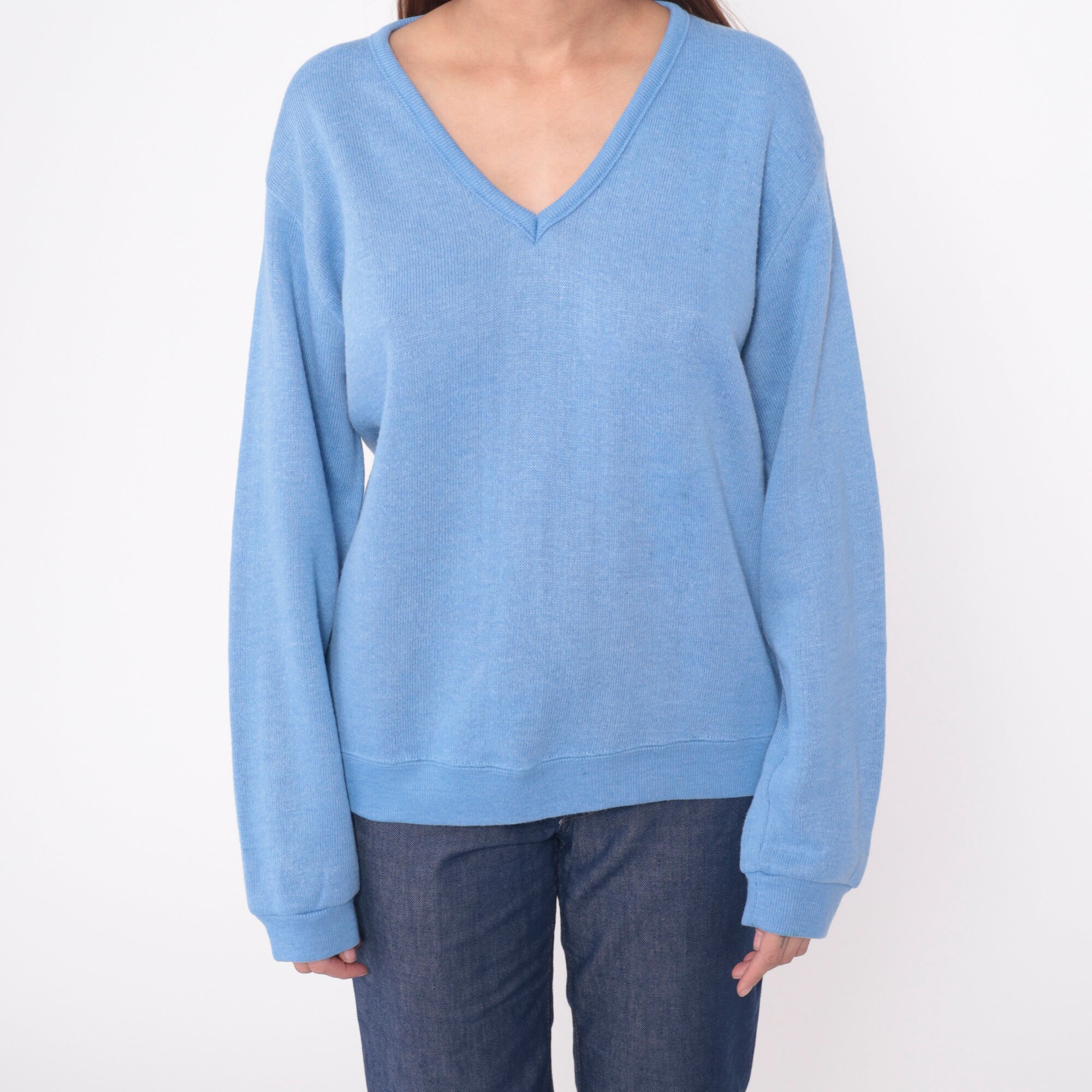 Vintage 80s sweater in light blue knit with a v neck.