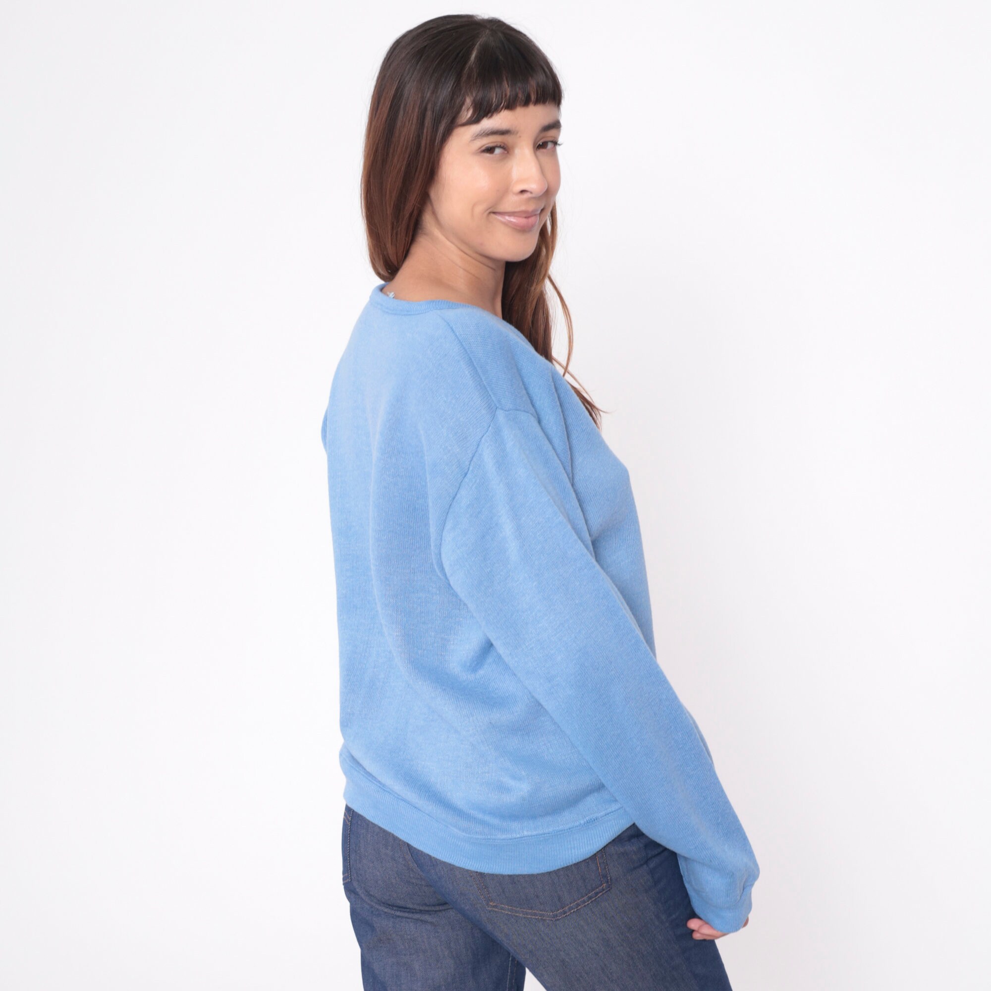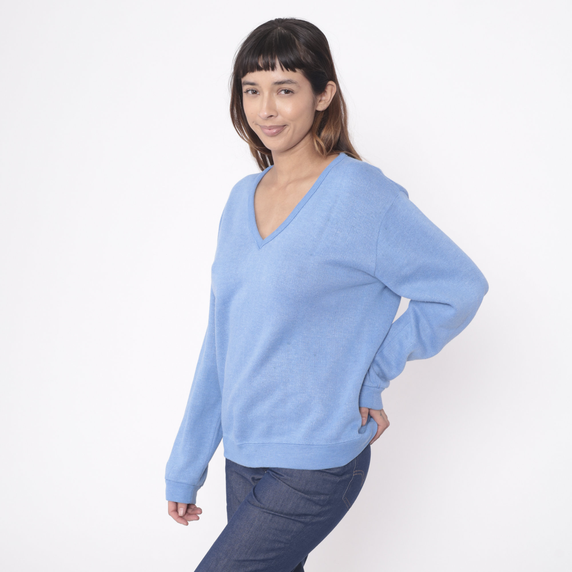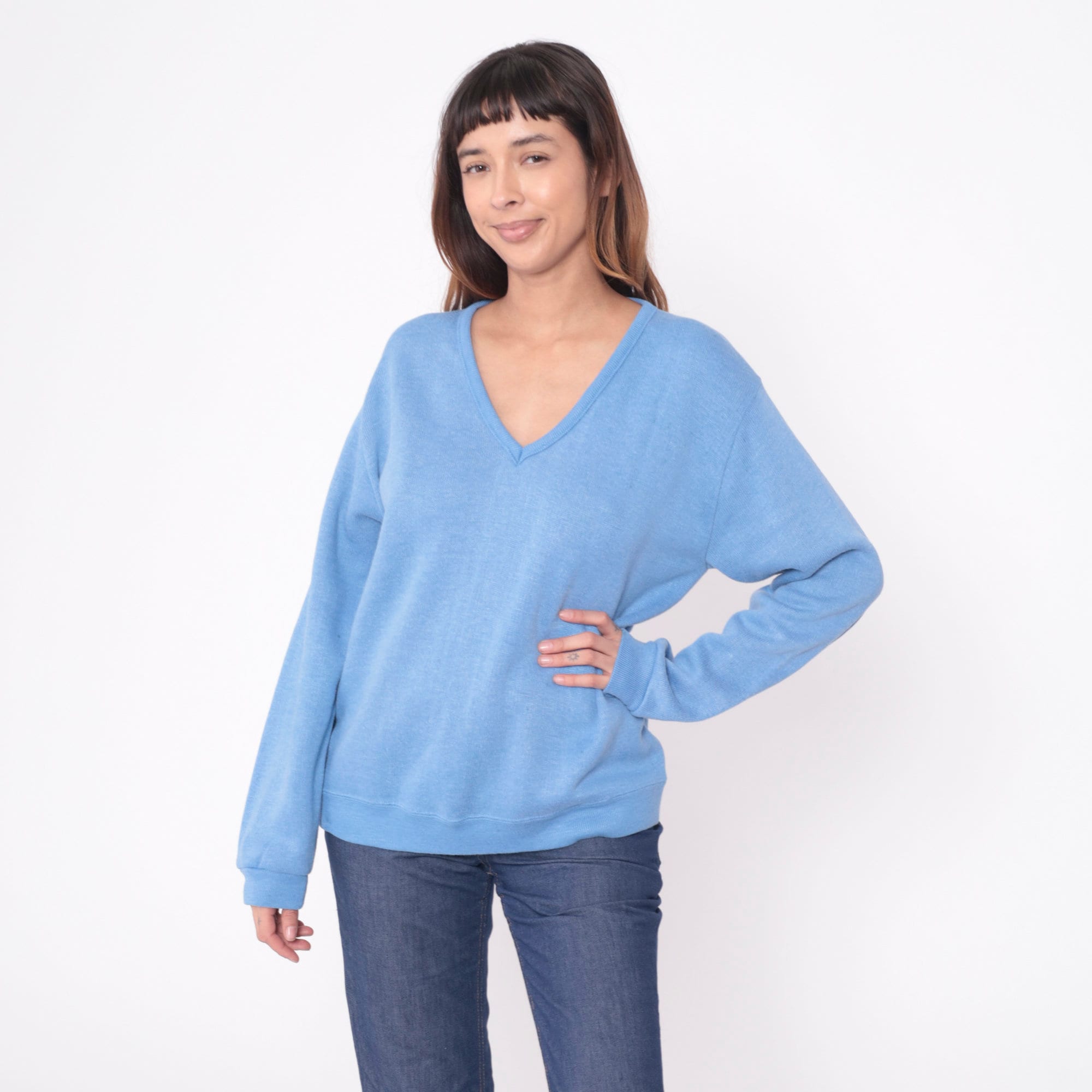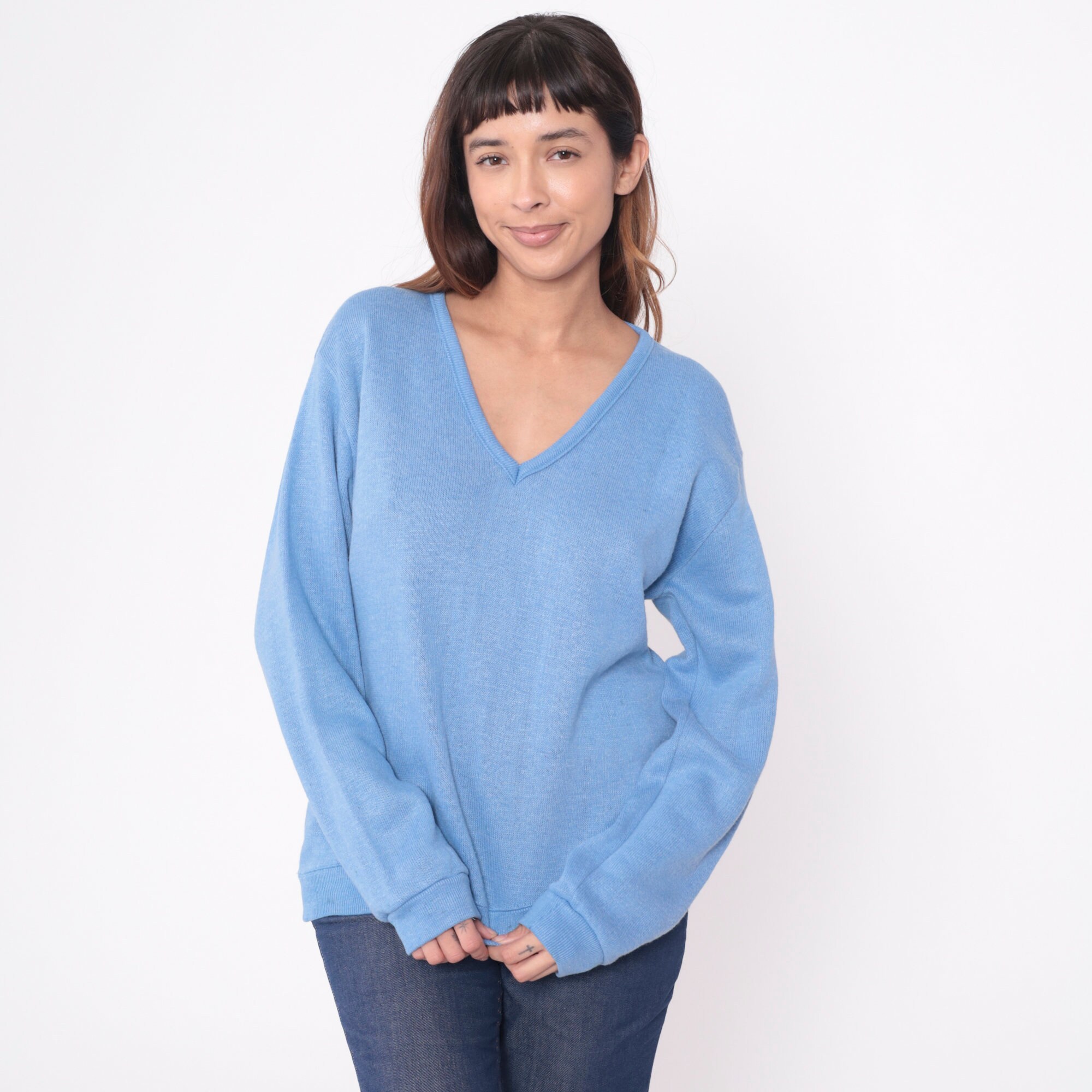 Vintage 80s sweater in light blue knit with a v neck.