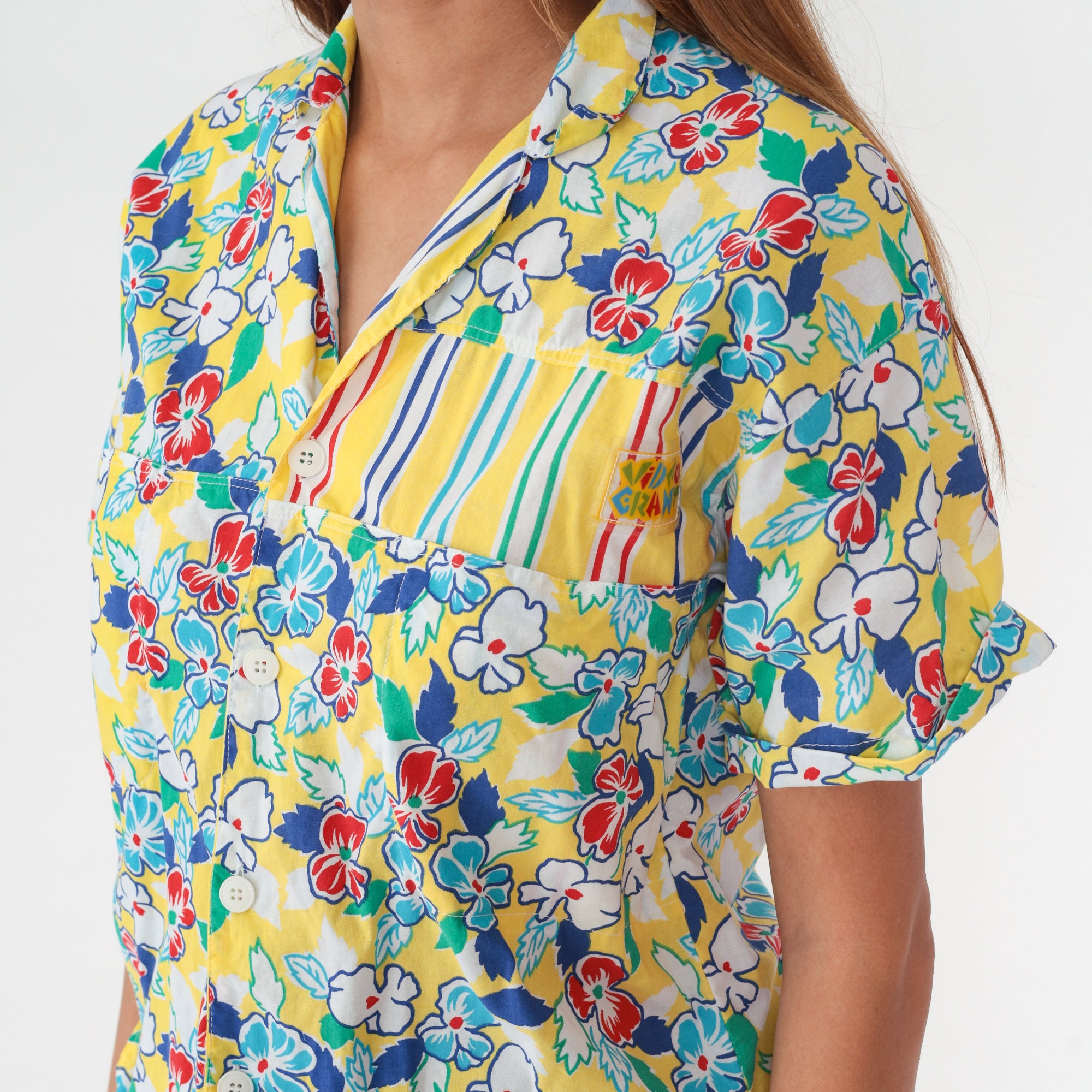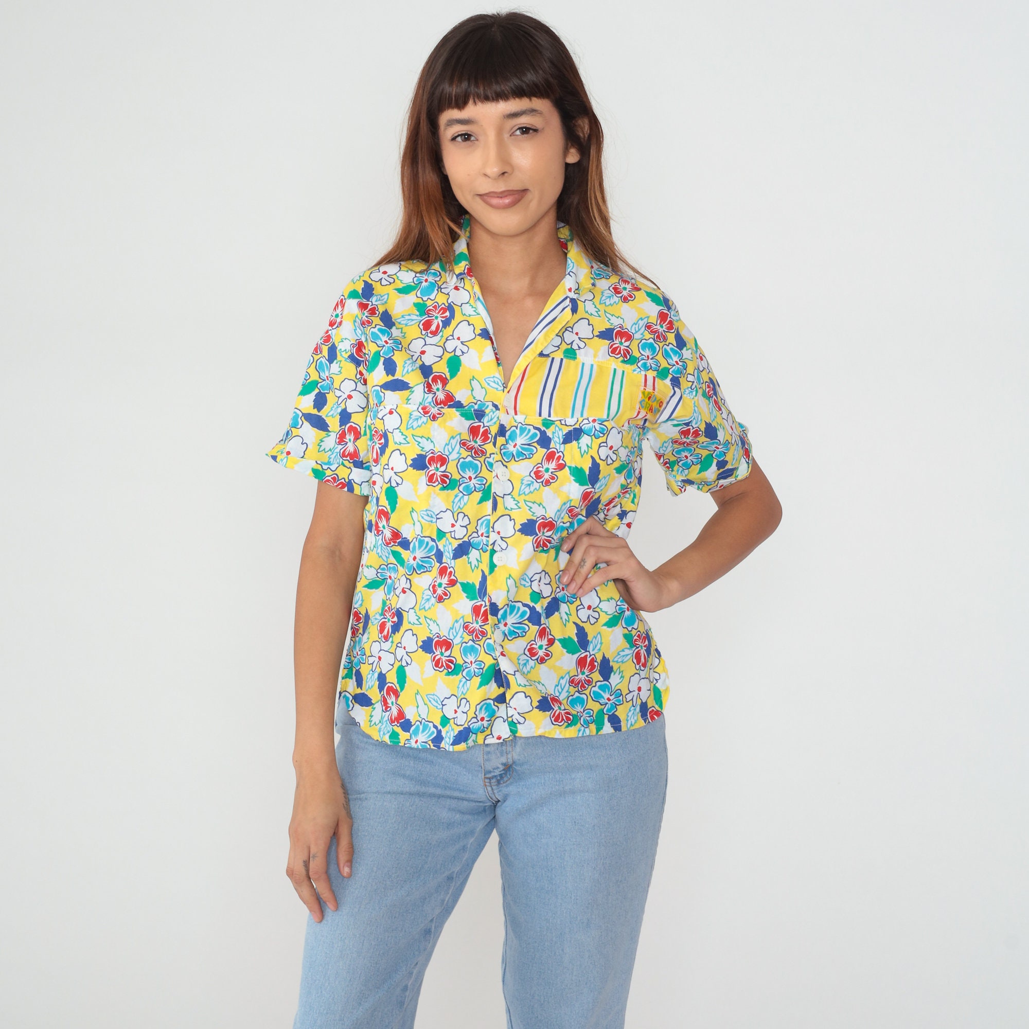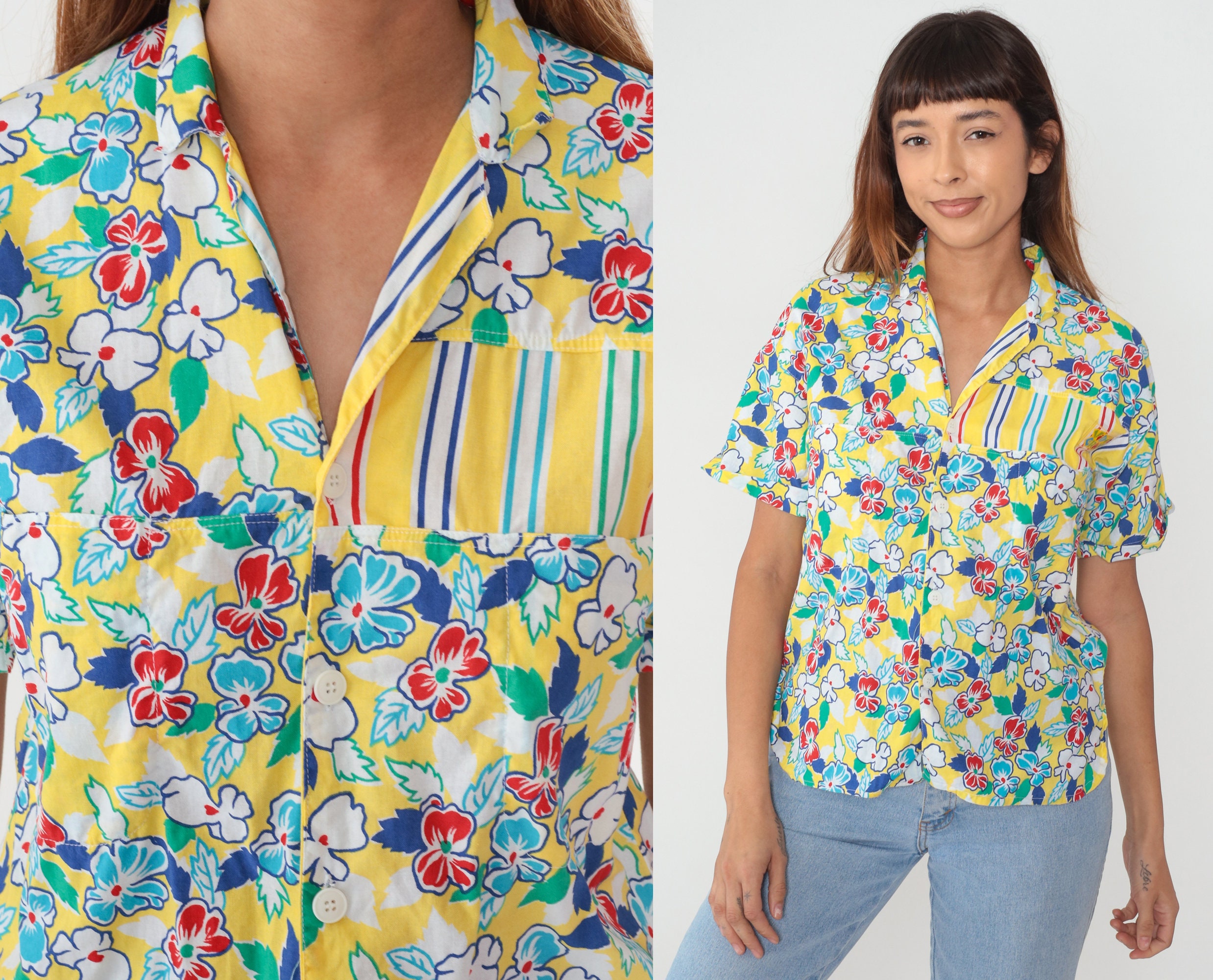 Vintage 90s shirt in yellow with a colorful floral and striped design. Buttons up the front with short sleeves. Made in Italy.