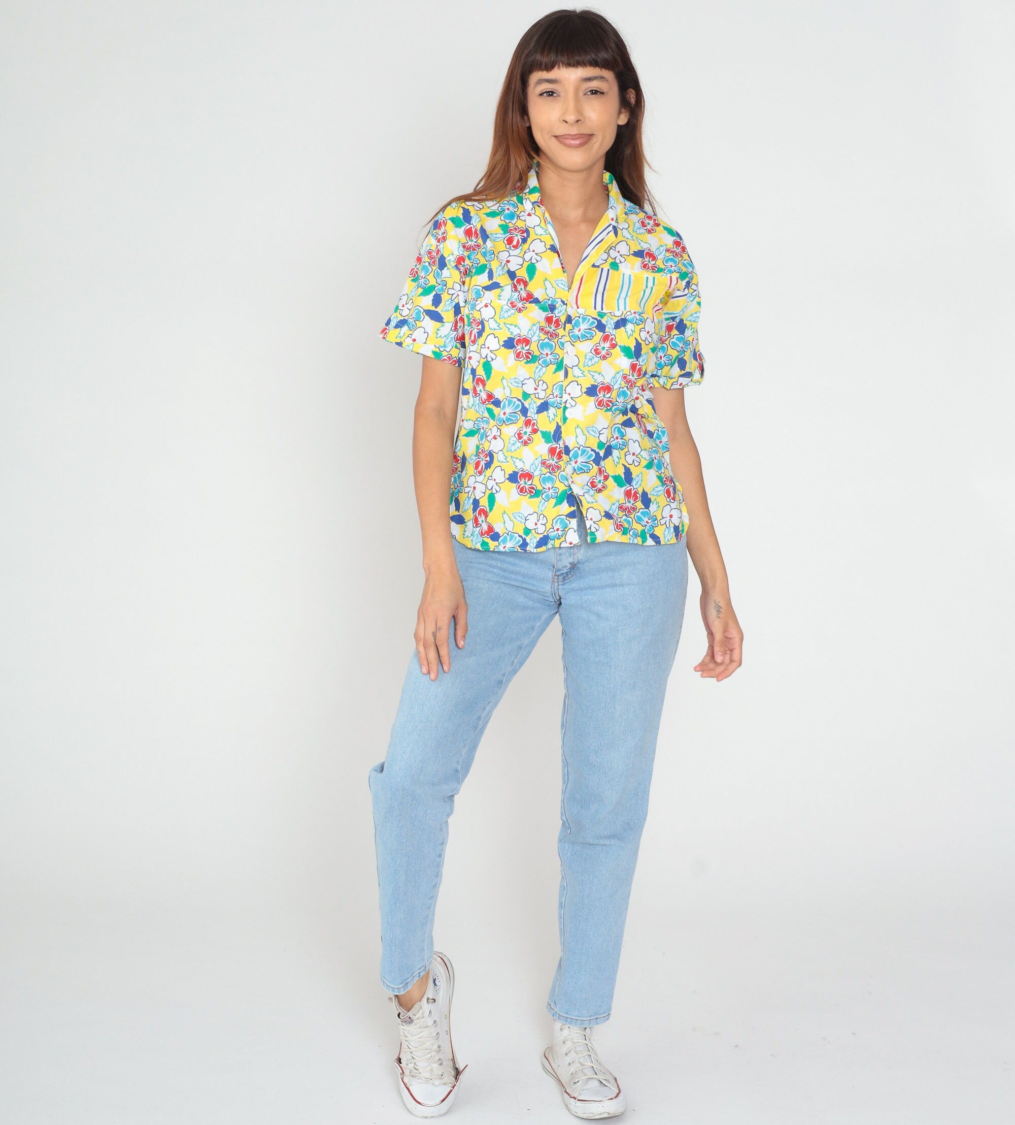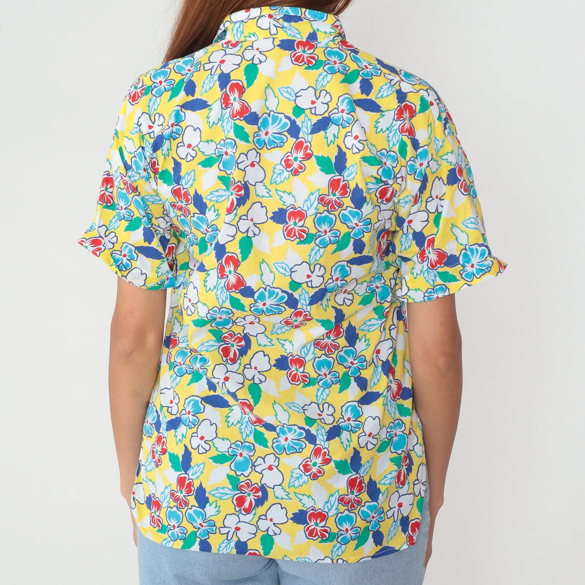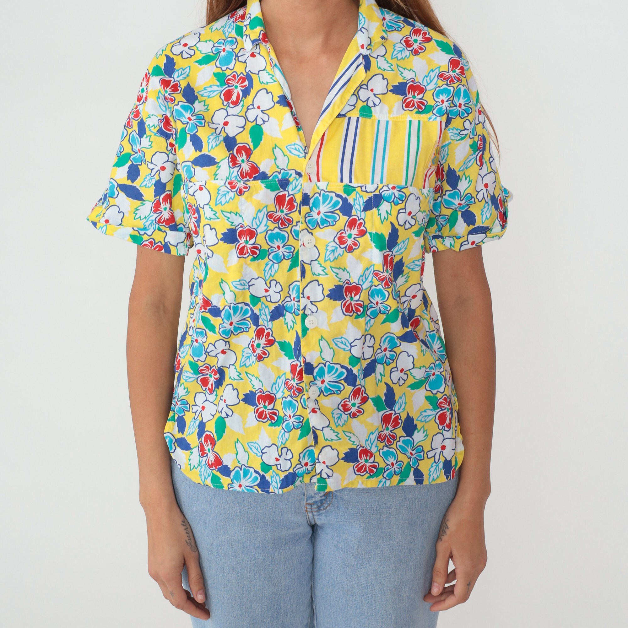 Vintage 90s shirt in yellow with a colorful floral and striped design. Buttons up the front with short sleeves. Made in Italy.