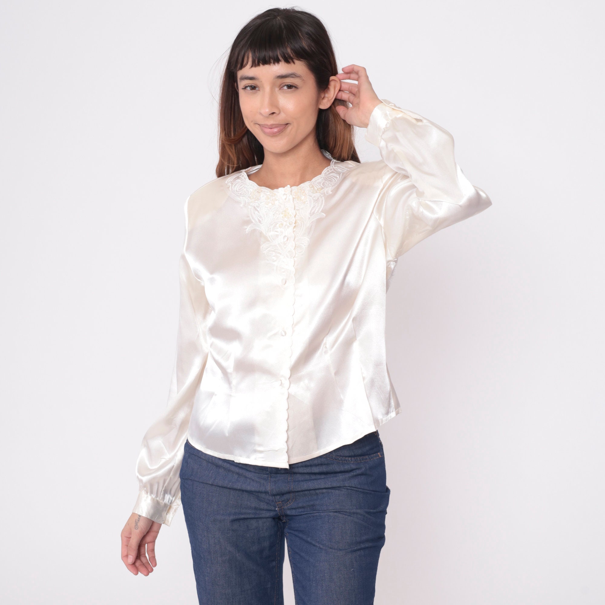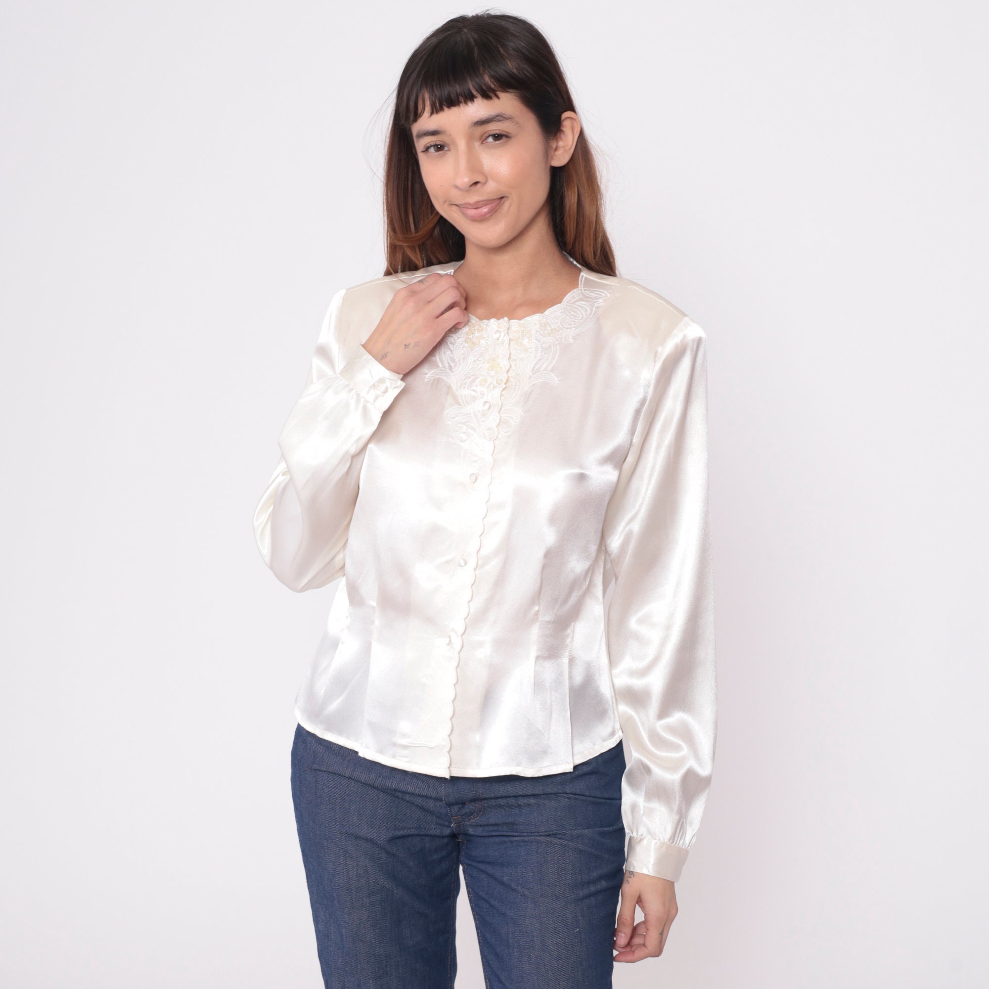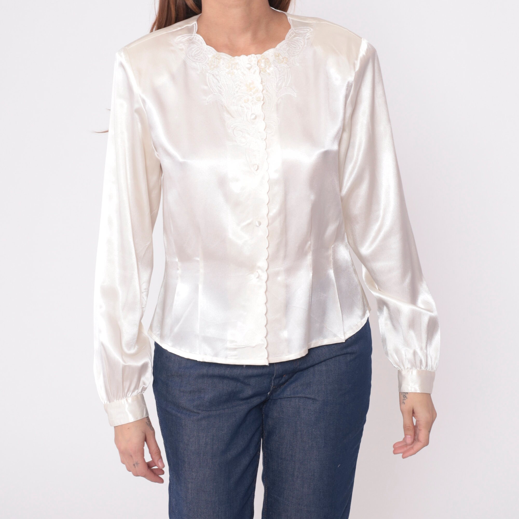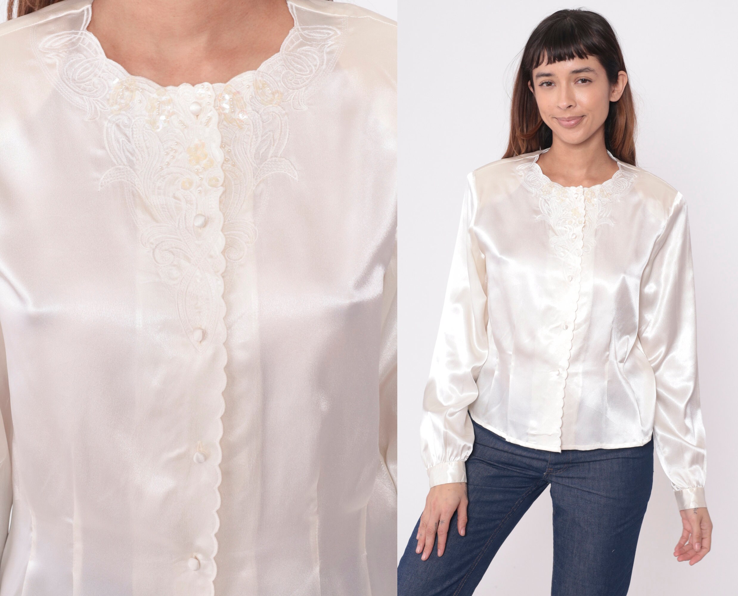 Vintage 80s blouse in white satin with abstract swirling floral embroidery, pearl beading and sequins. It has long sleeves, pleats at the waist for a tailored fit, and buttons up the front.